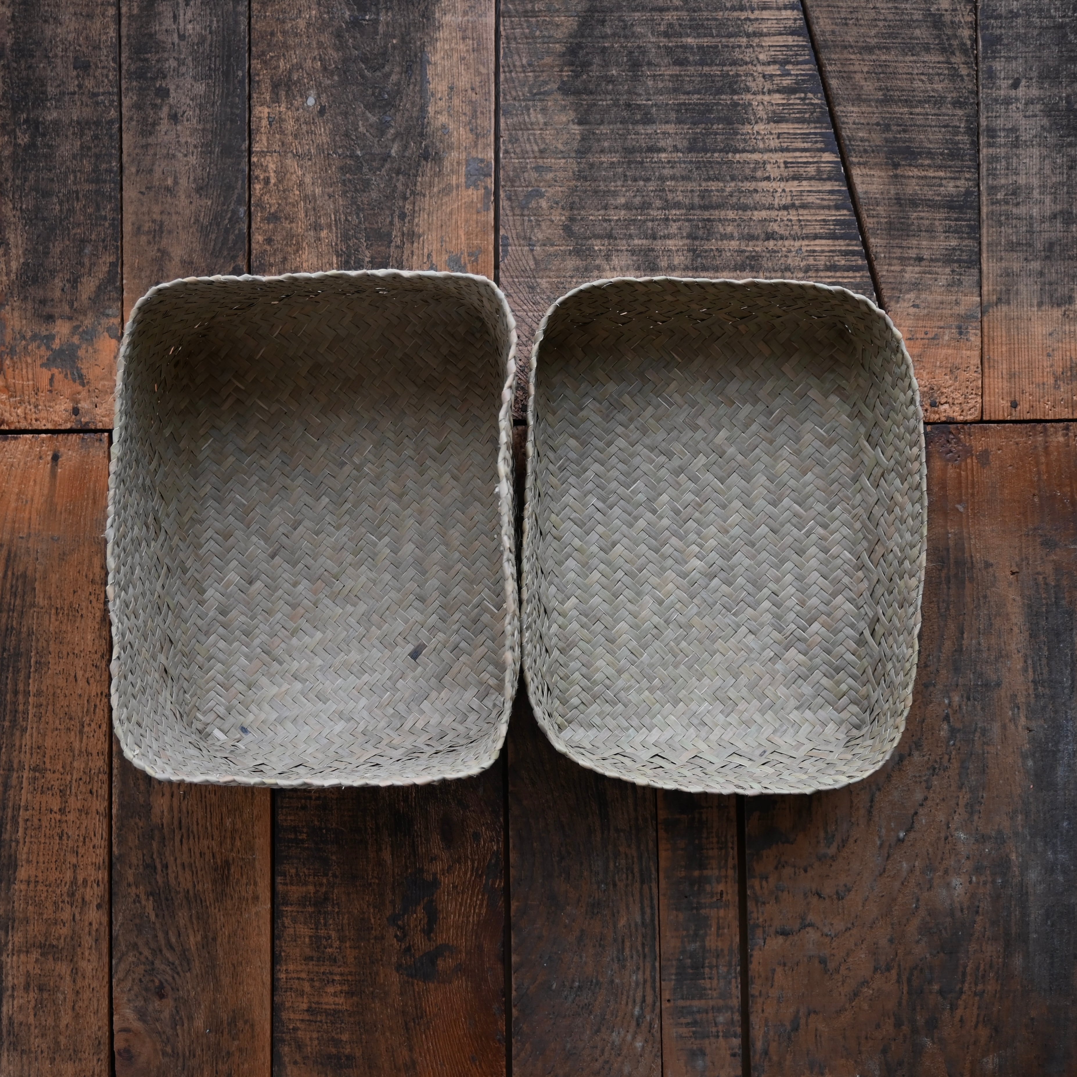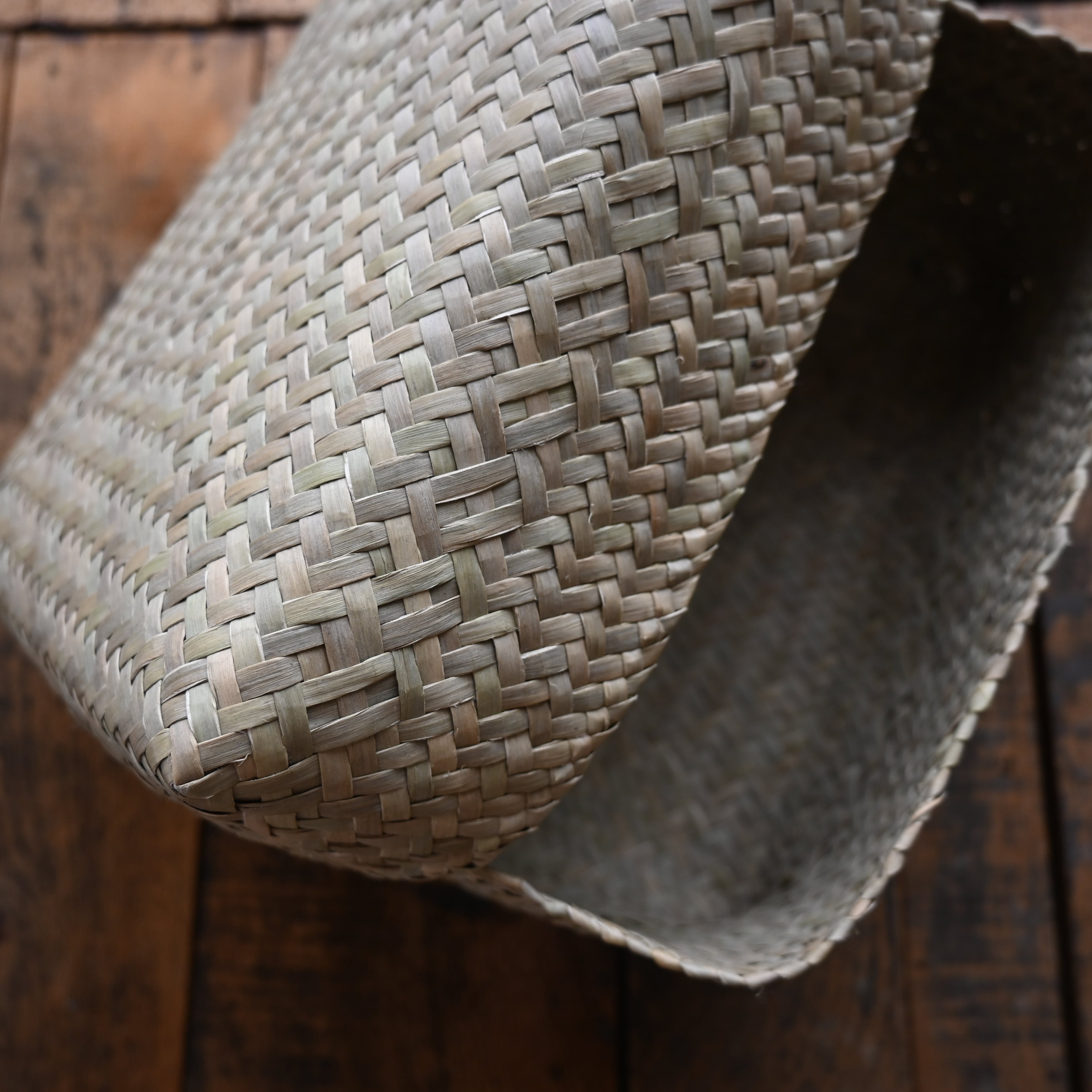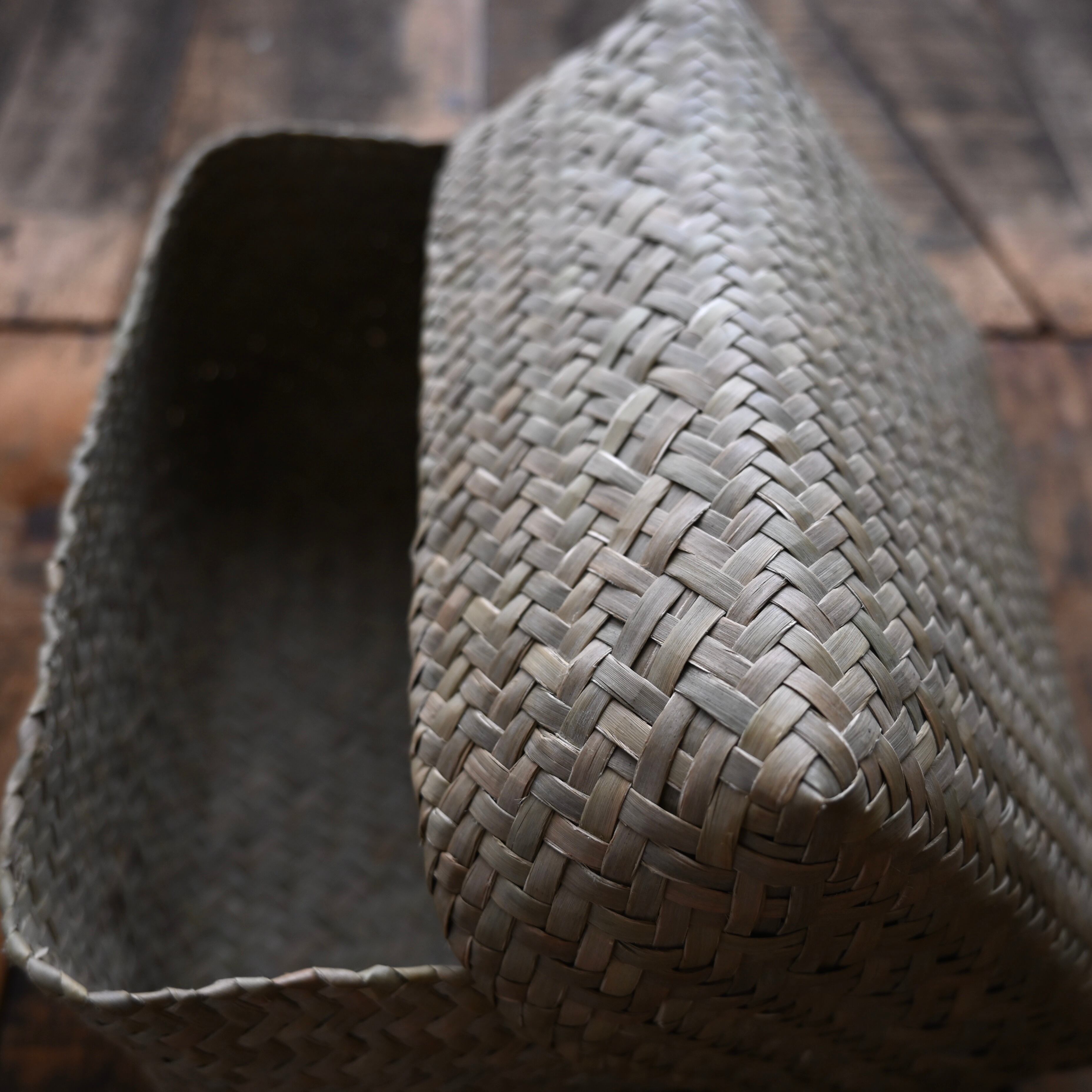 水草で作られるバスケットたちは、作られて間もないものは水分を多く含み、やや緑がかった色合い。そこから使っていくうちに水分が抜けると画像のように色が明るく黄味がかった色に変化し、しなやかさが増します。日々変化する風合いをお楽しみください。