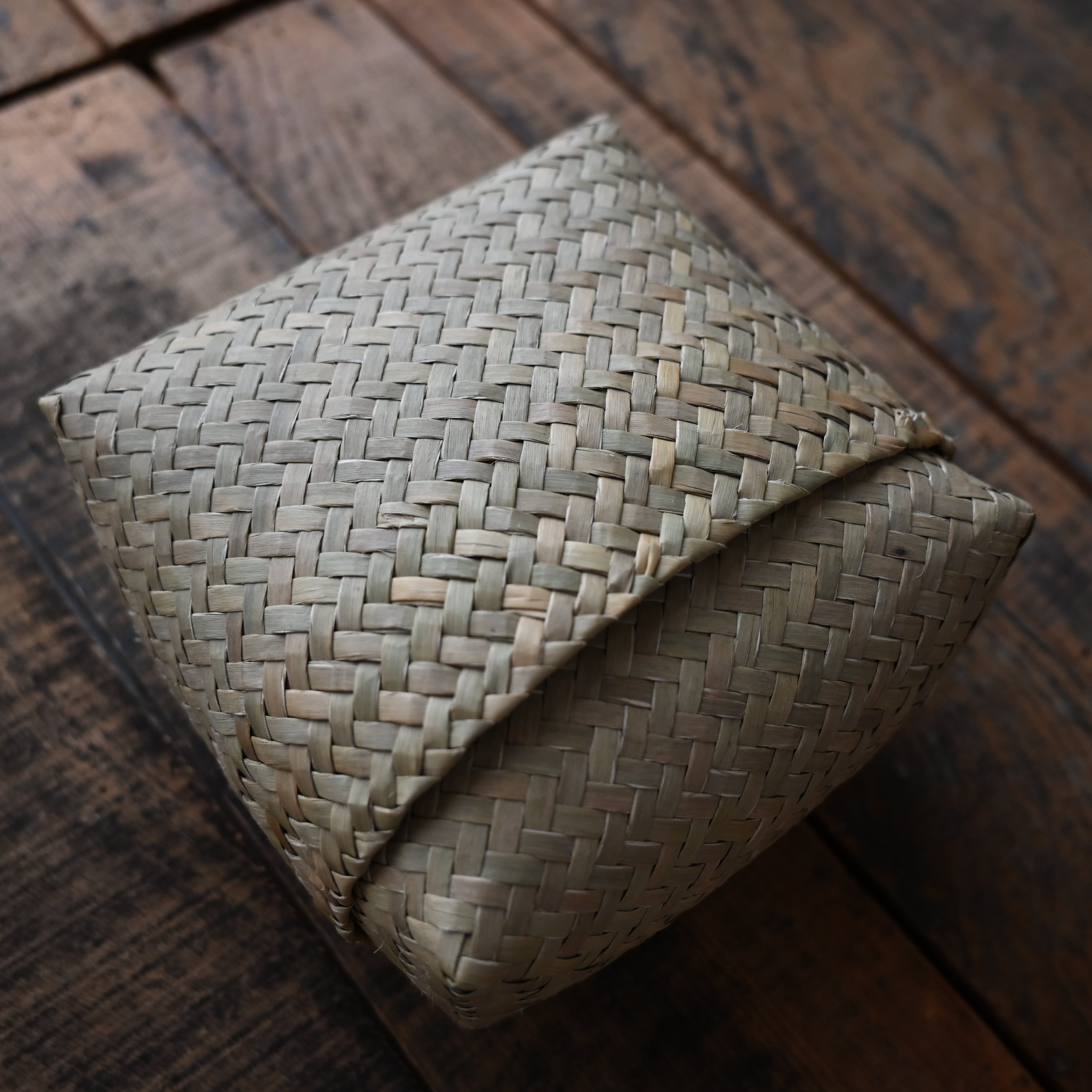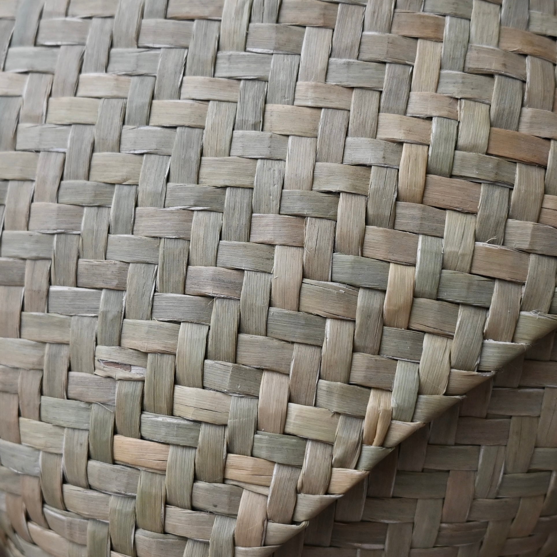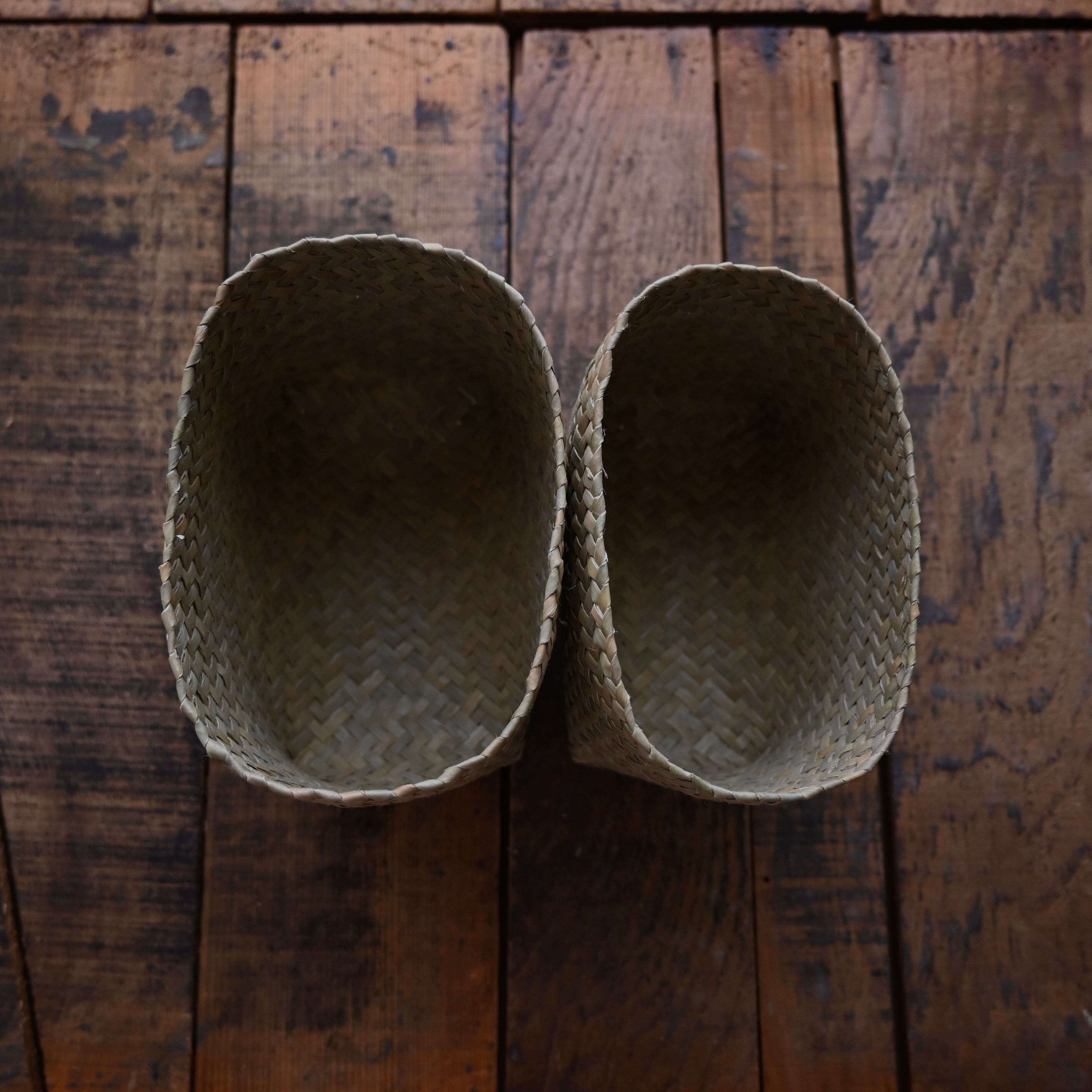 水草で作られるバスケットたちは、作られて間もないものは水分を多く含み、やや緑がかった色合い。そこから使っていくうちに水分が抜けると画像のように色が明るく黄味がかった色に変化し、しなやかさが増します。日々変化する風合いをお楽しみください。