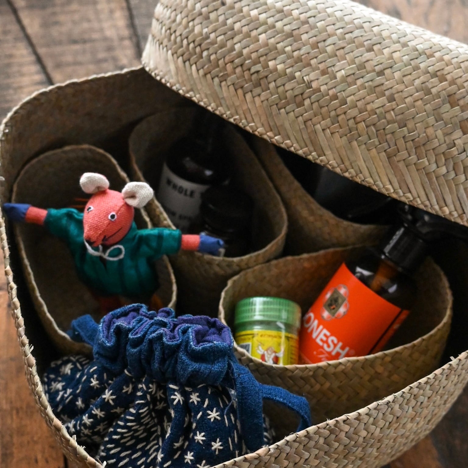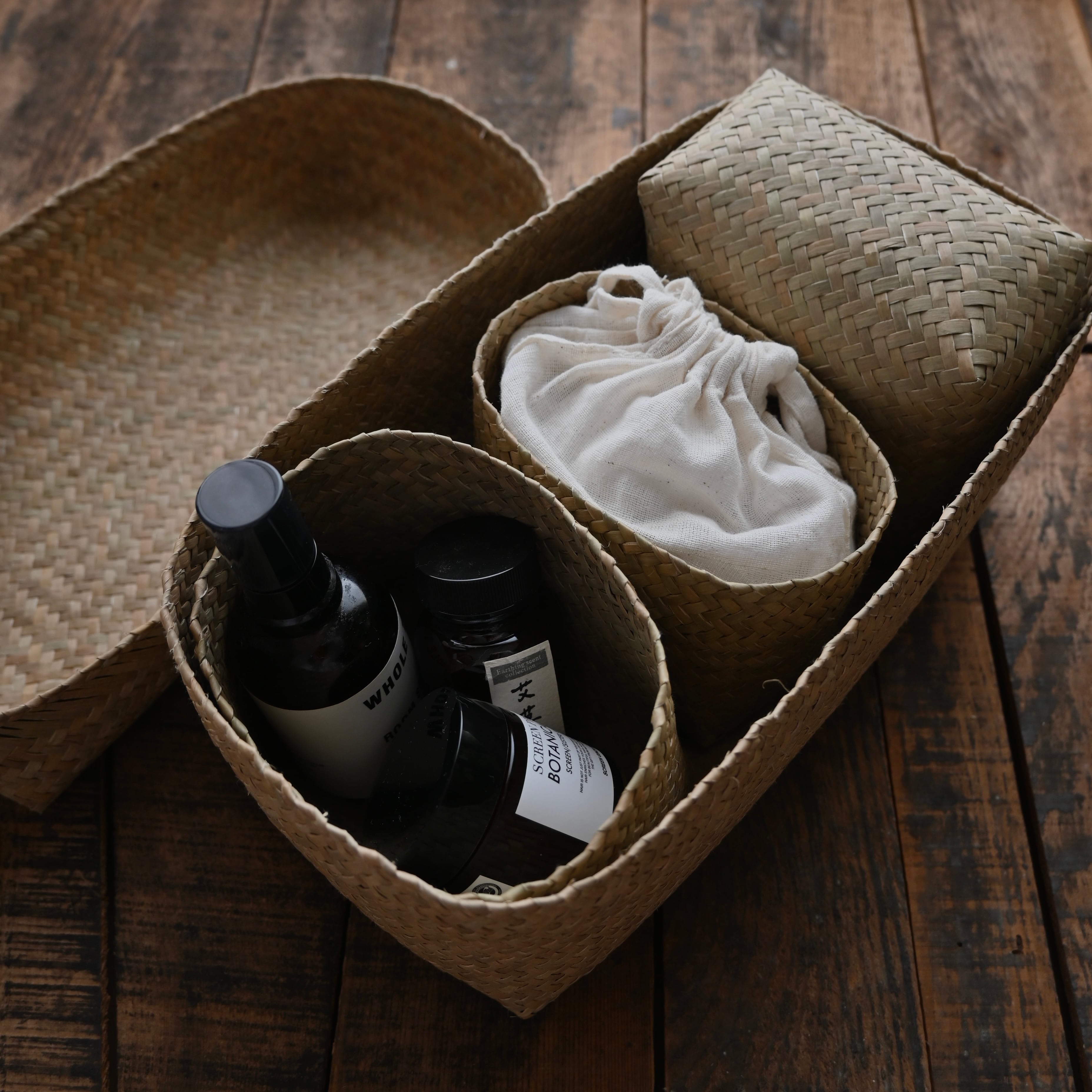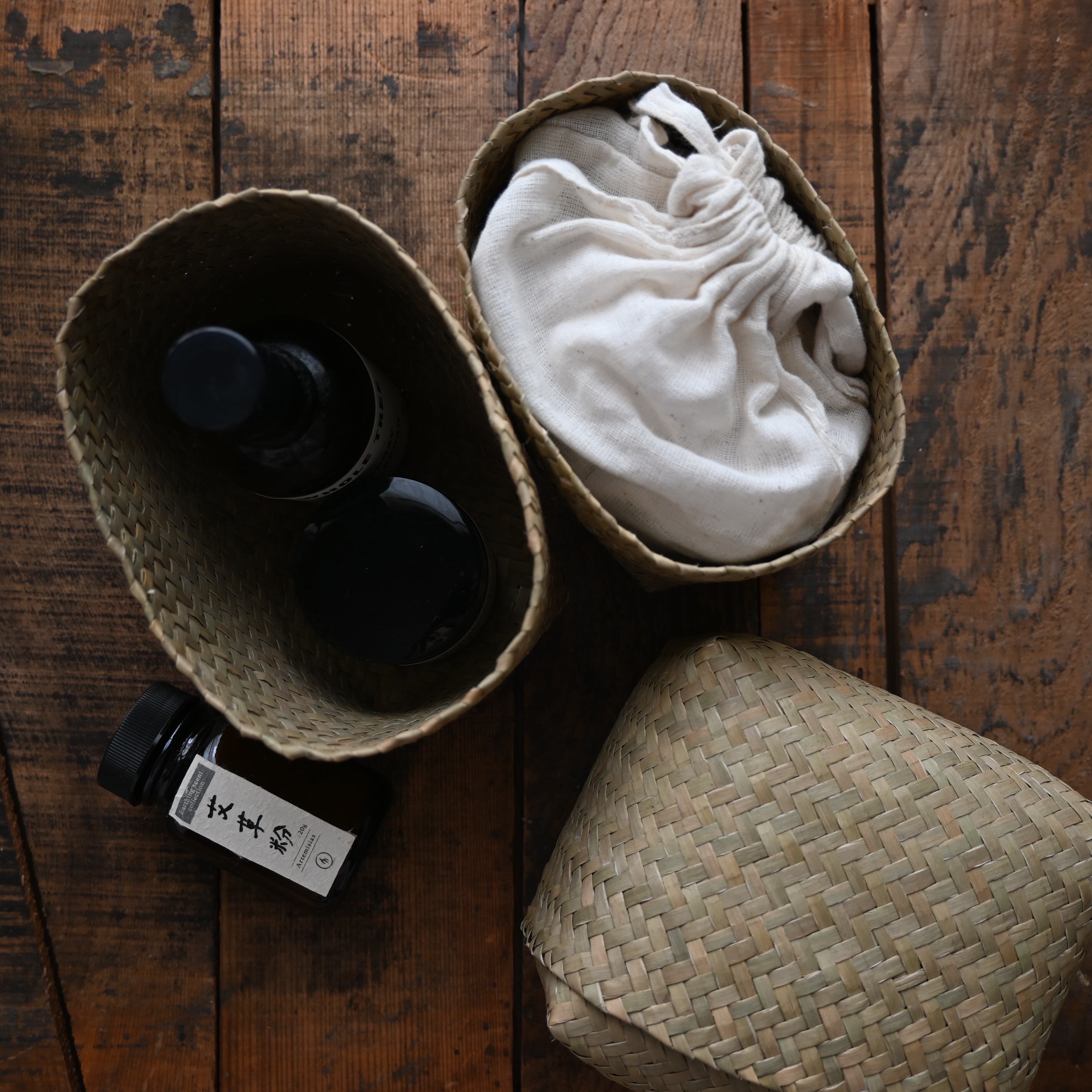水草で作られるバスケットたちは、作られて間もないものは水分を多く含み、やや緑がかった色合い。そこから使っていくうちに水分が抜けると画像のように色が明るく黄味がかった色に変化し、しなやかさが増します。日々変化する風合いをお楽しみください。