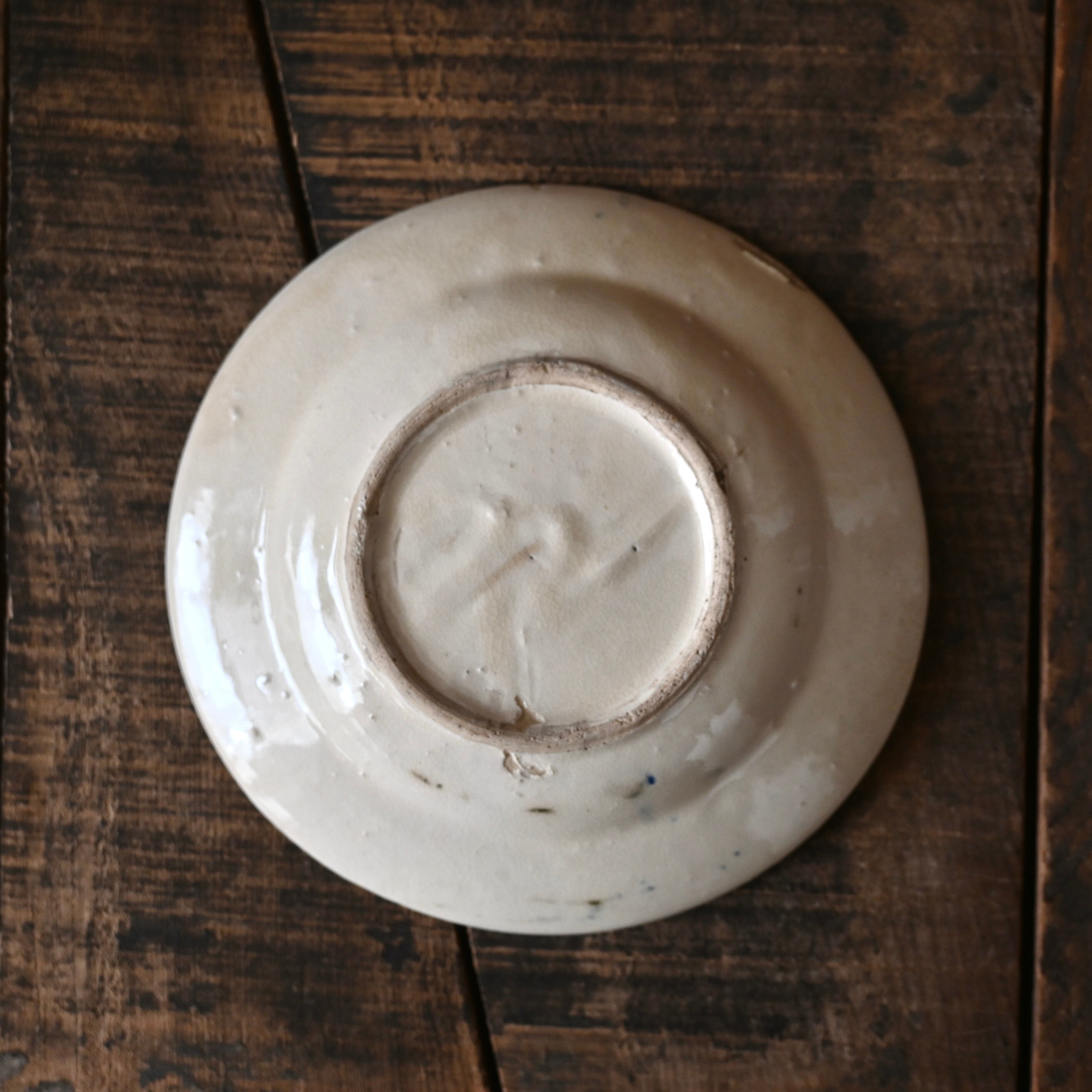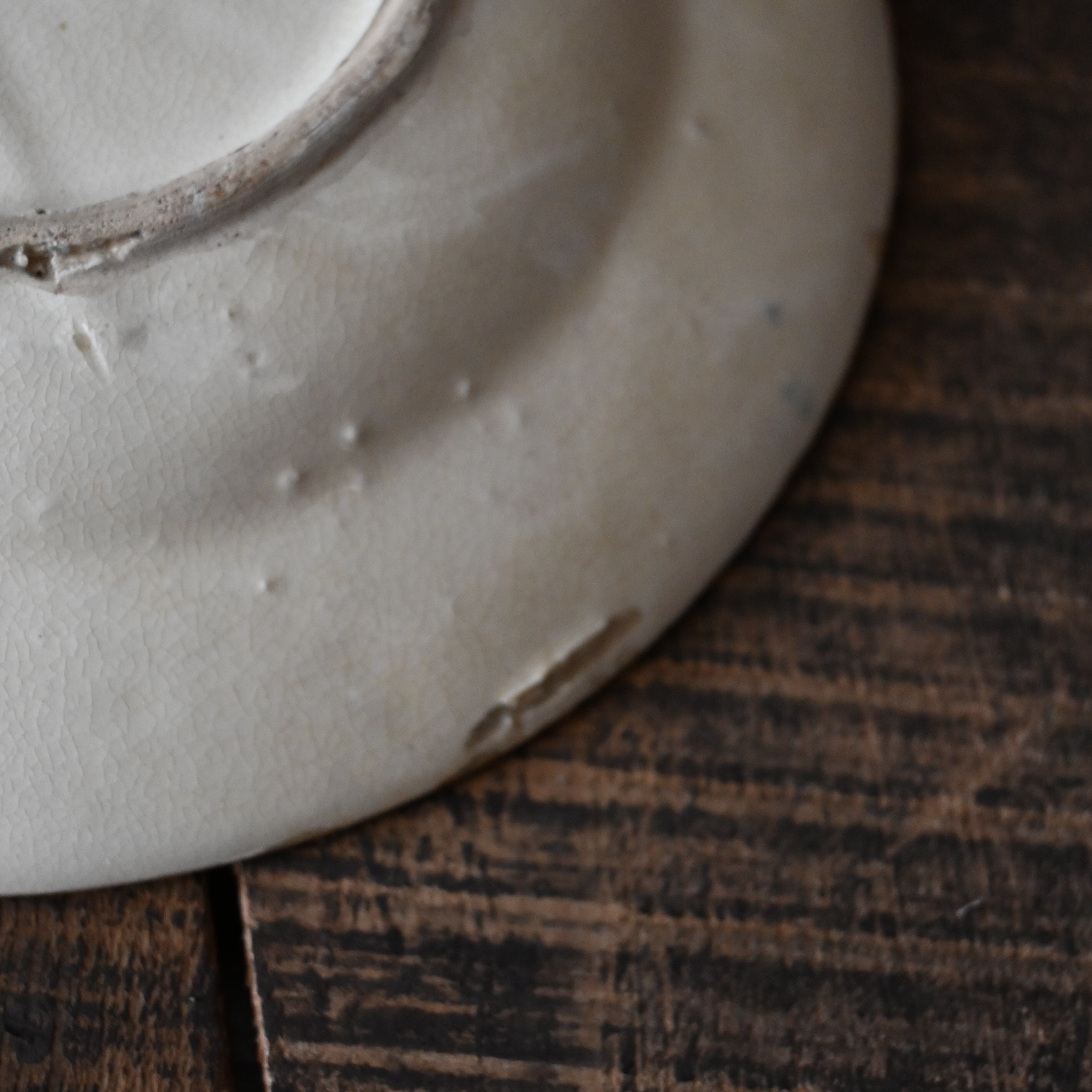 焼成時に器を重ねて焼くため、高台(底の部分)や縁に、小さな突起や釉薬の剥がれた跡が残ることがあります。これは当時の製法ならではの特徴であり、ひとつひとつ異なる個性を持つ証ともいえます。