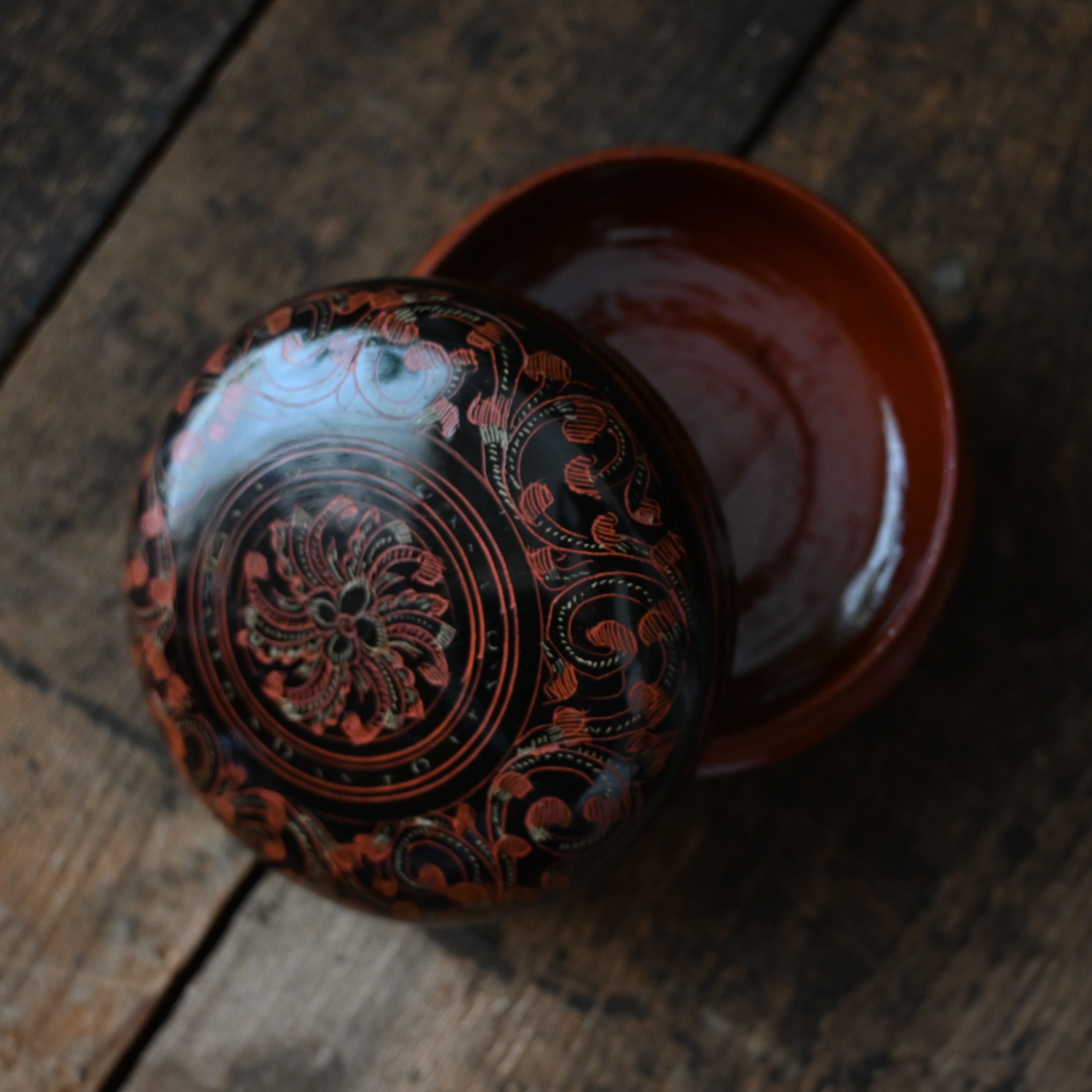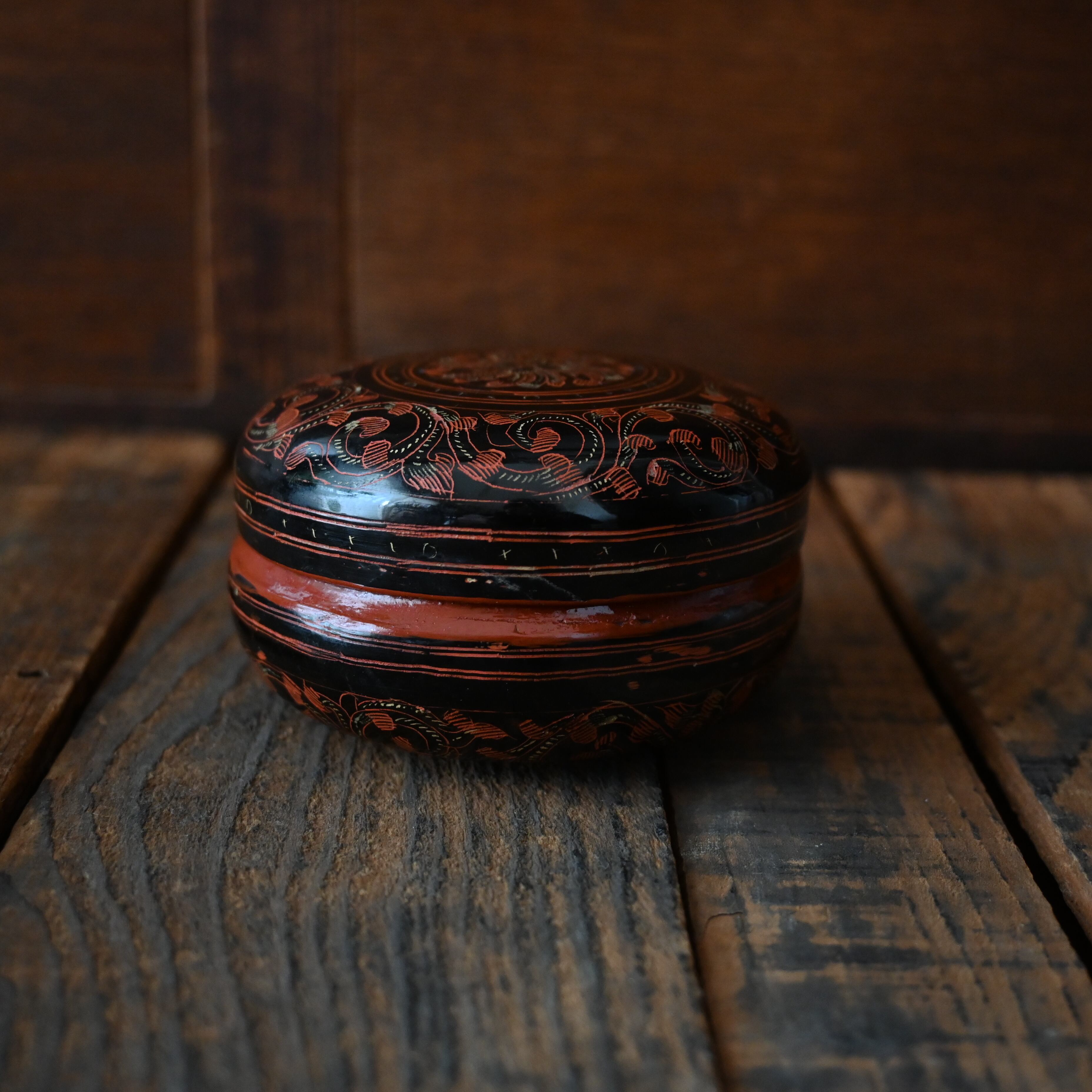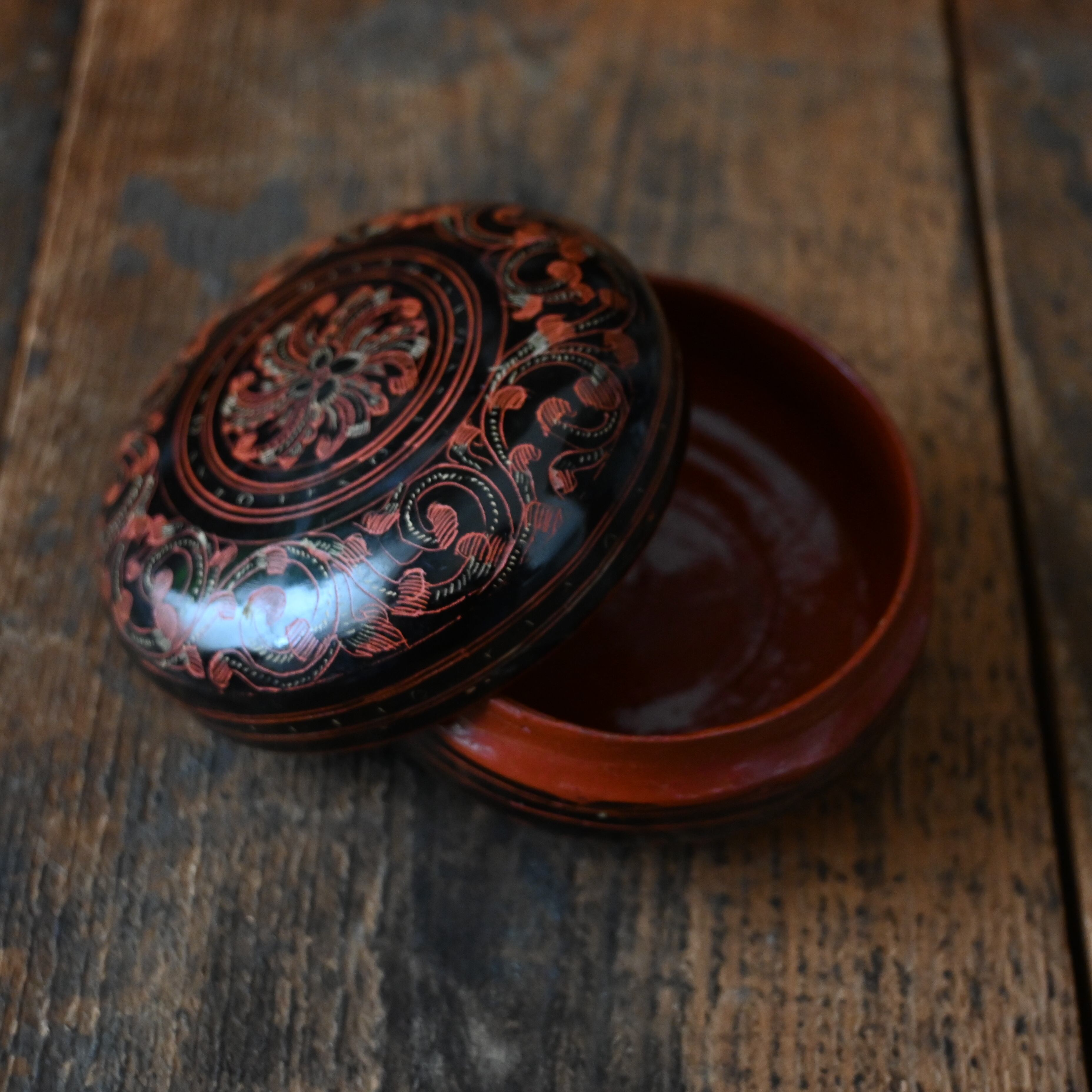 タイ北部・チェンマイで出会った艶やかな黒に赤と金が映える美しい小箱。こちらは古いものになります。