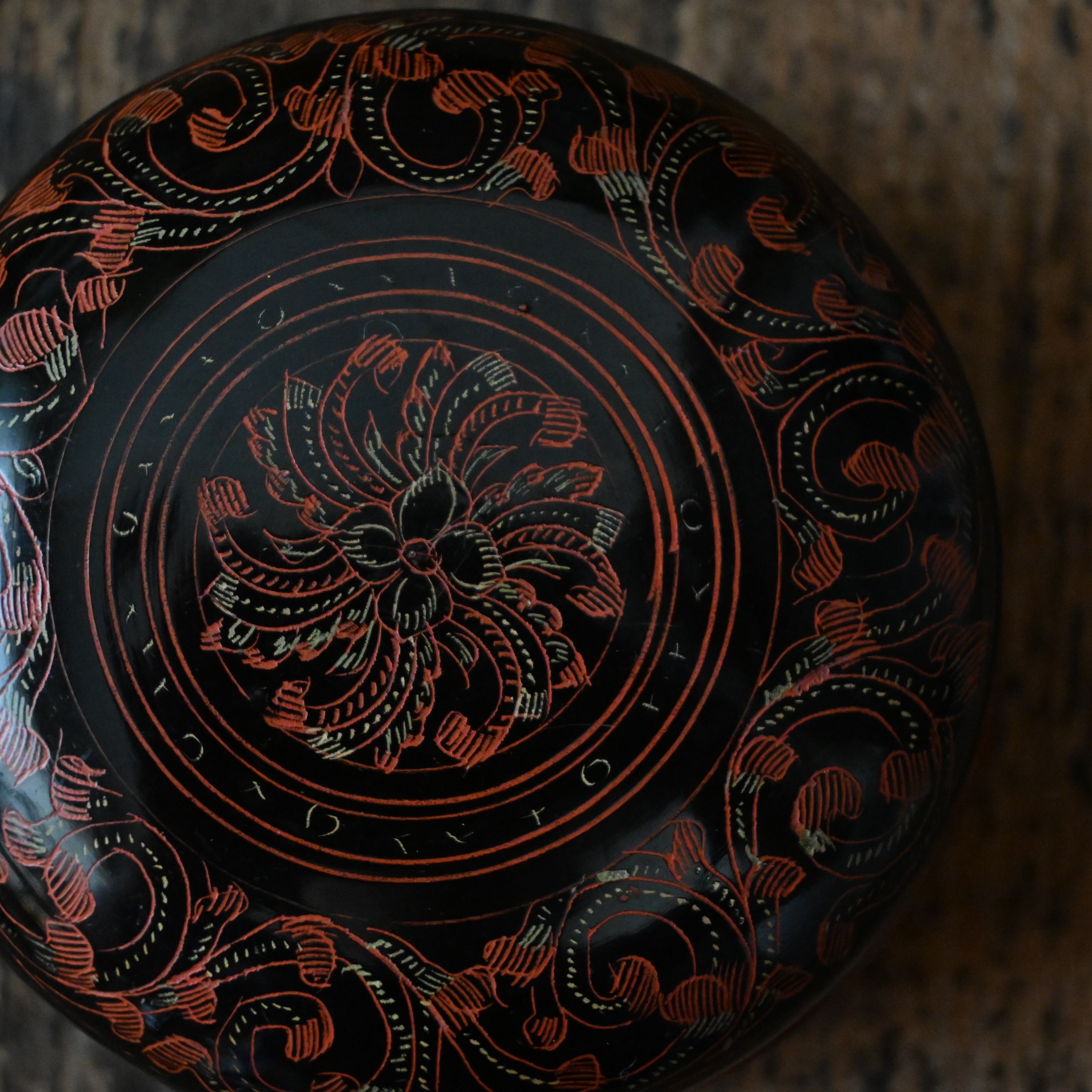 蓋には花のような細かな文様がぐるりと描かれ、手に取るとその丁寧な筆遣いと深い艶が静かに語りかけてくるよう。