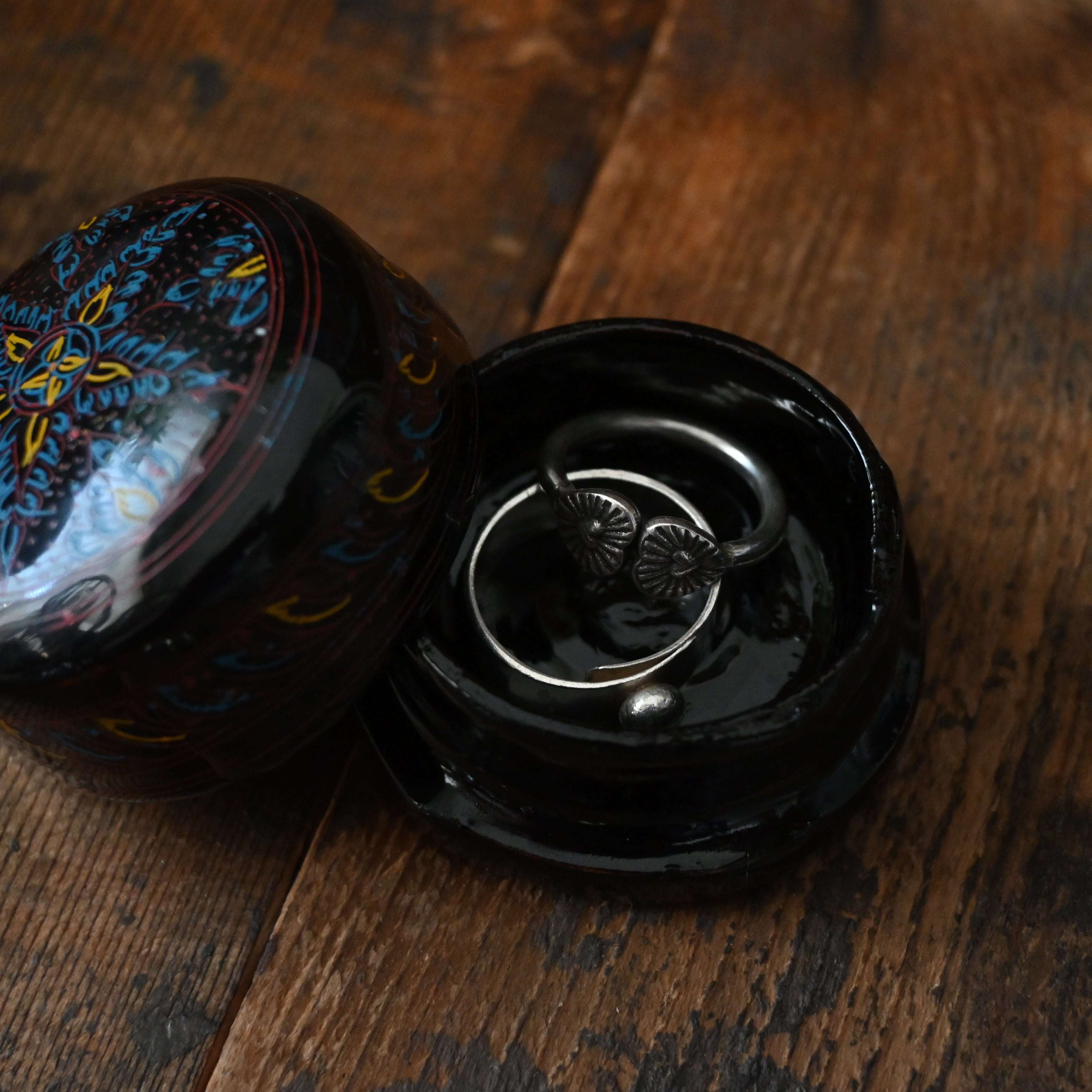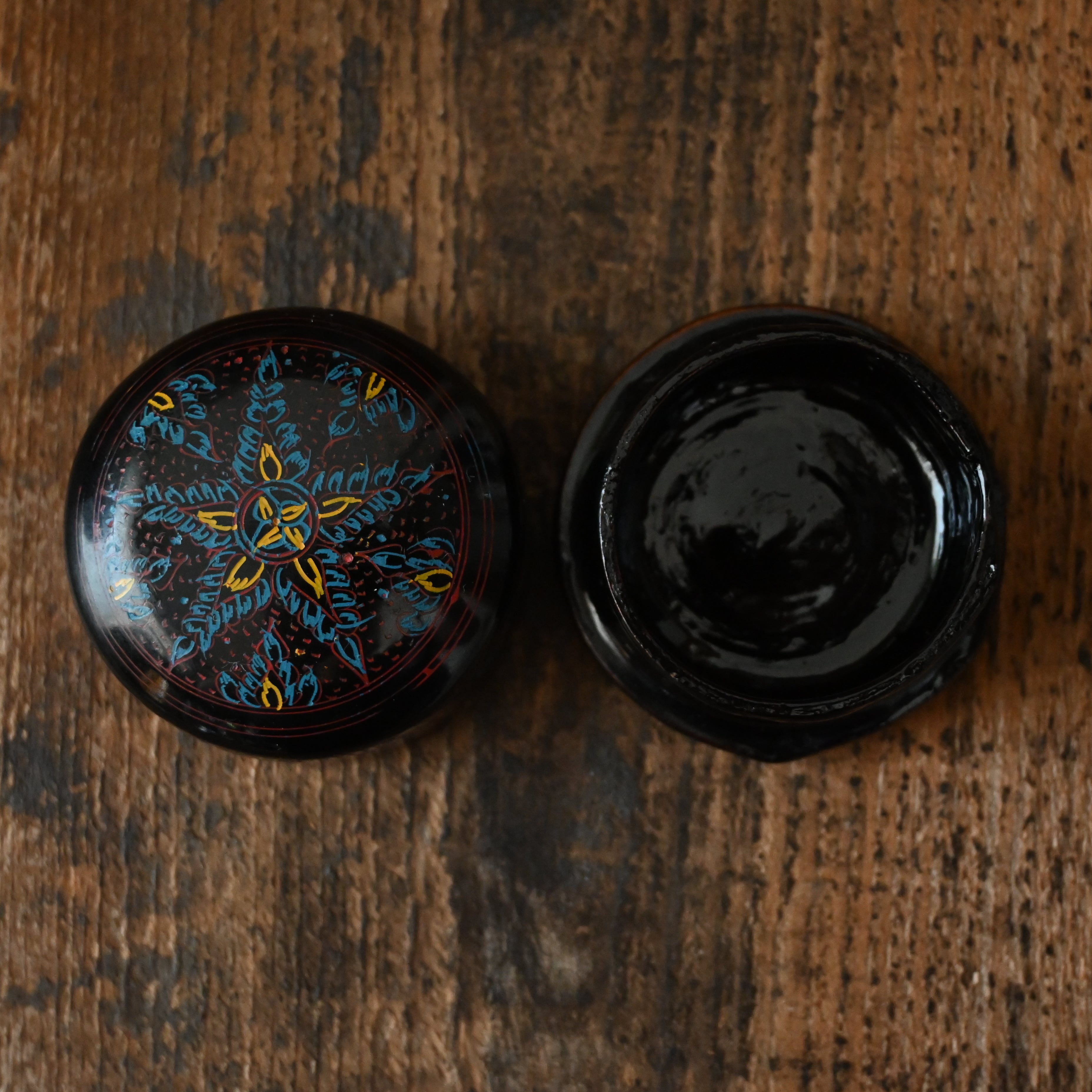 蓋には花のような細かな文様がぐるりと描かれ、手に取るとその丁寧な筆遣いと深い艶が静かに語りかけてくるよう。