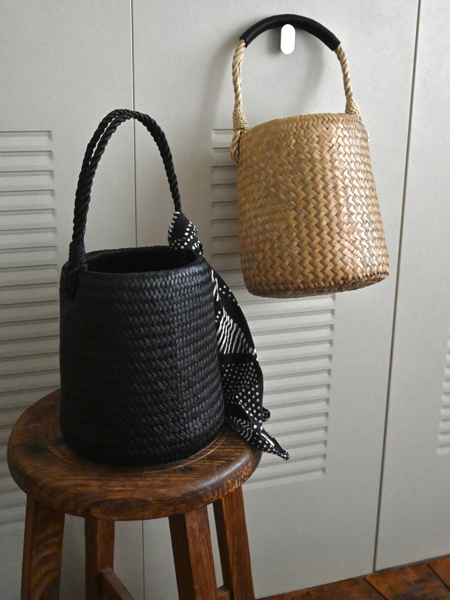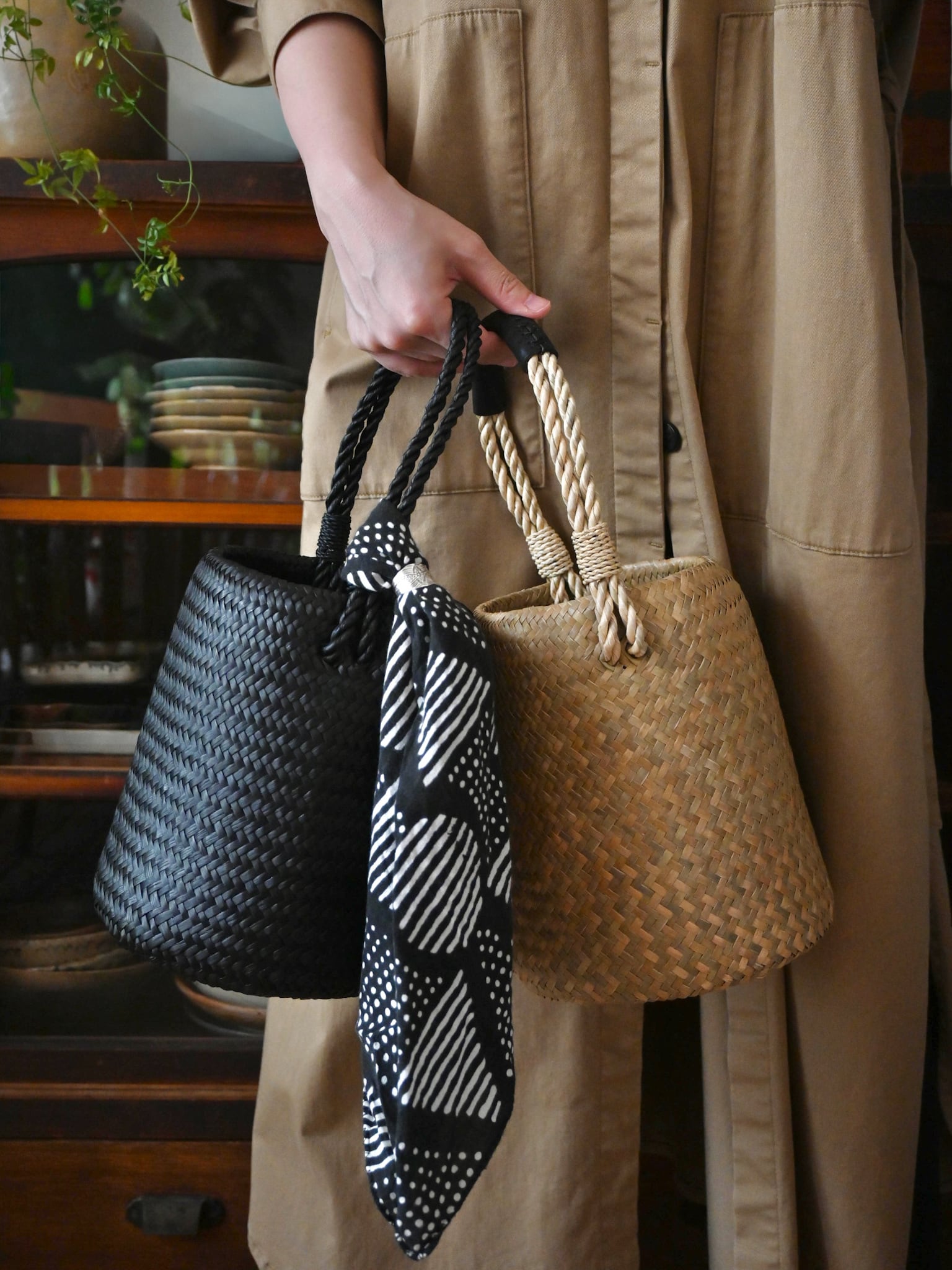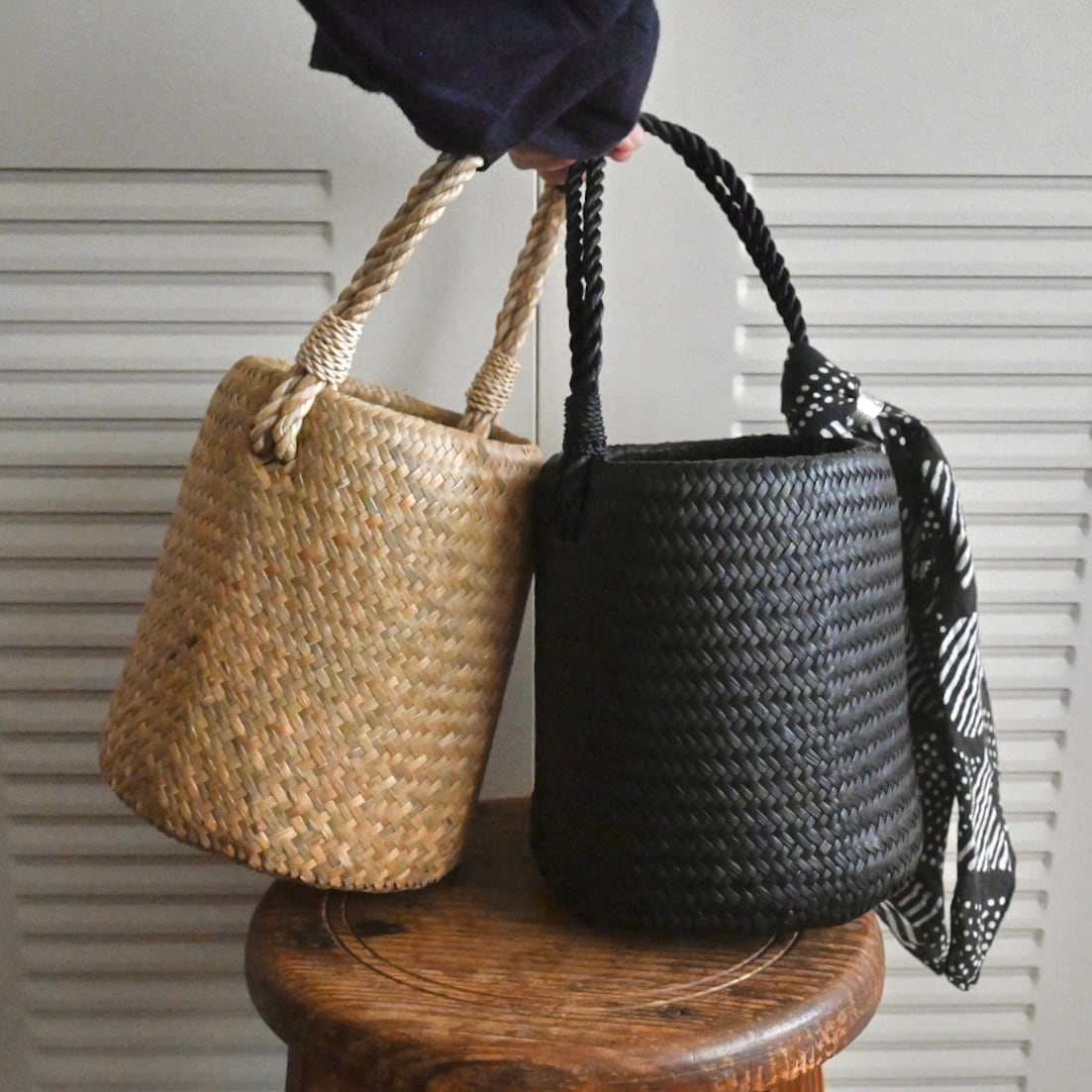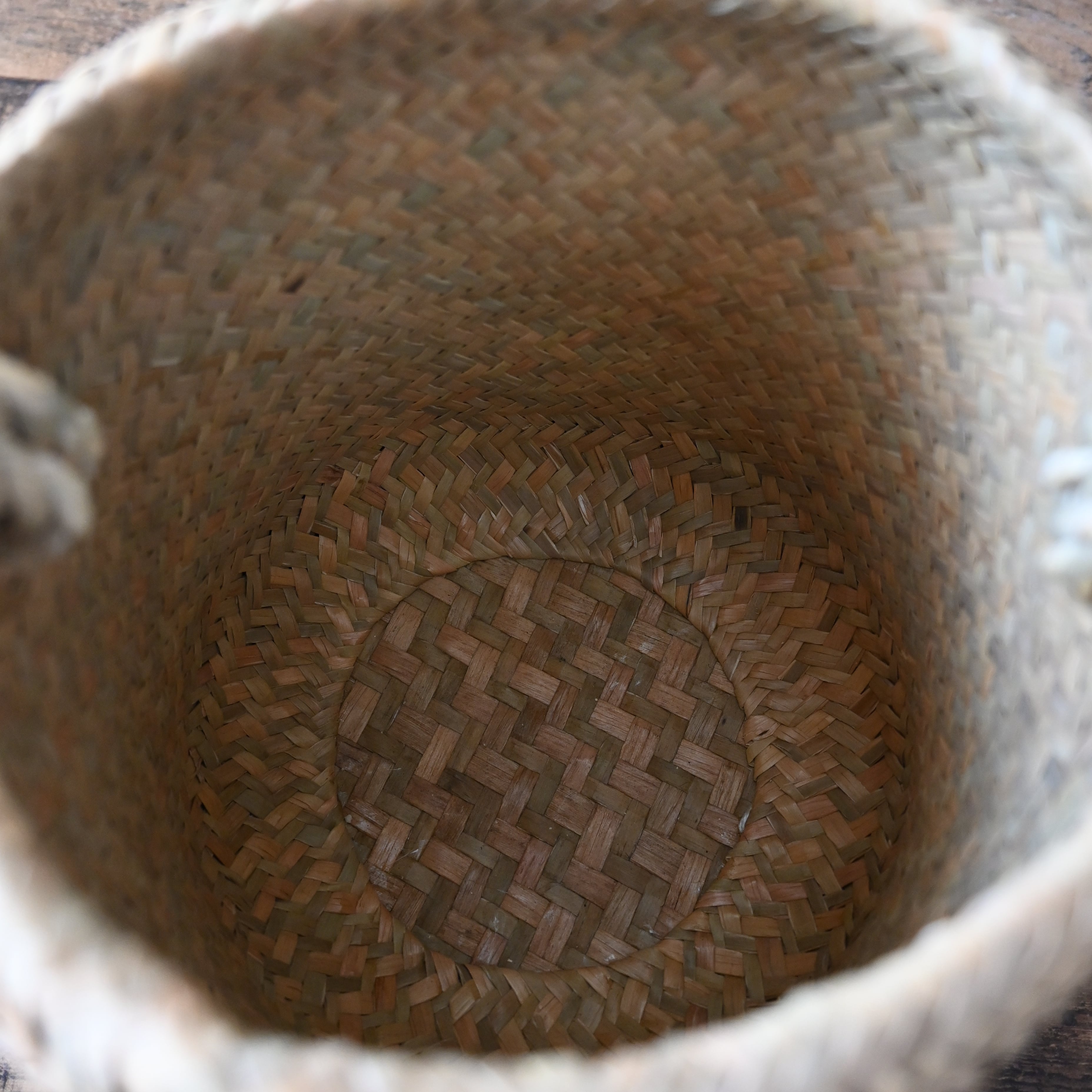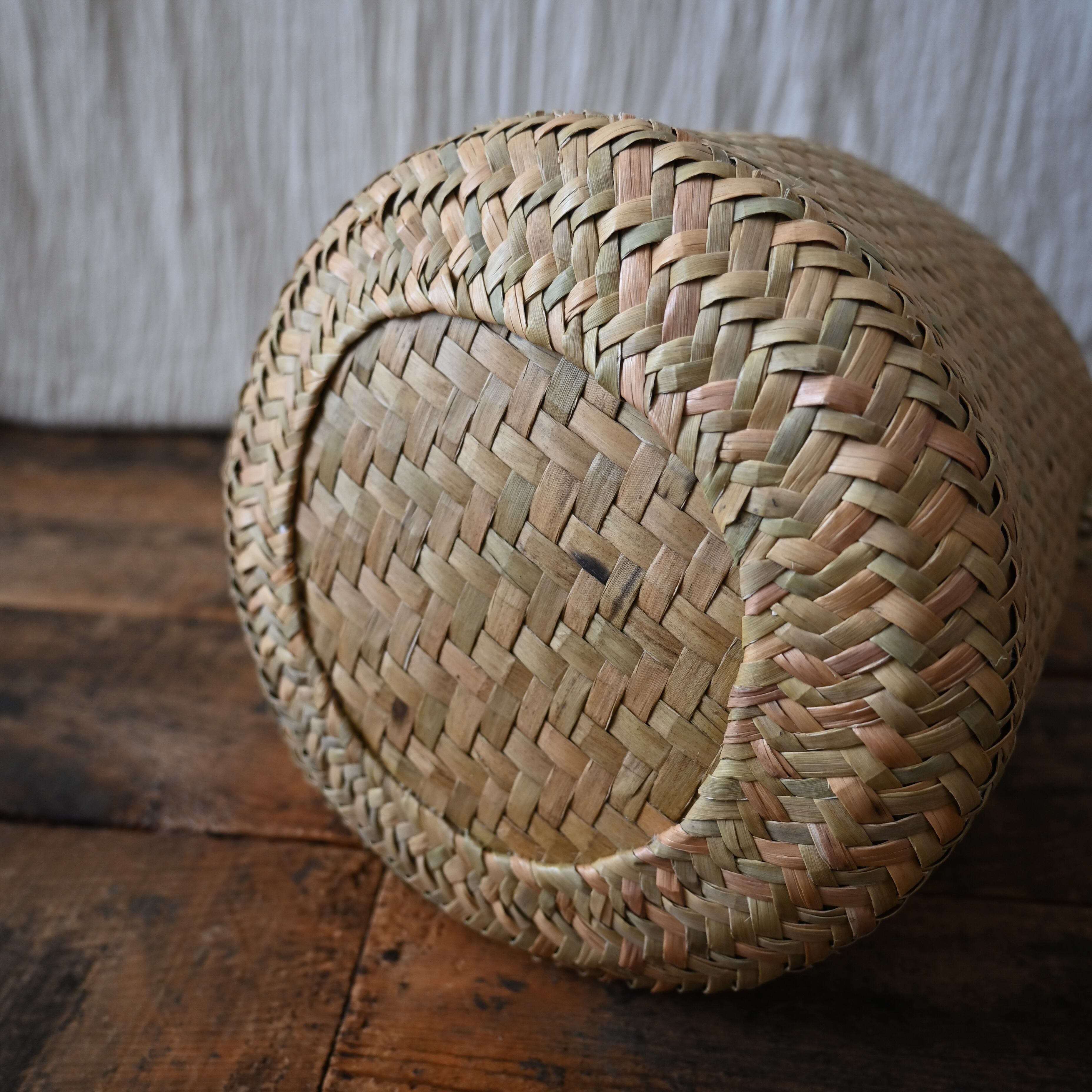 水草で作られるバスケットたちは、作られて間もないものは水分を多く含み、やや緑がかった色合い。そこから使っていくうちに水分が抜けると画像のように色が明るく黄味がかった色に変化し、しなやかさが増します。日々変化する風合いをお楽しみください。