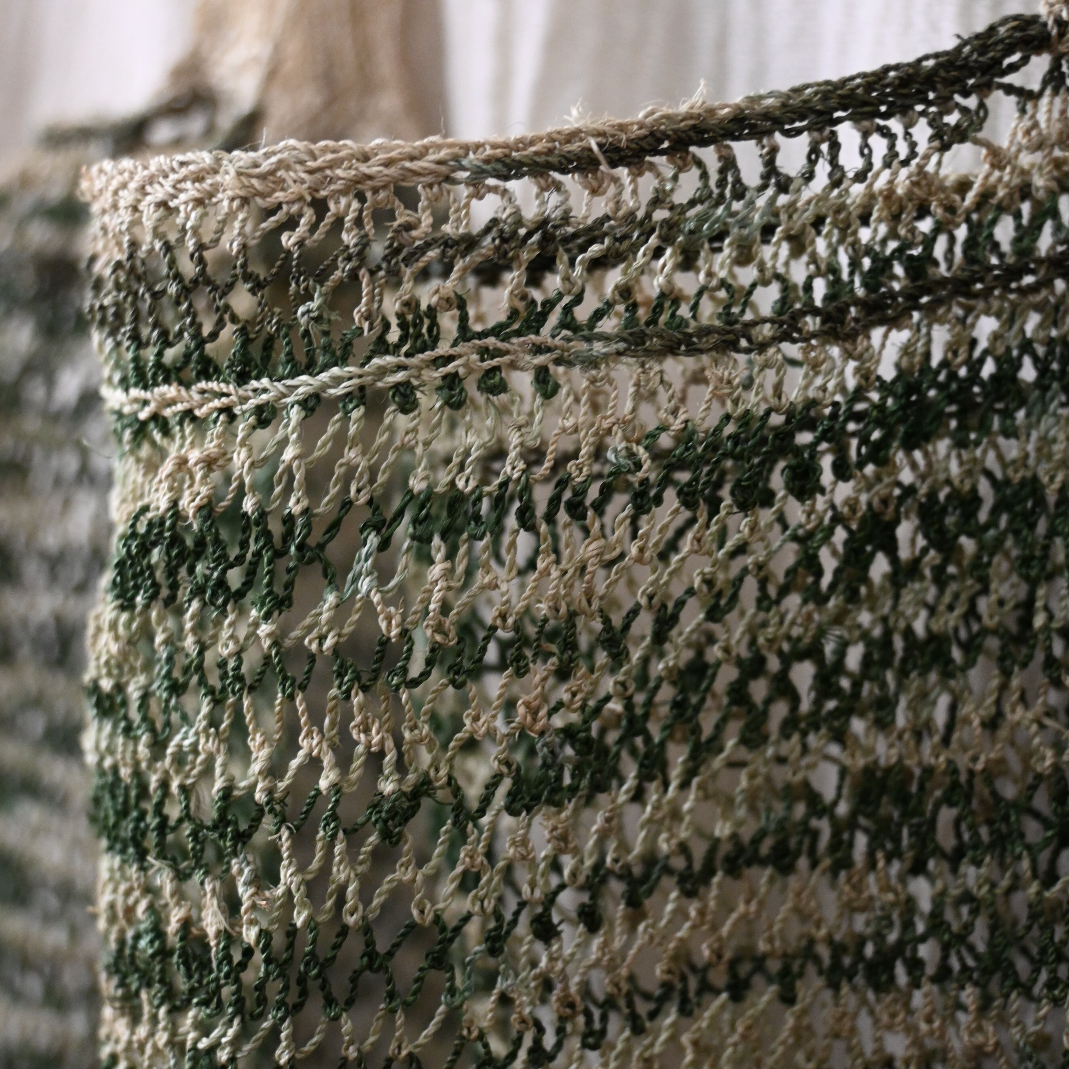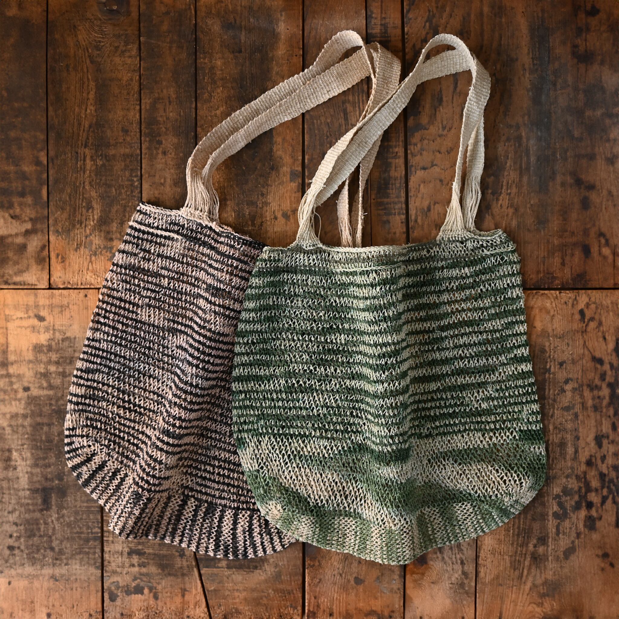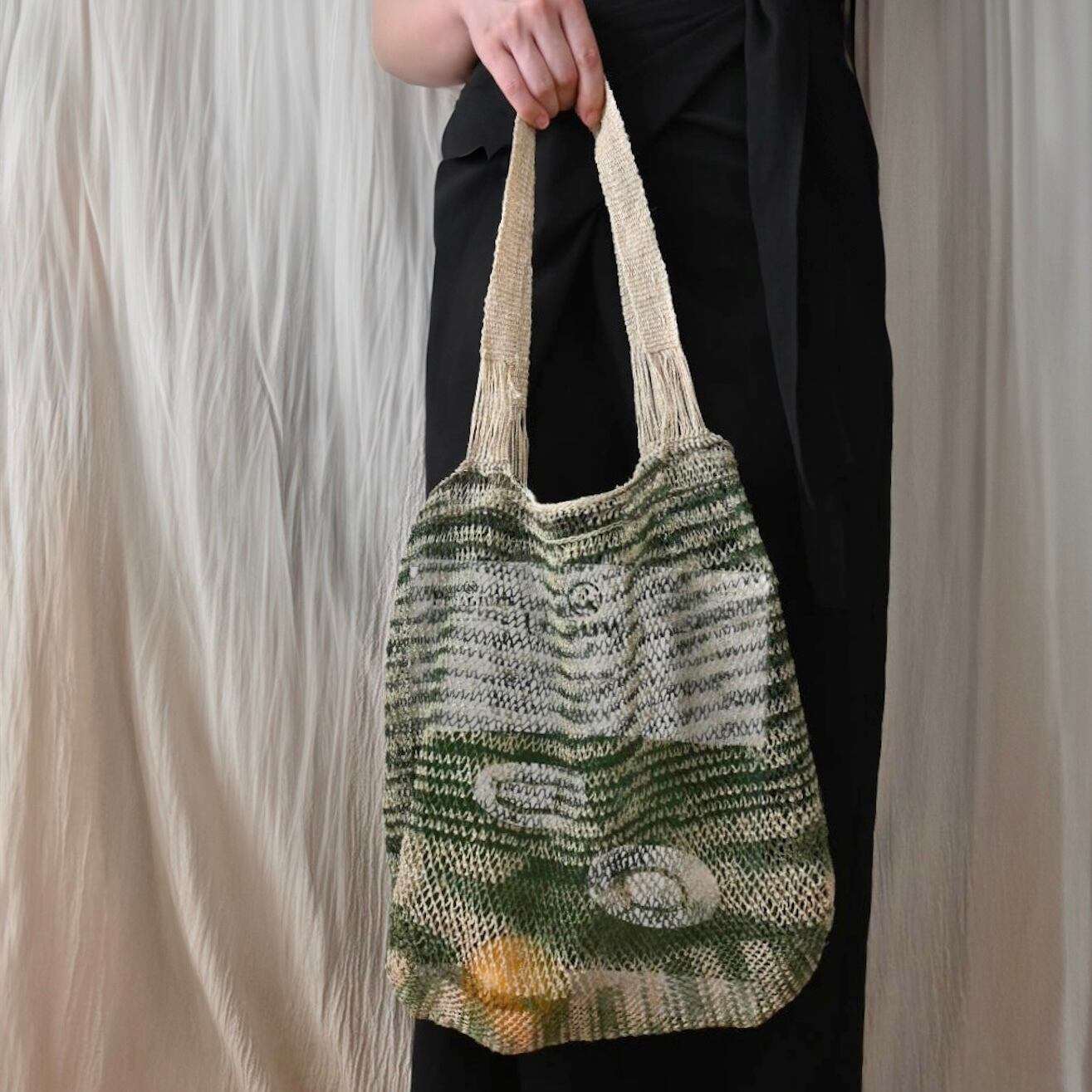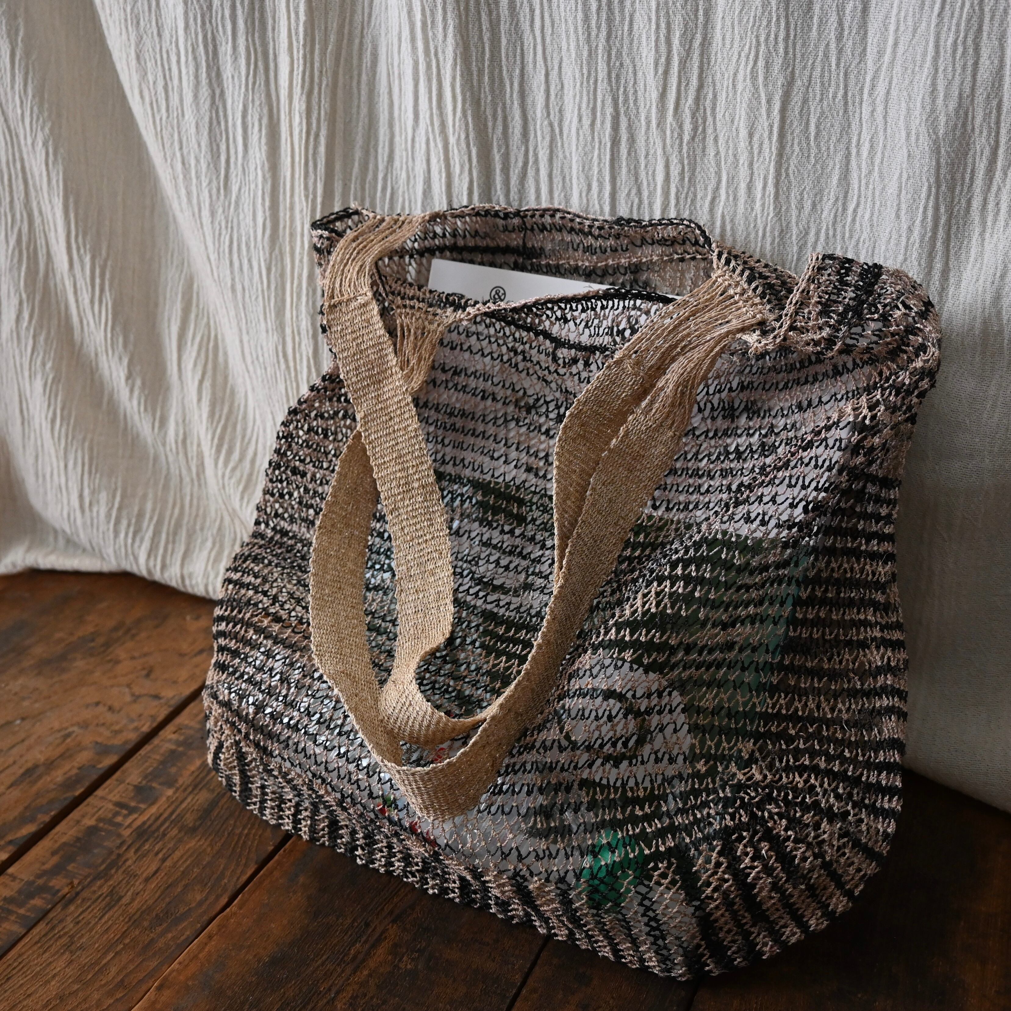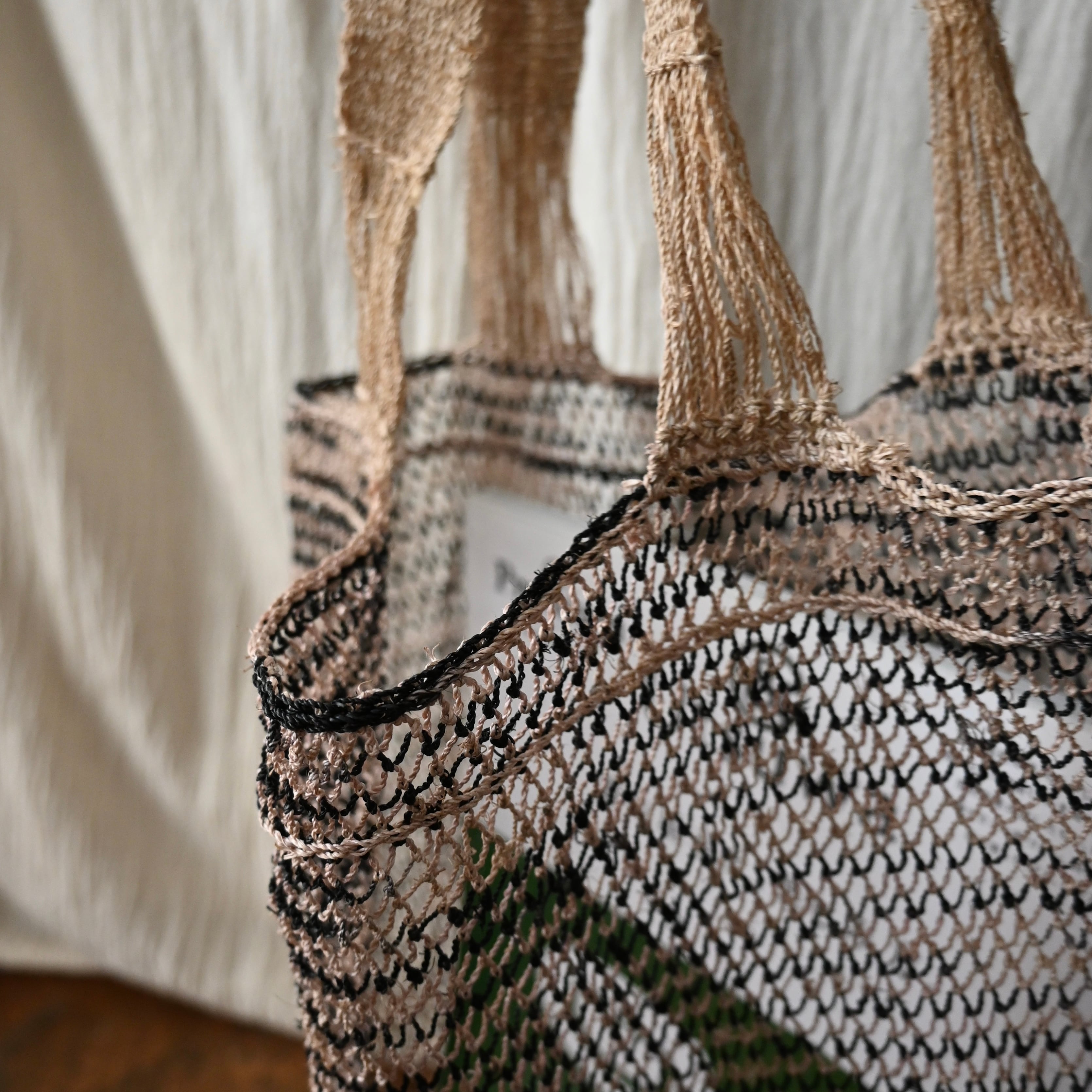 編み目は一目ずつ結ばれていますが、ほつれや切れが気になる場合は、天然繊維の糸で結び直してお使い下さい。
