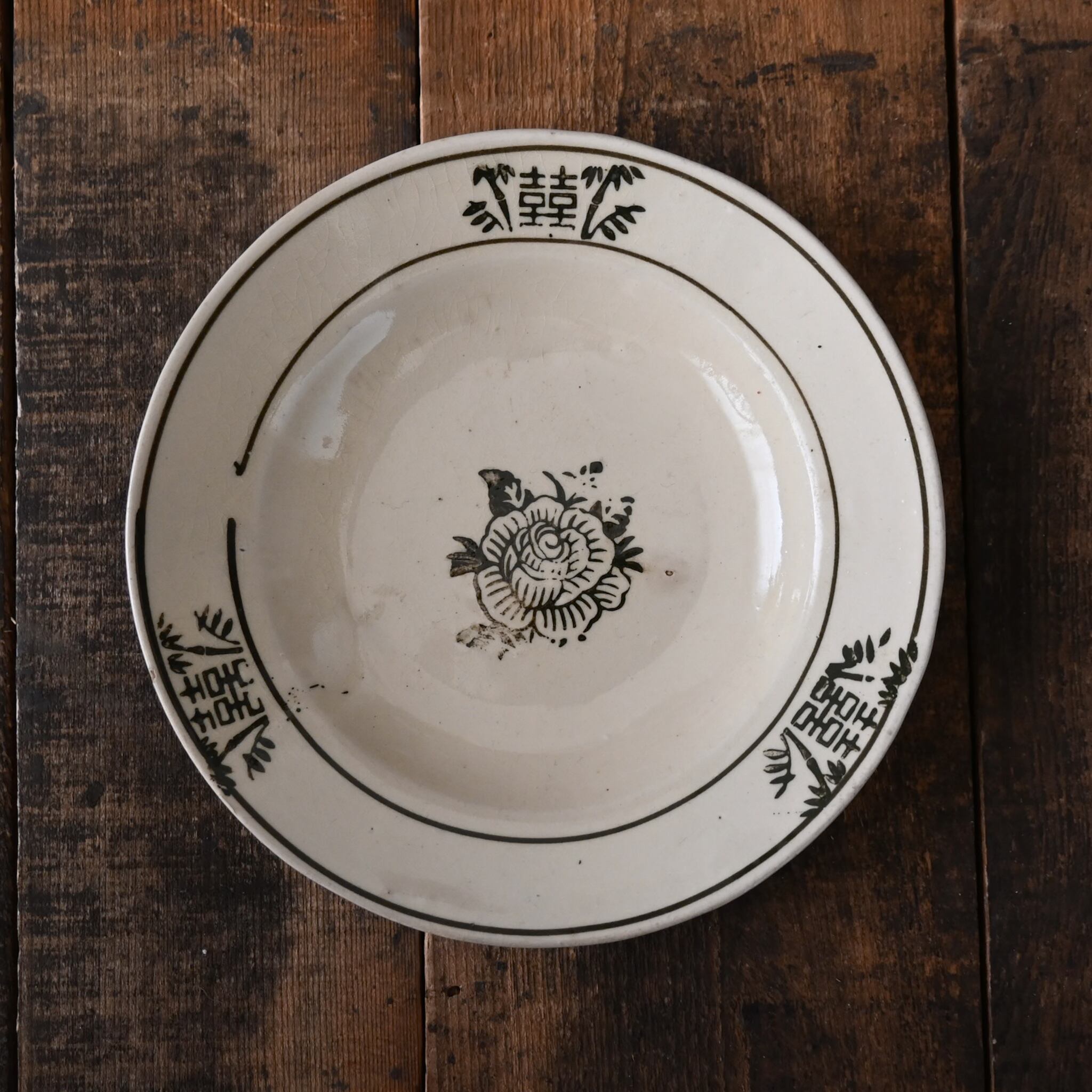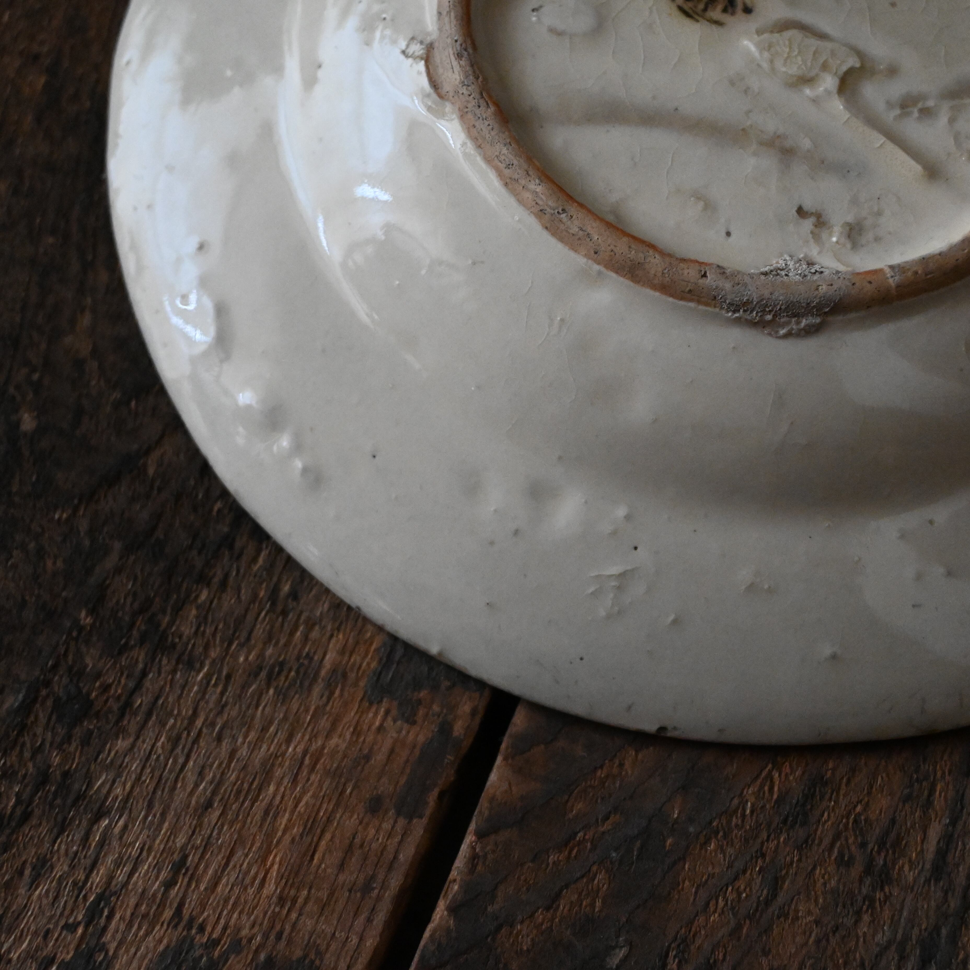 焼成時に器を重ねて焼くため、高台(底の部分)や縁に、小さな突起や釉薬の剥がれた跡が残ることがあります。これは当時の製法ならではの特徴であり、ひとつひとつ異なる個性を持つ証ともいえます。