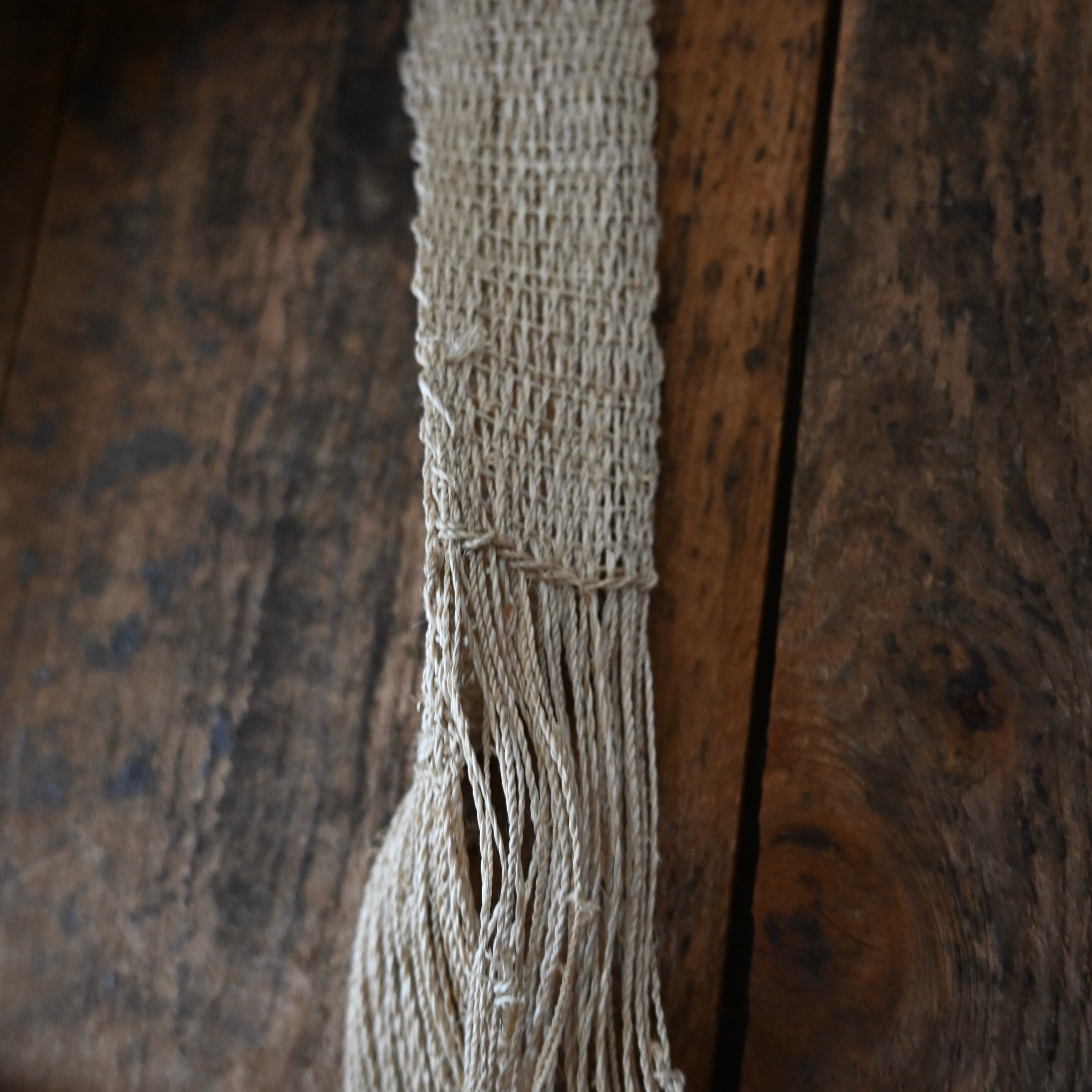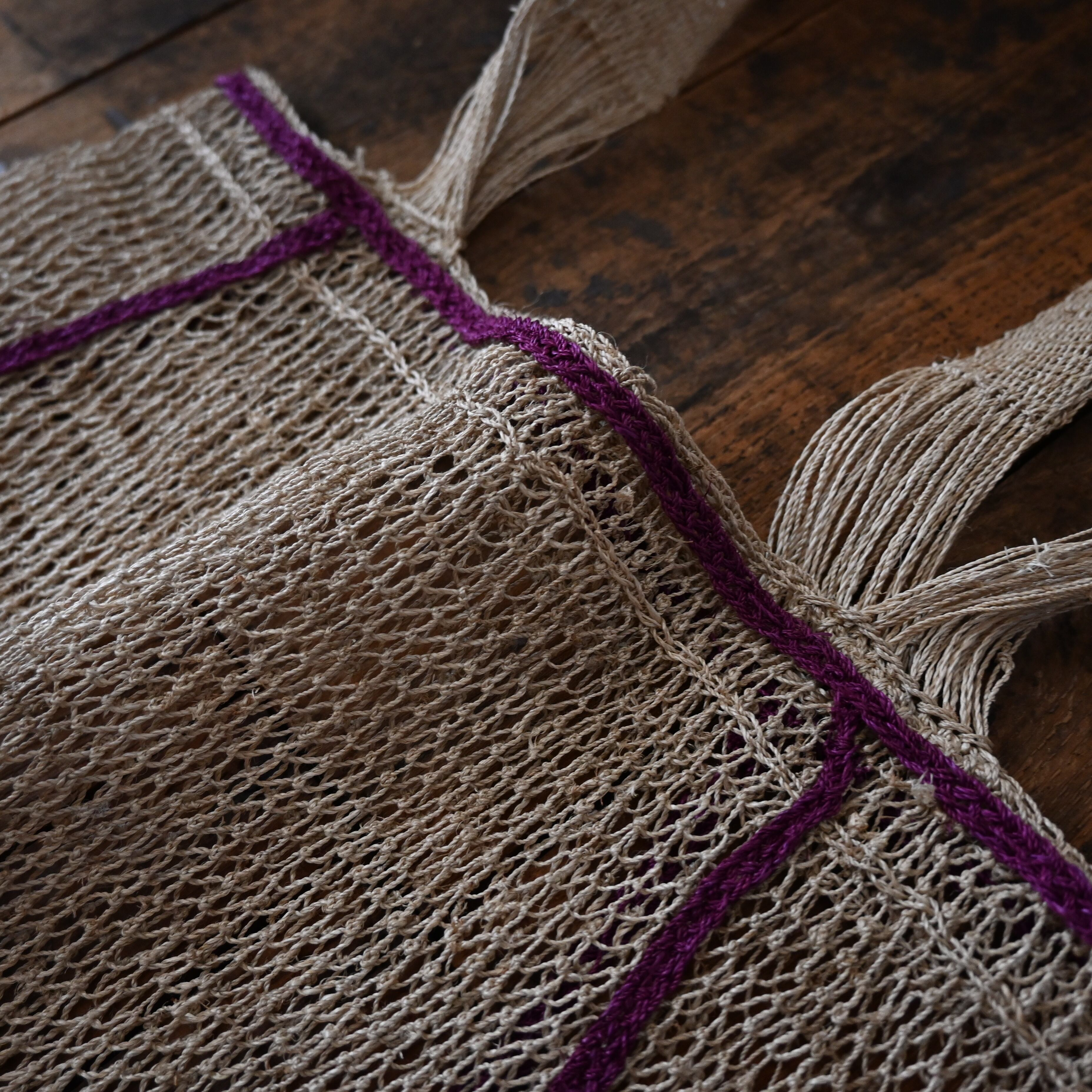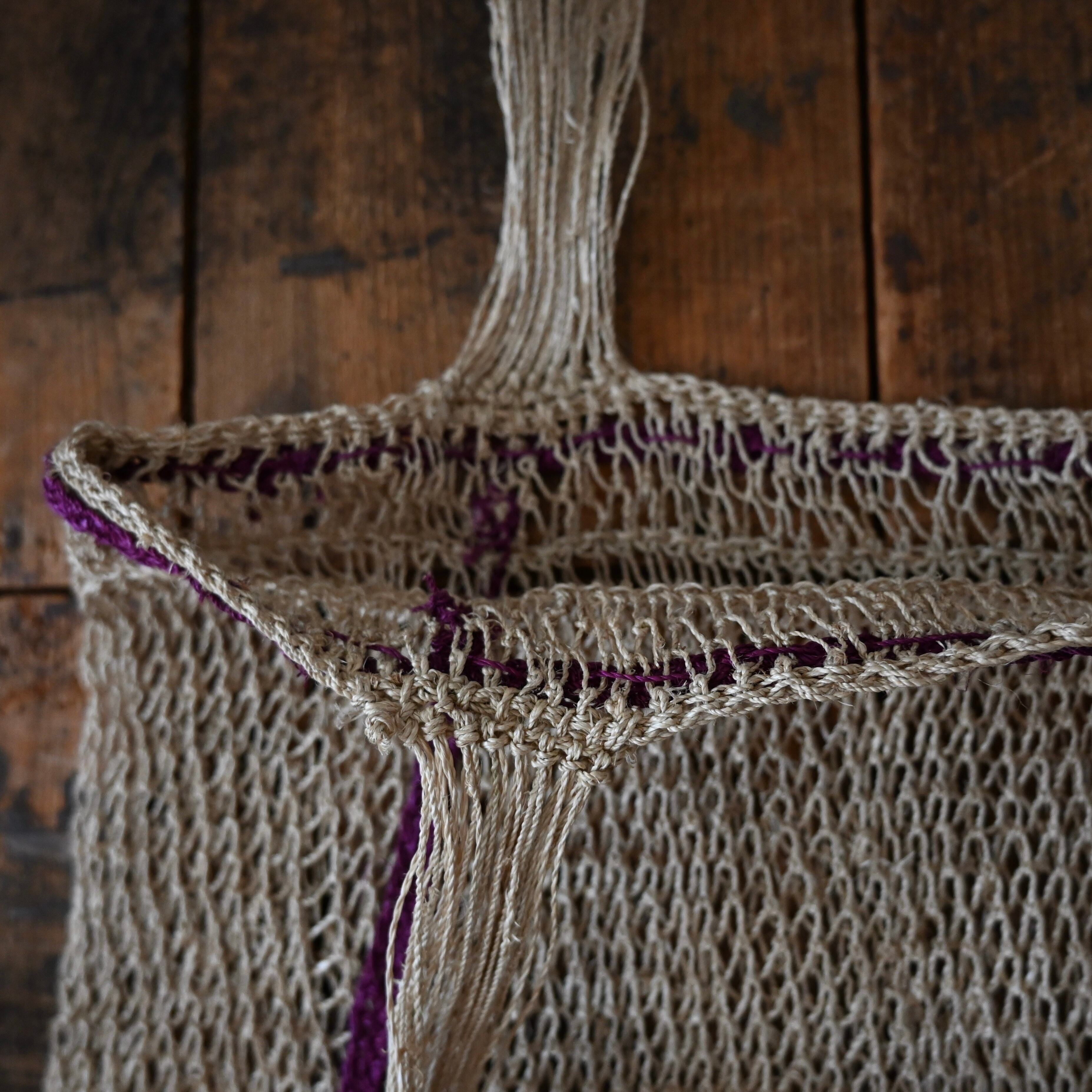 編み目は一目ずつ結ばれていますが、ほつれや切れが気になる場合は、天然繊維の糸で結び直してお使い下さい。