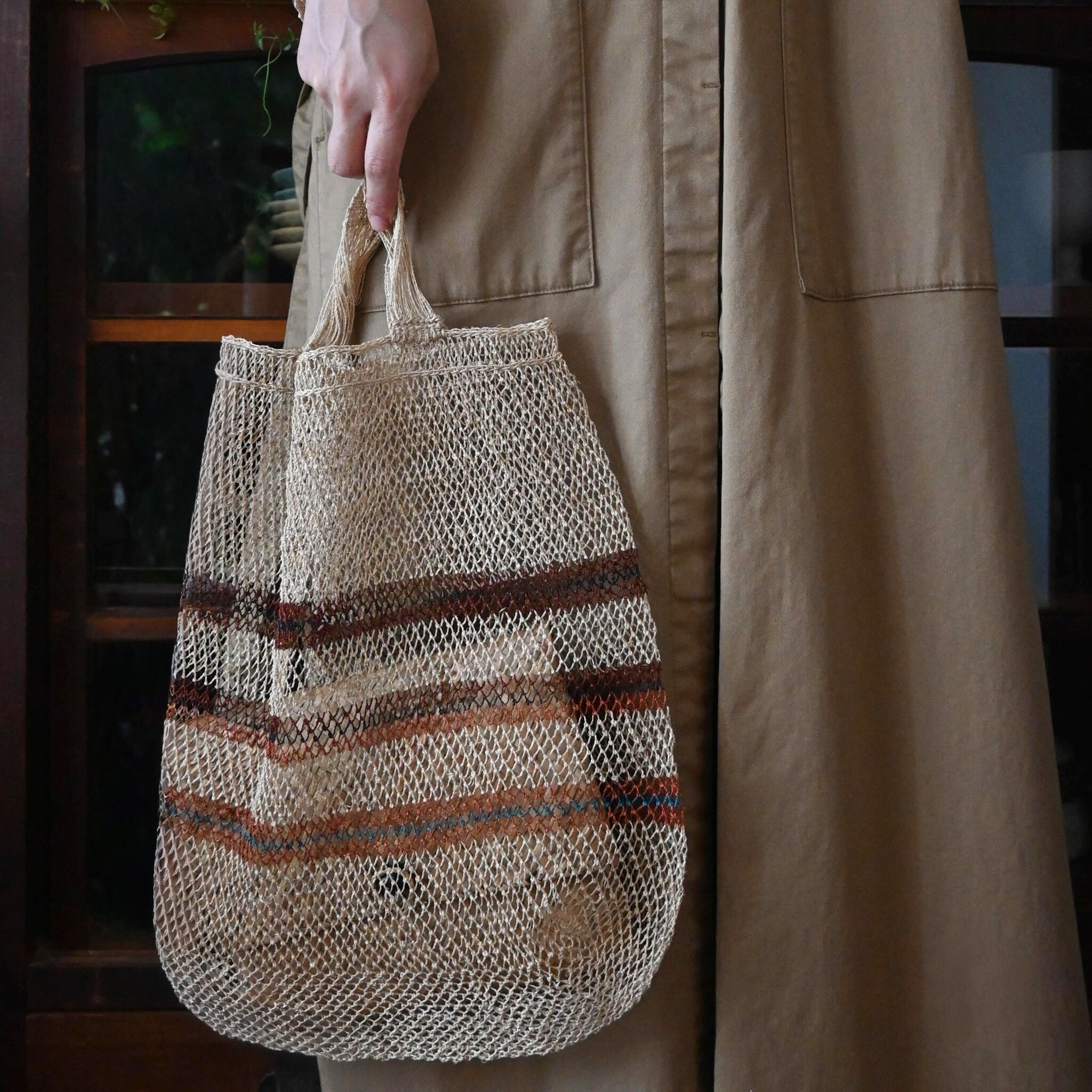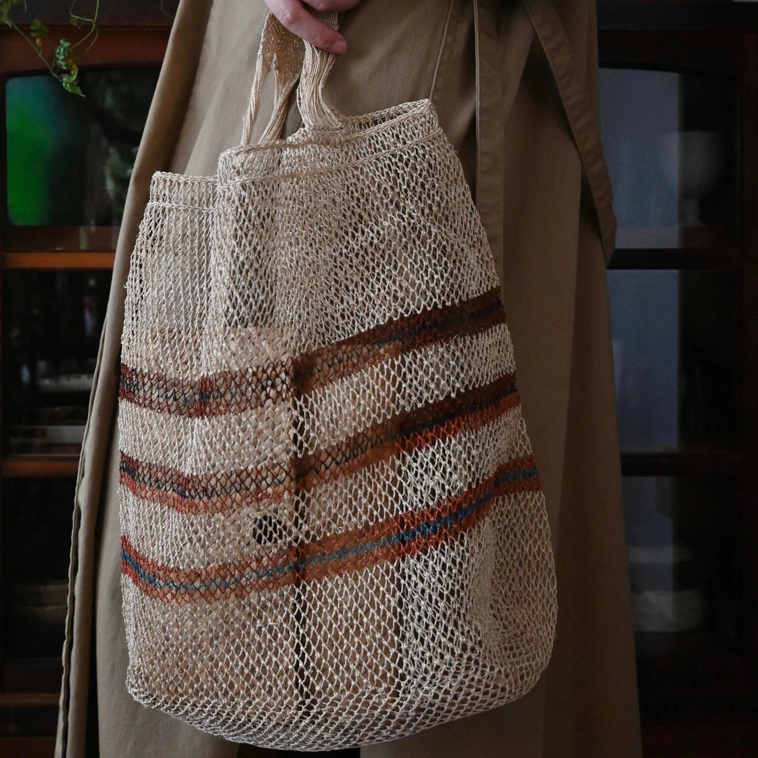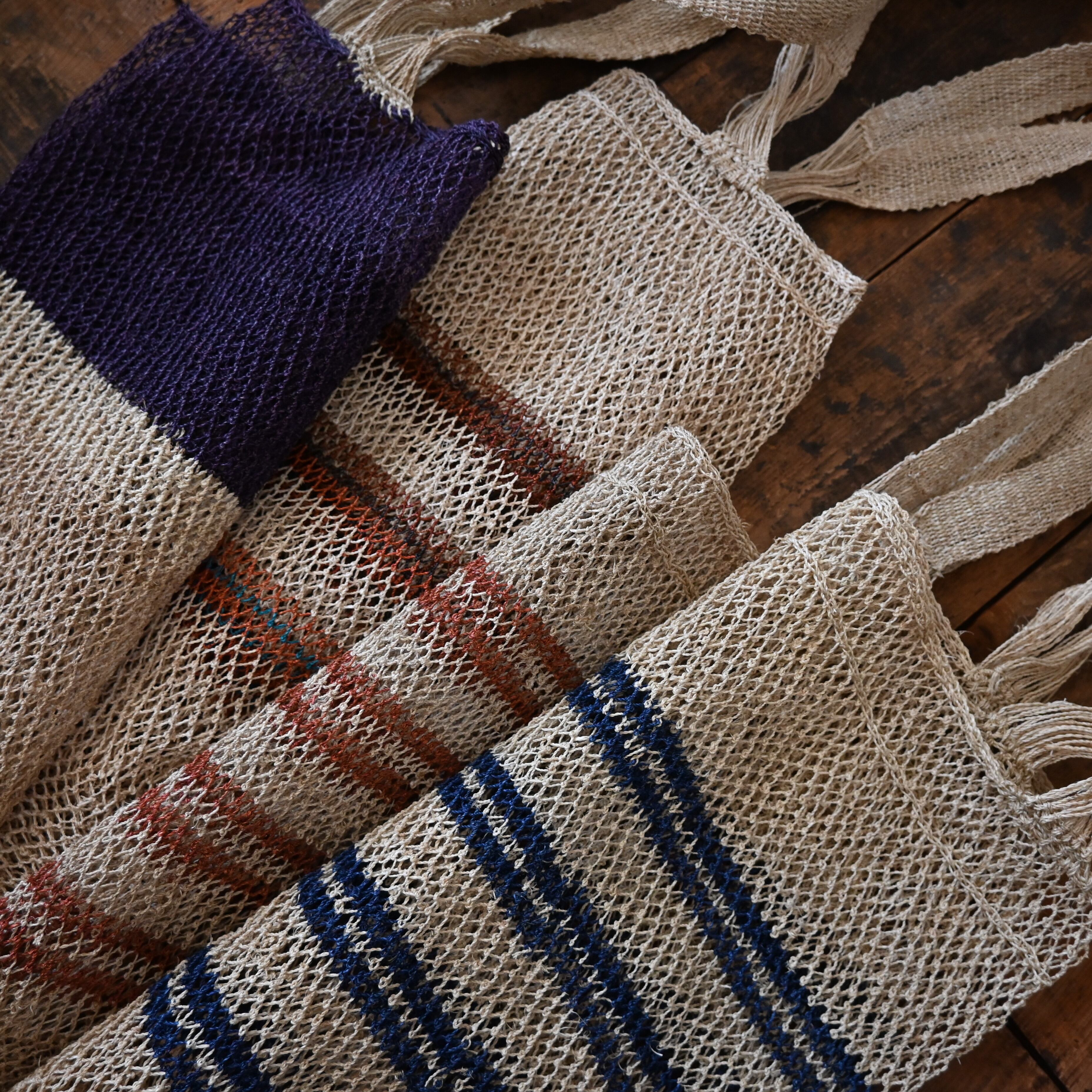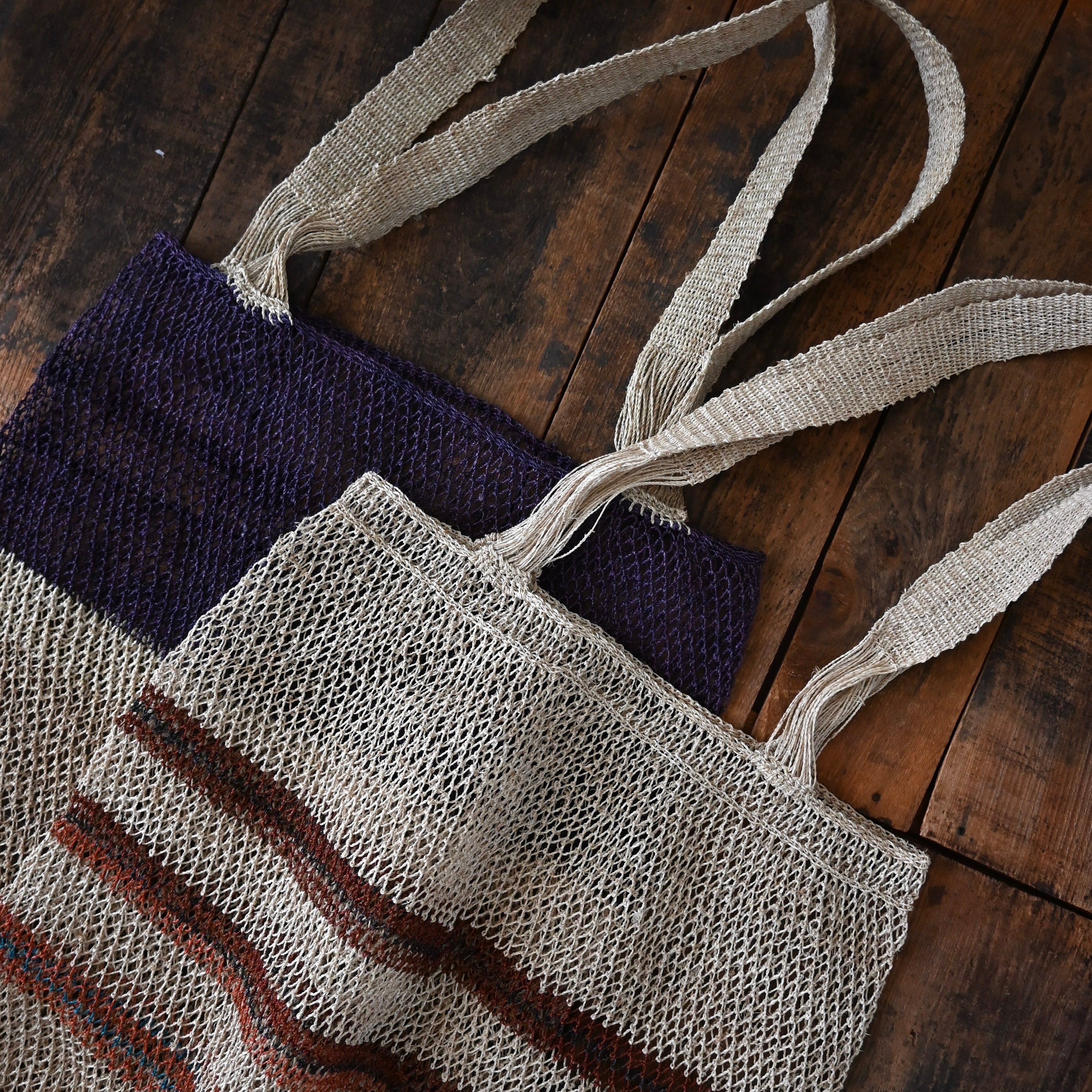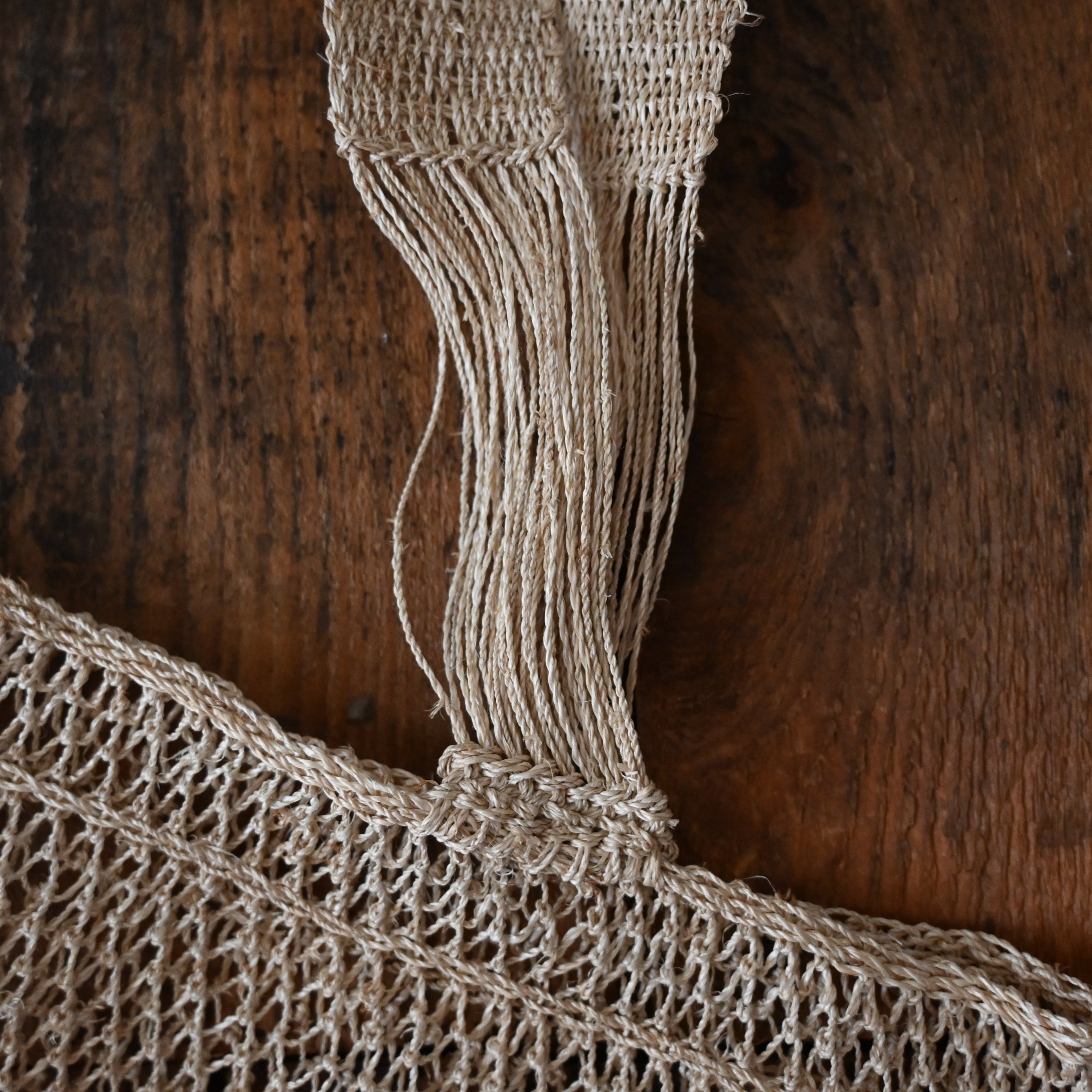 編み目は一目ずつ結ばれていますが、ほつれや切れが気になる場合は、天然繊維の糸で結び直してお使い下さい。