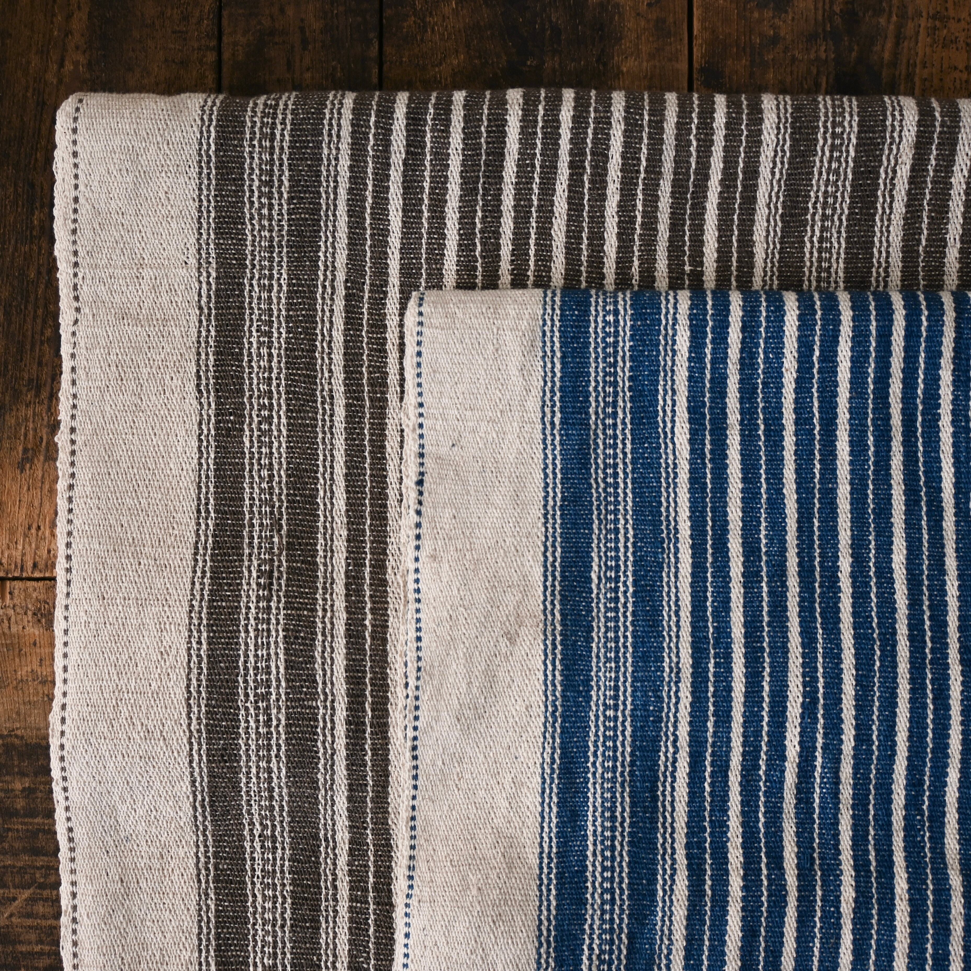 綿から紡いだ糸を涼やかな藍(青)と優しい印象の黒檀(茶)で染め、それぞれの村々で受け継がれてきた伝統的な柄が織られています。