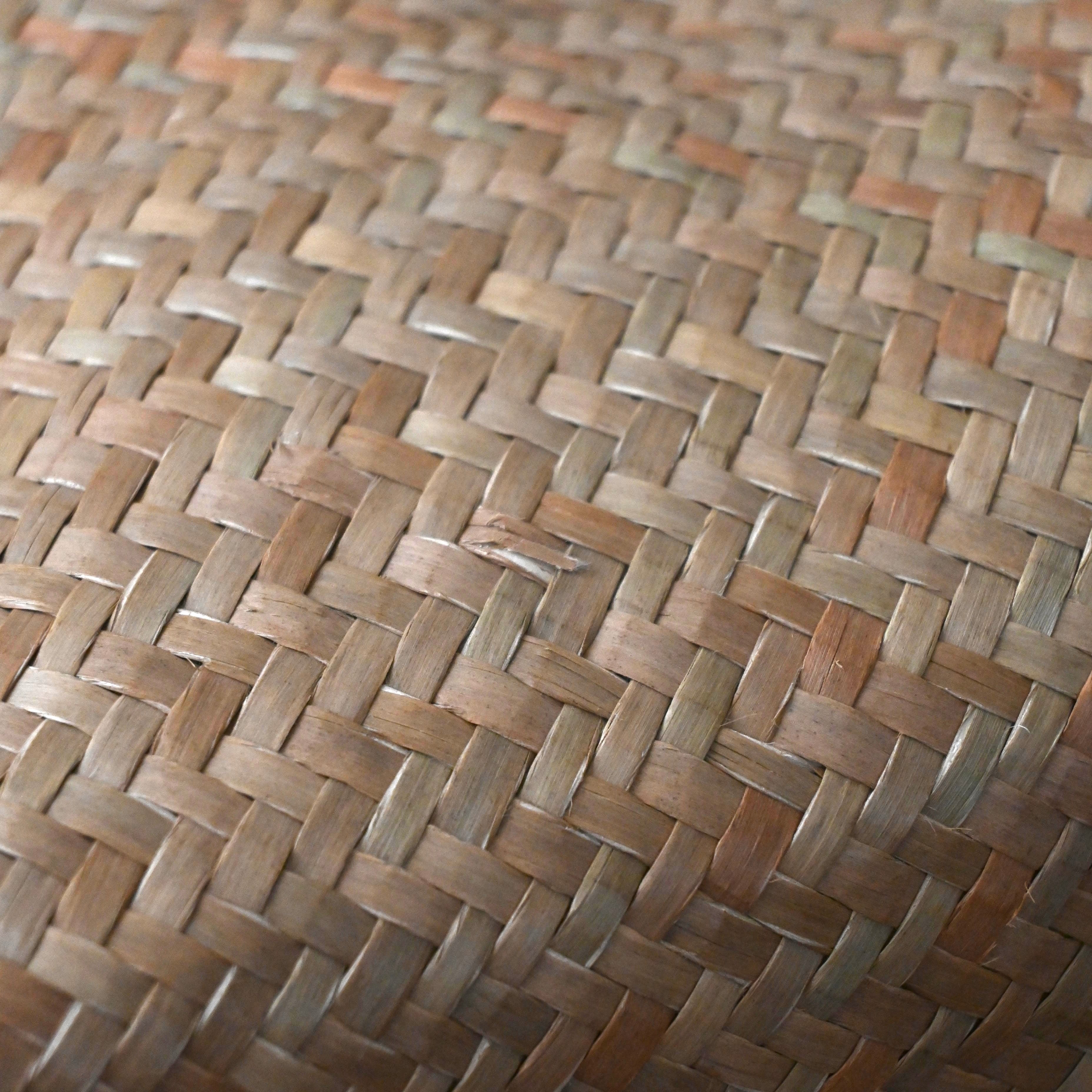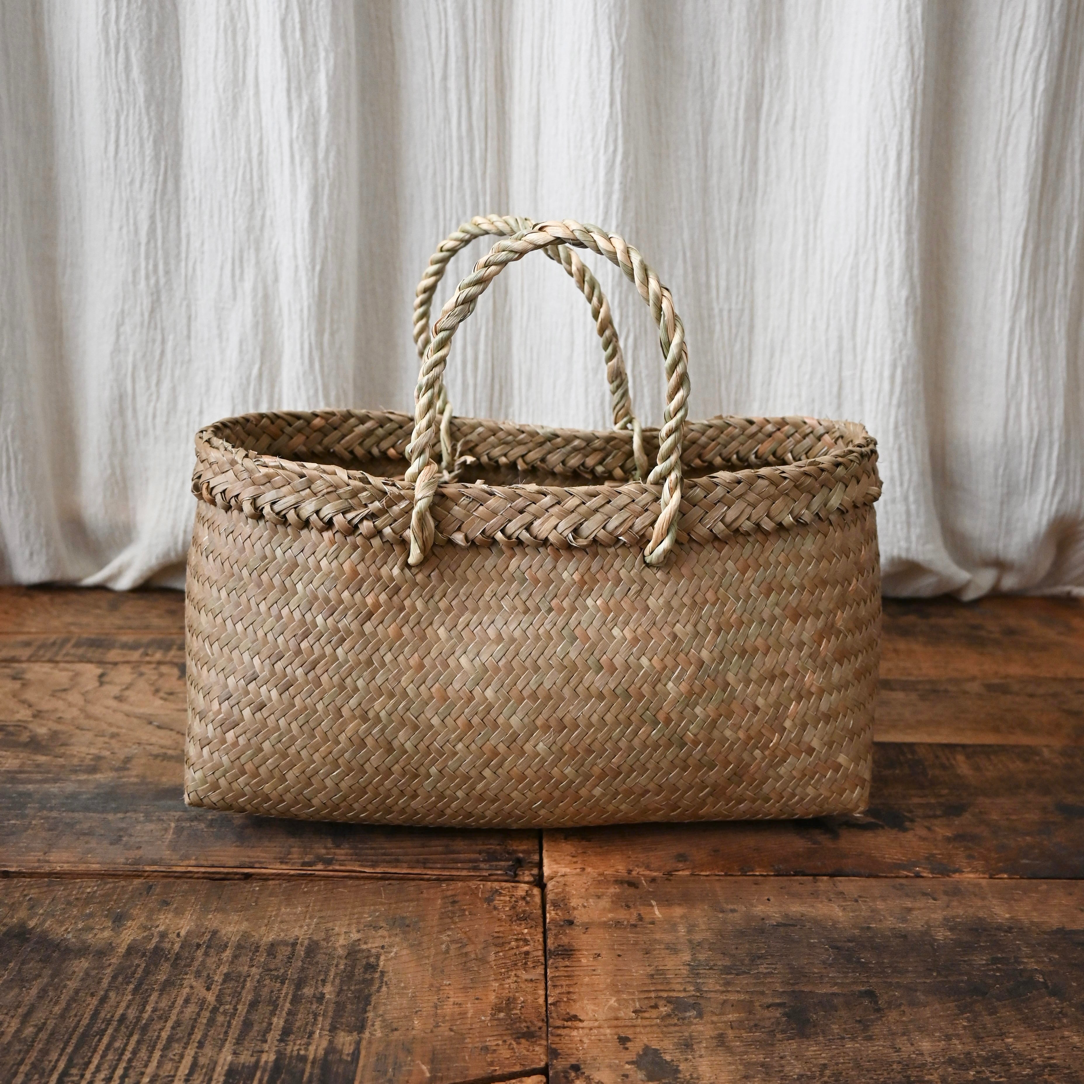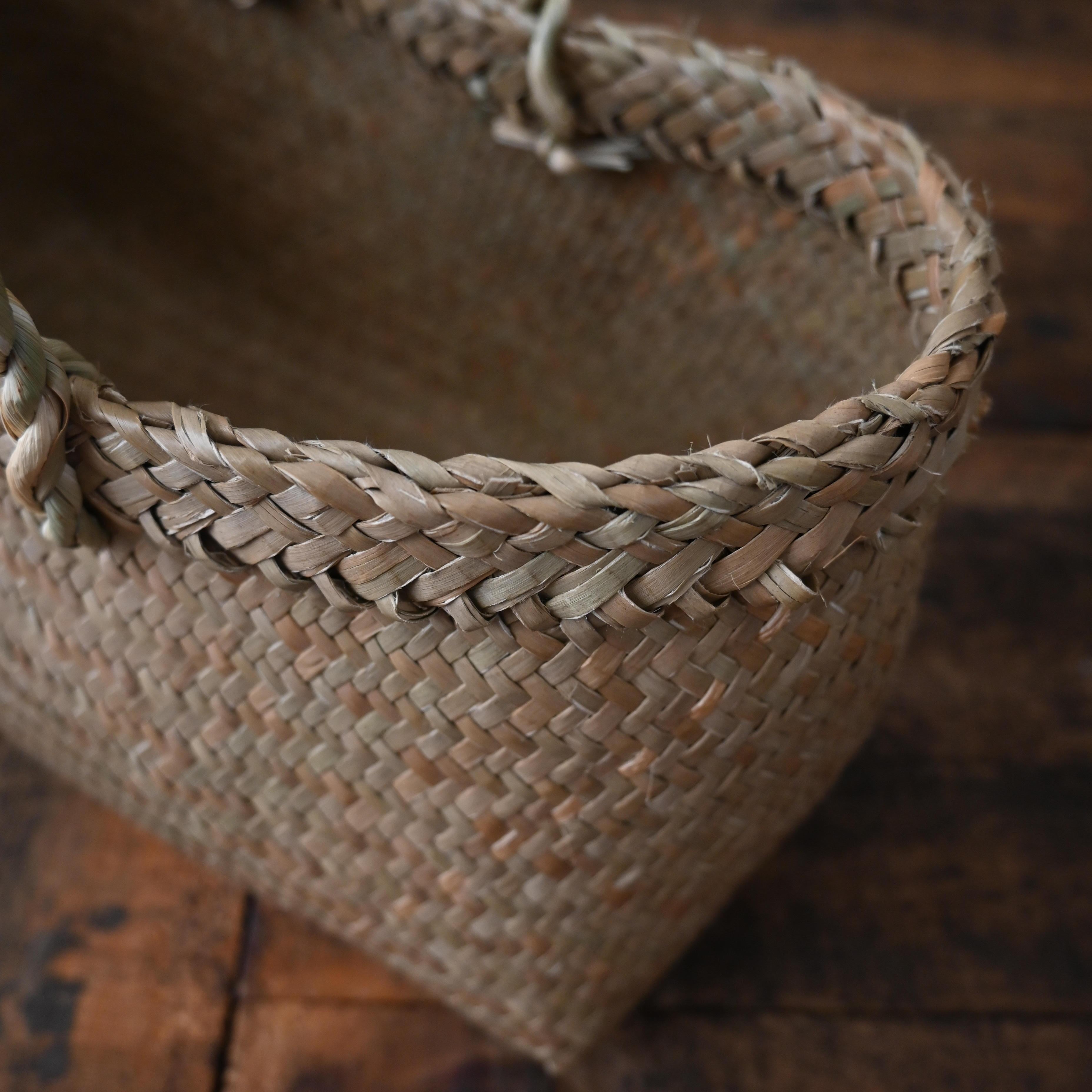 水草で作られるバスケットたちは、作られて間もないものは水分を多く含み、やや緑がかった色合い。そこから使っていくうちに水分が抜けると画像のように色が明るく黄味がかった色に変化し、しなやかさが増します。日々変化する風合いをお楽しみください。