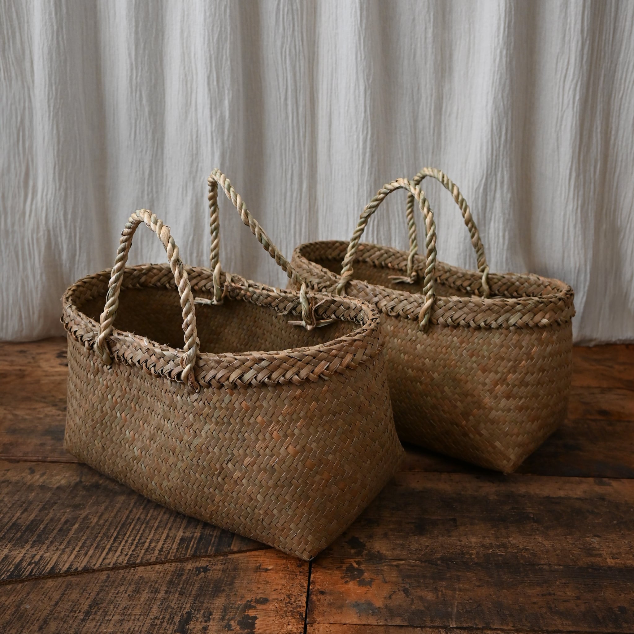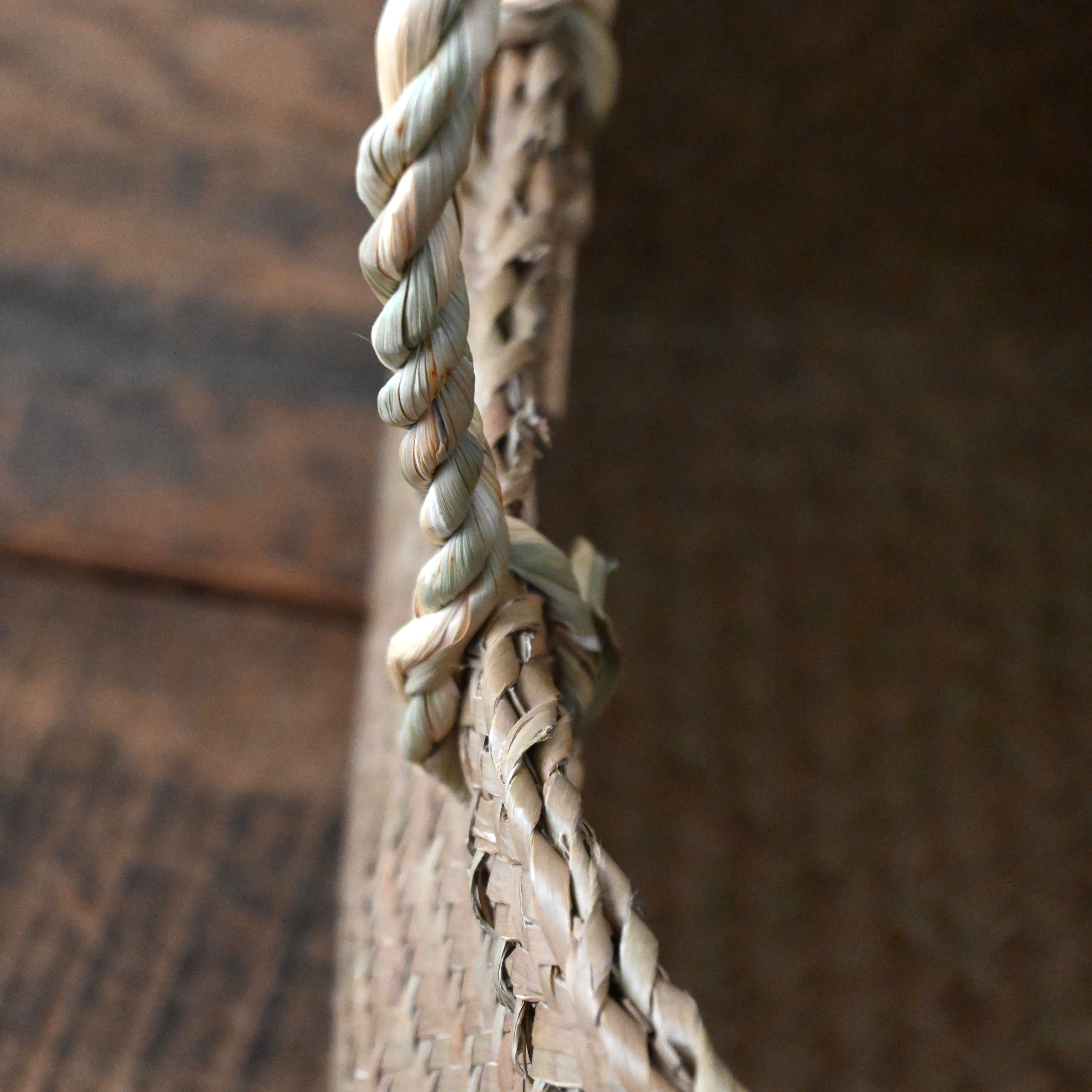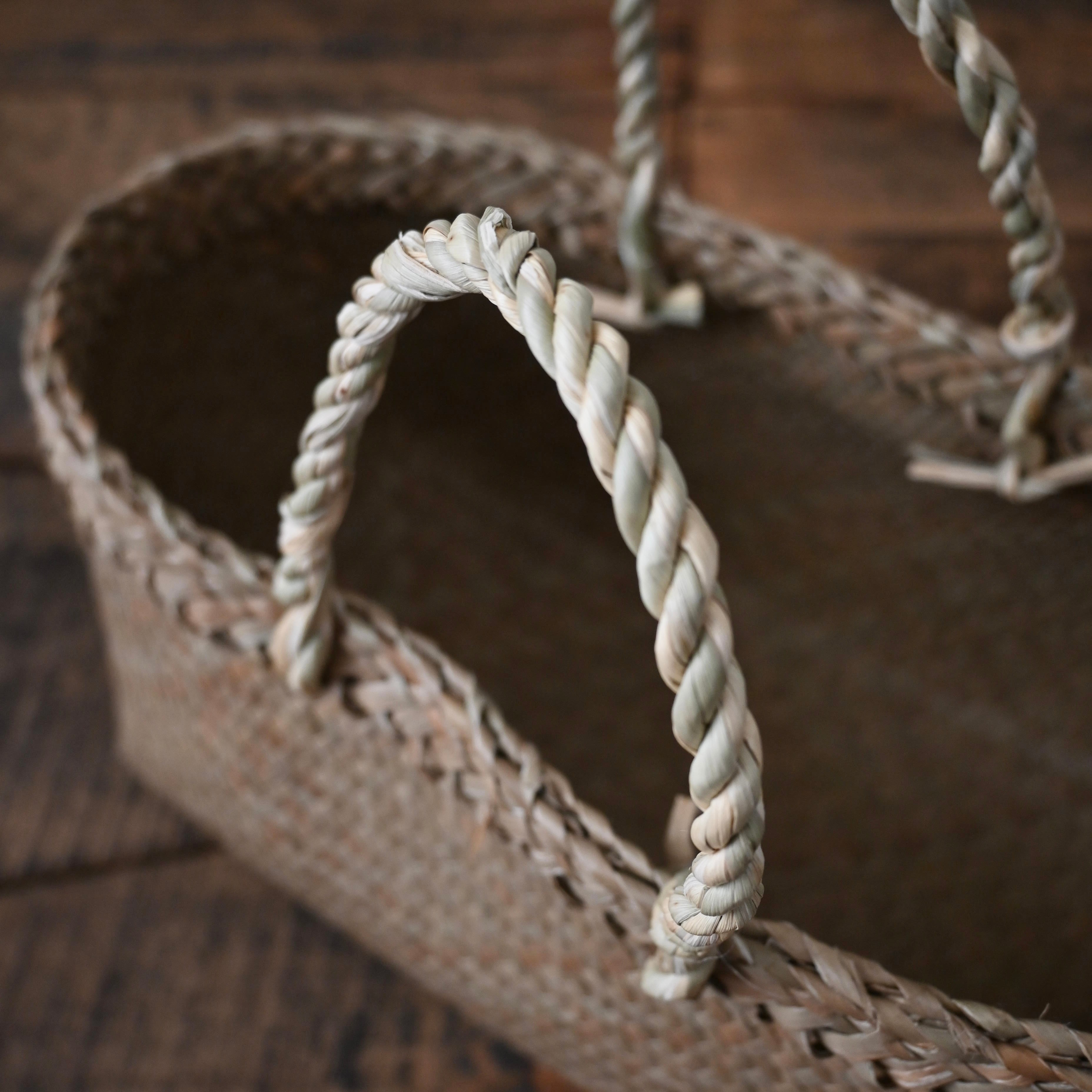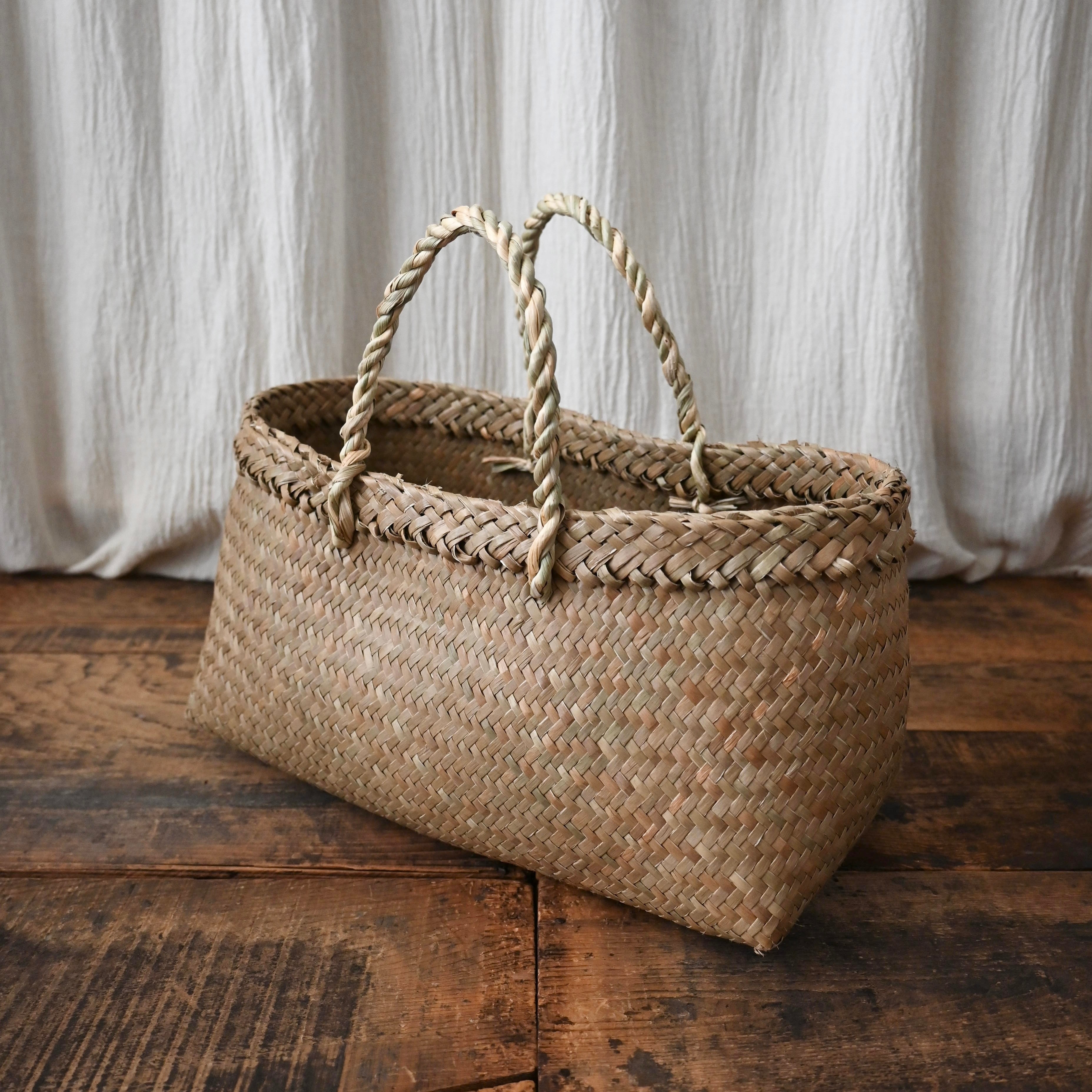 水草で作られるバスケットたちは、作られて間もないものは水分を多く含み、やや緑がかった色合い。そこから使っていくうちに水分が抜けると画像のように色が明るく黄味がかった色に変化し、しなやかさが増します。日々変化する風合いをお楽しみください。