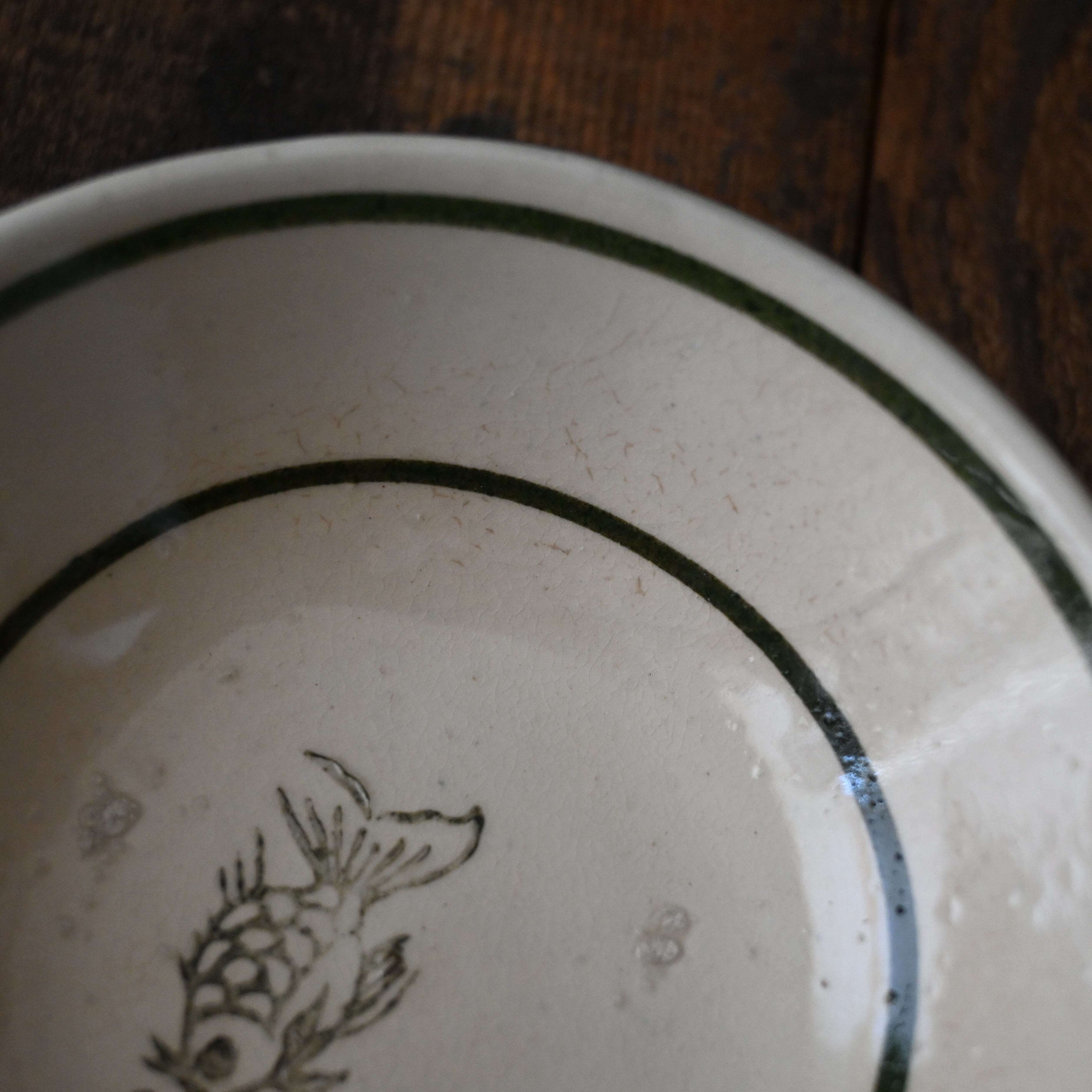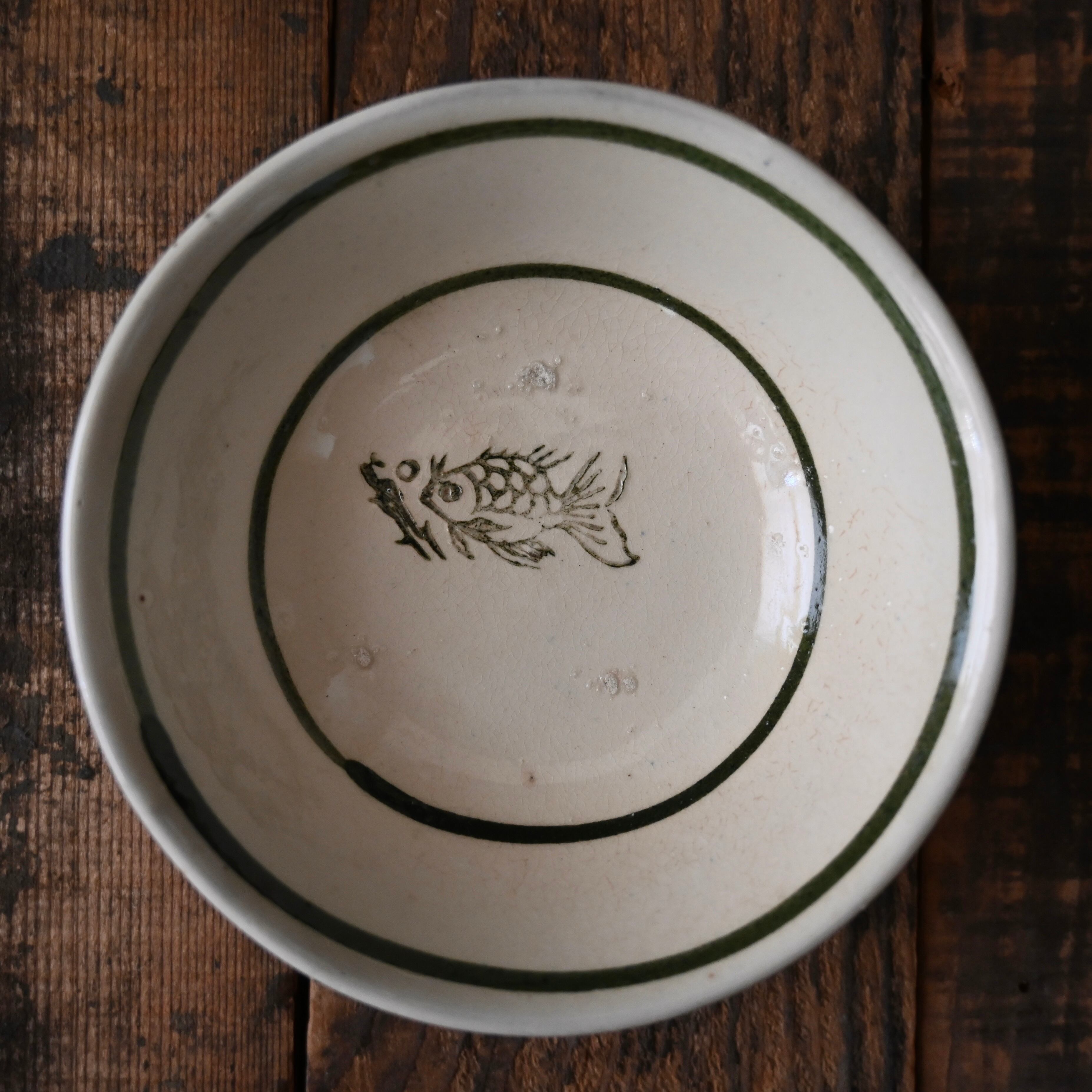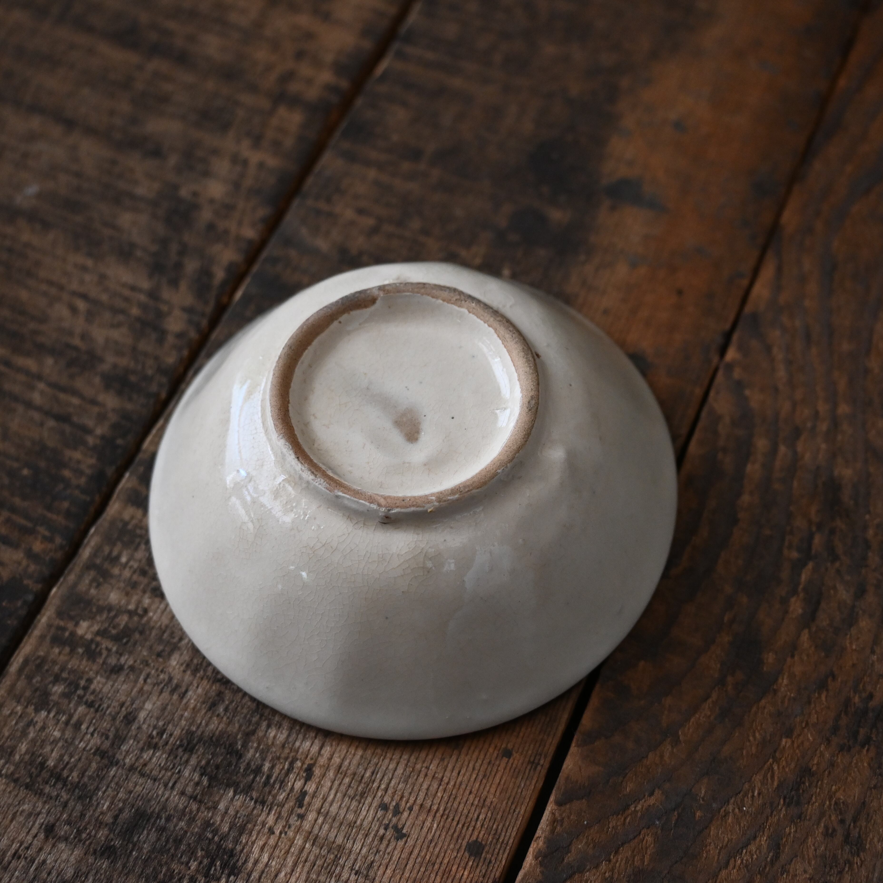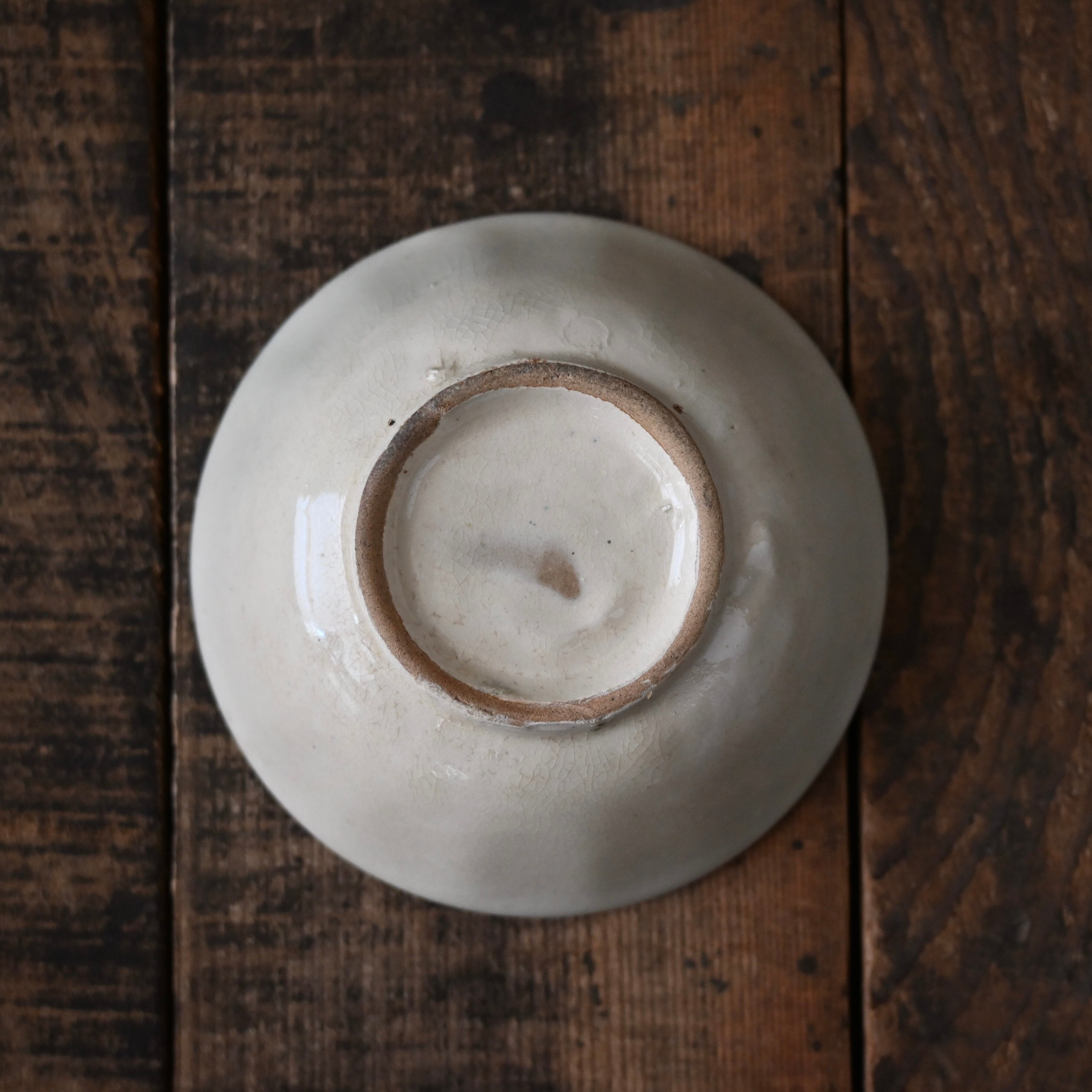 焼成時に器を重ねて焼くため、高台(底の部分)や縁に、小さな突起や釉薬の剥がれた跡が残ることがあります。これは当時の製法ならではの特徴であり、ひとつひとつ異なる個性を持つ証ともいえます。