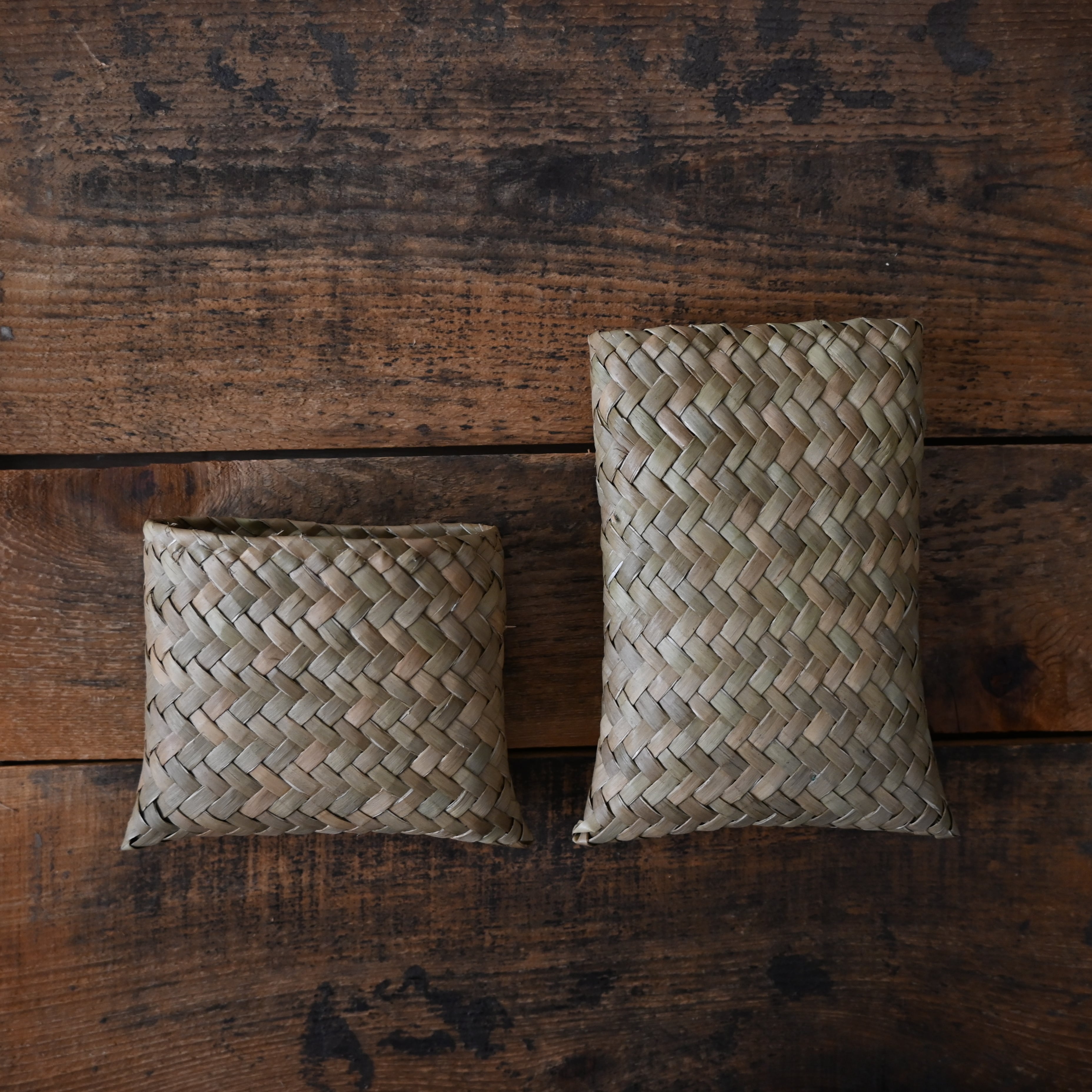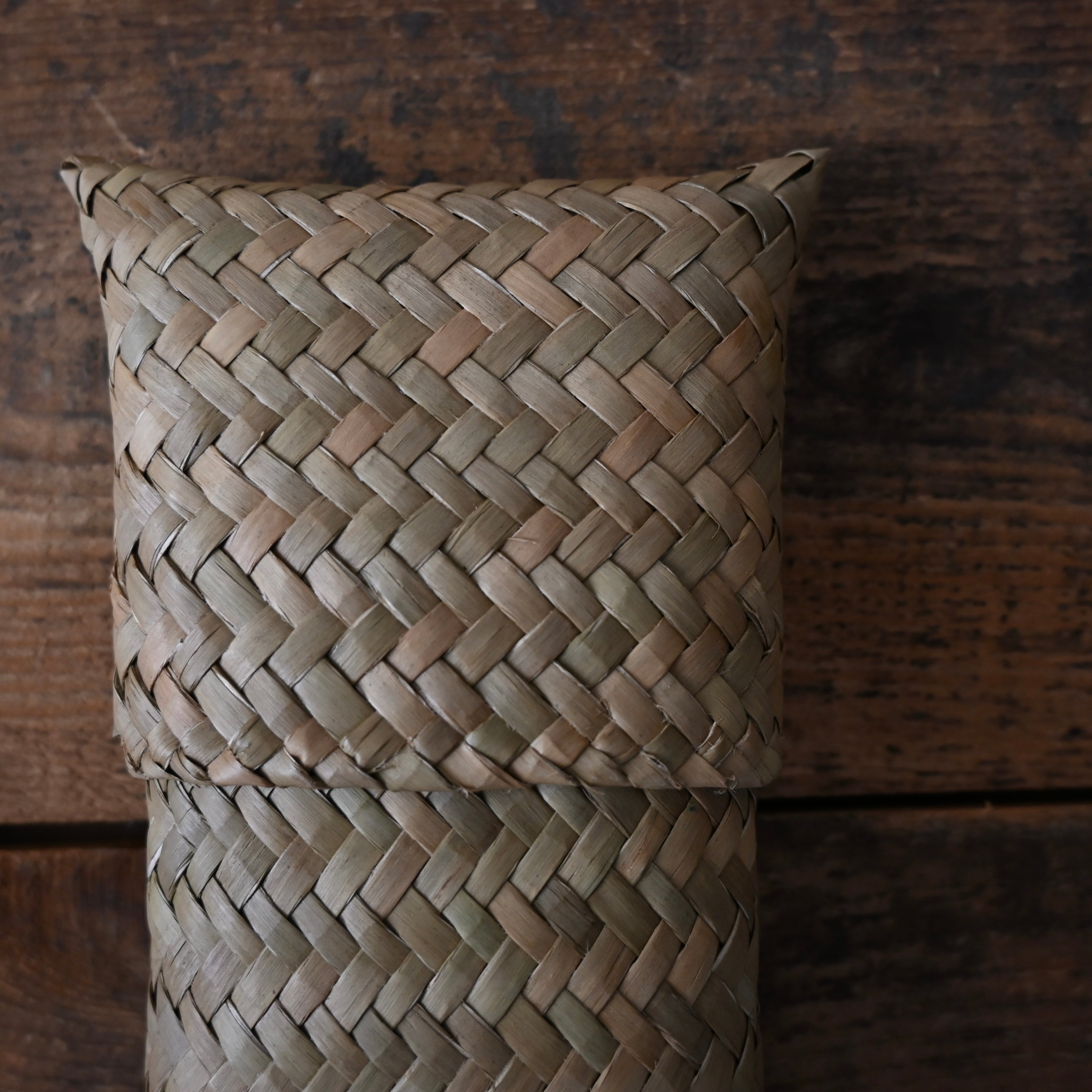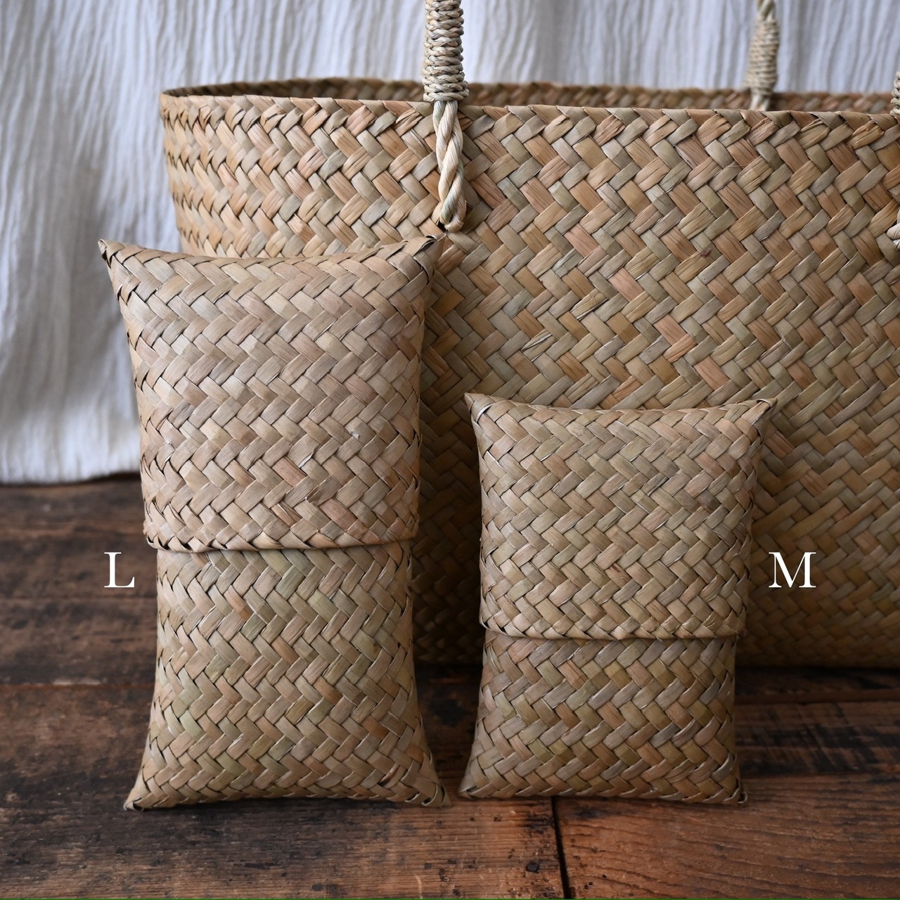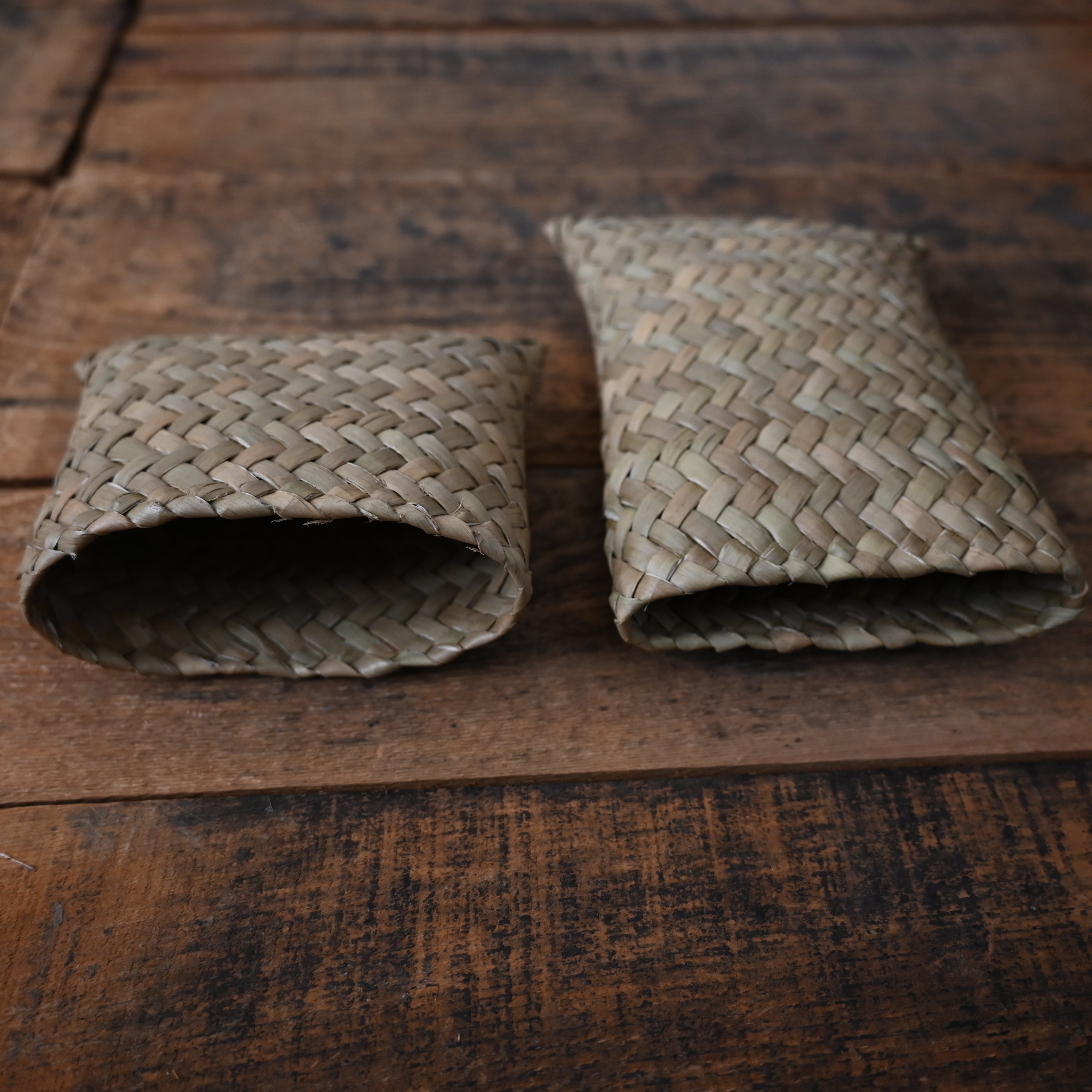水草で作られるポーチやバスケットたちは、作られて間もないものは水分を多く含み、やや緑がかった色合い。そこから使っていくうちに水分が抜けると画像のように色が明るく黄味がかった色に変化し、しなやかさが増します。日々変化する風合いをお楽しみください。