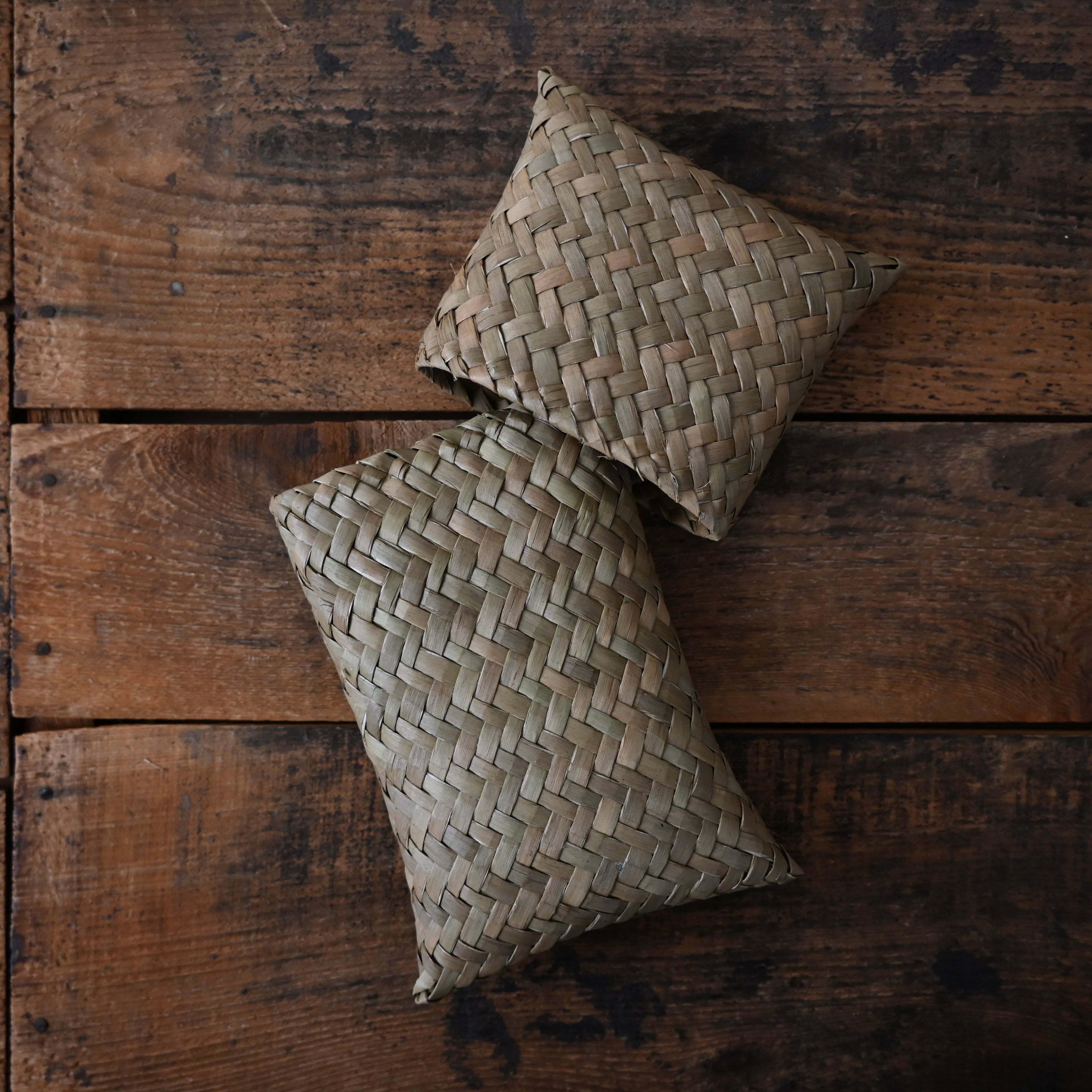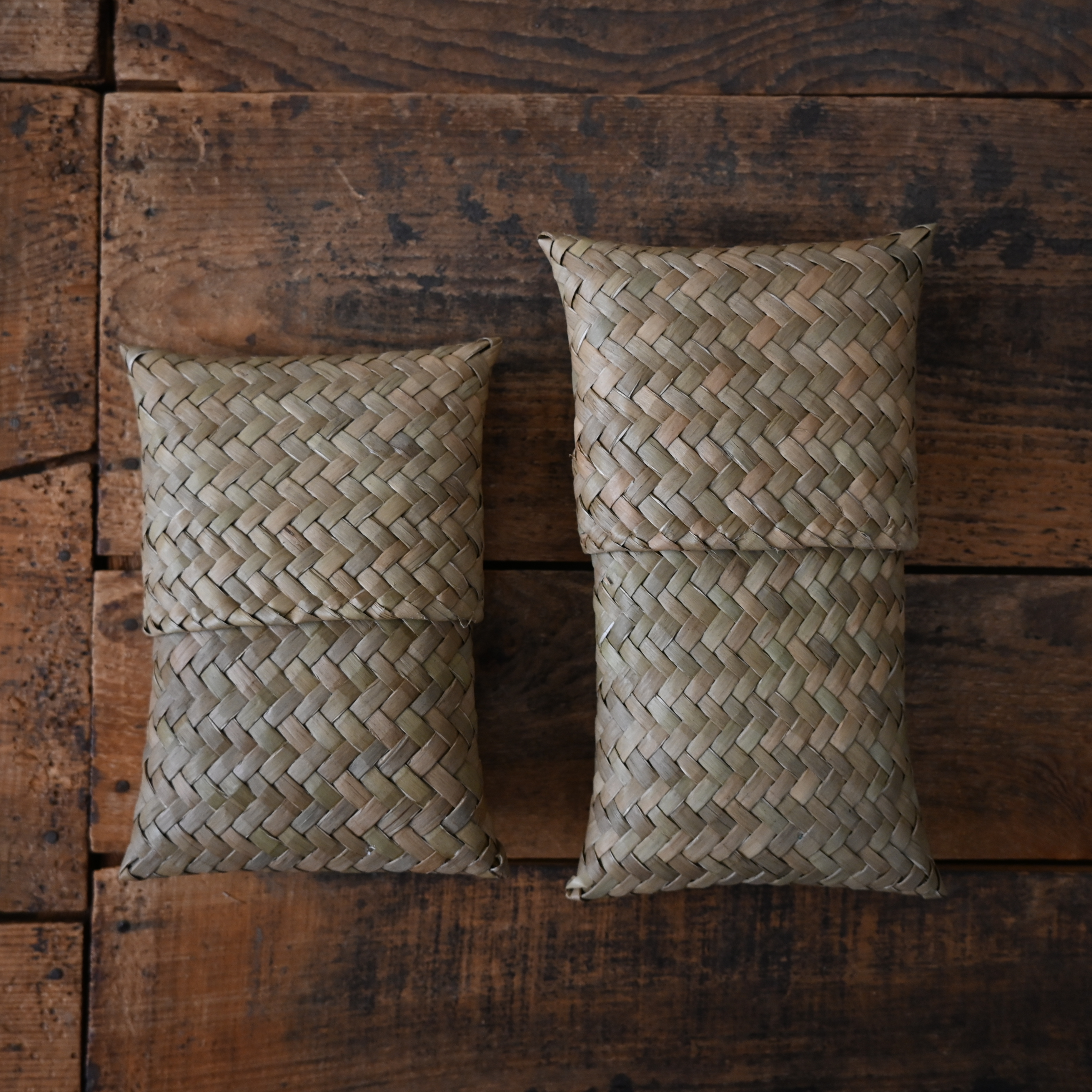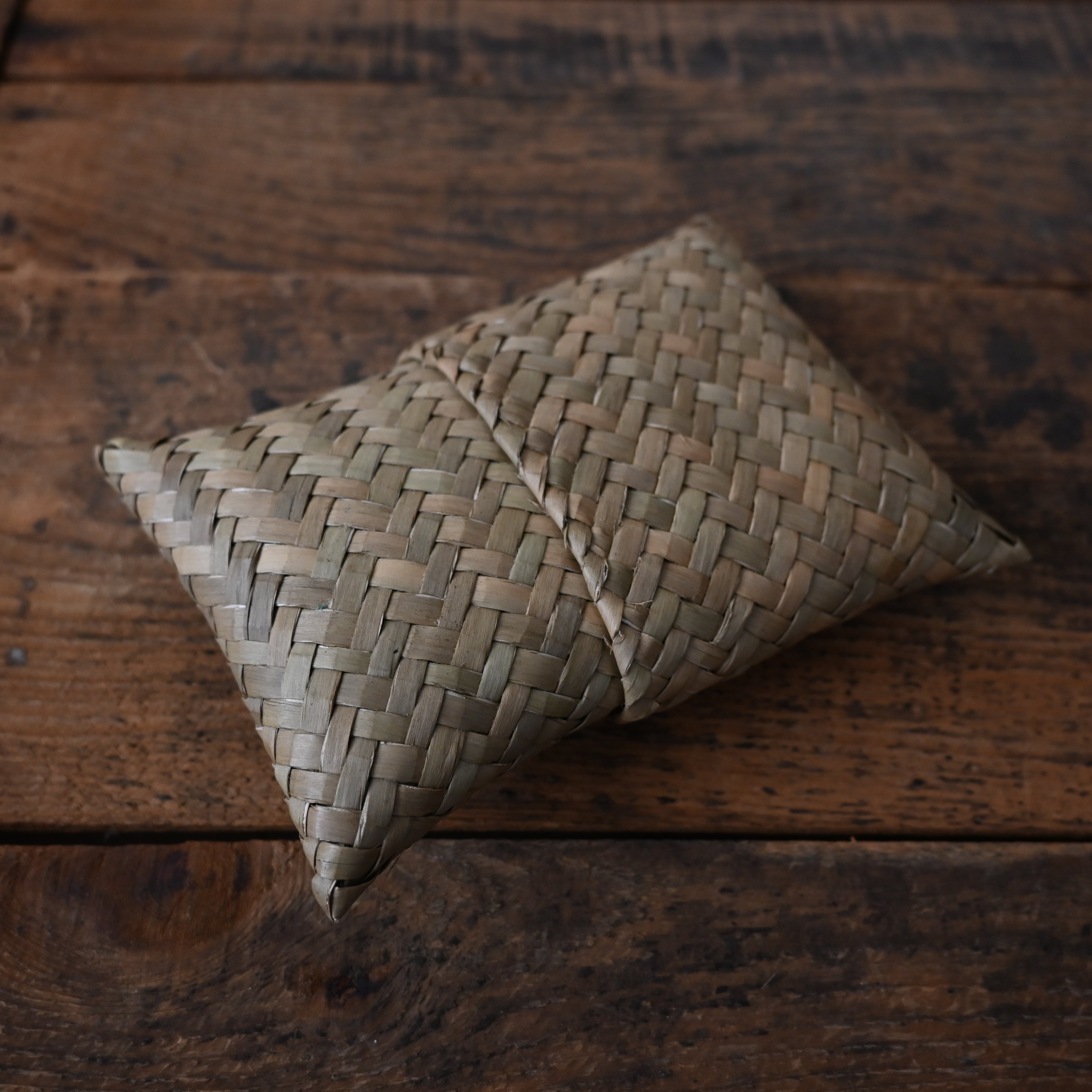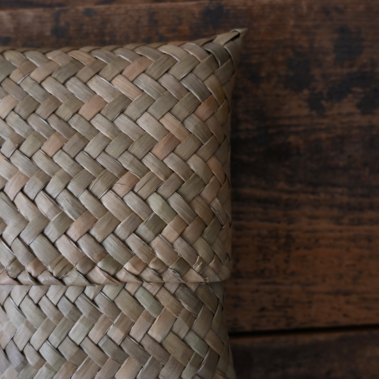 水草で作られるポーチやバスケットたちは、作られて間もないものは水分を多く含み、やや緑がかった色合い。そこから使っていくうちに水分が抜けると画像のように色が明るく黄味がかった色に変化し、しなやかさが増します。日々変化する風合いをお楽しみください。