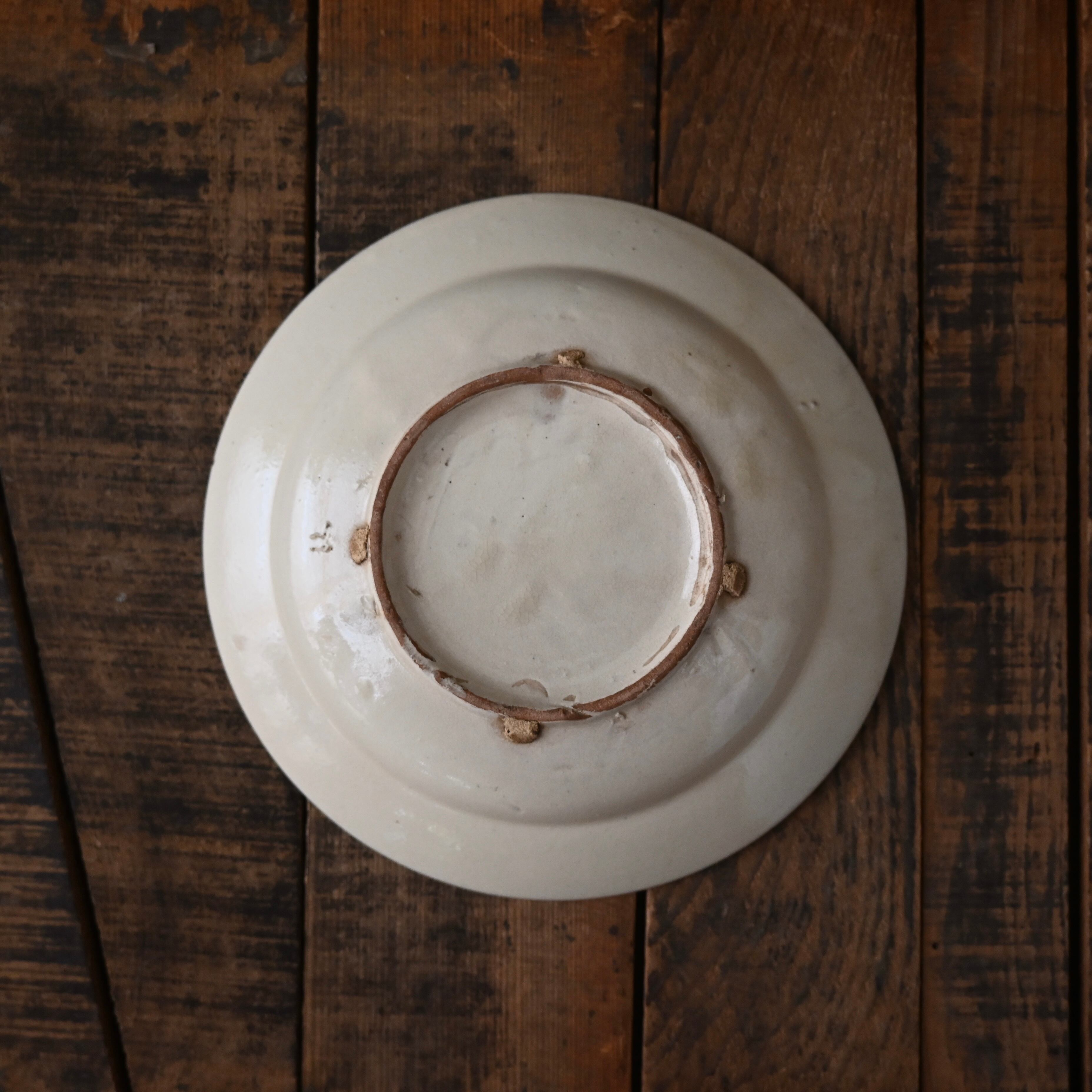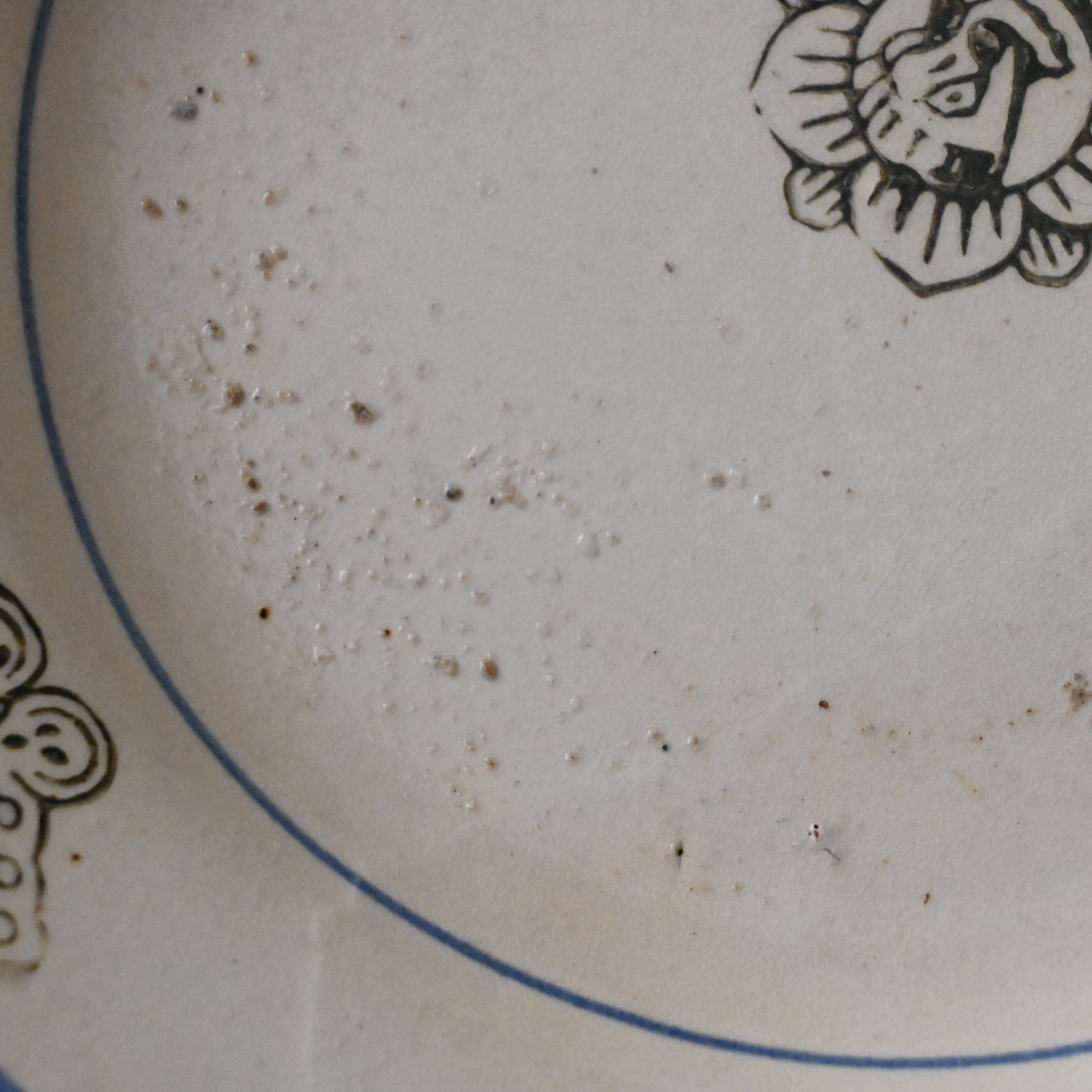焼成時に器を重ねて焼くため、高台(底の部分)や縁に、小さな突起や釉薬の剥がれた跡が残ることがあります。これは当時の製法ならではの特徴であり、ひとつひとつ異なる個性を持つ証ともいえます。