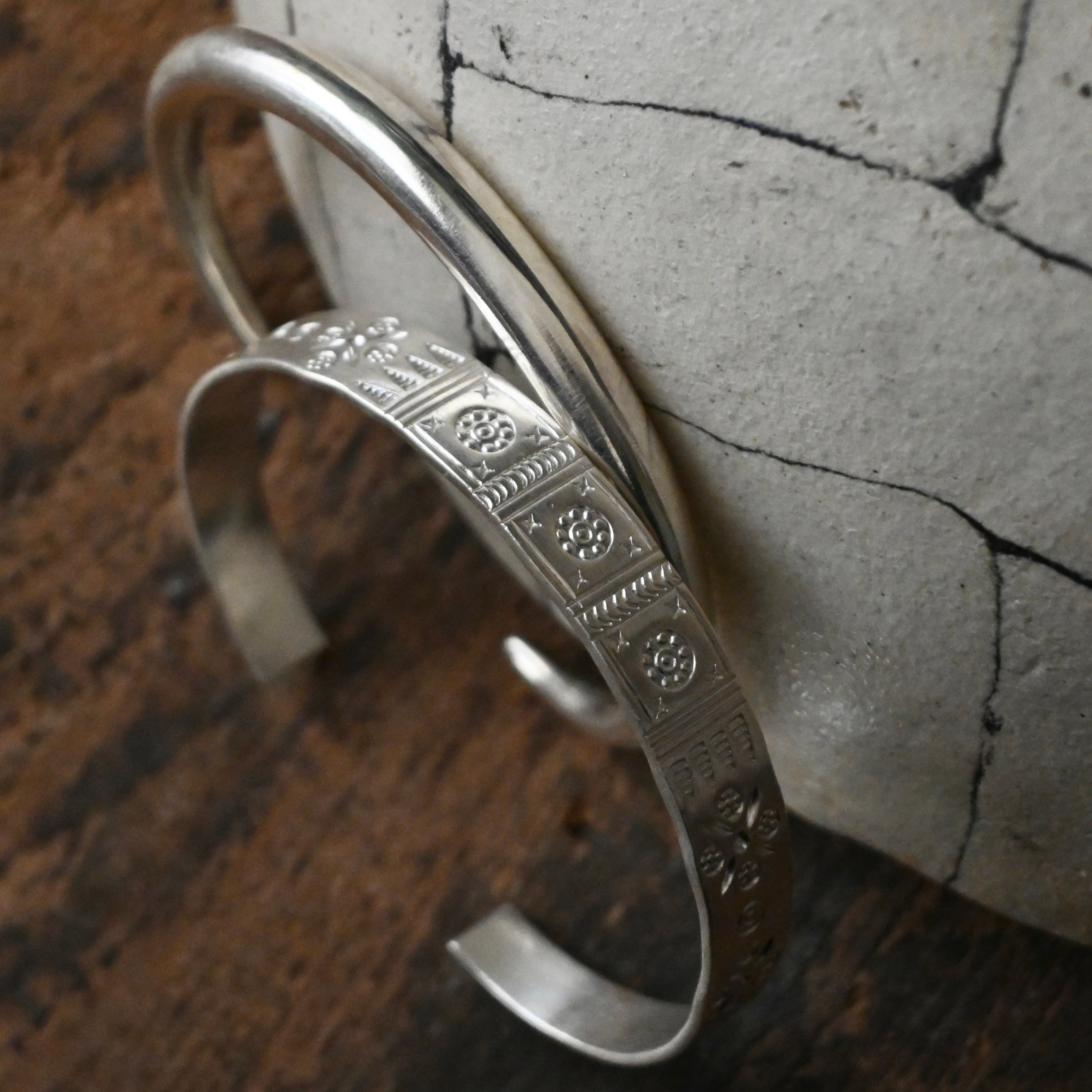 タイ北部の山あいに暮らすカレン族によって、ひとつひとつ手仕事で作られた、純度の高いシルバーバングル。