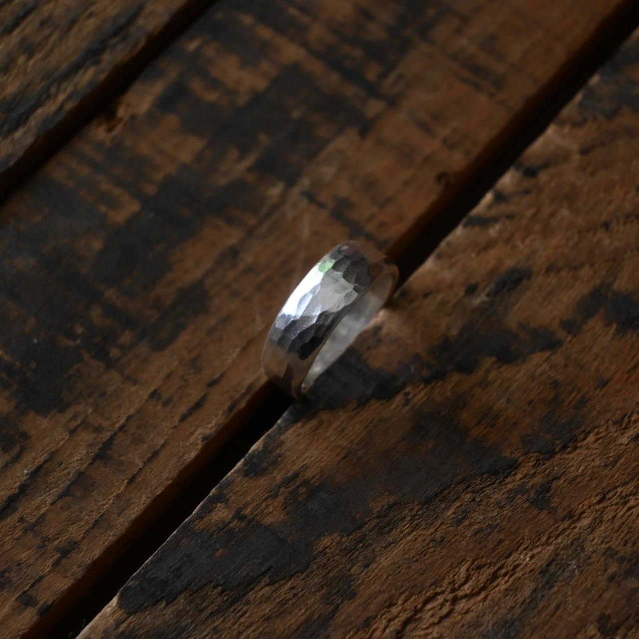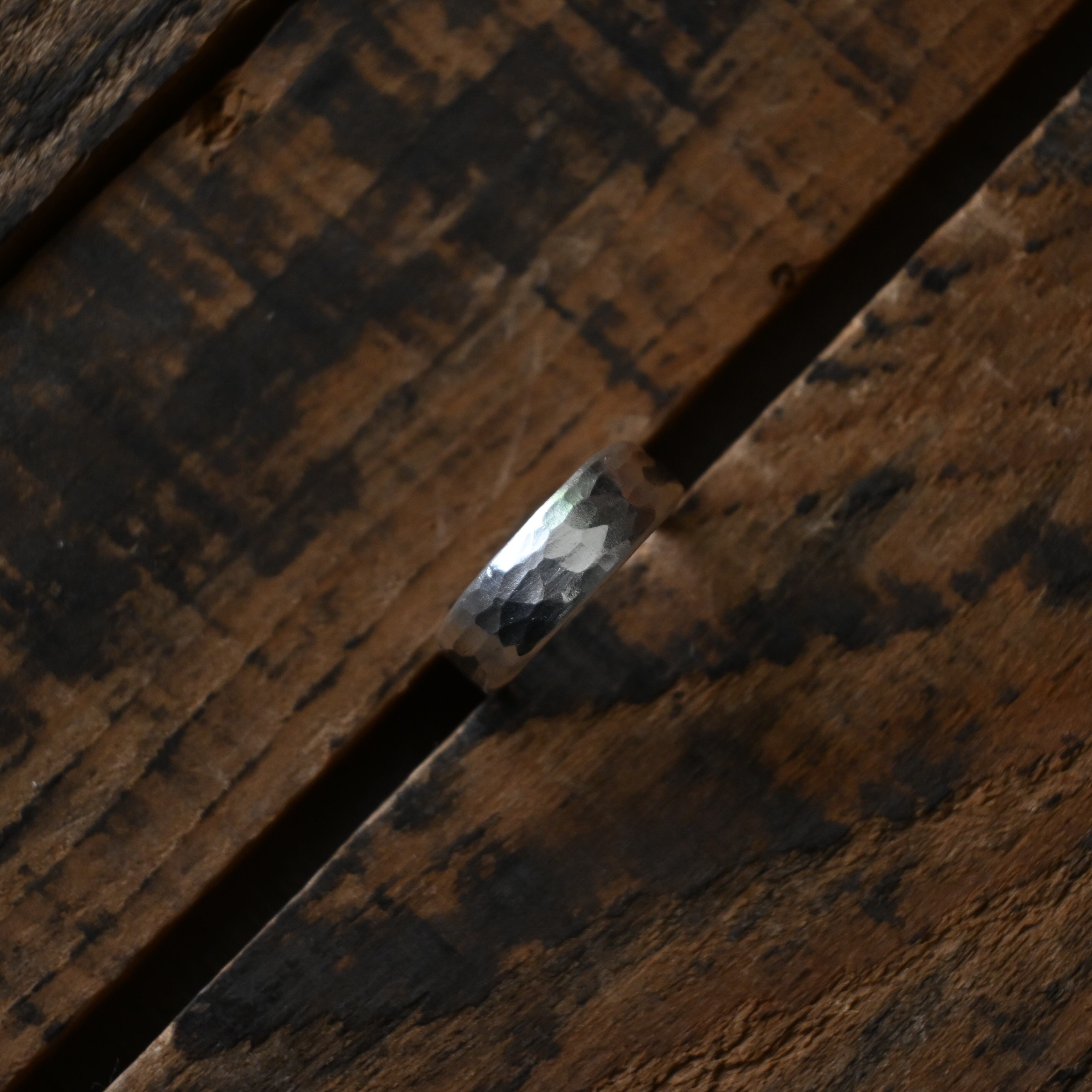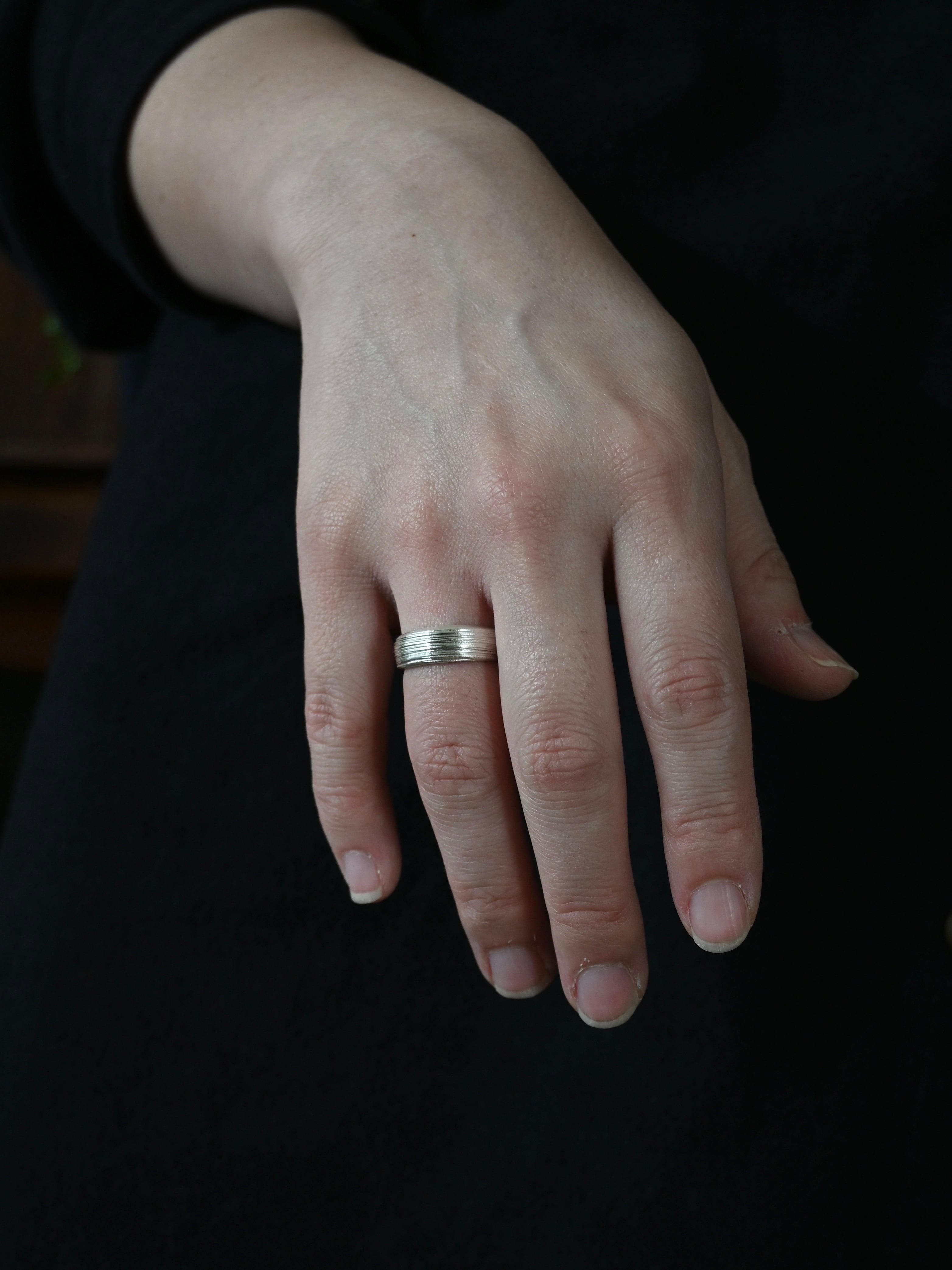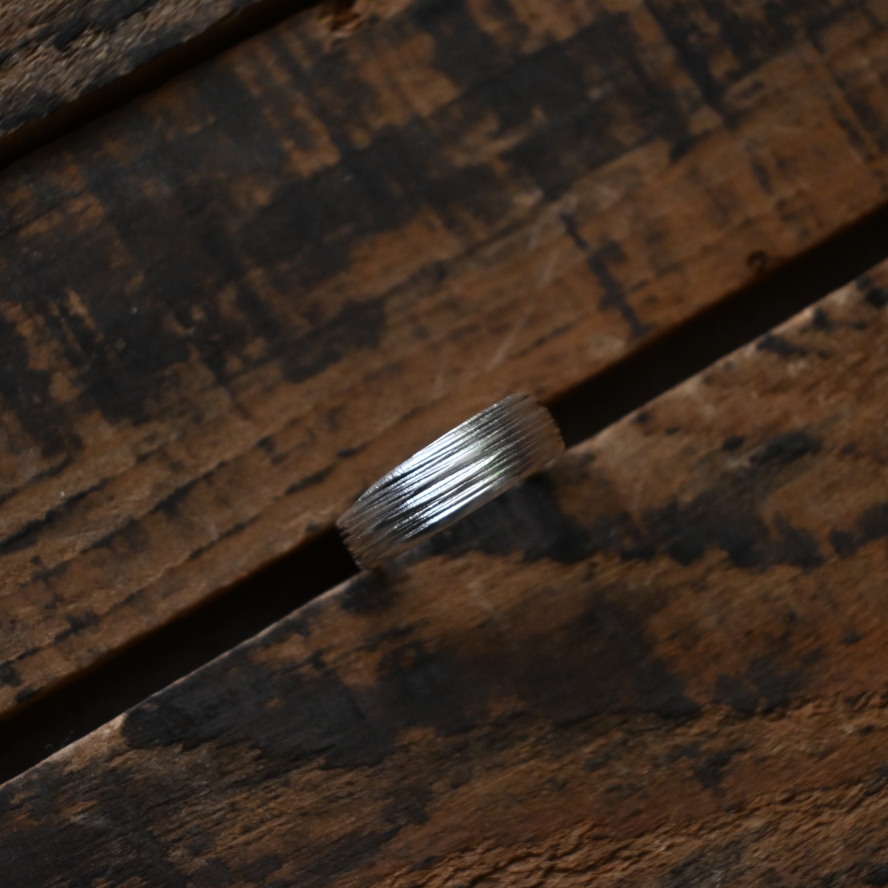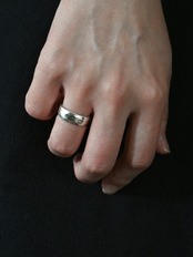 シンプルな柄も表面の凹凸できらりと手の動きに合わせて光る姿が素敵なリングです。