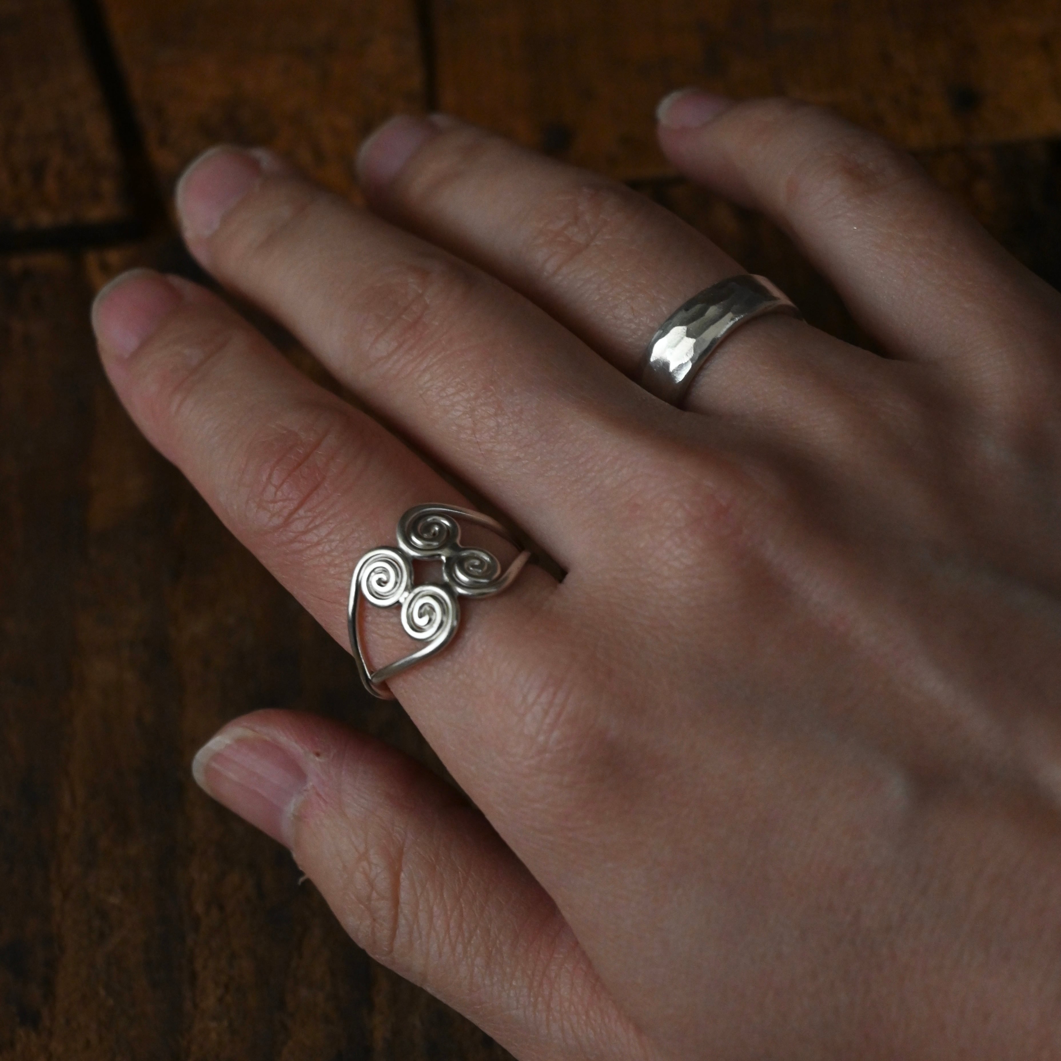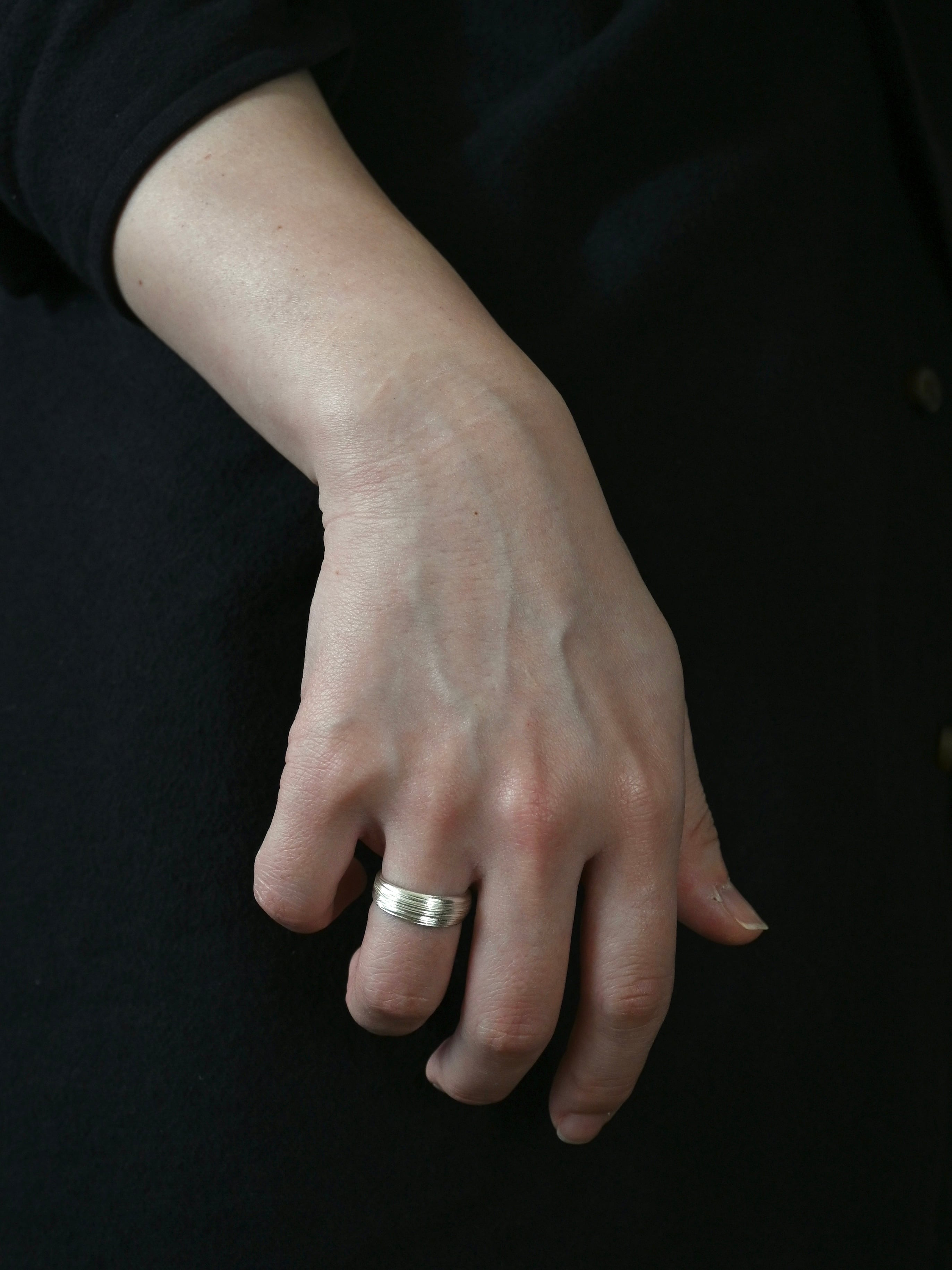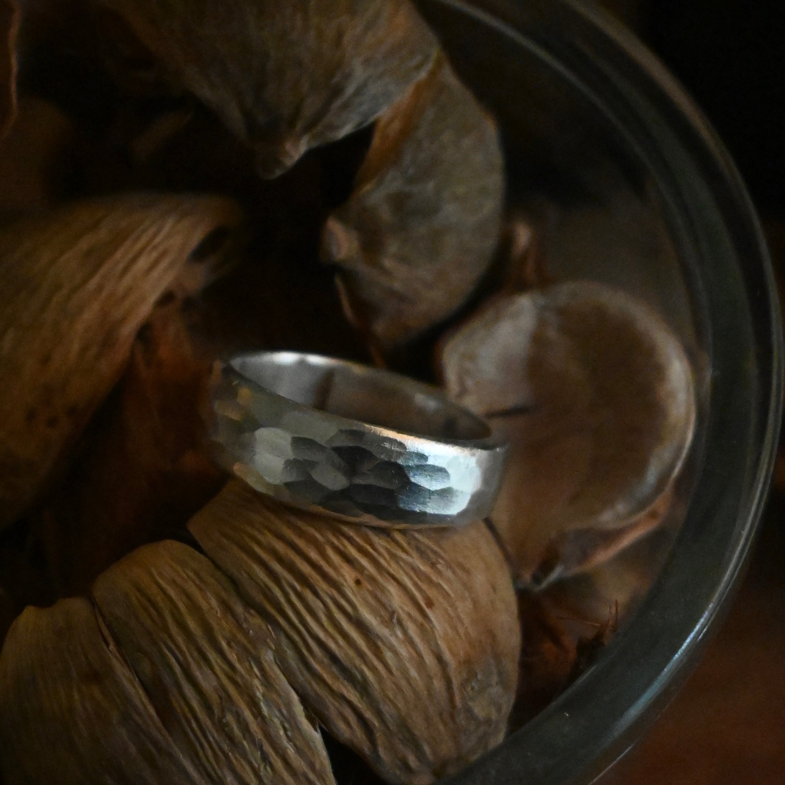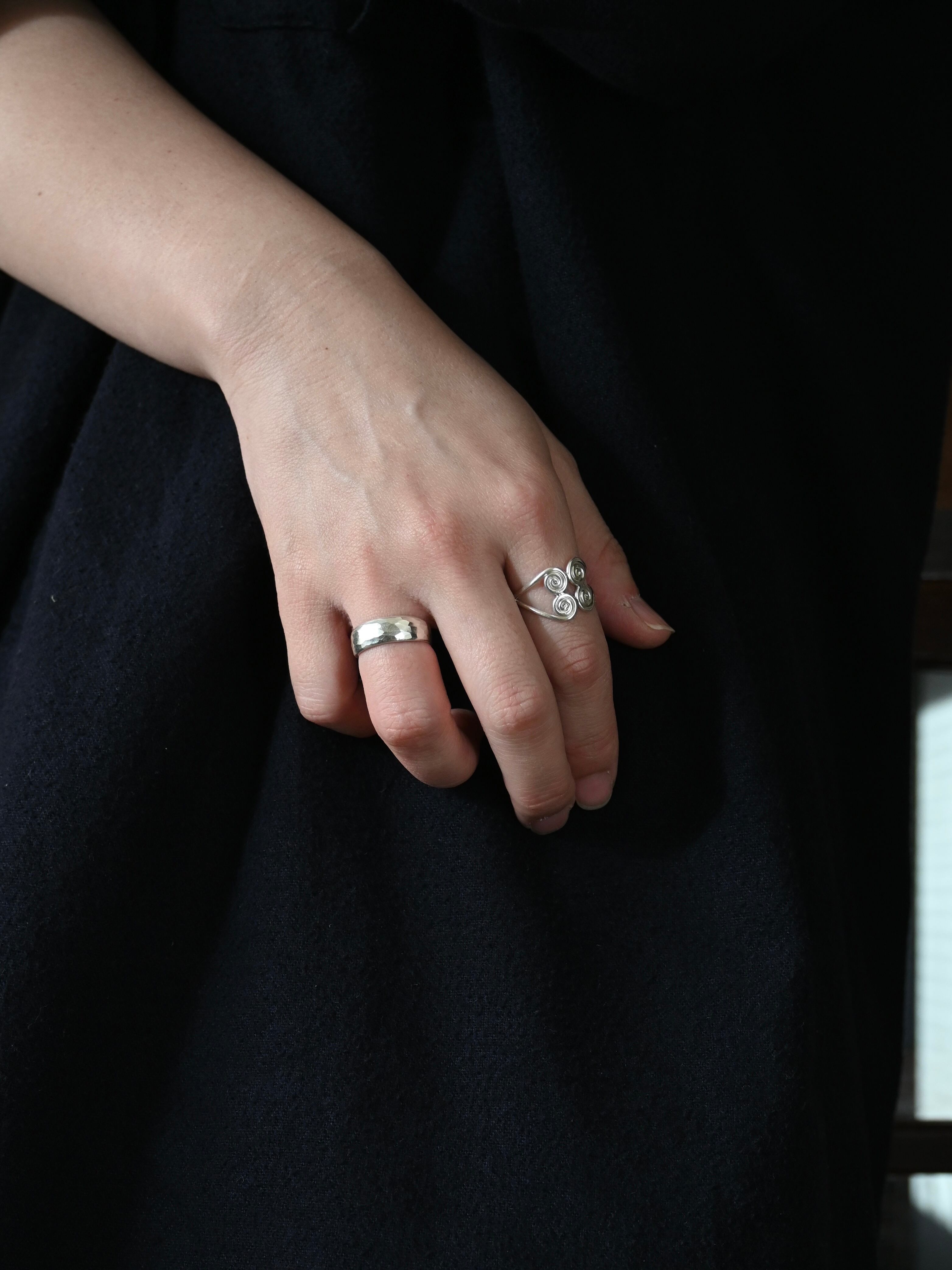 シンプルな柄も表面の凹凸できらりと手の動きに合わせて光る姿が素敵なリングです。