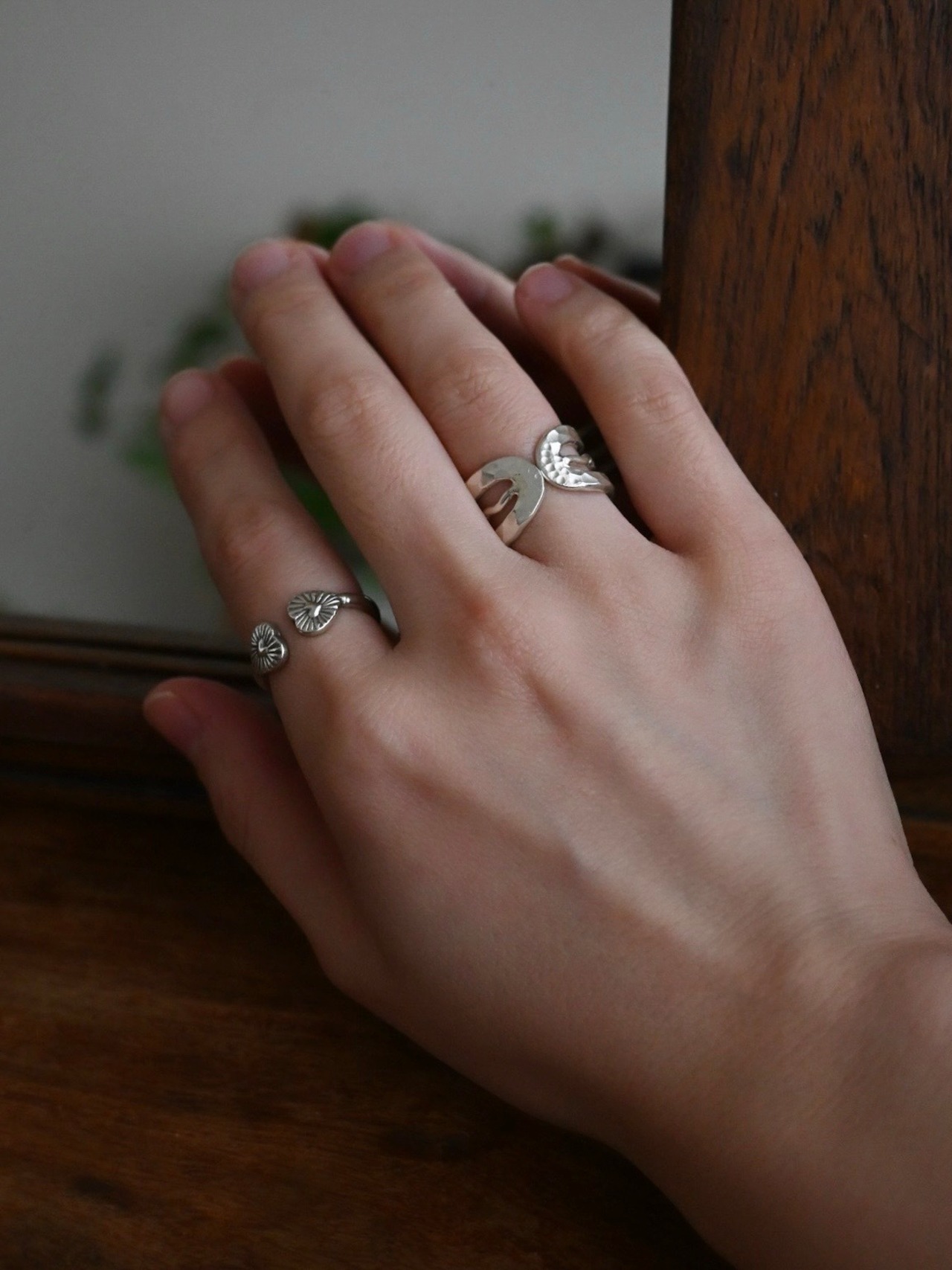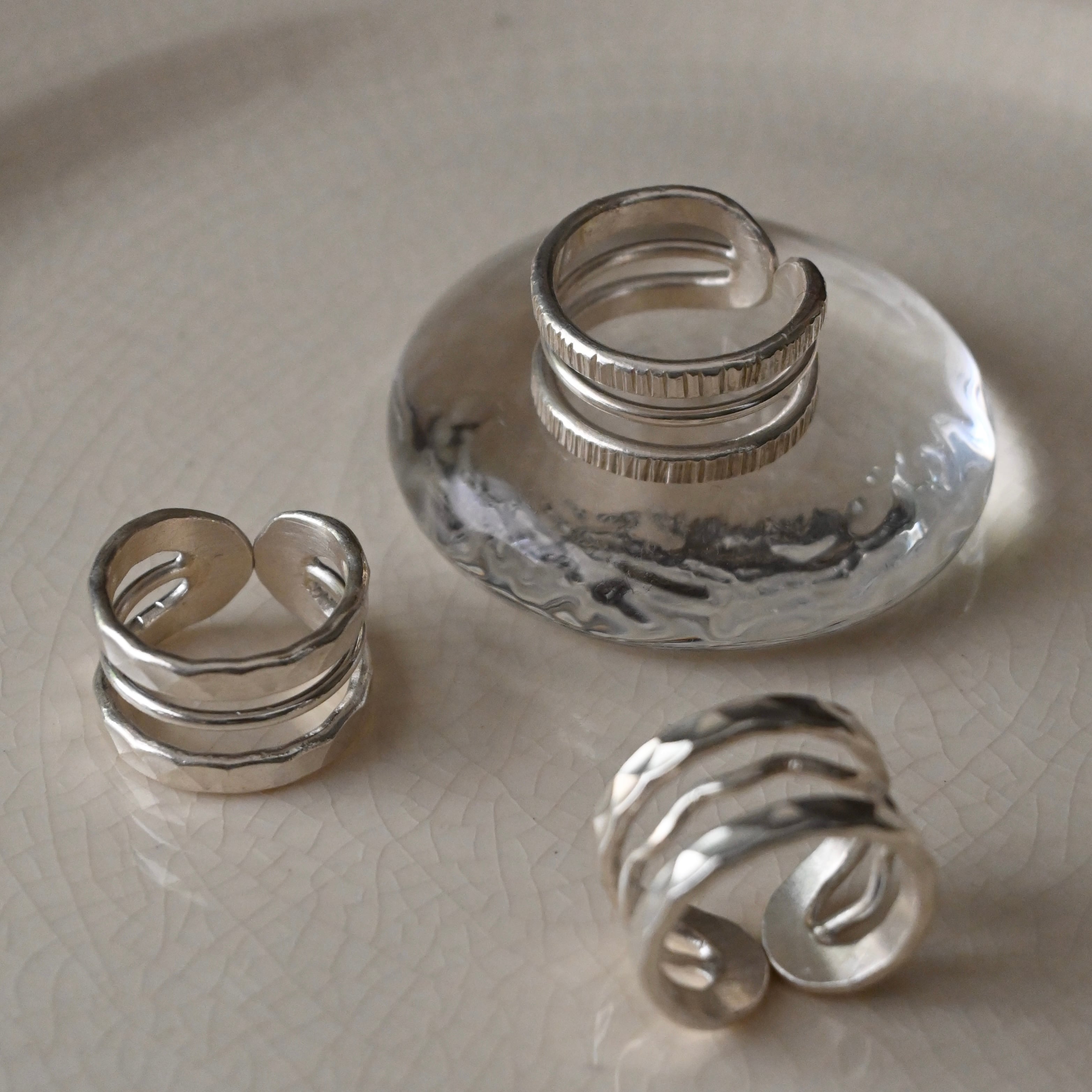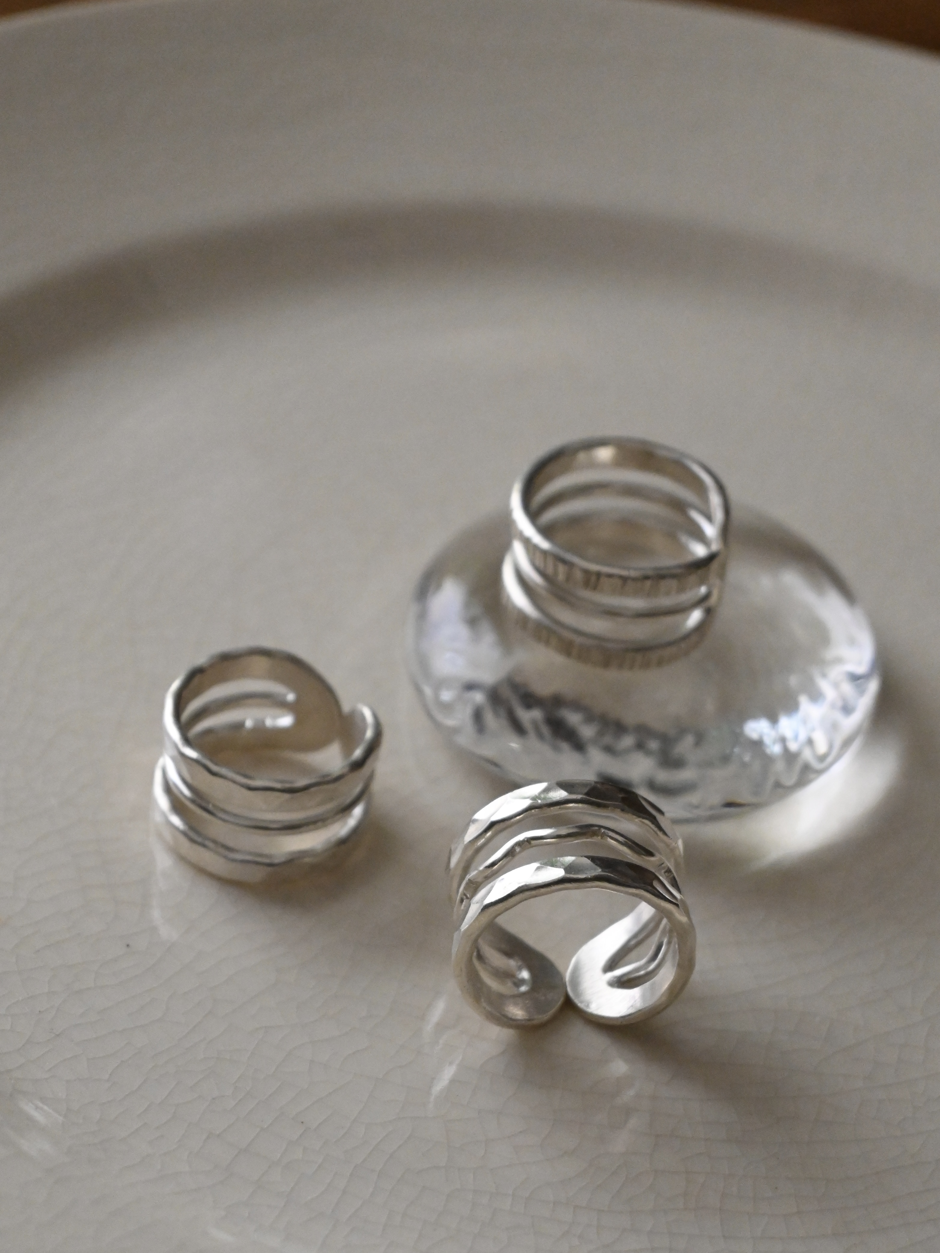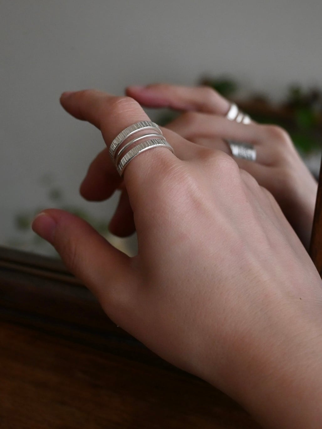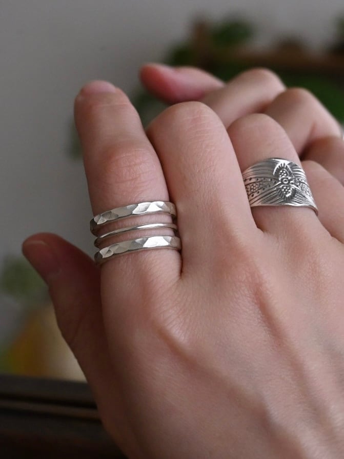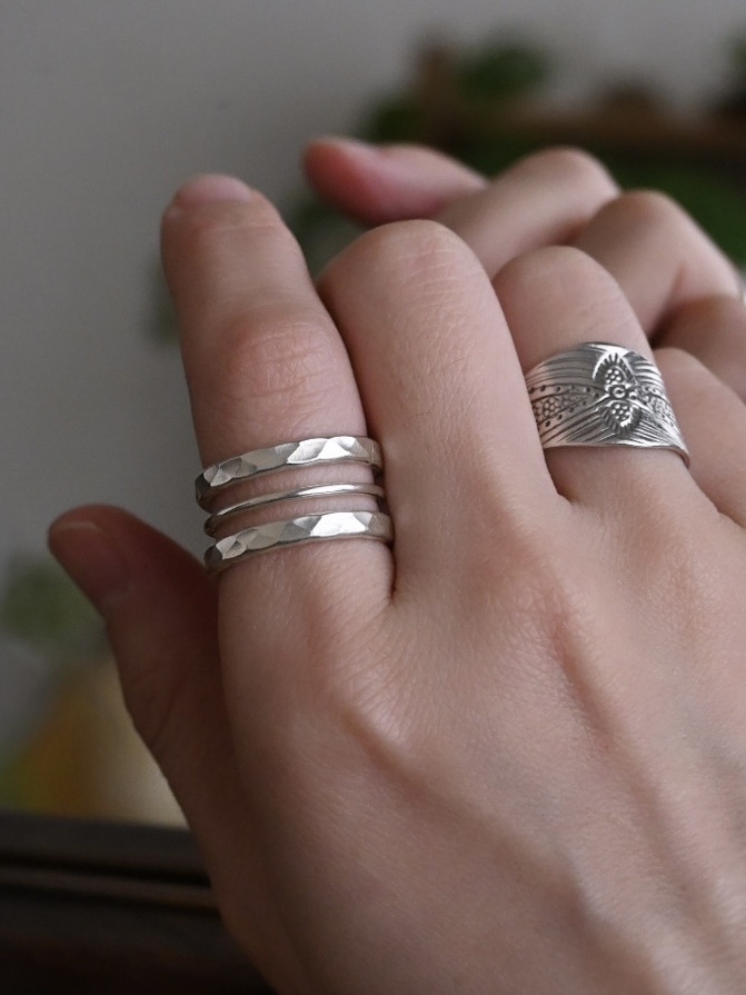 シンプルながらも表面の凹凸できらりと手の動きに合わせて光る姿が印象的なリングです。