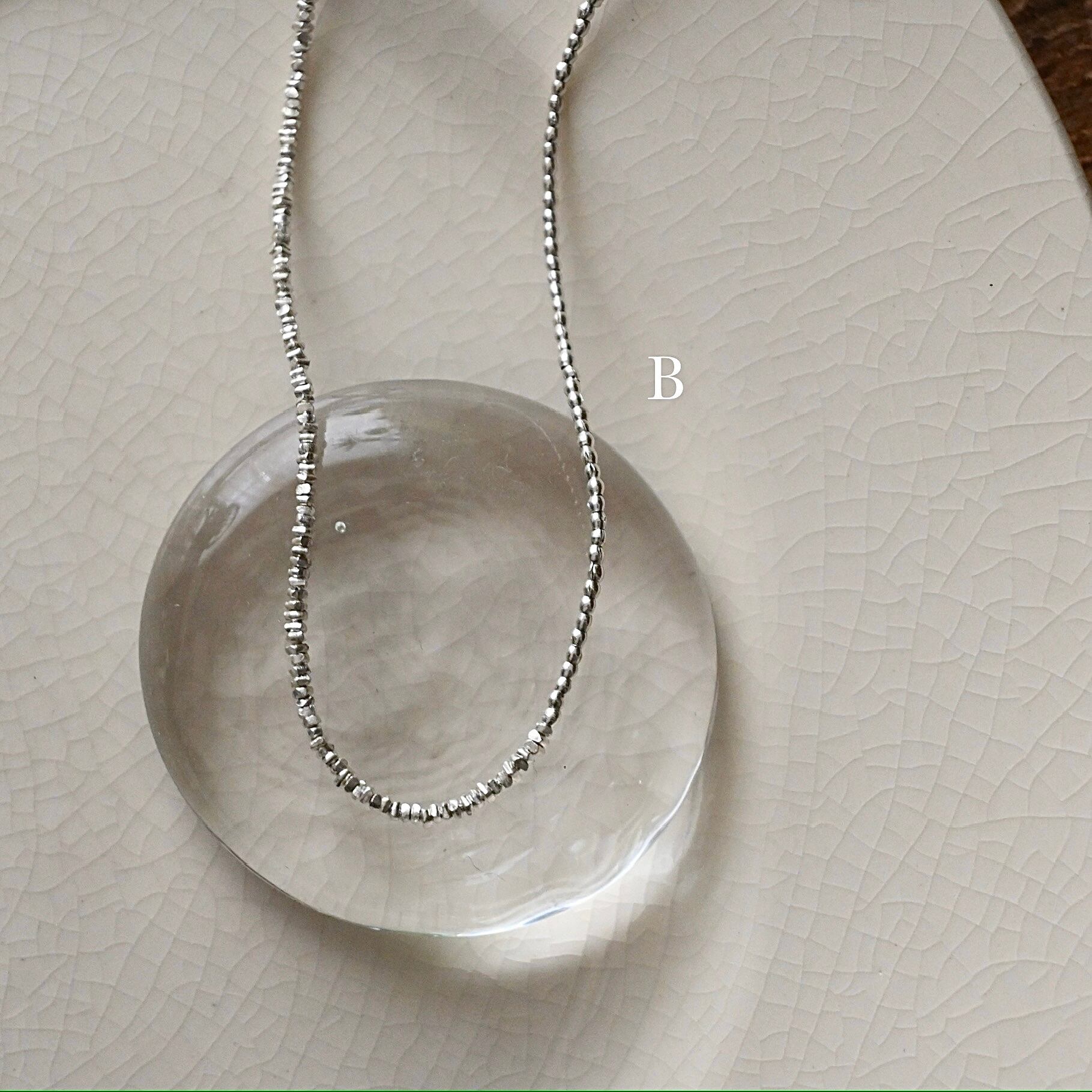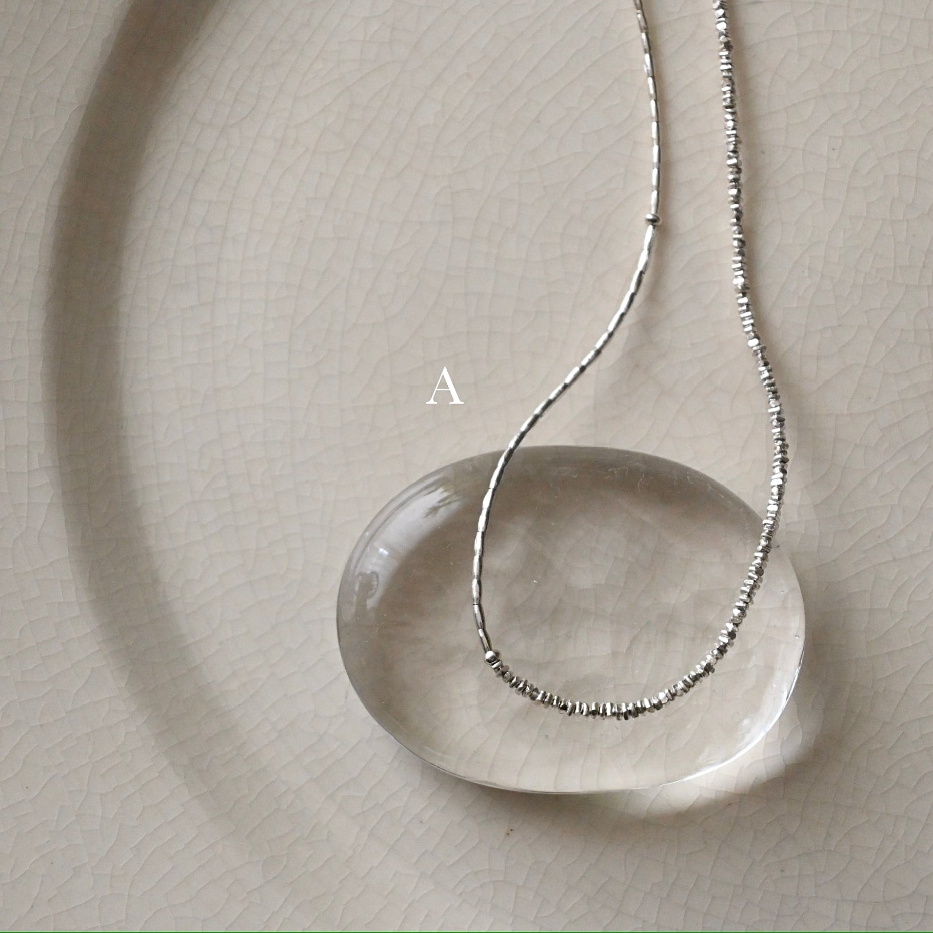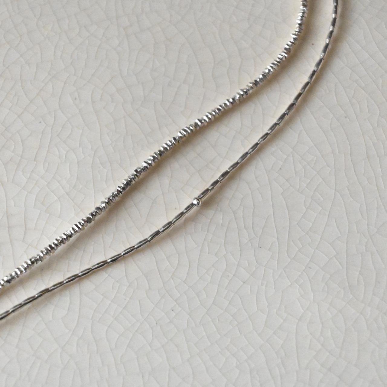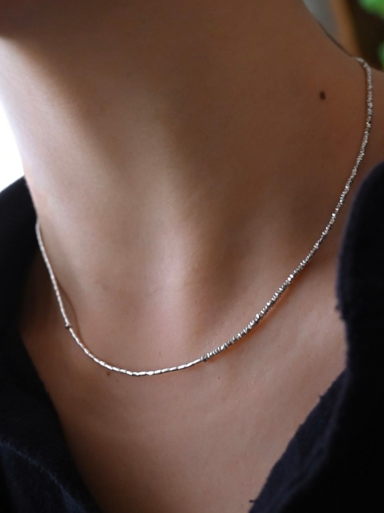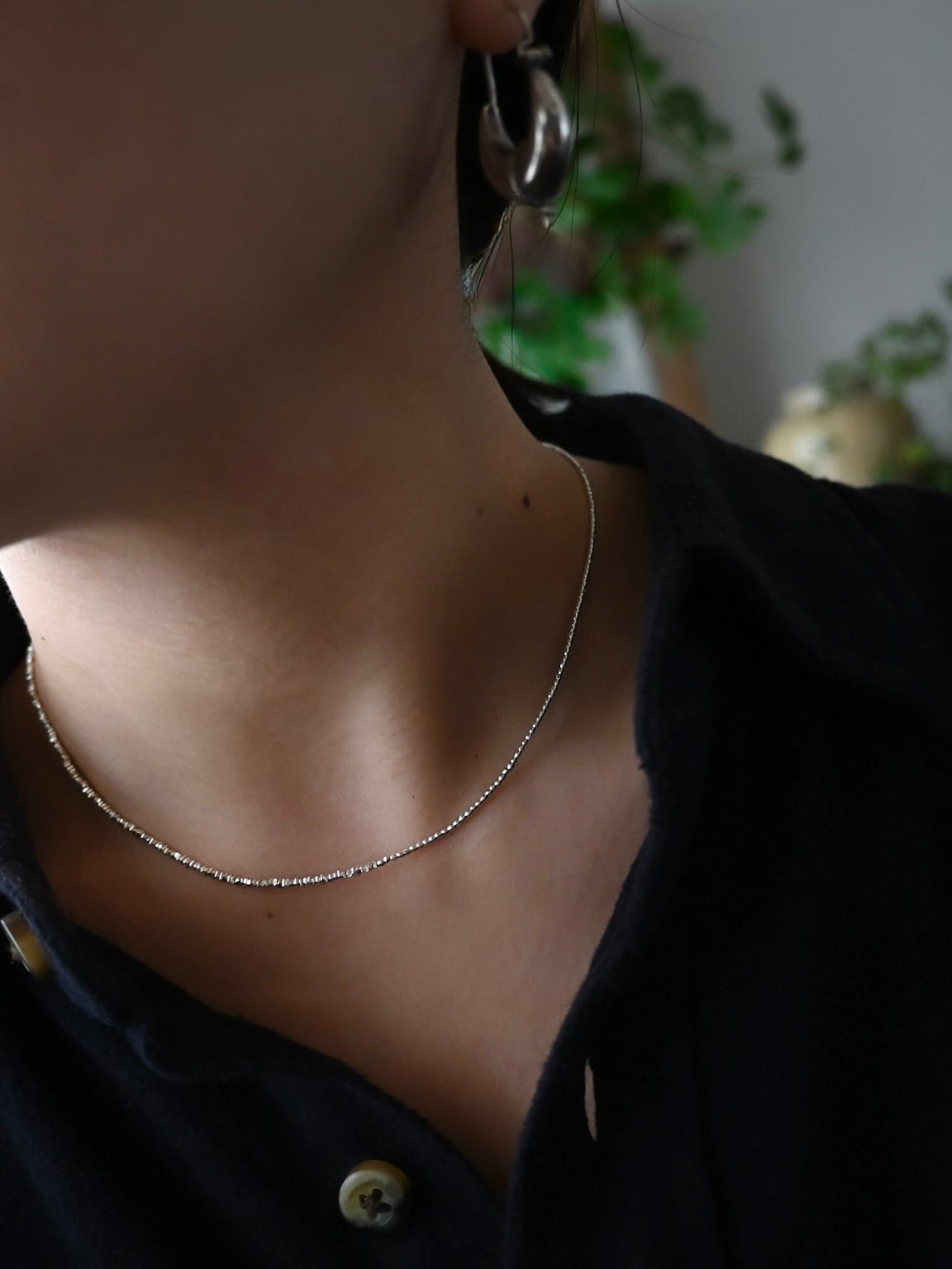 とても華奢なビーズを使用しているので、日々のコーディネイトの邪魔をせず、品よく煌めきを添えてくれます。また、お手持ちのネックレスとの重ねづけにもおすすめです。