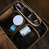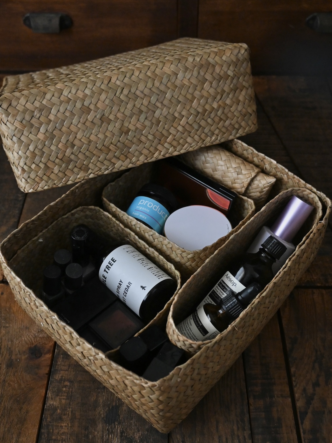 他のサイズのボックスと組み合わせて自分だけのメイクボックスを作ったり、蓋が深いので、蓋と本体を別々に使って引き出しの中や棚の中の整理にも。セットを作っておくと、ボックスごと取り出して戻せるので便利です。