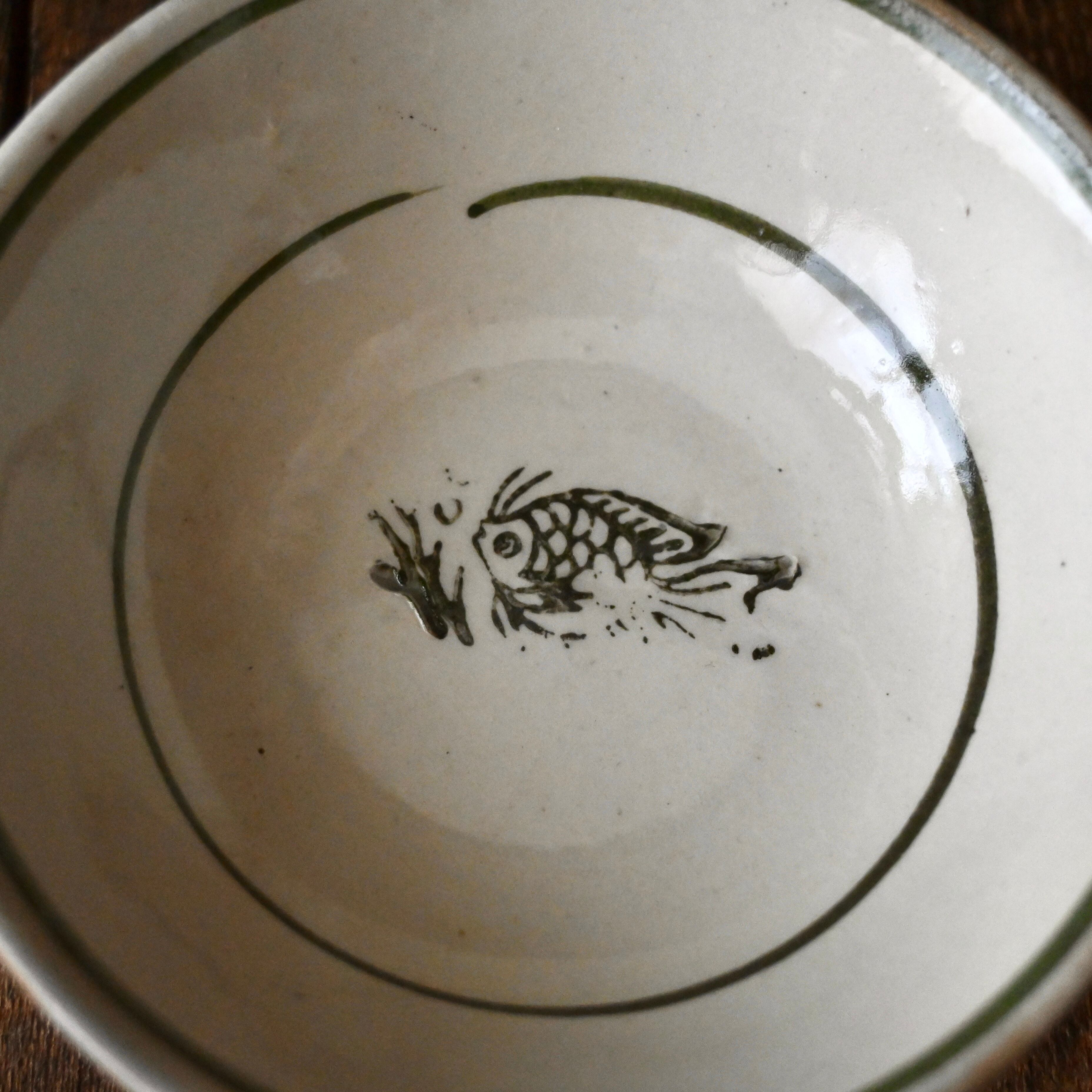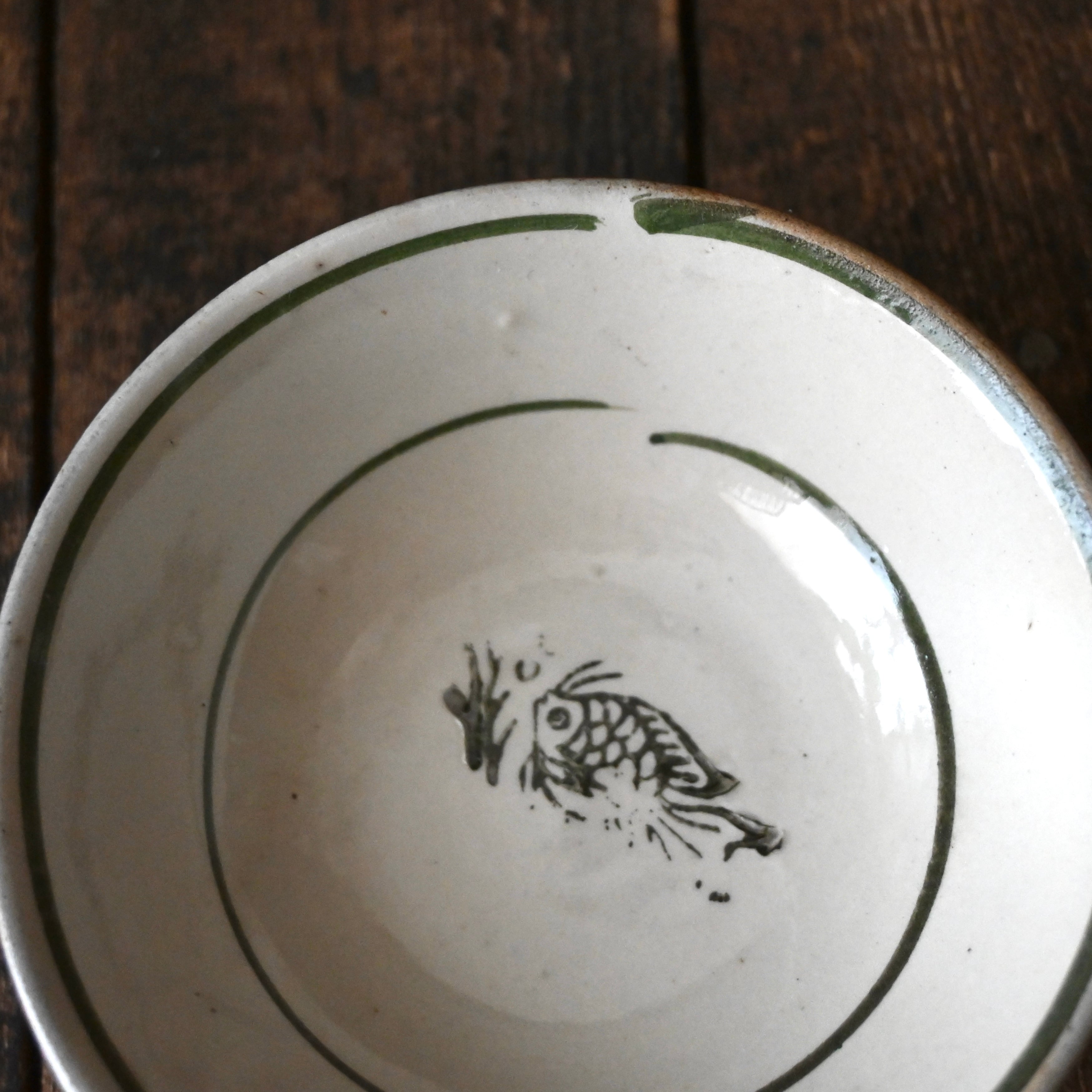 焼成時に器を重ねて焼くため、高台(底の部分)や縁に、小さな突起や釉薬の剥がれた跡が残ることがあります。これは当時の製法ならではの特徴であり、ひとつひとつ異なる個性を持つ証ともいえます。