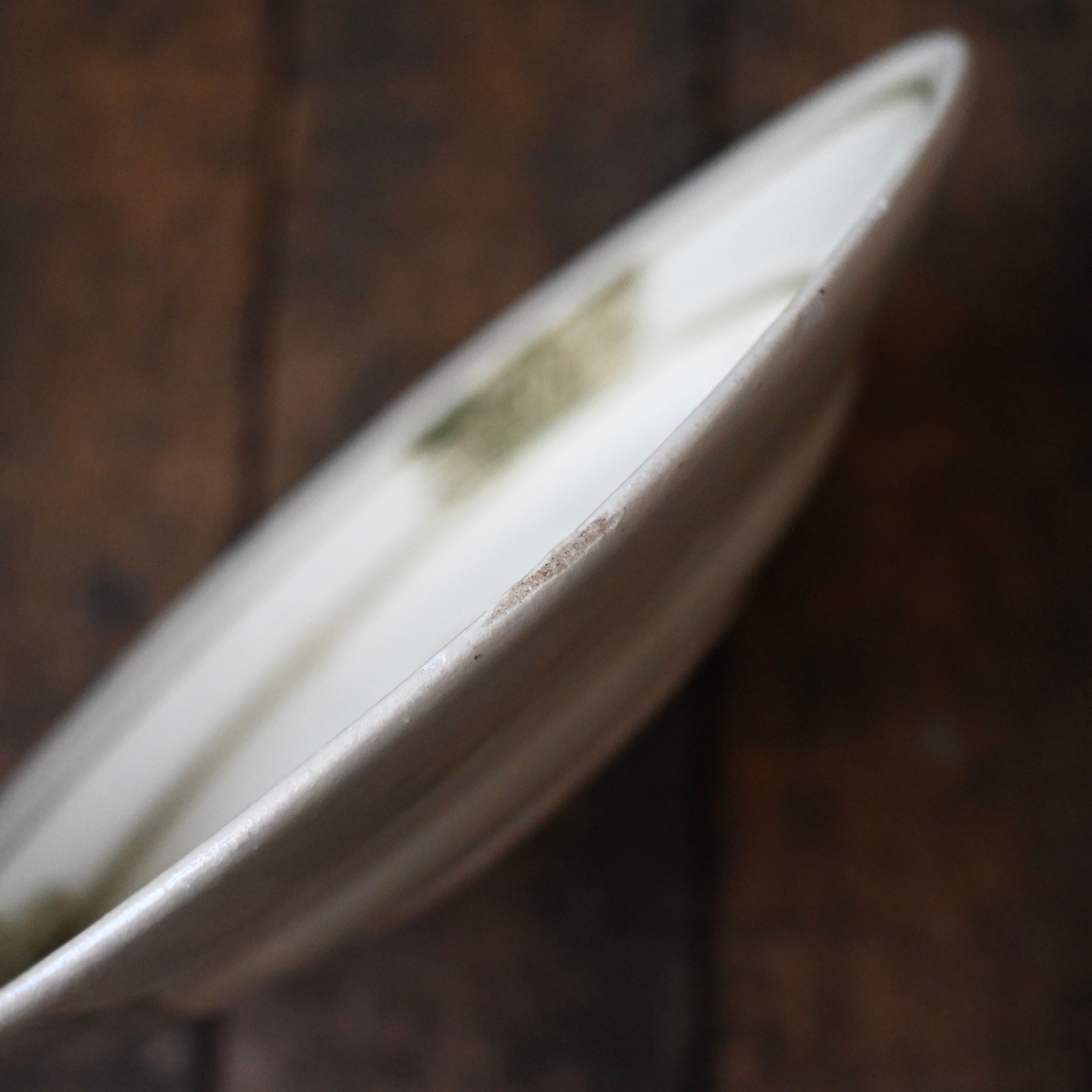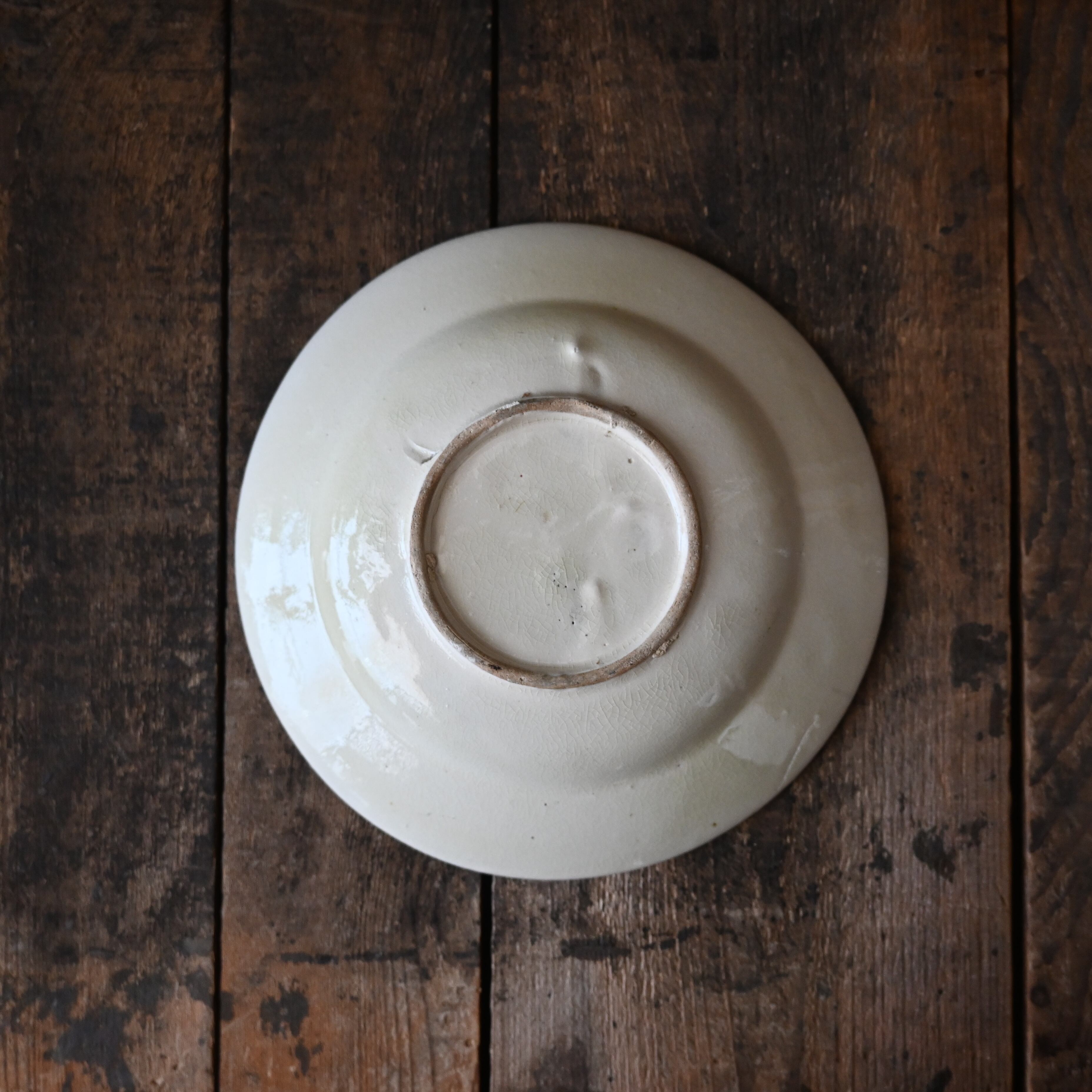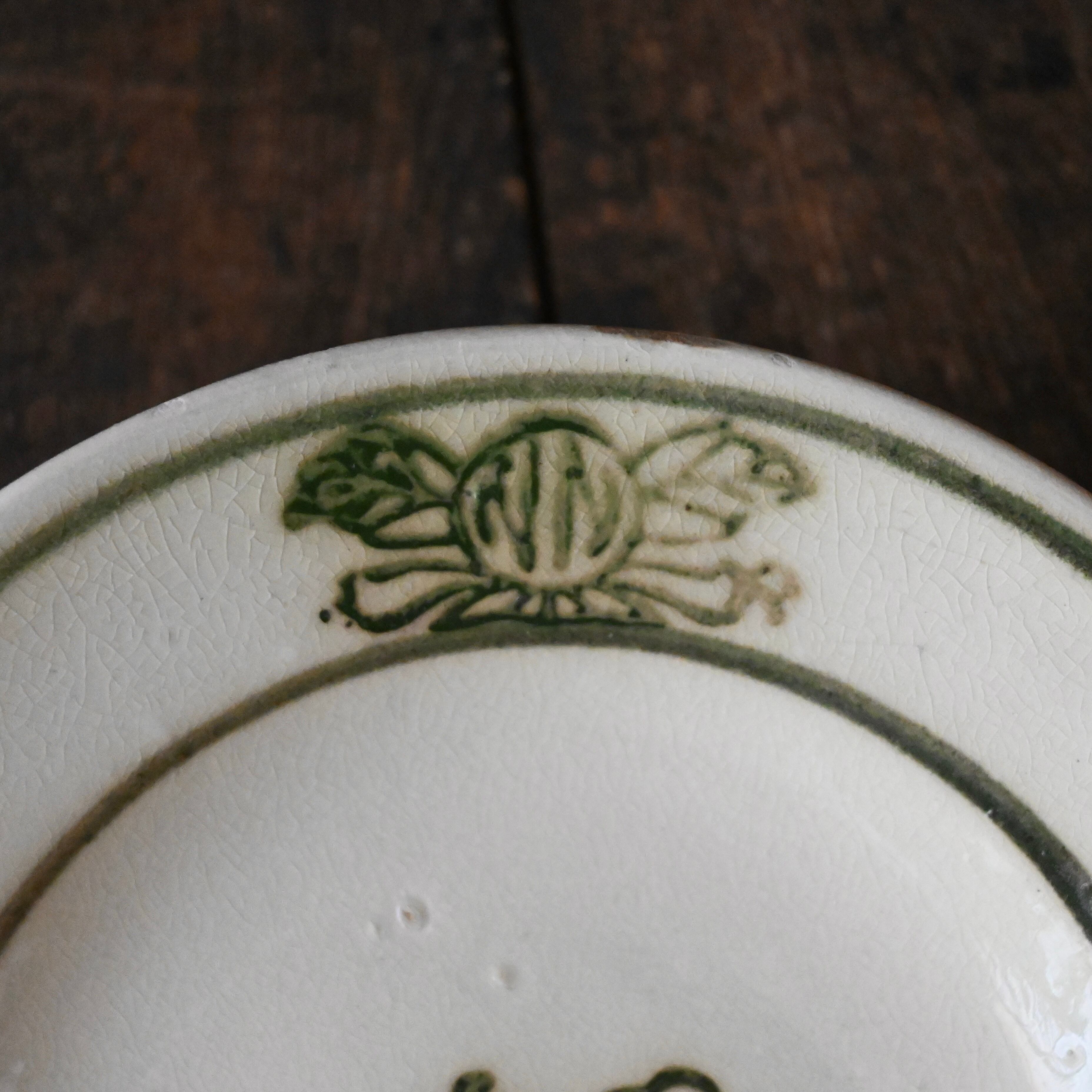 焼成時に器を重ねて焼くため、高台(底の部分)や縁に、小さな突起や釉薬の剥がれた跡が残ることがあります。これは当時の製法ならではの特徴であり、ひとつひとつ異なる個性を持つ証ともいえます。