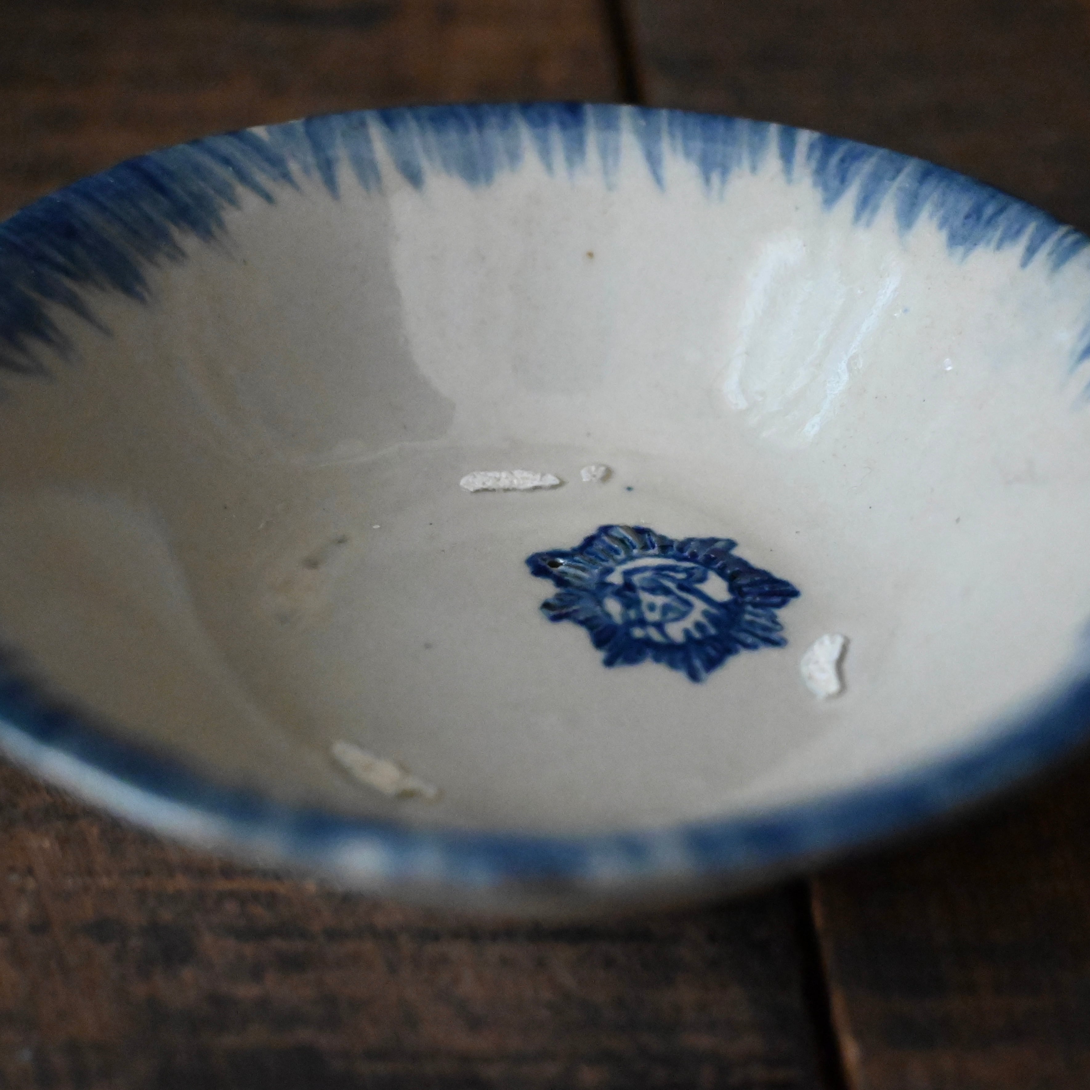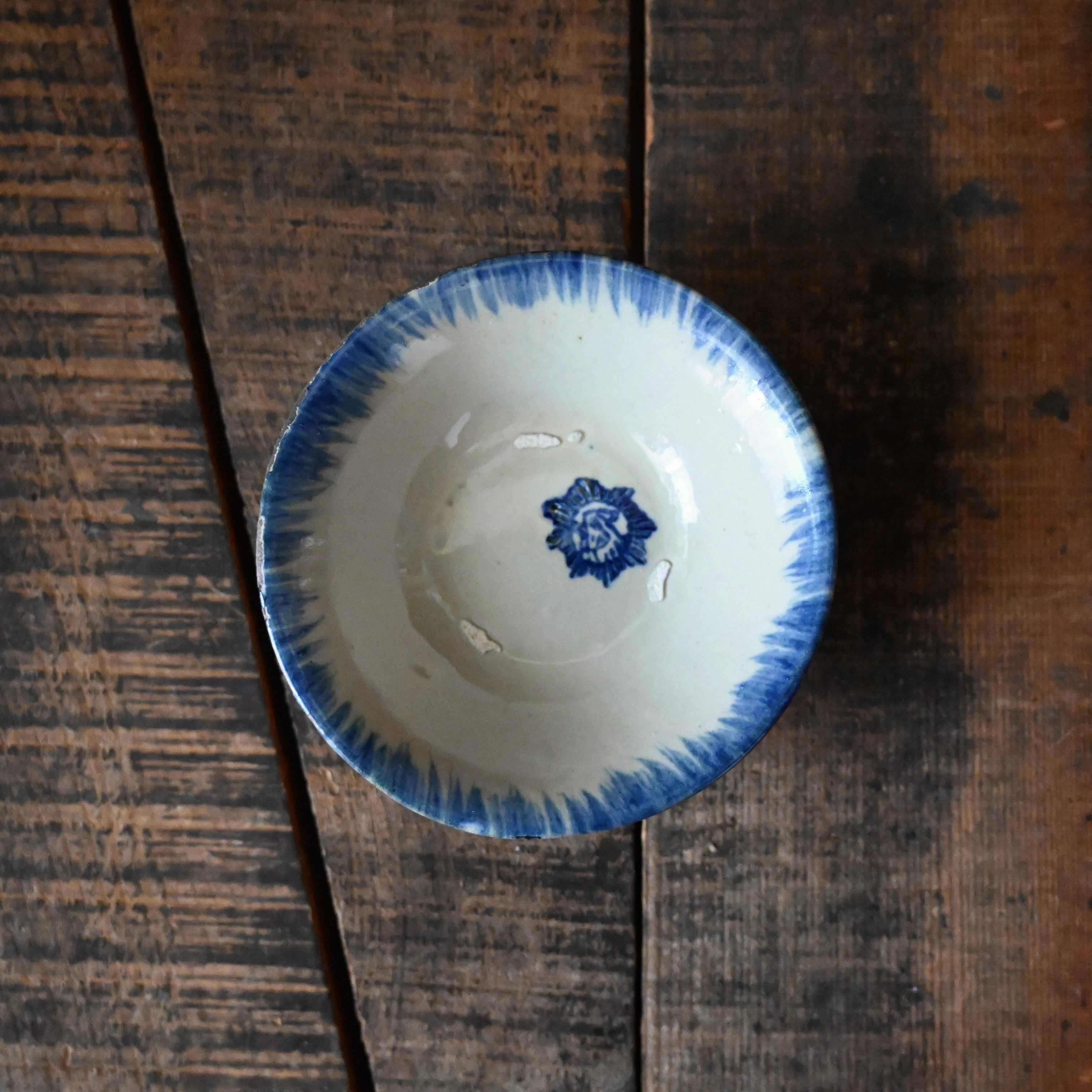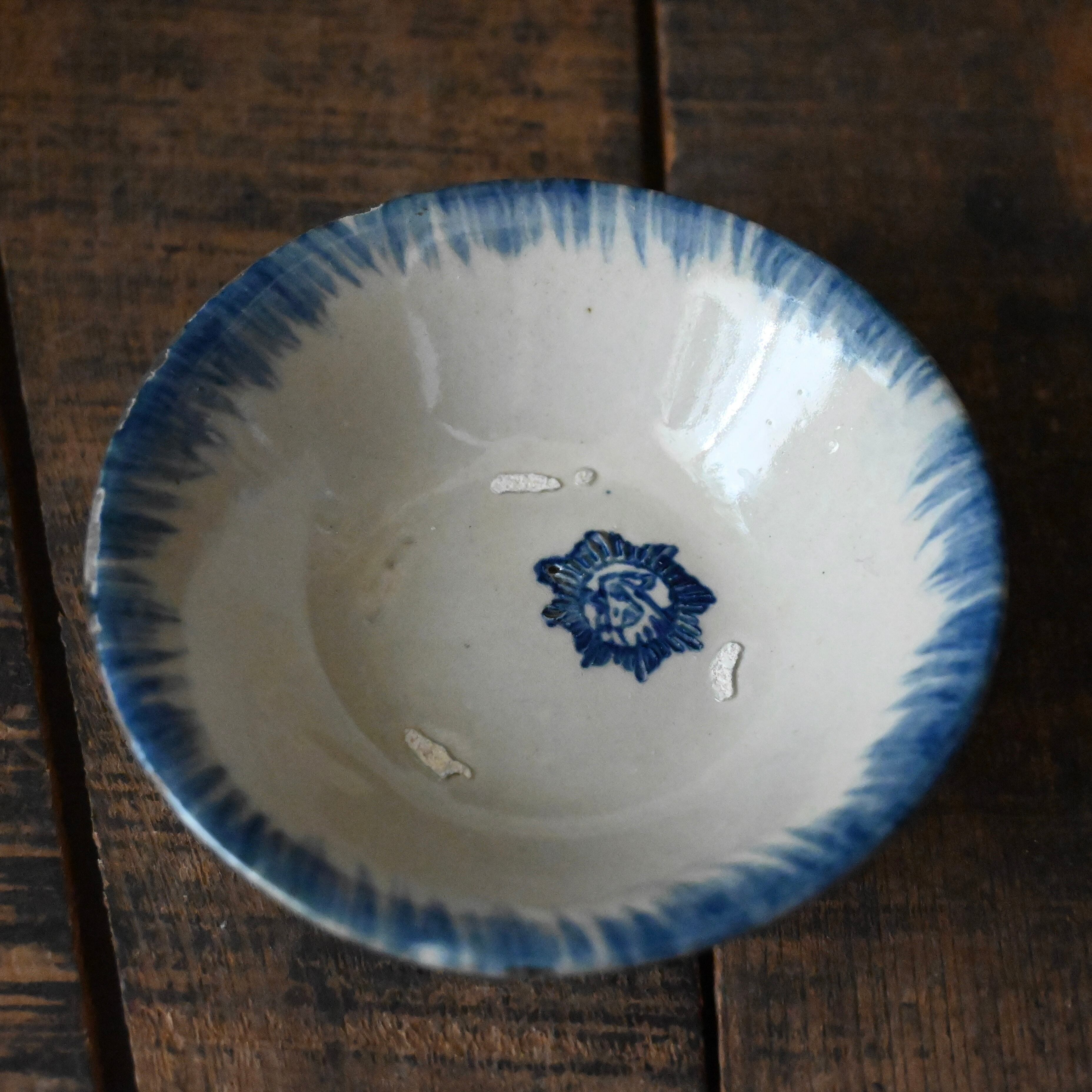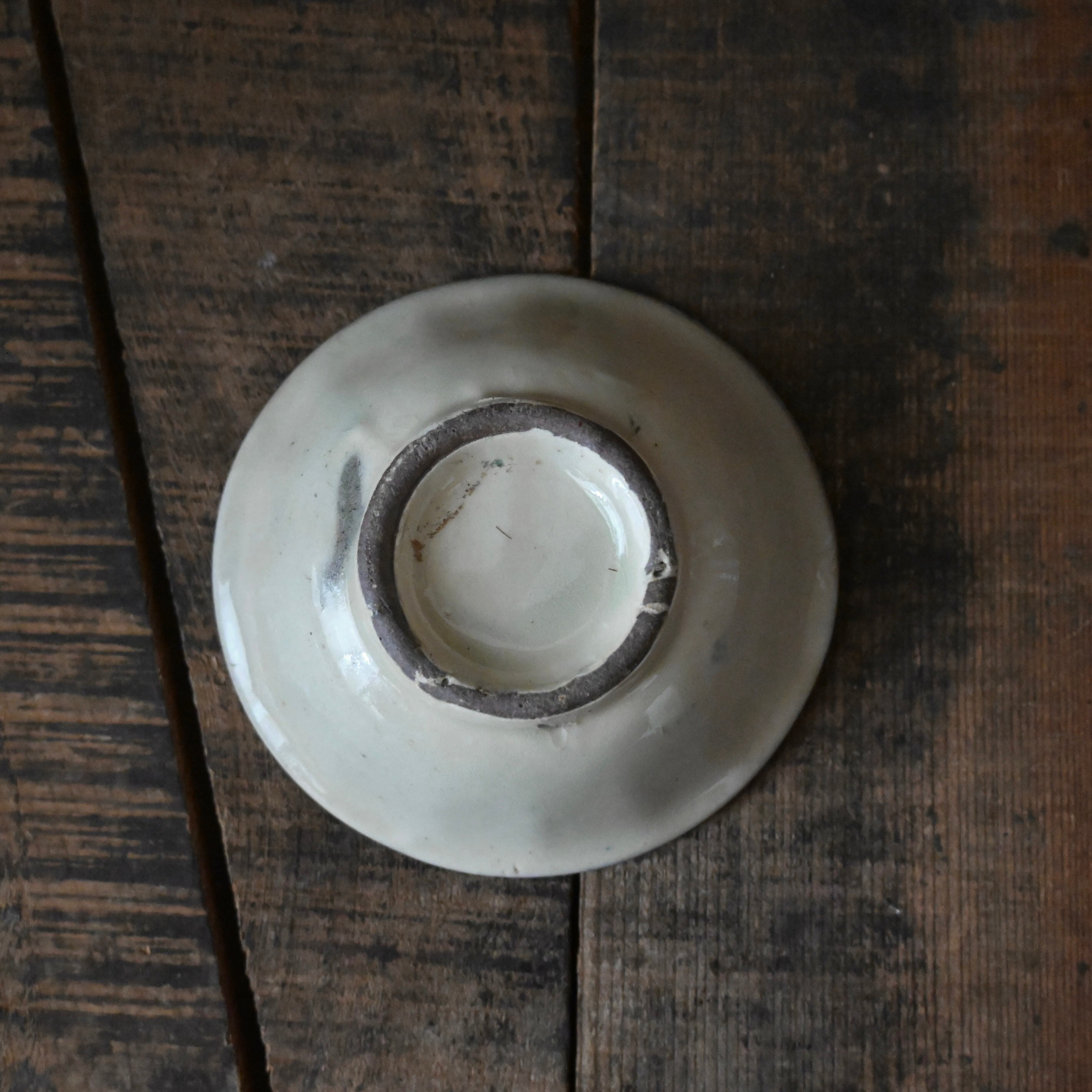 焼成時に器を重ねて焼くため、高台(底の部分)や縁に、小さな突起や釉薬の剥がれた跡が残ることがあります。これは当時の製法ならではの特徴であり、ひとつひとつ異なる個性を持つ証ともいえます。