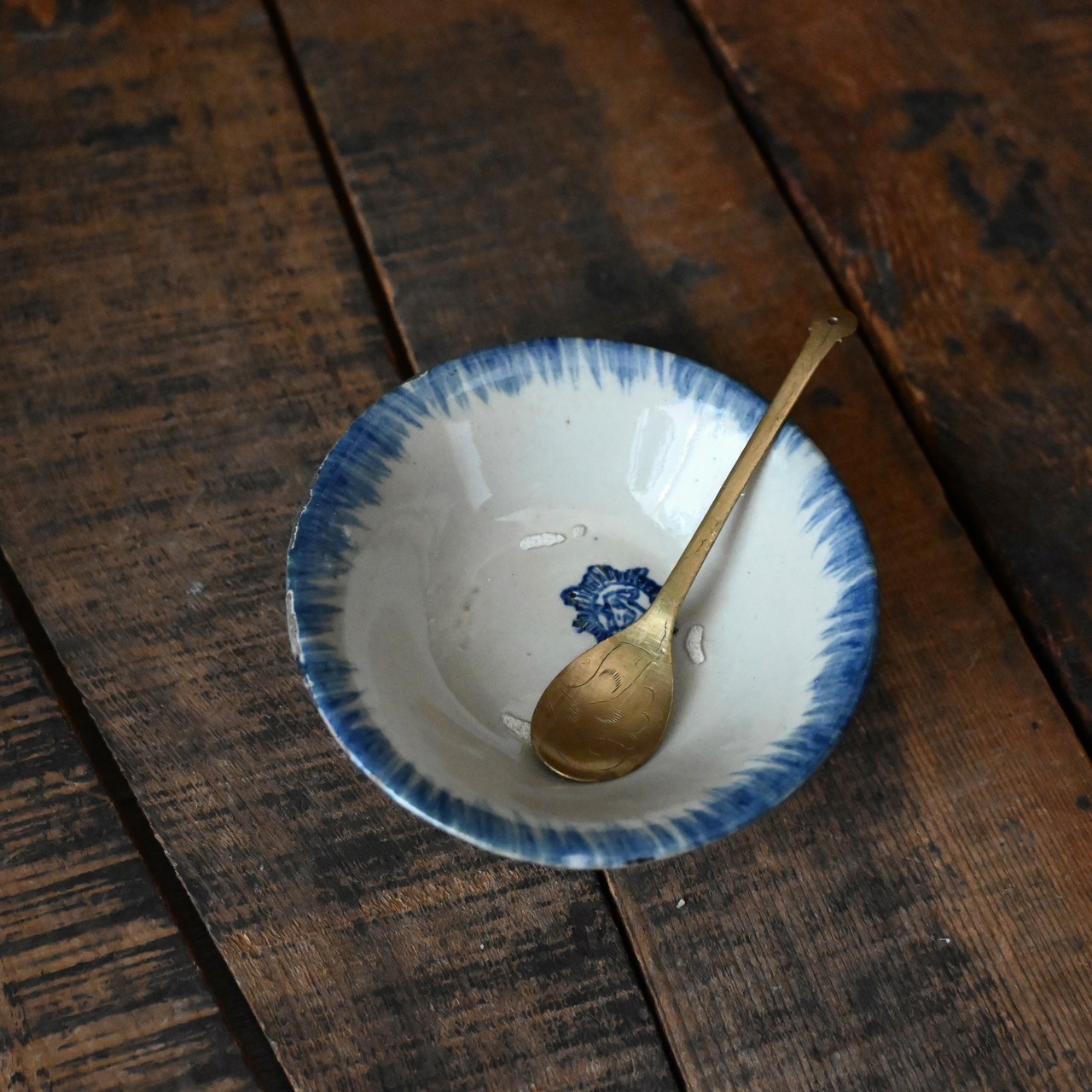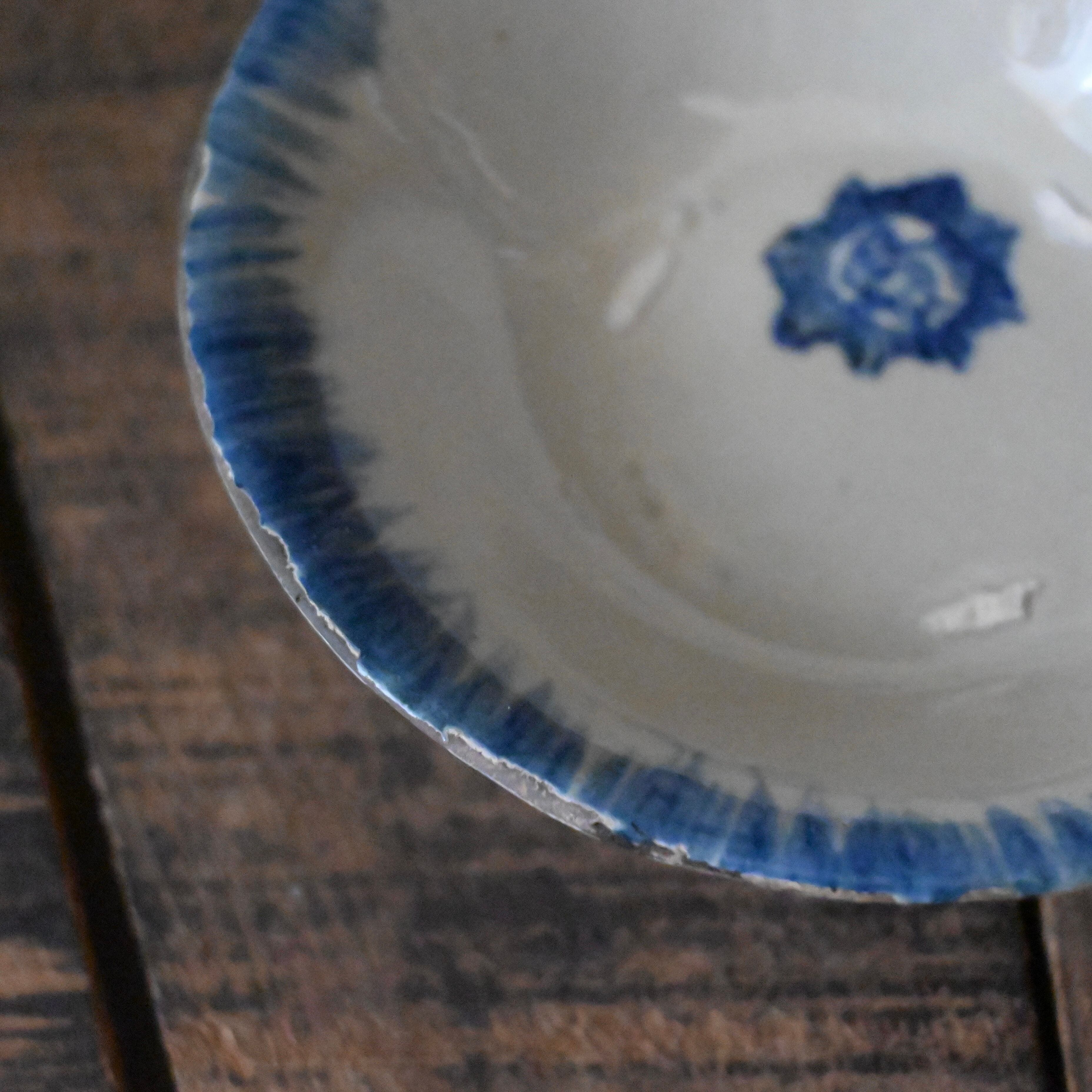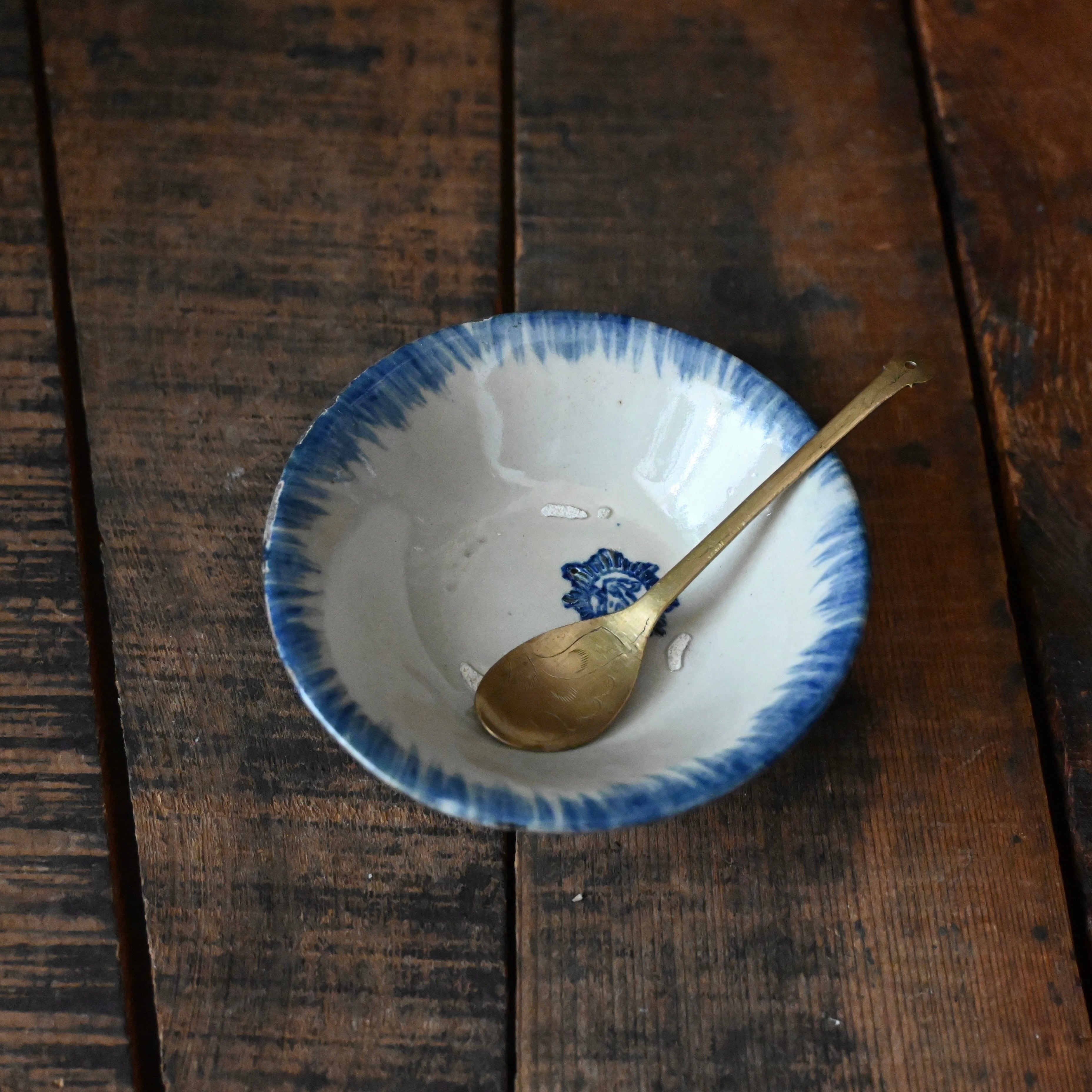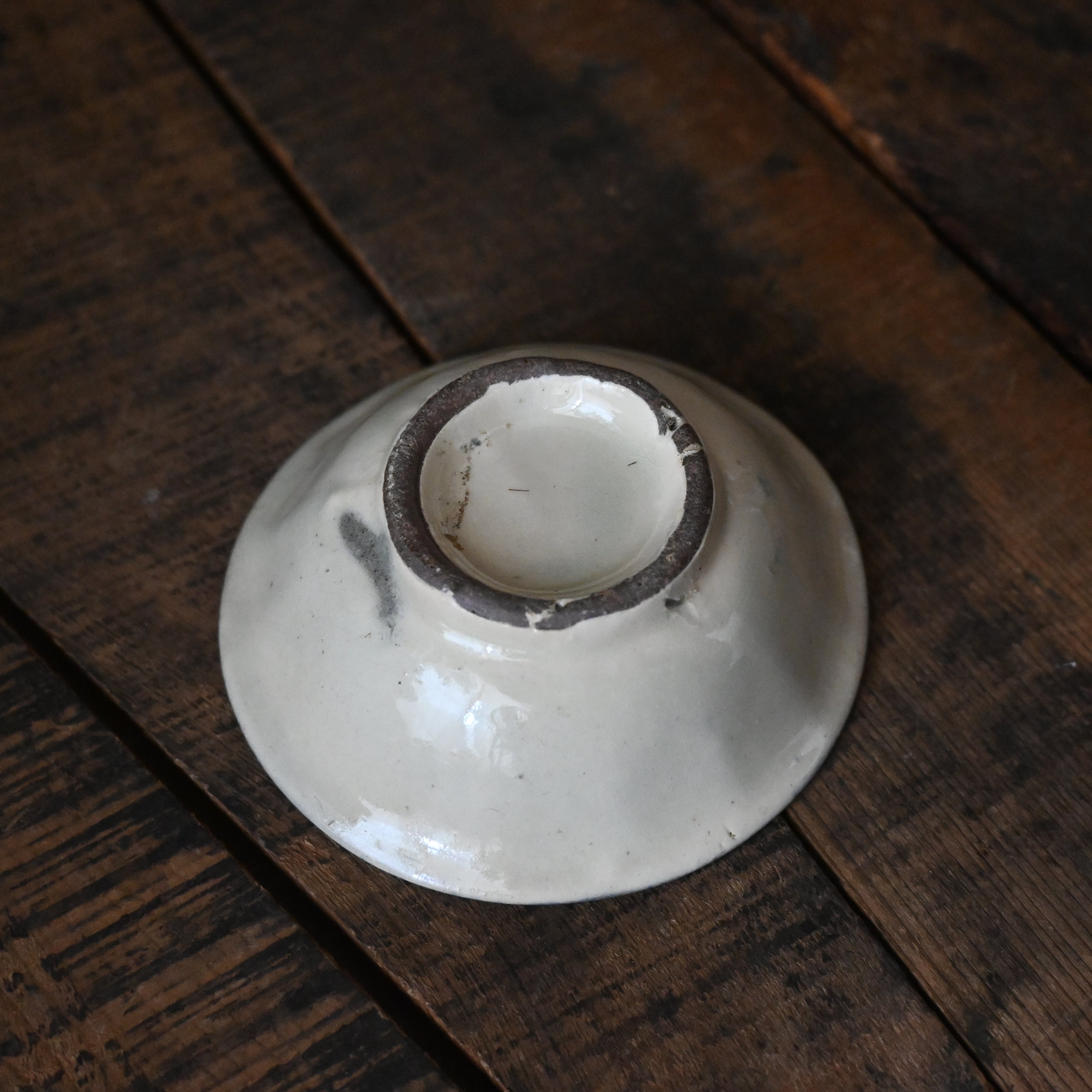 焼成時に器を重ねて焼くため、高台(底の部分)や縁に、小さな突起や釉薬の剥がれた跡が残ることがあります。これは当時の製法ならではの特徴であり、ひとつひとつ異なる個性を持つ証ともいえます。