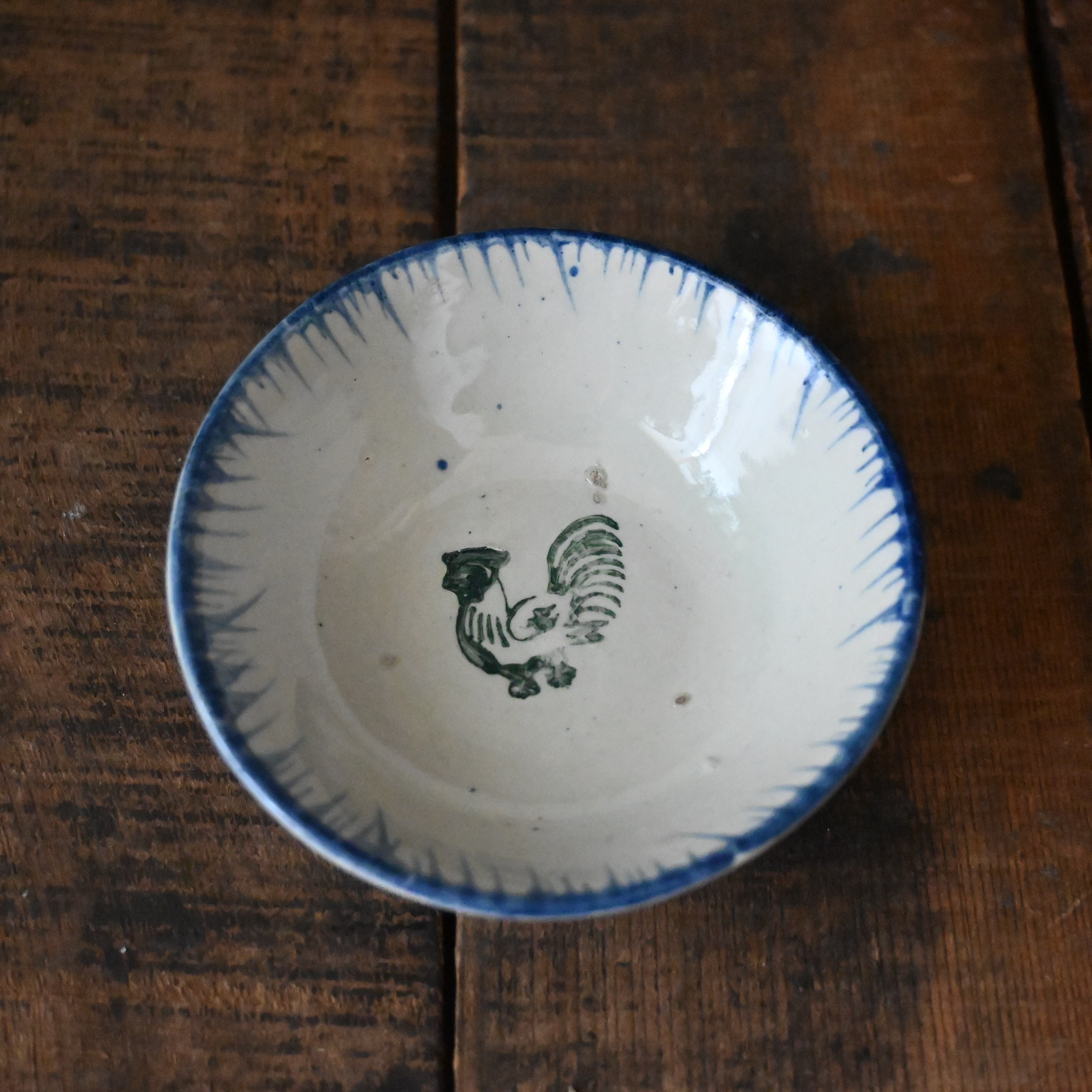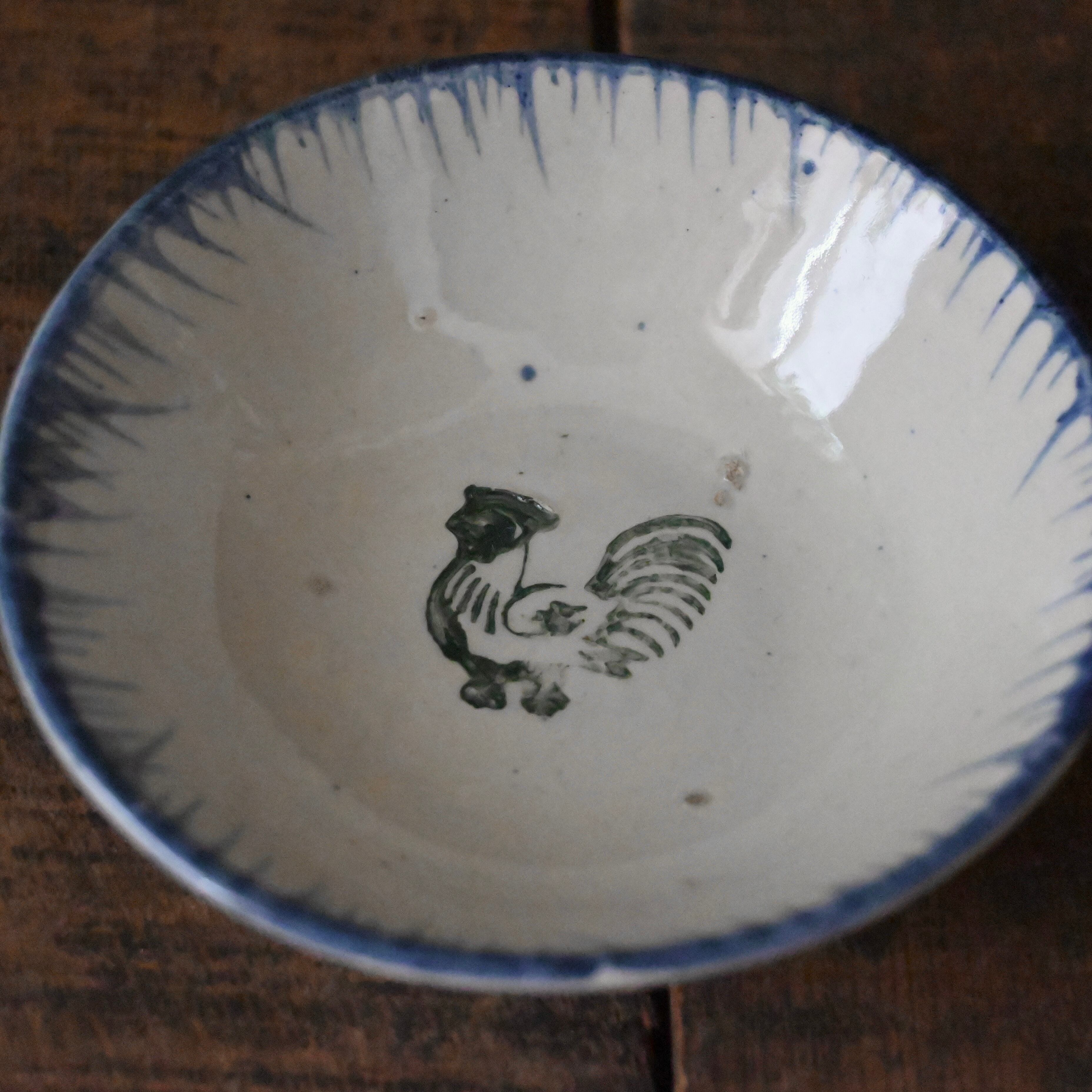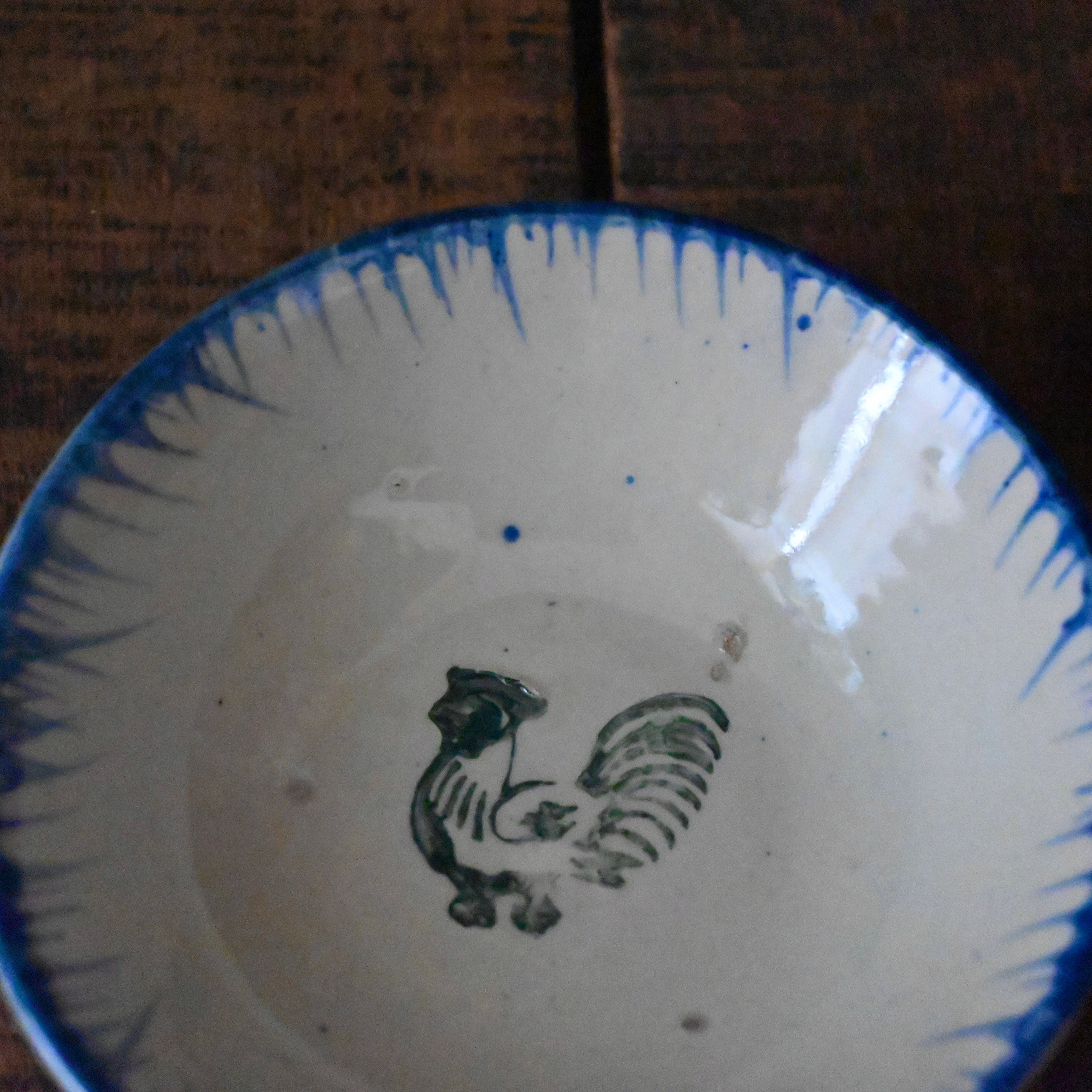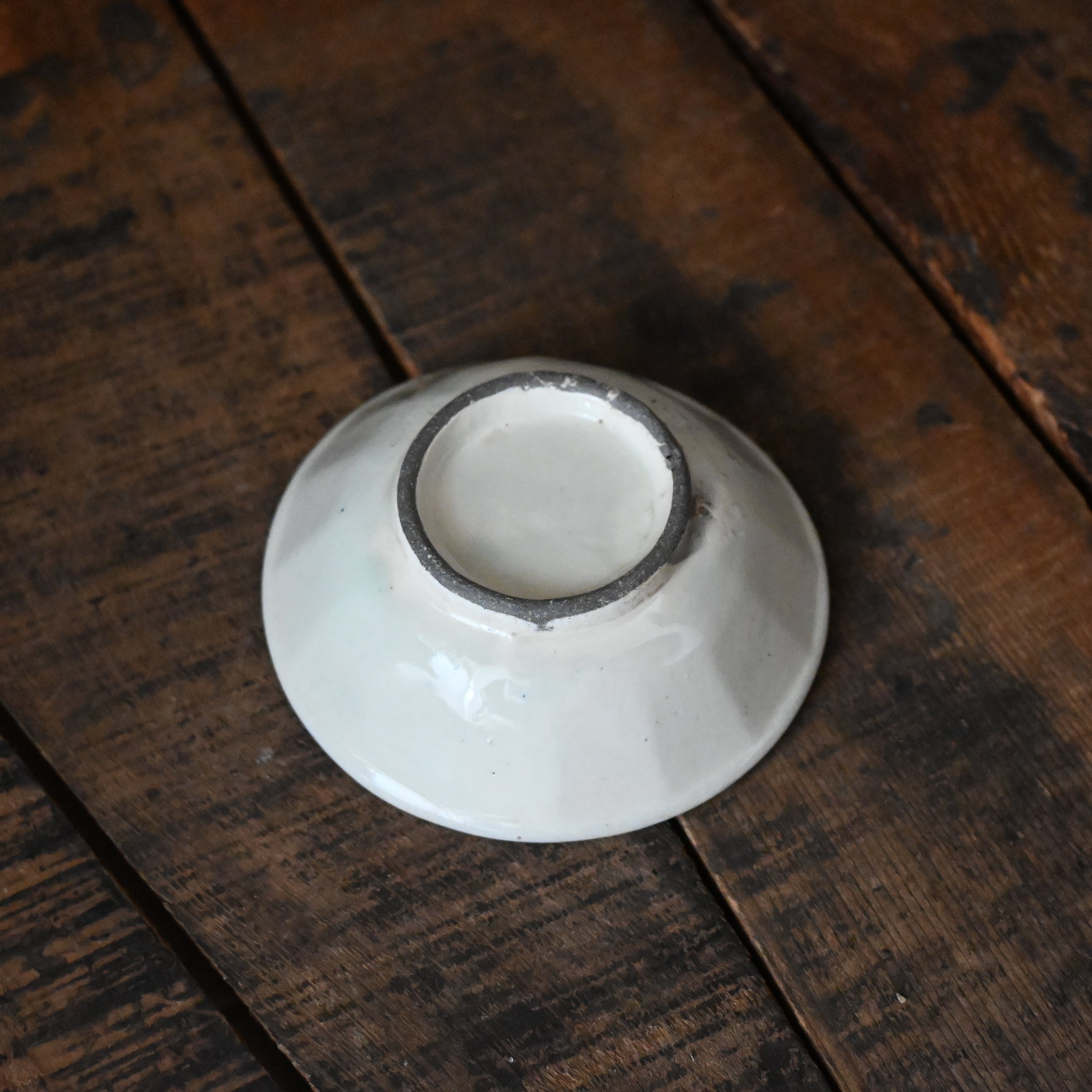 焼成時に器を重ねて焼くため、高台(底の部分)や縁に、小さな突起や釉薬の剥がれた跡が残ることがあります。これは当時の製法ならではの特徴であり、ひとつひとつ異なる個性を持つ証ともいえます。