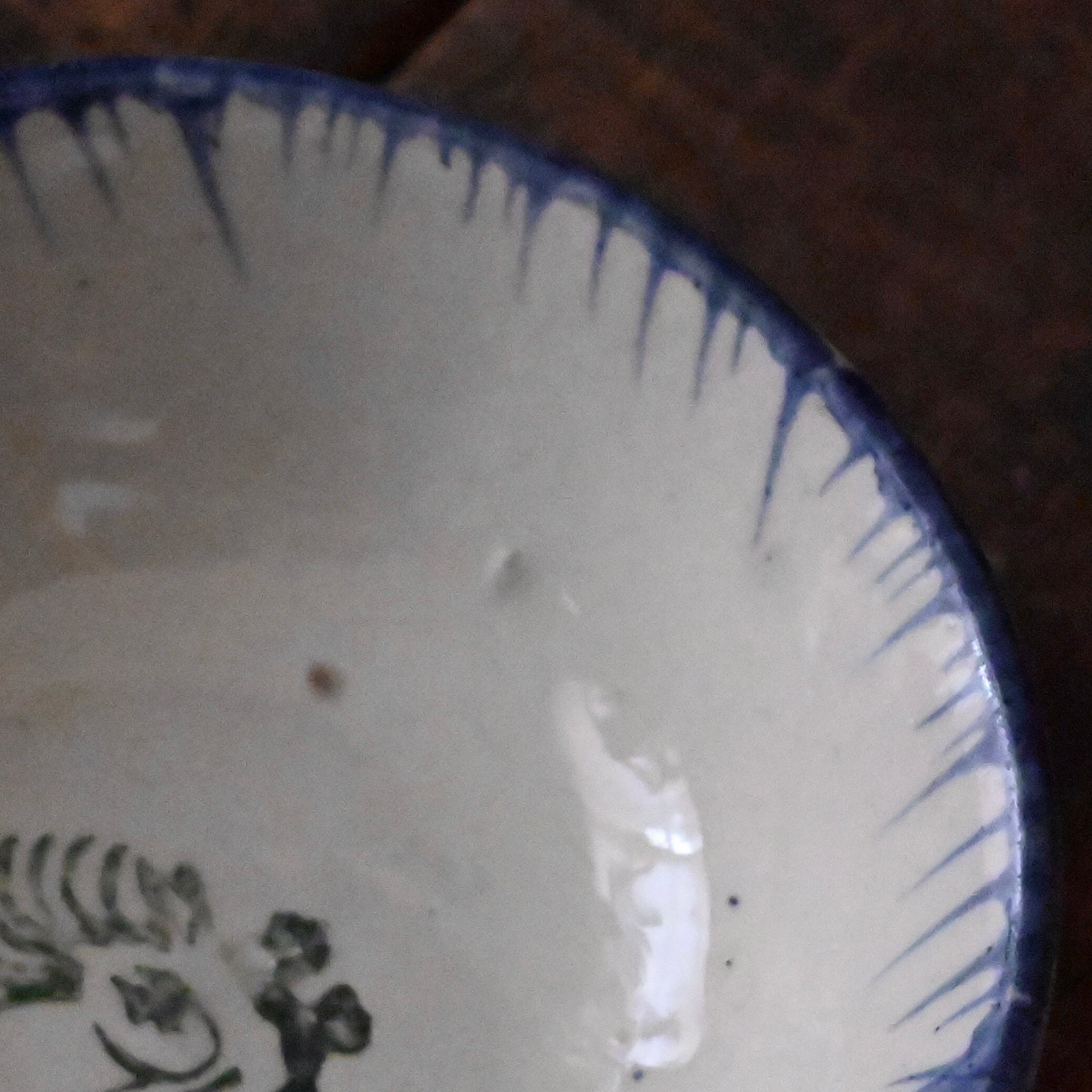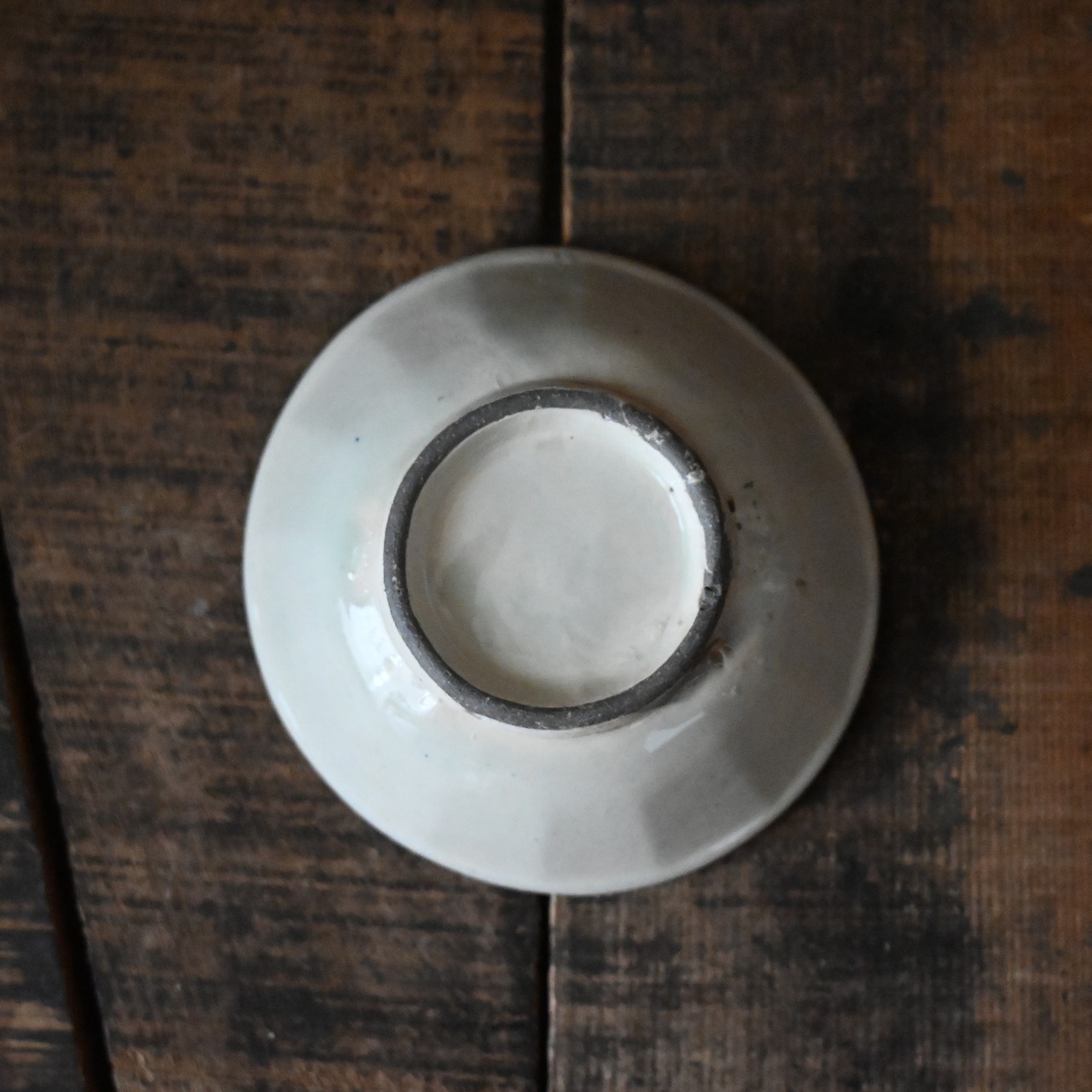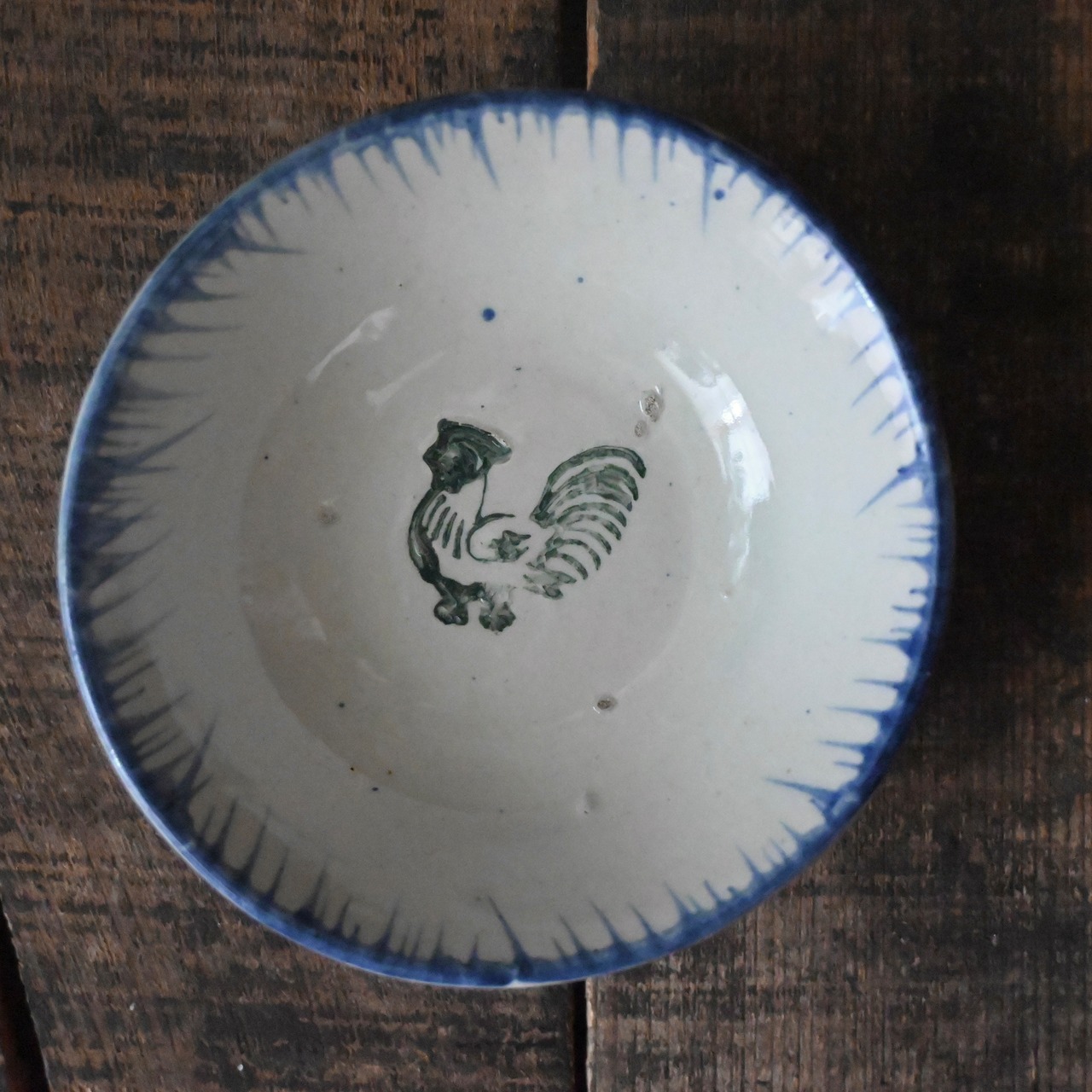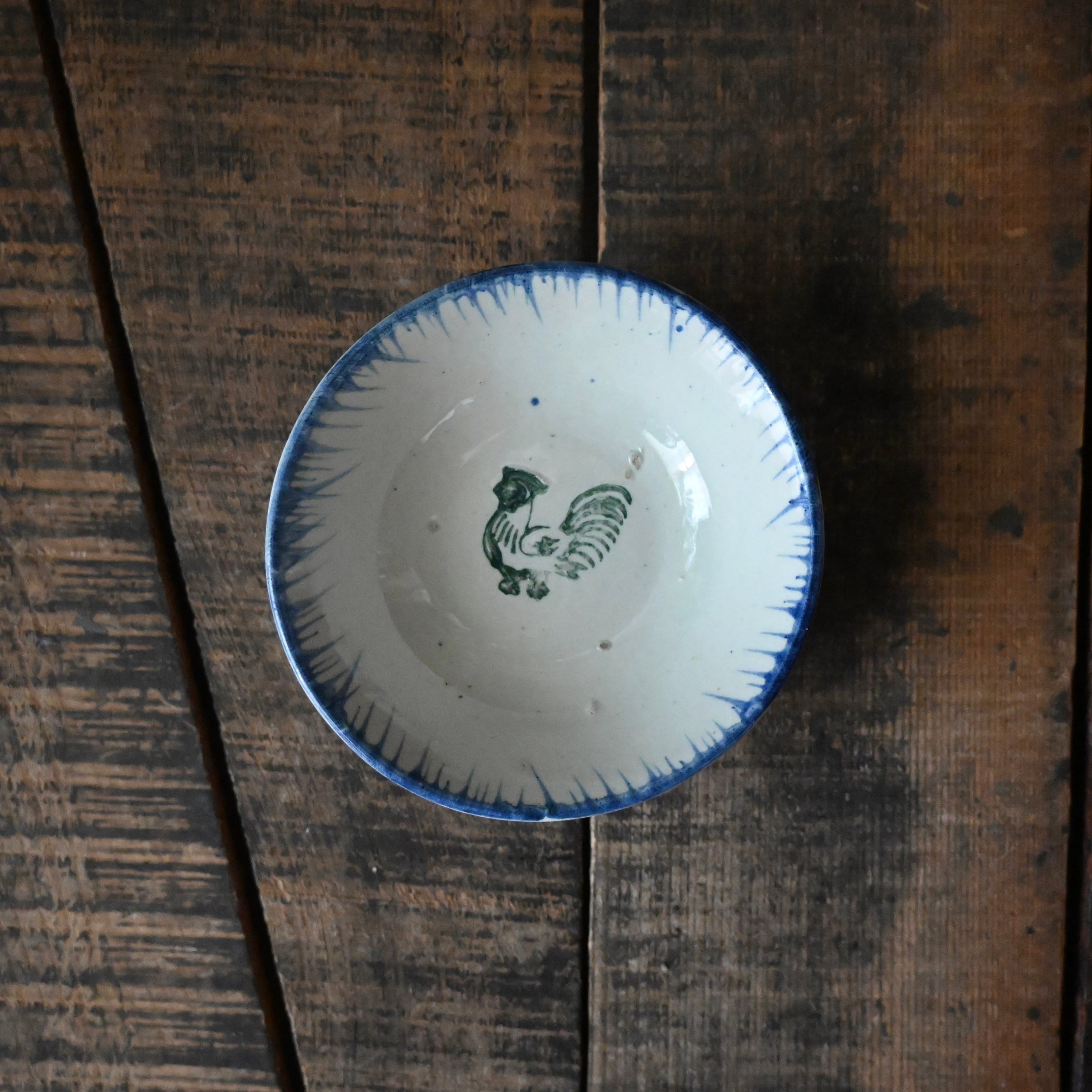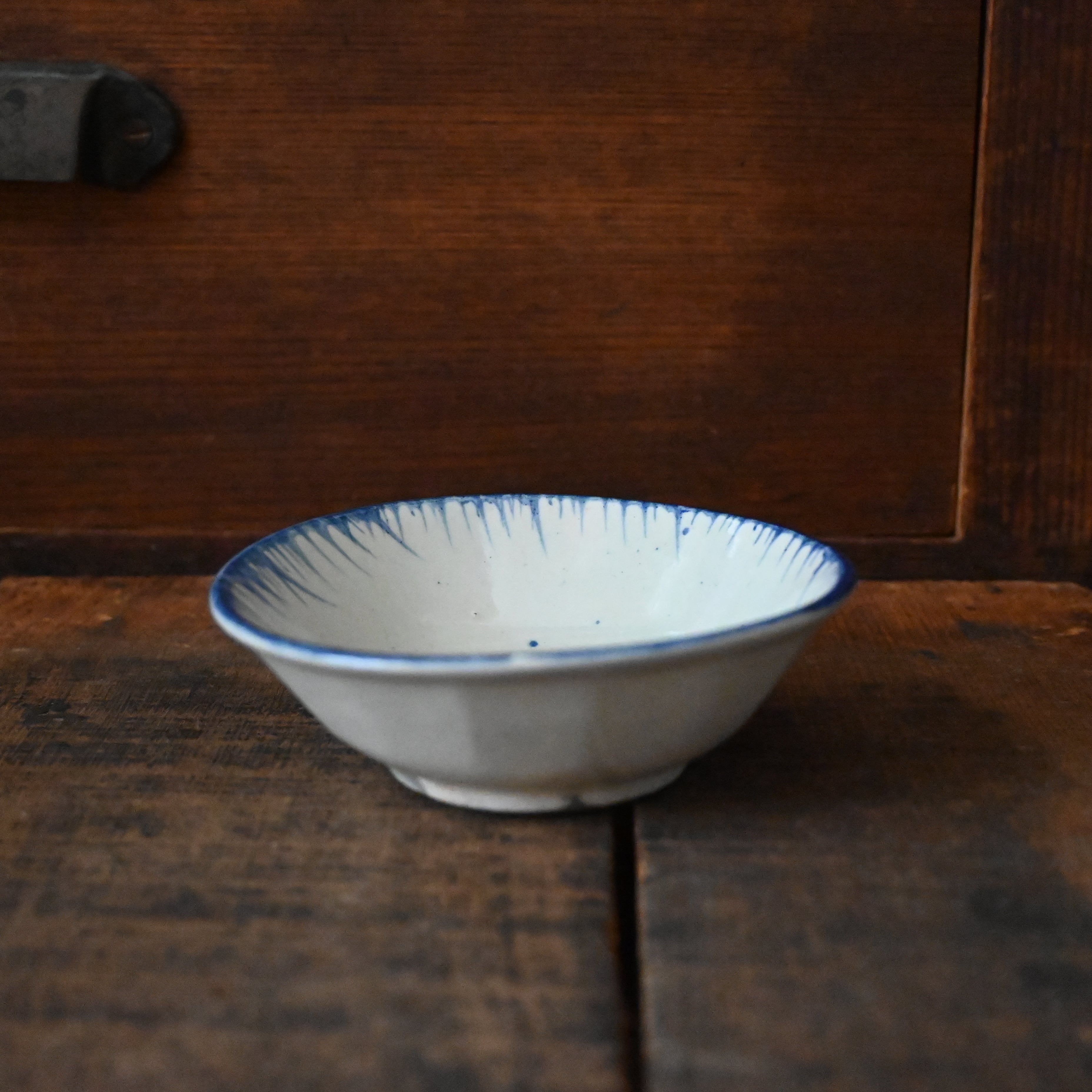 焼成時に器を重ねて焼くため、高台(底の部分)や縁に、小さな突起や釉薬の剥がれた跡が残ることがあります。これは当時の製法ならではの特徴であり、ひとつひとつ異なる個性を持つ証ともいえます。