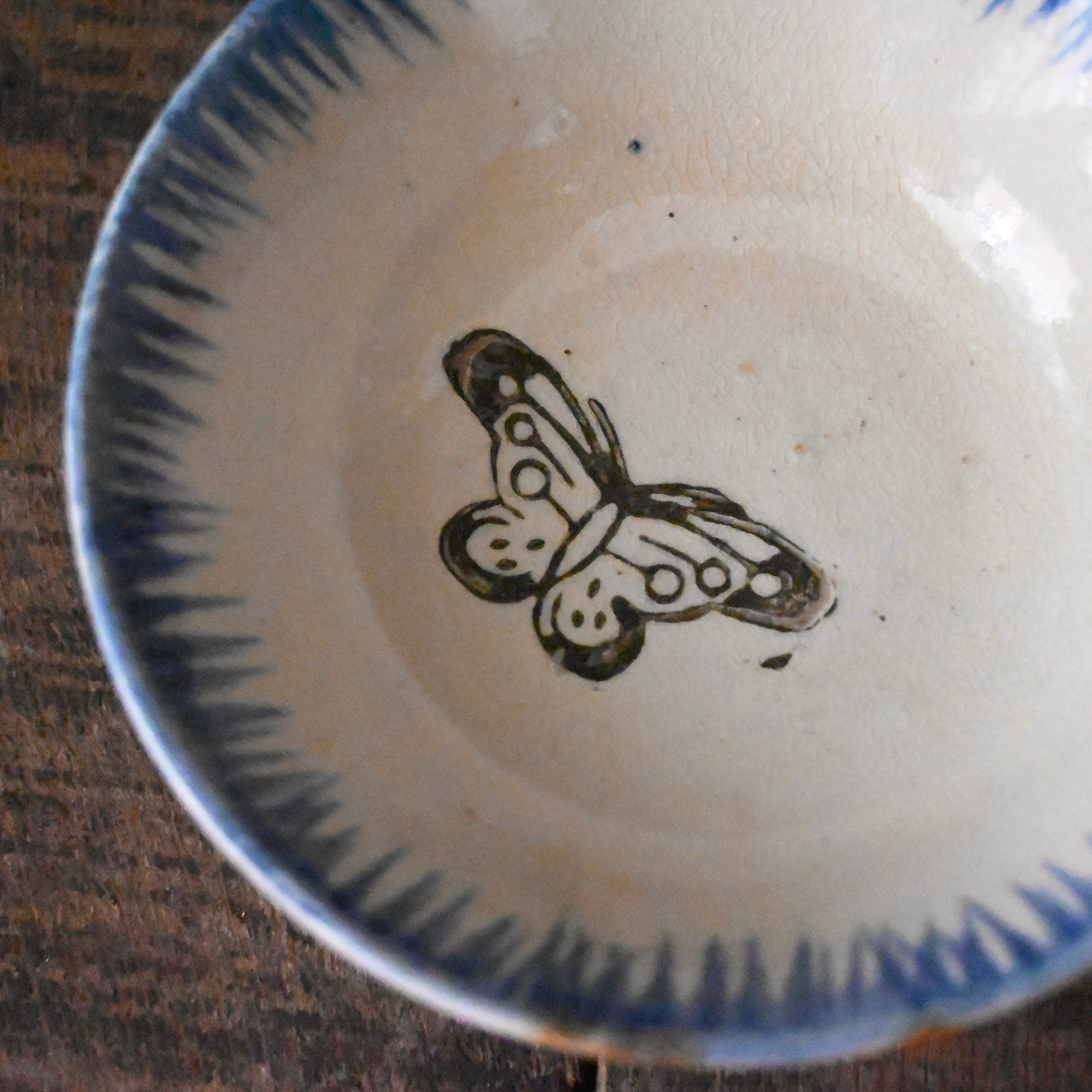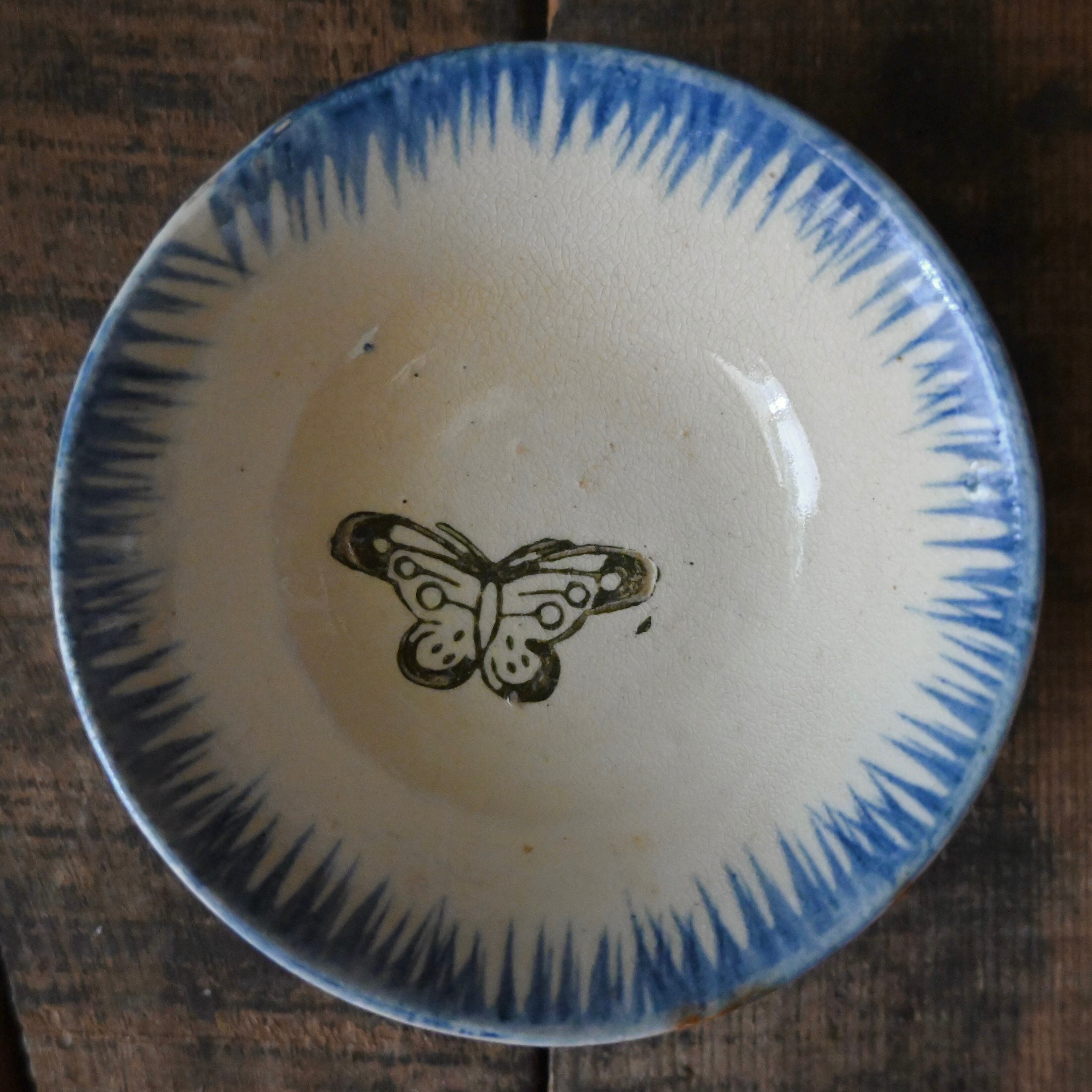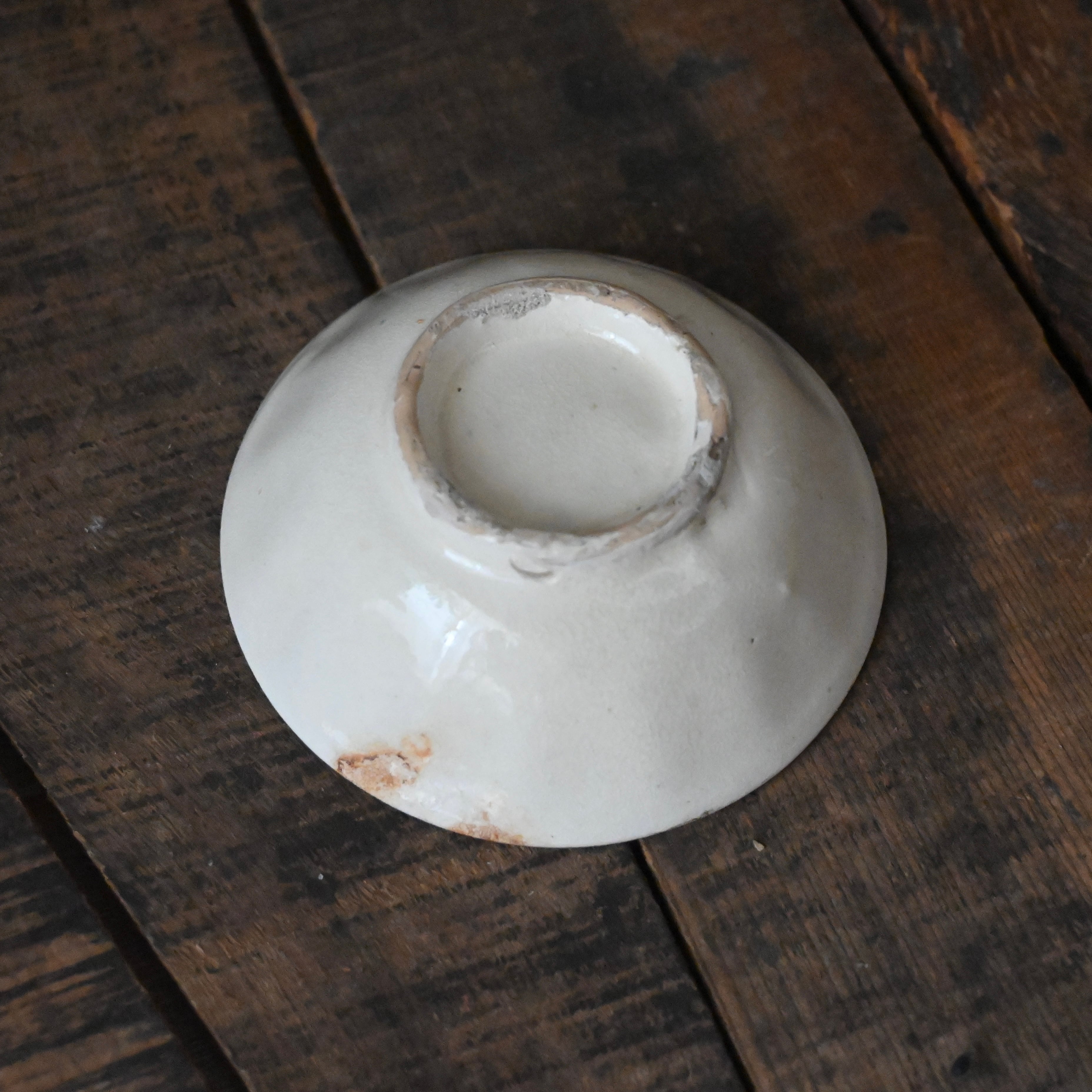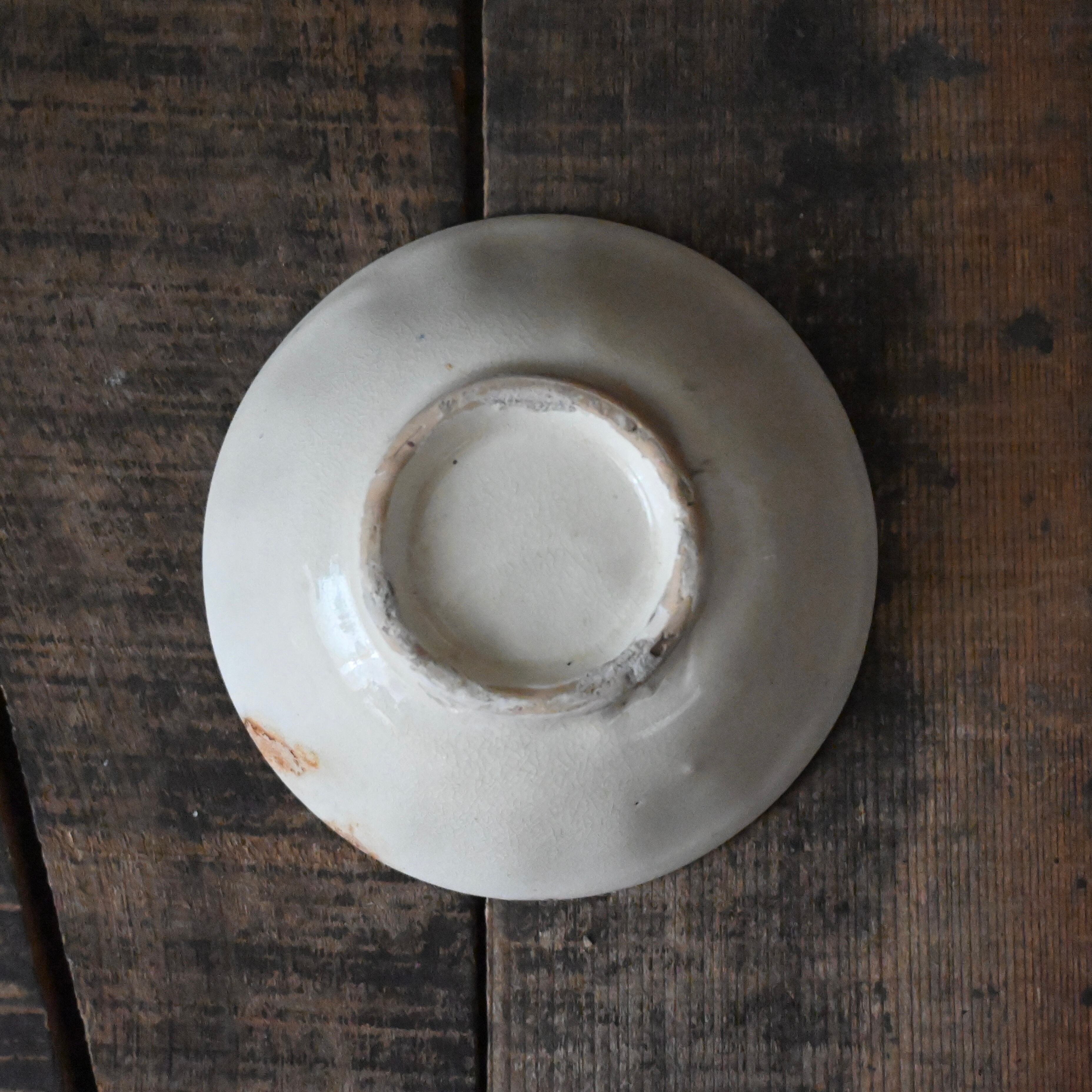 焼成時に器を重ねて焼くため、高台(底の部分)や縁に、小さな突起や釉薬の剥がれた跡が残ることがあります。これは当時の製法ならではの特徴であり、ひとつひとつ異なる個性を持つ証ともいえます。