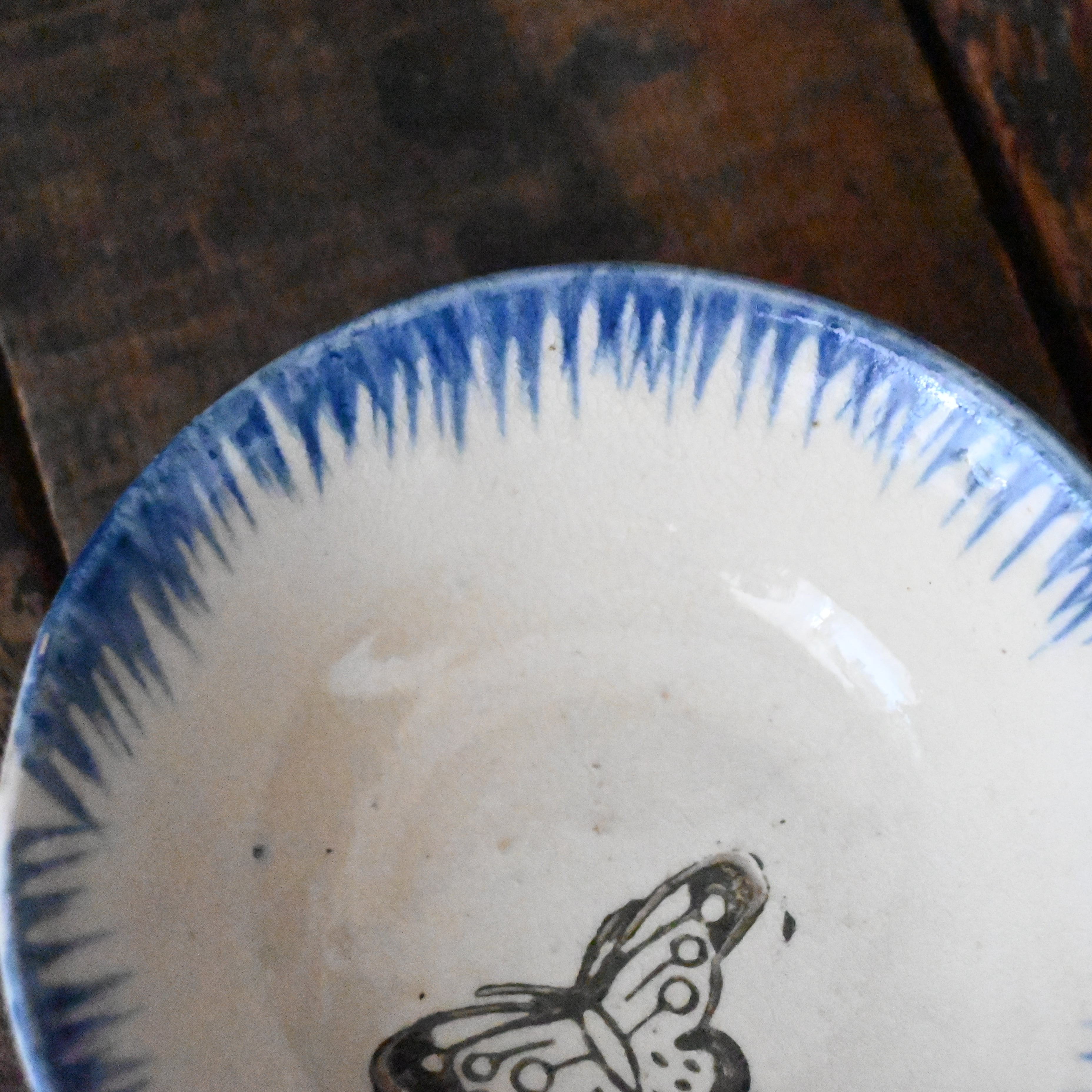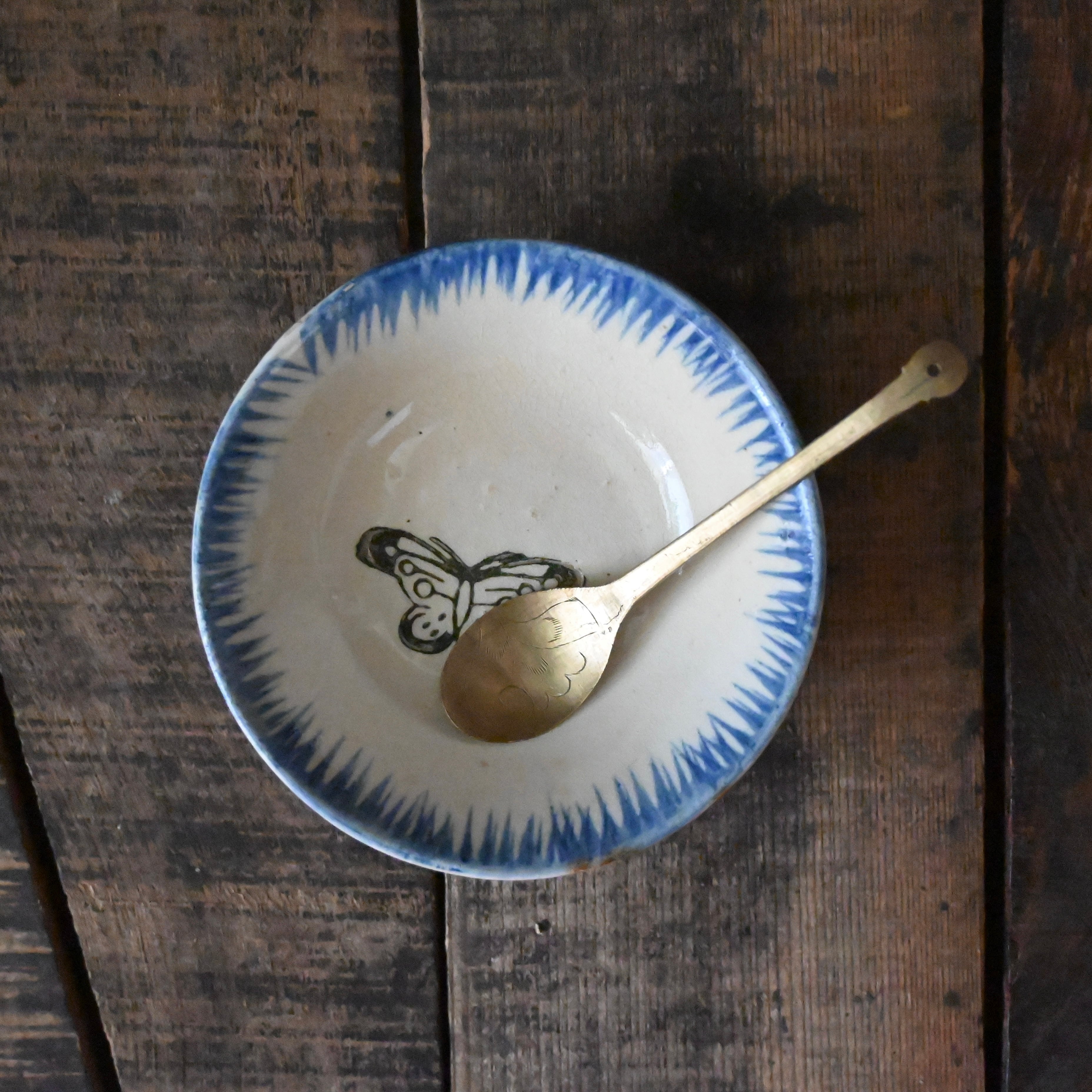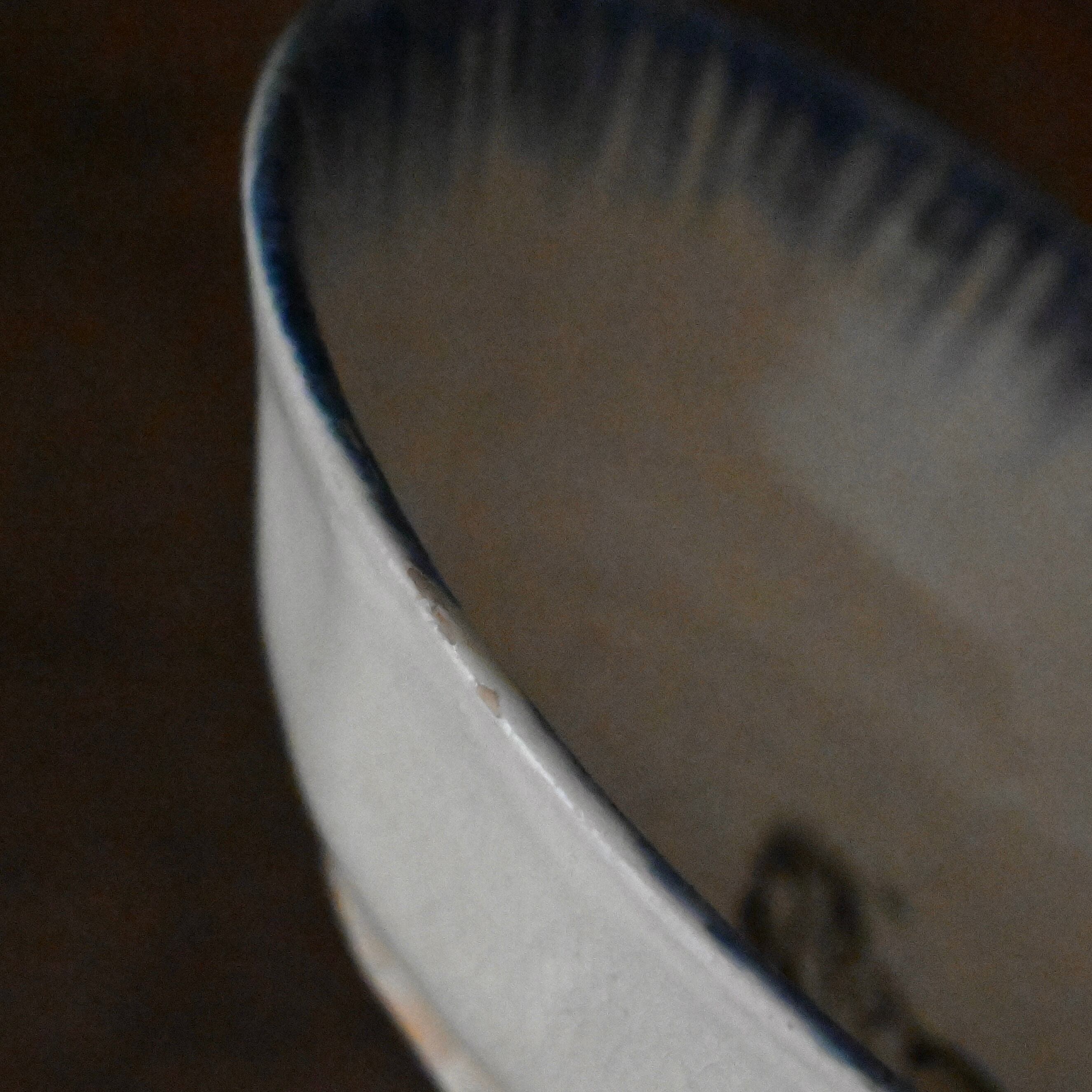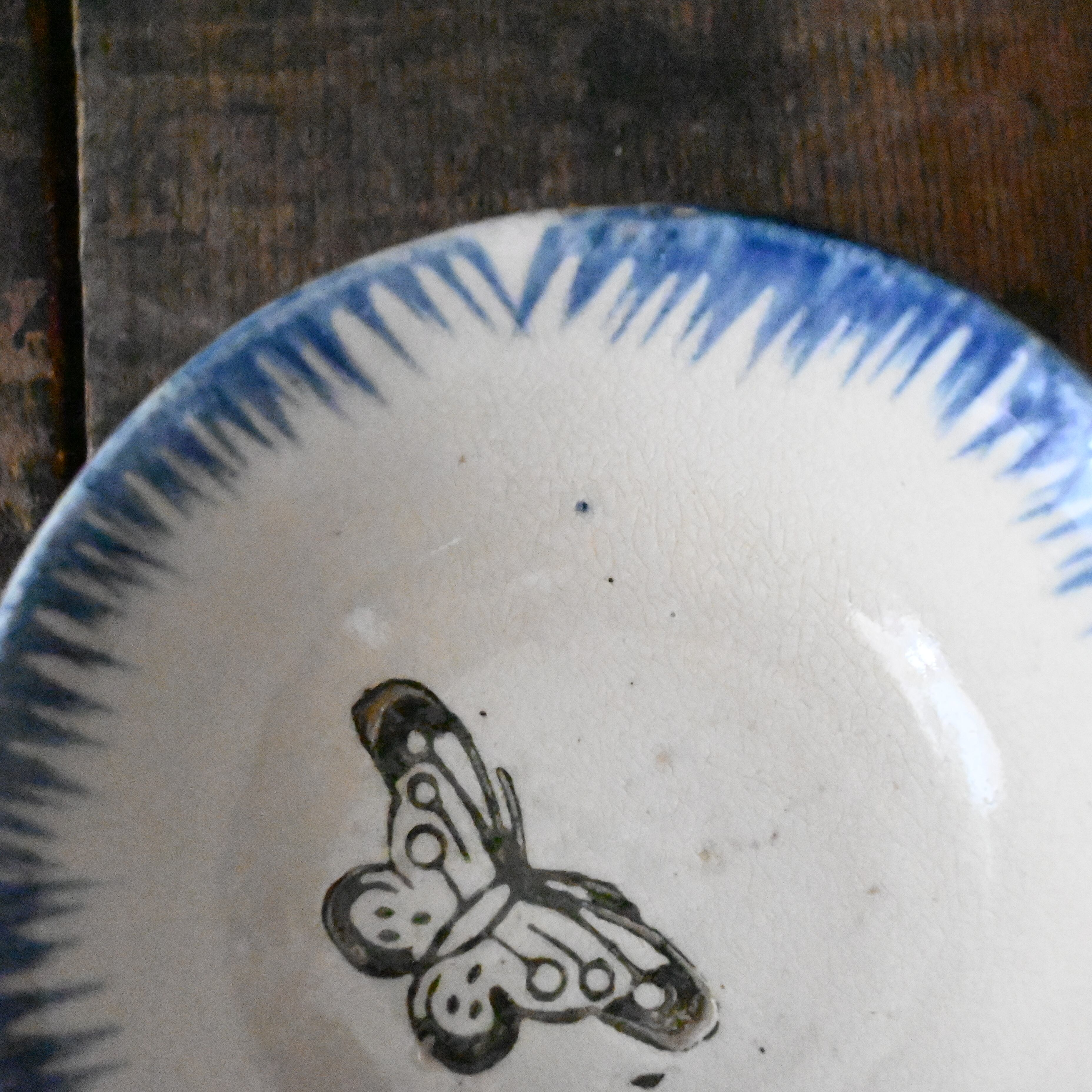 焼成時に器を重ねて焼くため、高台(底の部分)や縁に、小さな突起や釉薬の剥がれた跡が残ることがあります。これは当時の製法ならではの特徴であり、ひとつひとつ異なる個性を持つ証ともいえます。