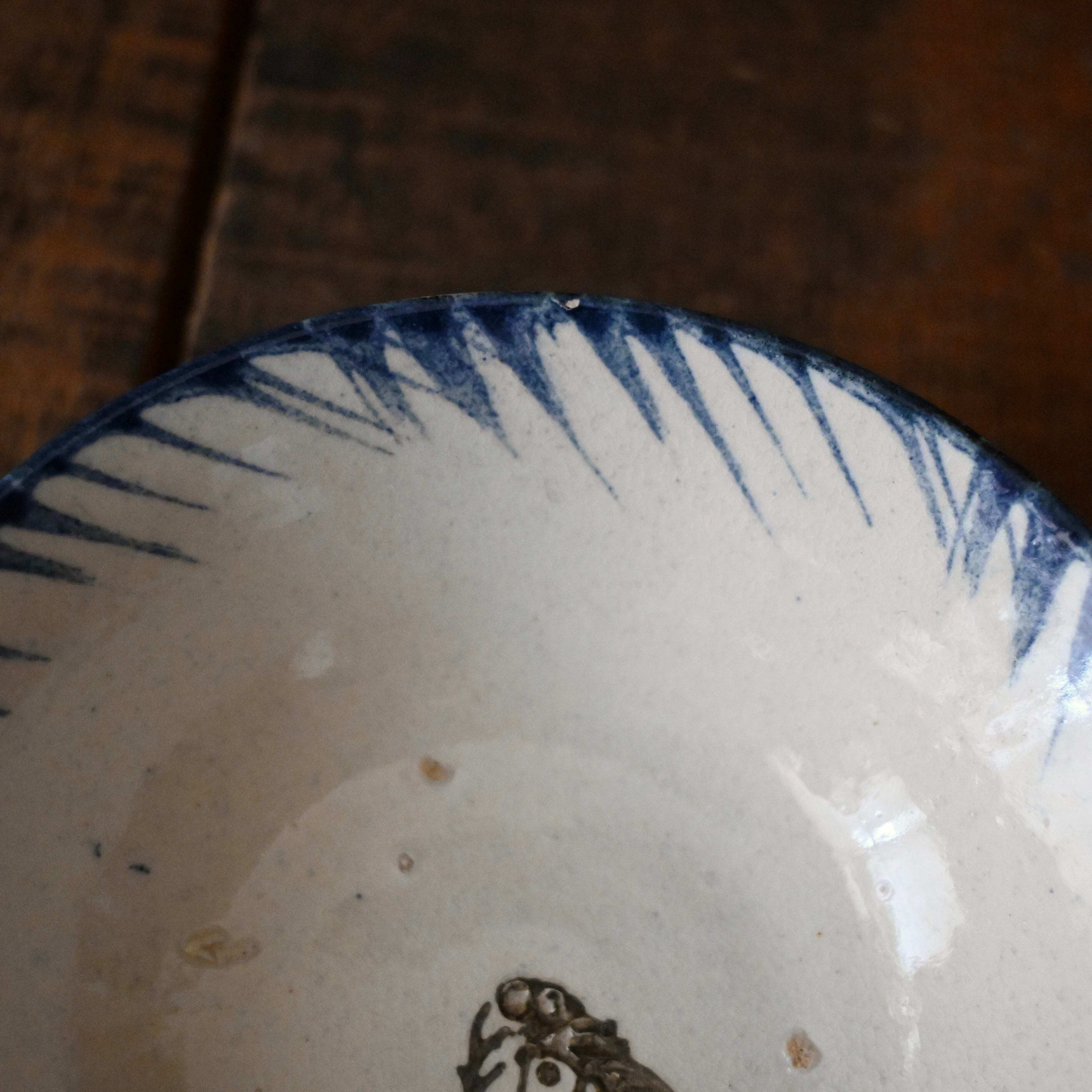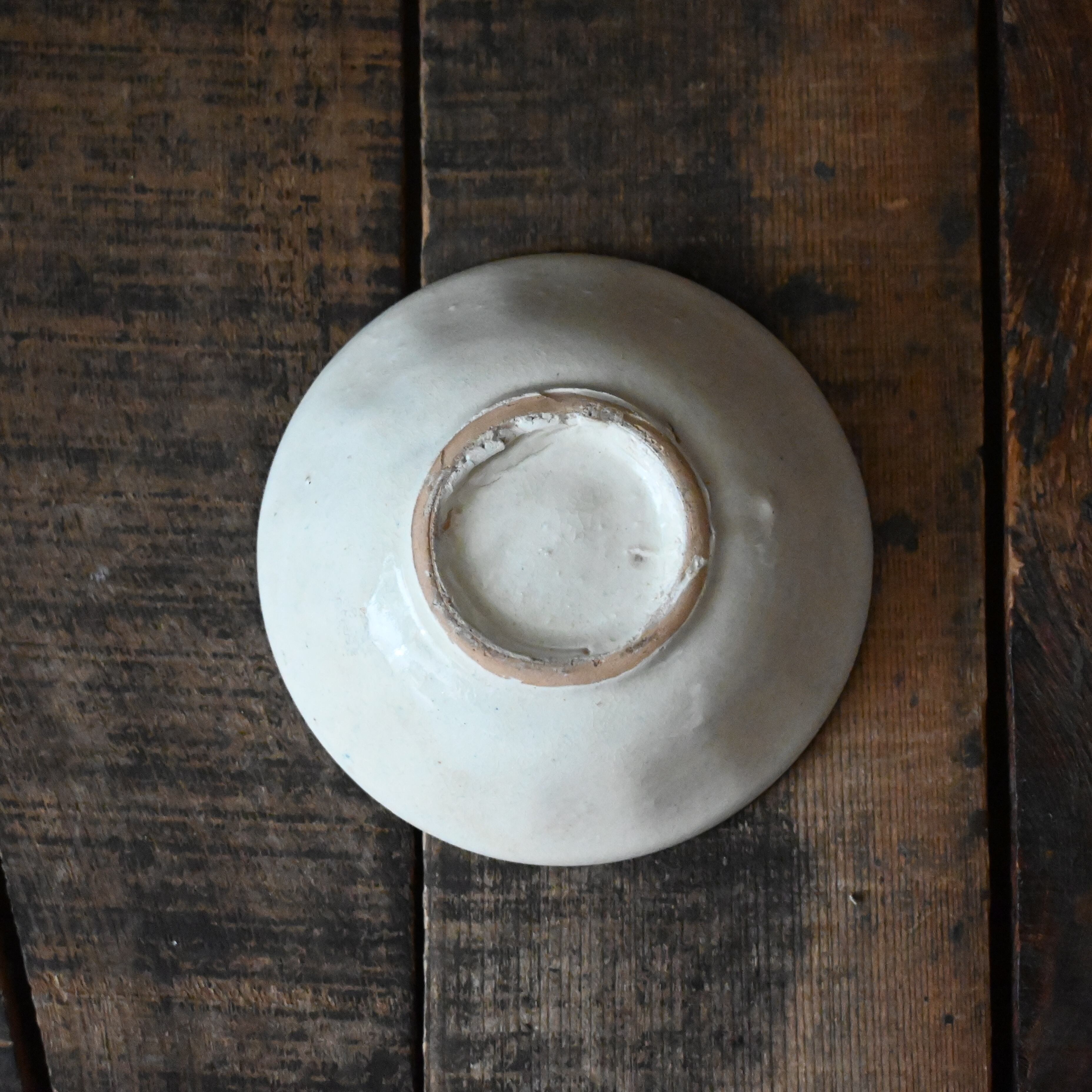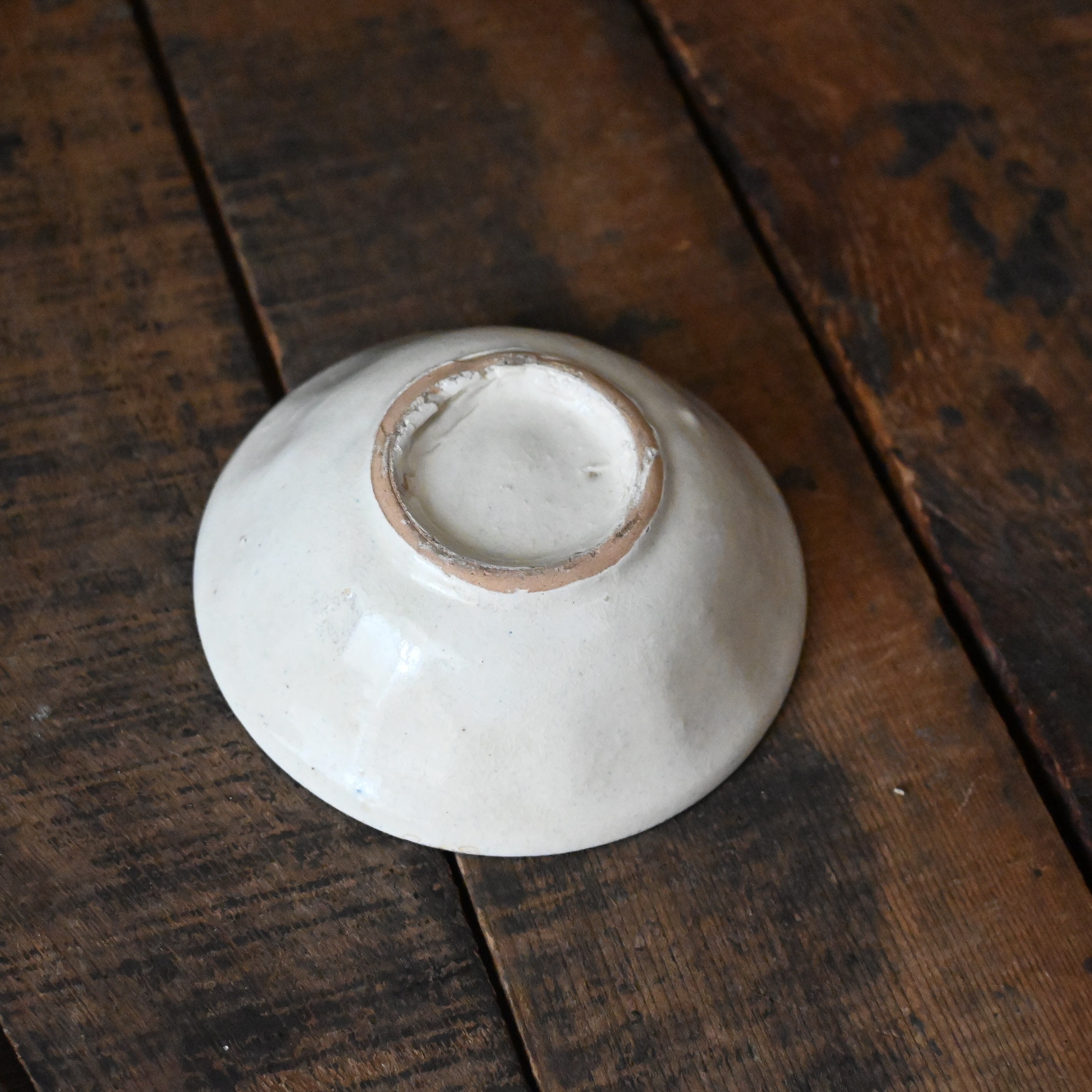 焼成時に器を重ねて焼くため、高台(底の部分)や縁に、小さな突起や釉薬の剥がれた跡が残ることがあります。これは当時の製法ならではの特徴であり、ひとつひとつ異なる個性を持つ証ともいえます。