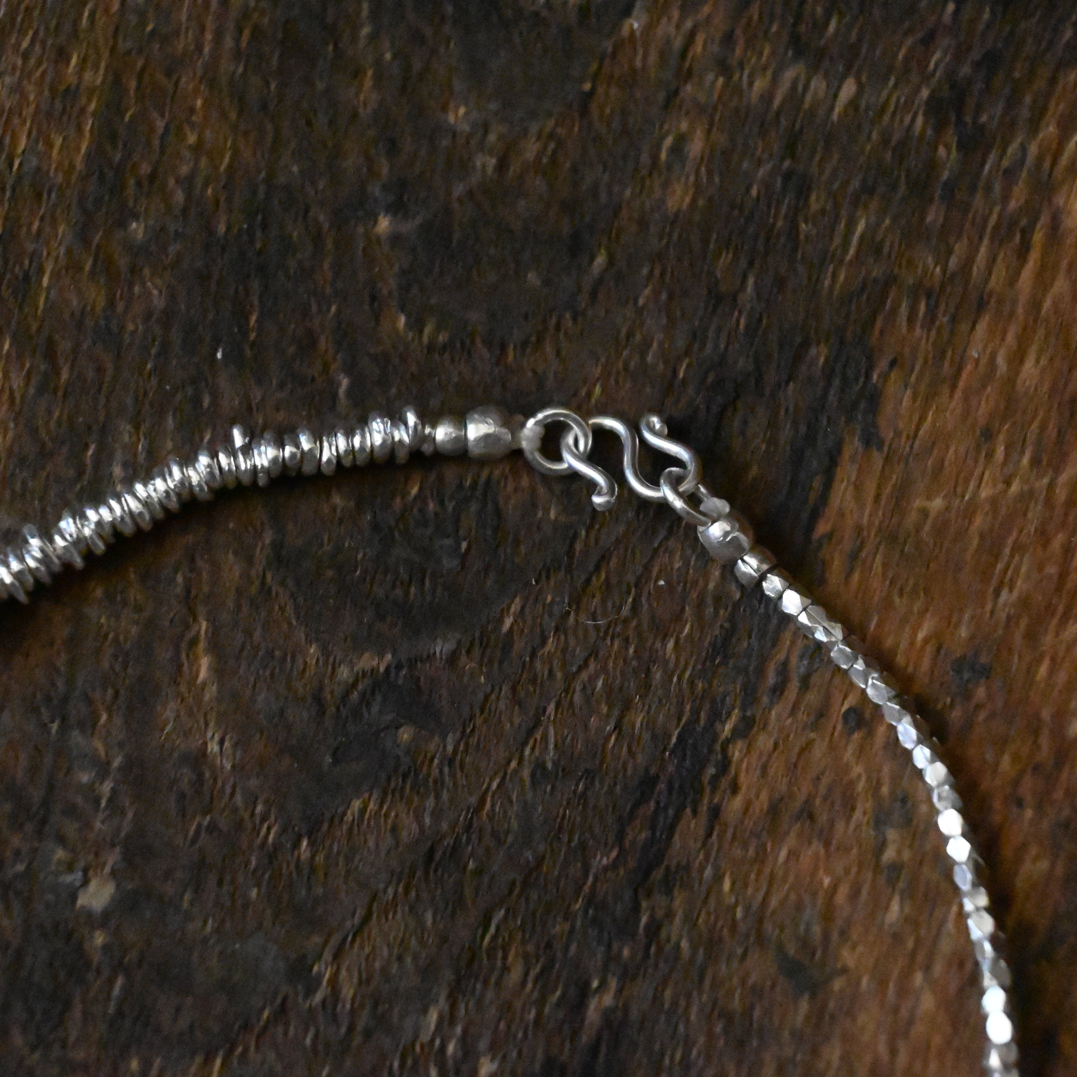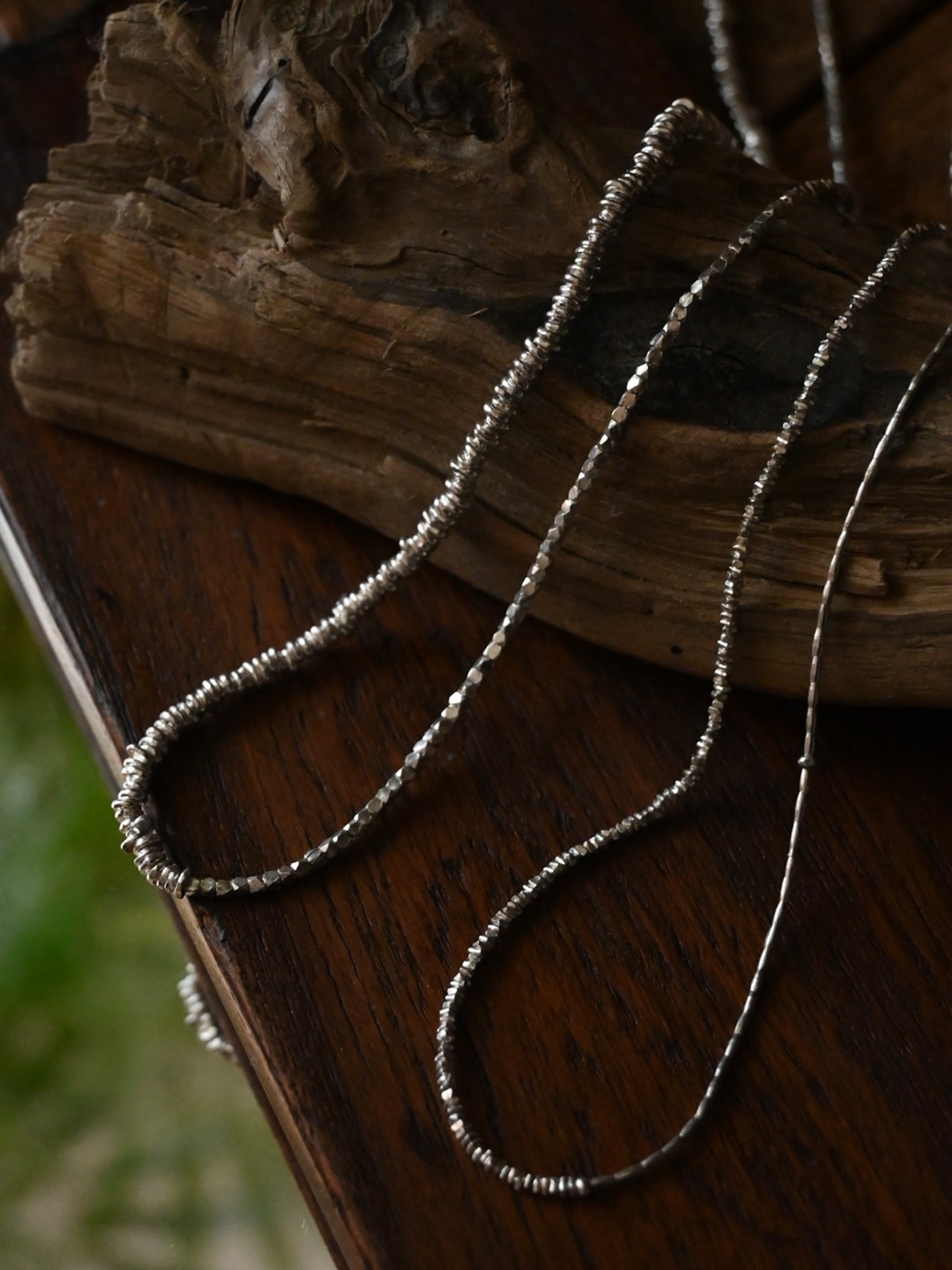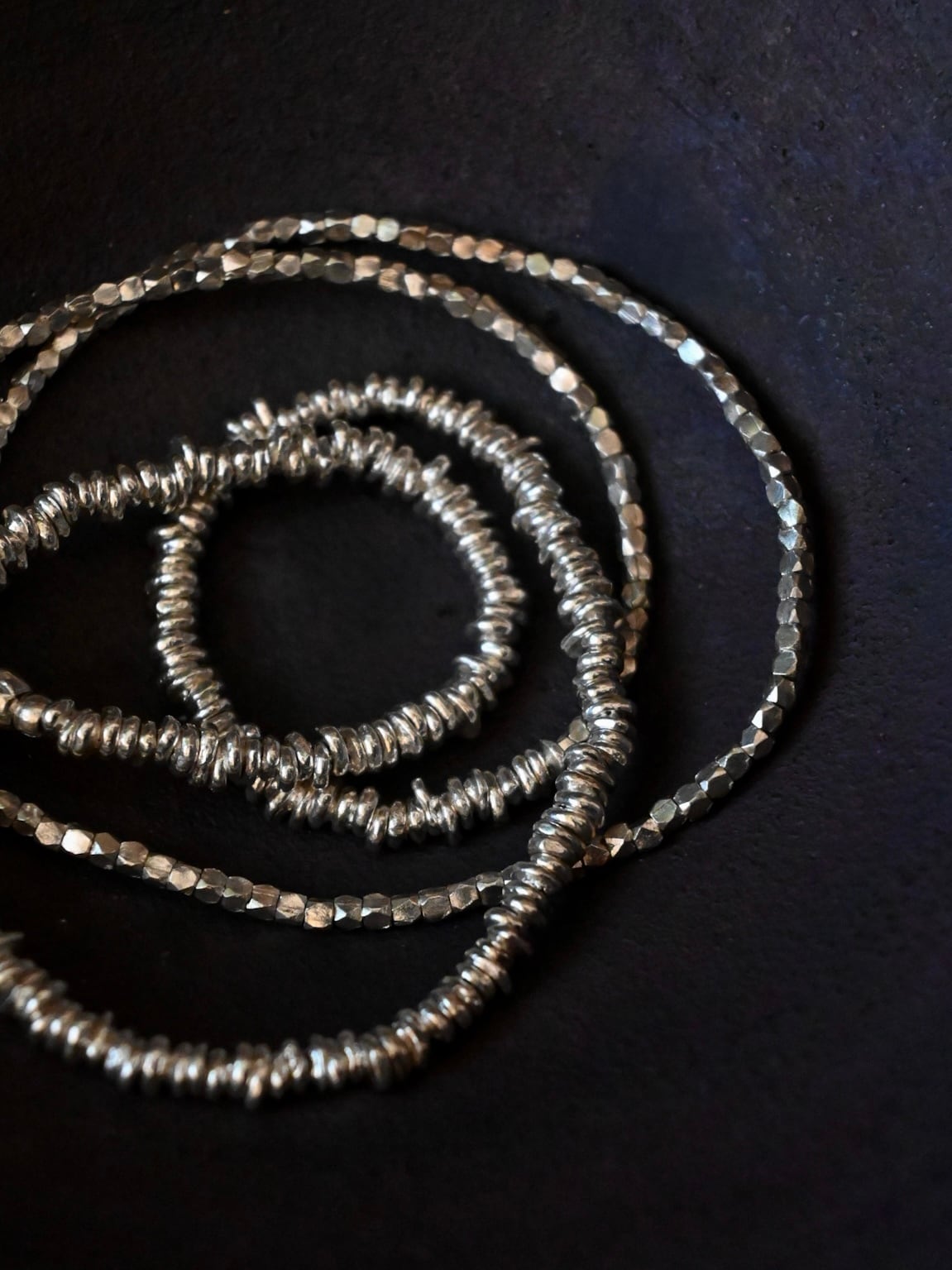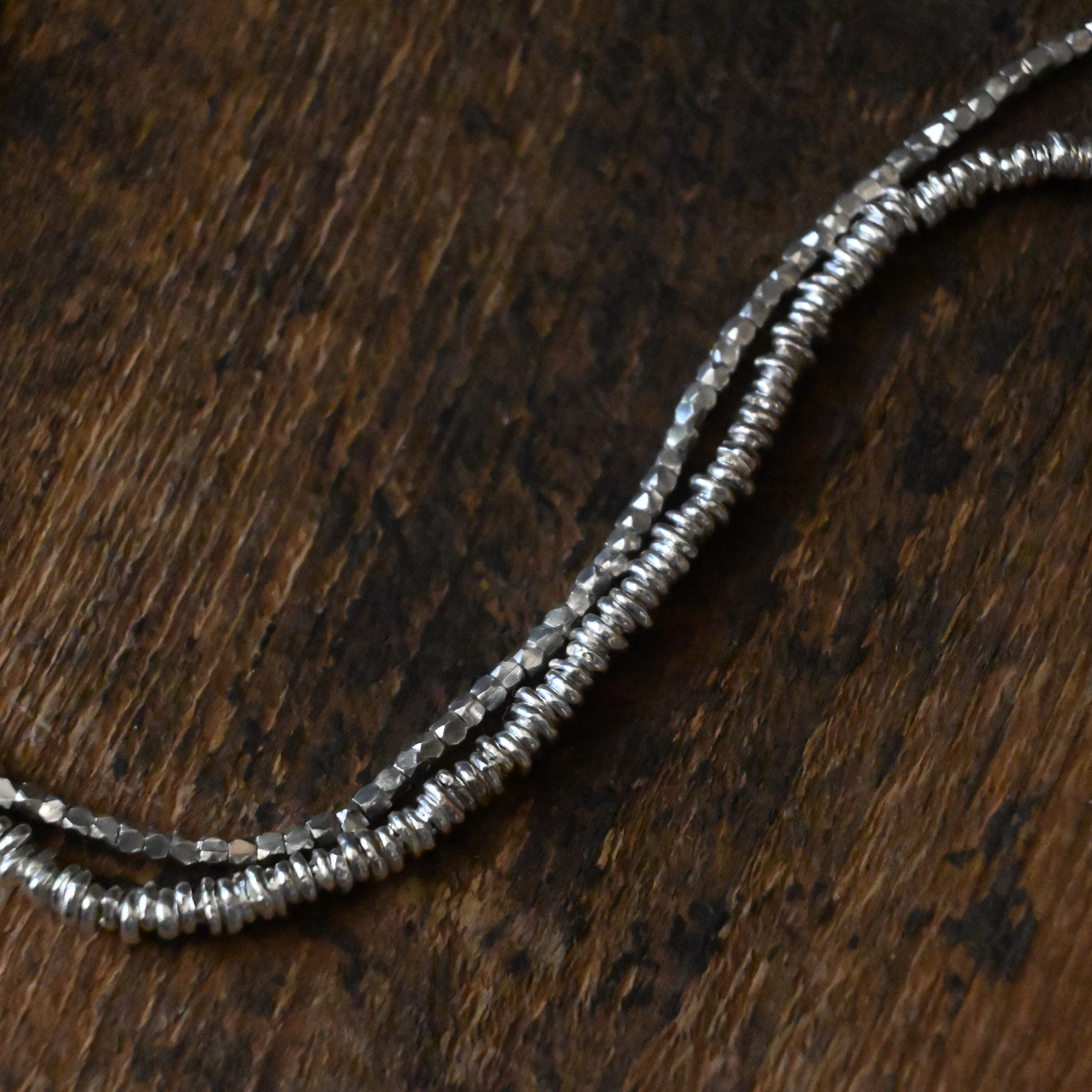 カレンシルバーのビーズアクセサリーは、ビーズから作られており、中には、数ミリにも満たない小さな銀の粒に糸やワイヤーを通す穴を開ける作業までもが手で行われるビーズも。