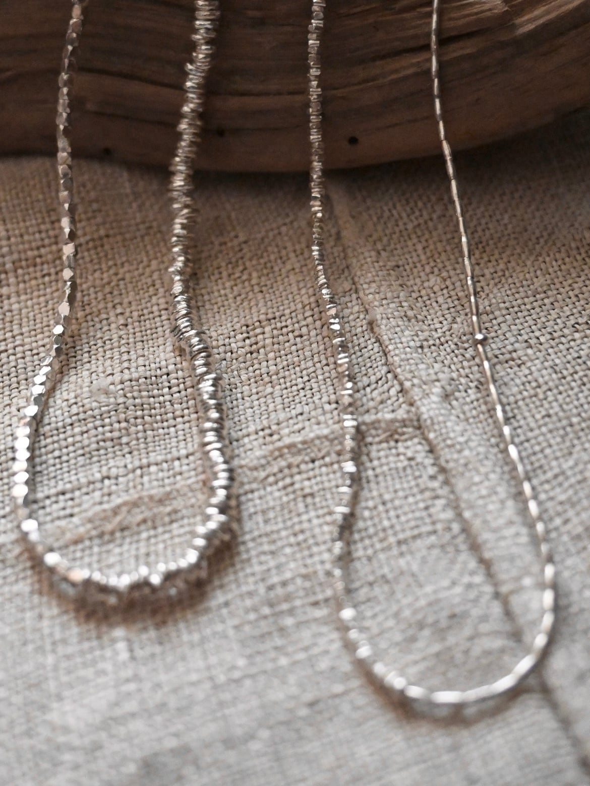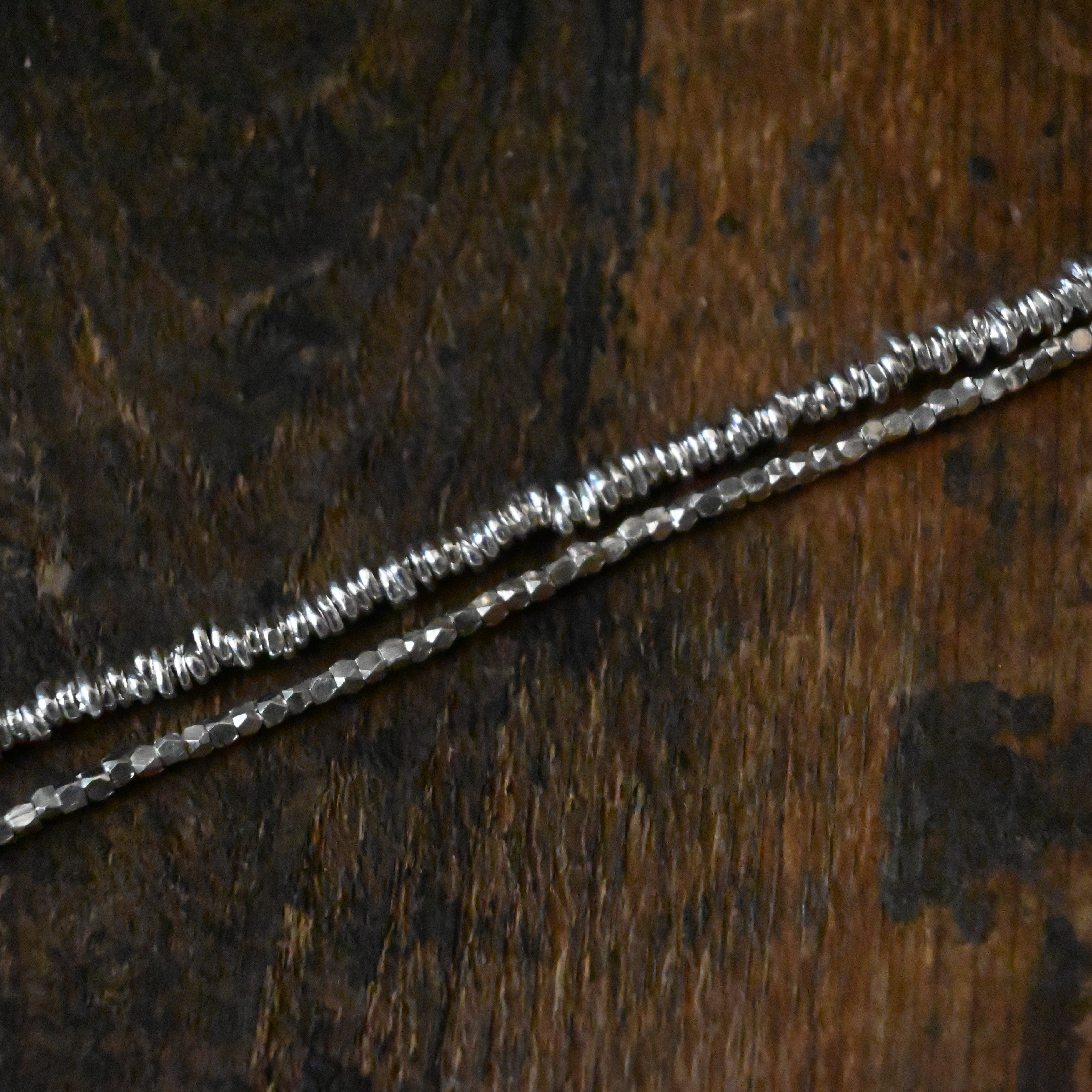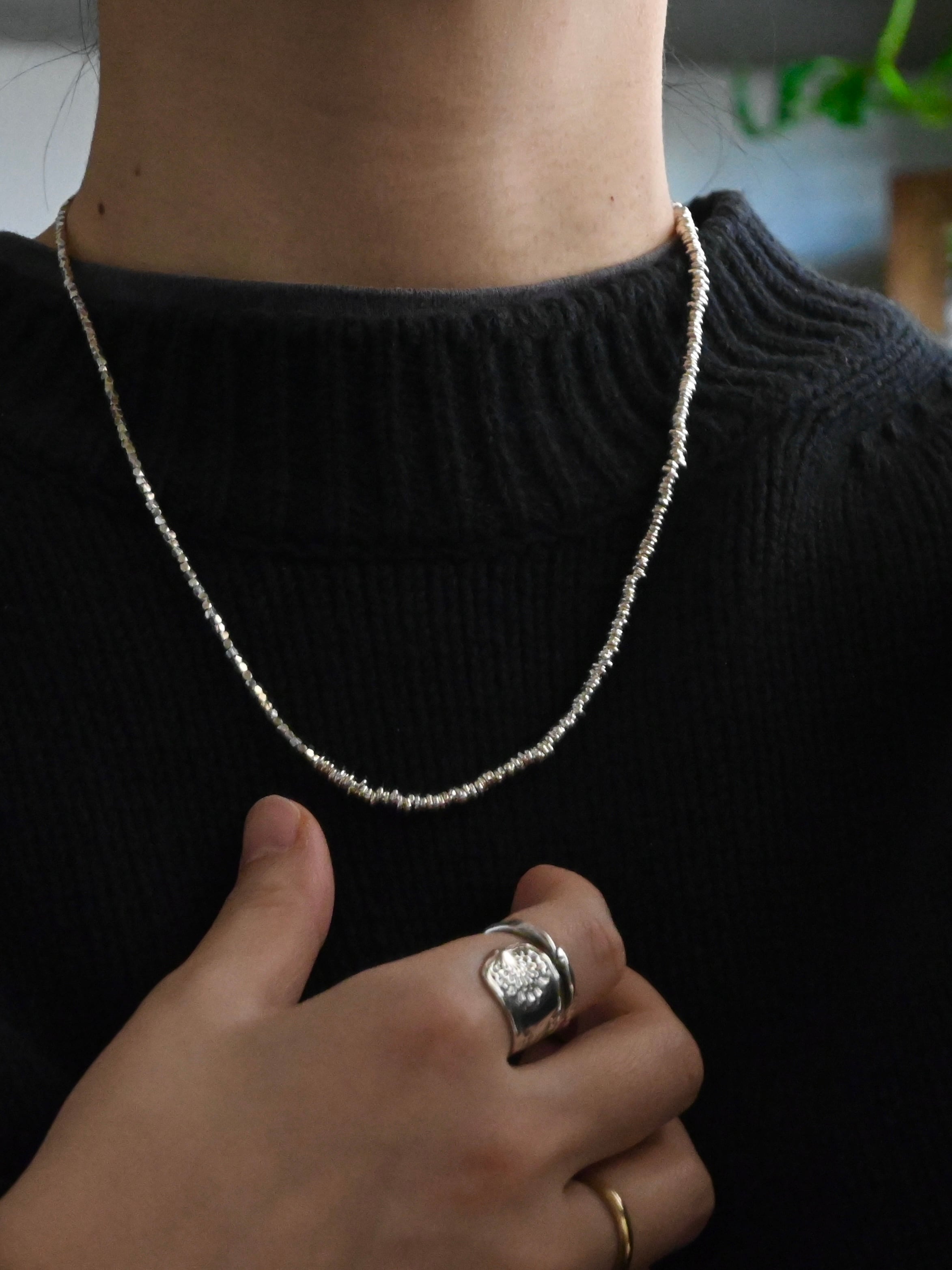 カレンシルバーのビーズアクセサリーは、ビーズから作られており、中には、数ミリにも満たない小さな銀の粒に糸やワイヤーを通す穴を開ける作業までもが手で行われるビーズも。