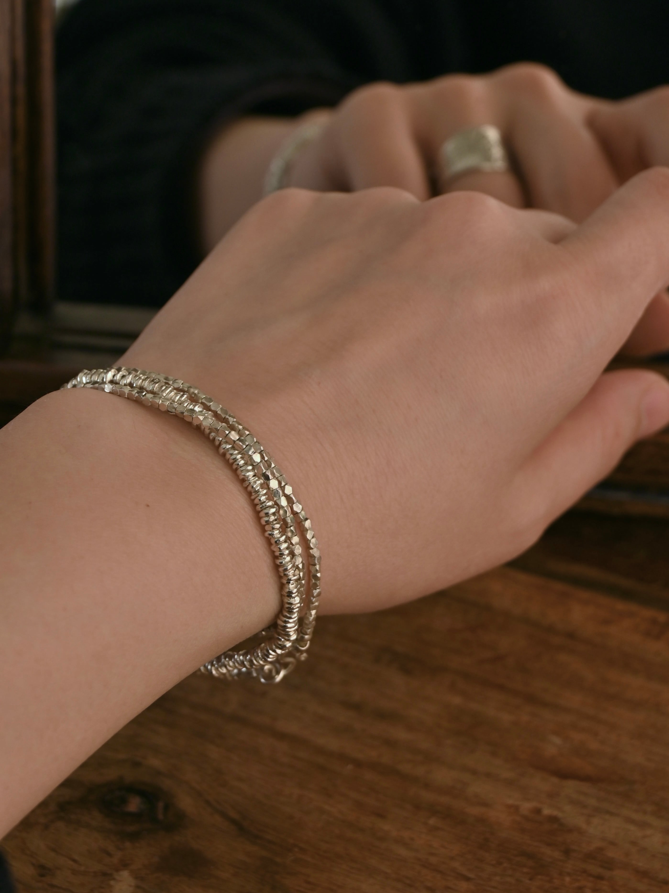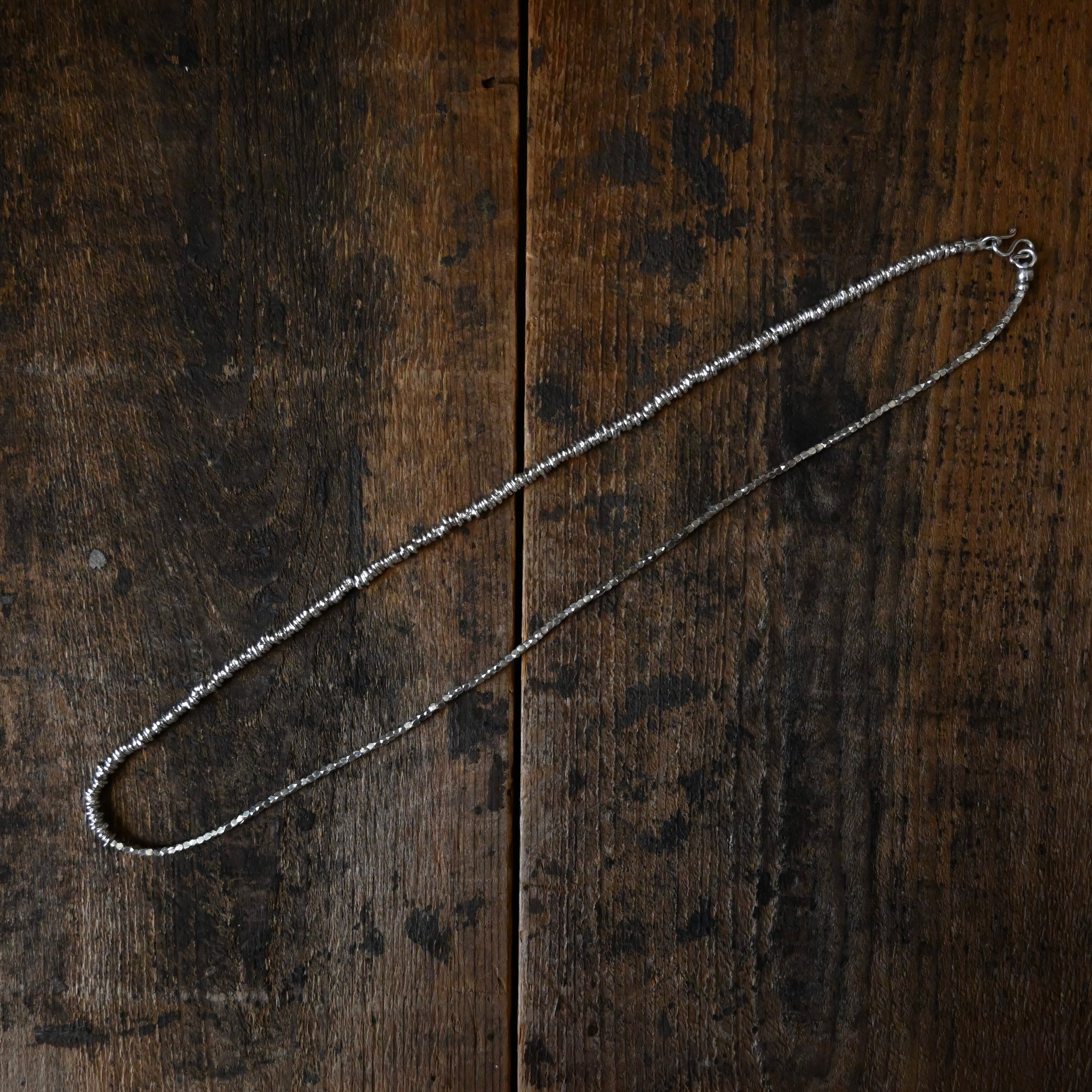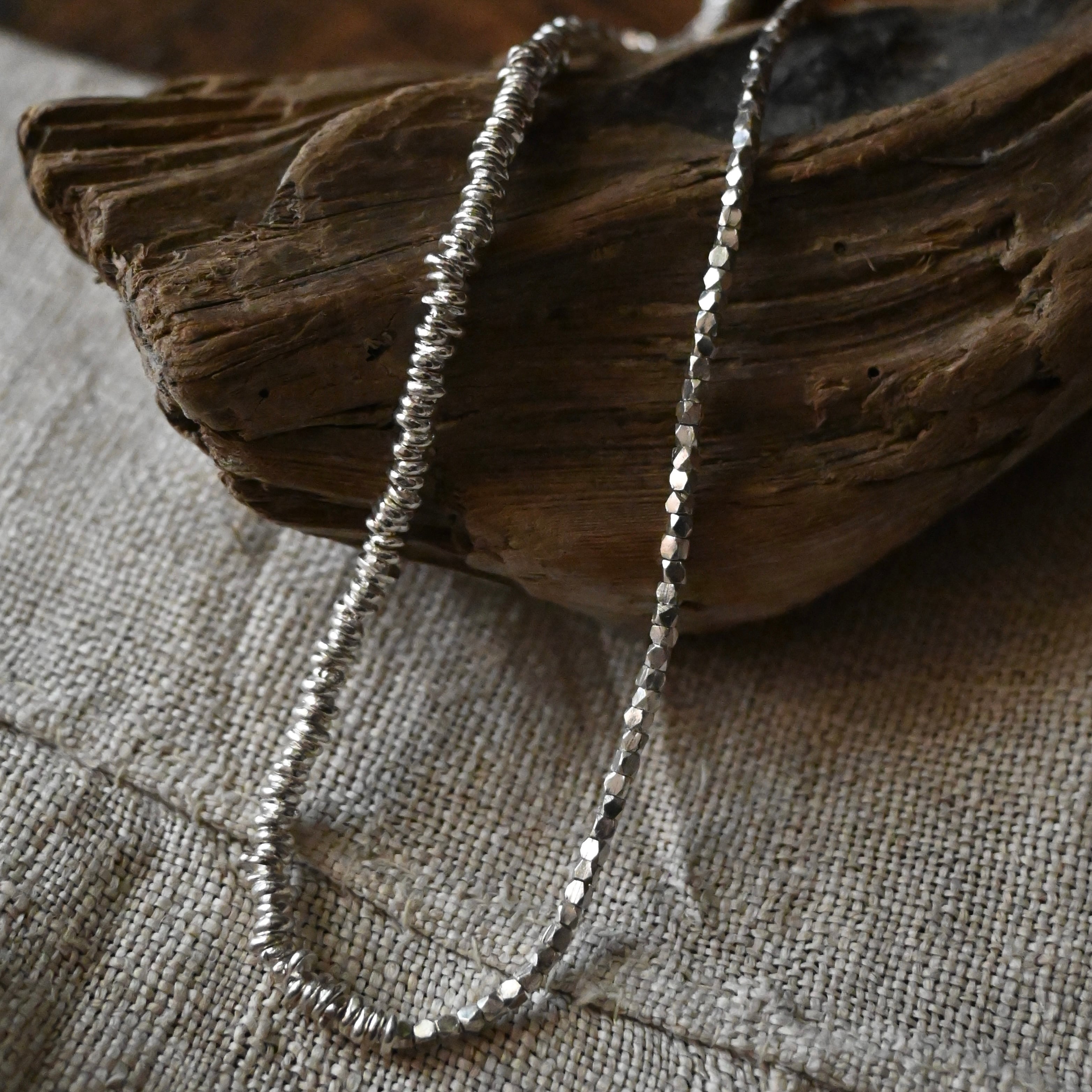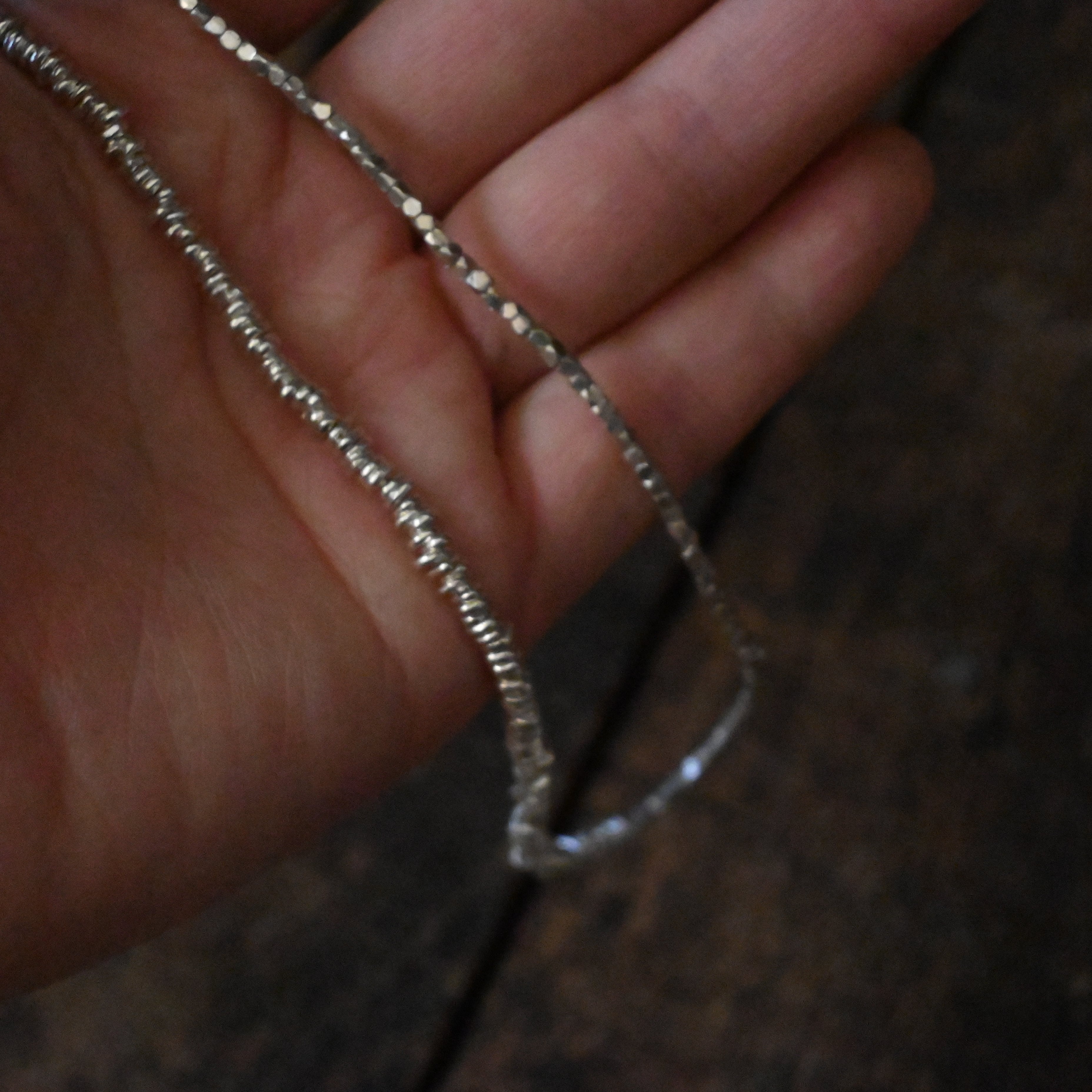 カレンシルバーのビーズアクセサリーは、ビーズから作られており、中には、数ミリにも満たない小さな銀の粒に糸やワイヤーを通す穴を開ける作業までもが手で行われるビーズも。