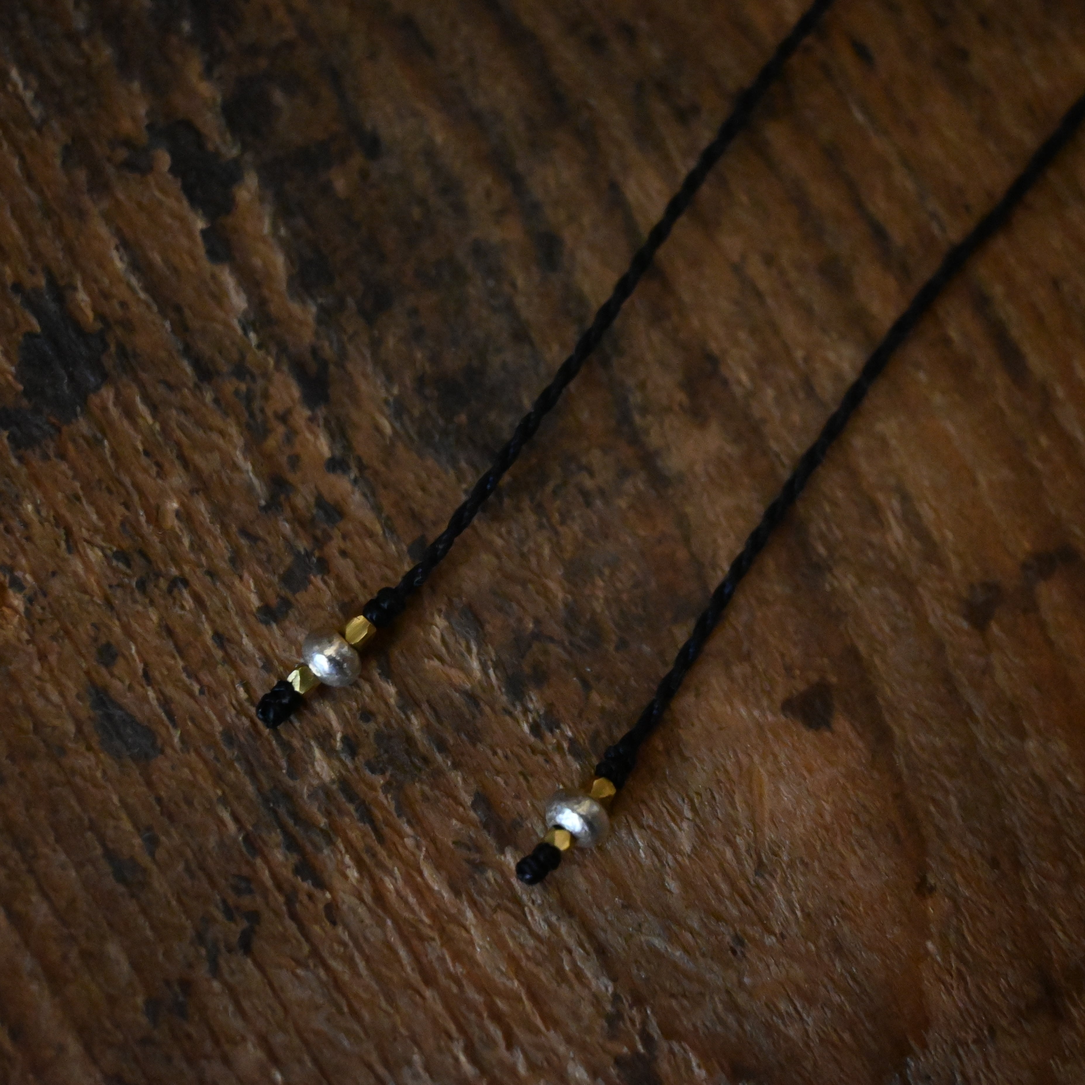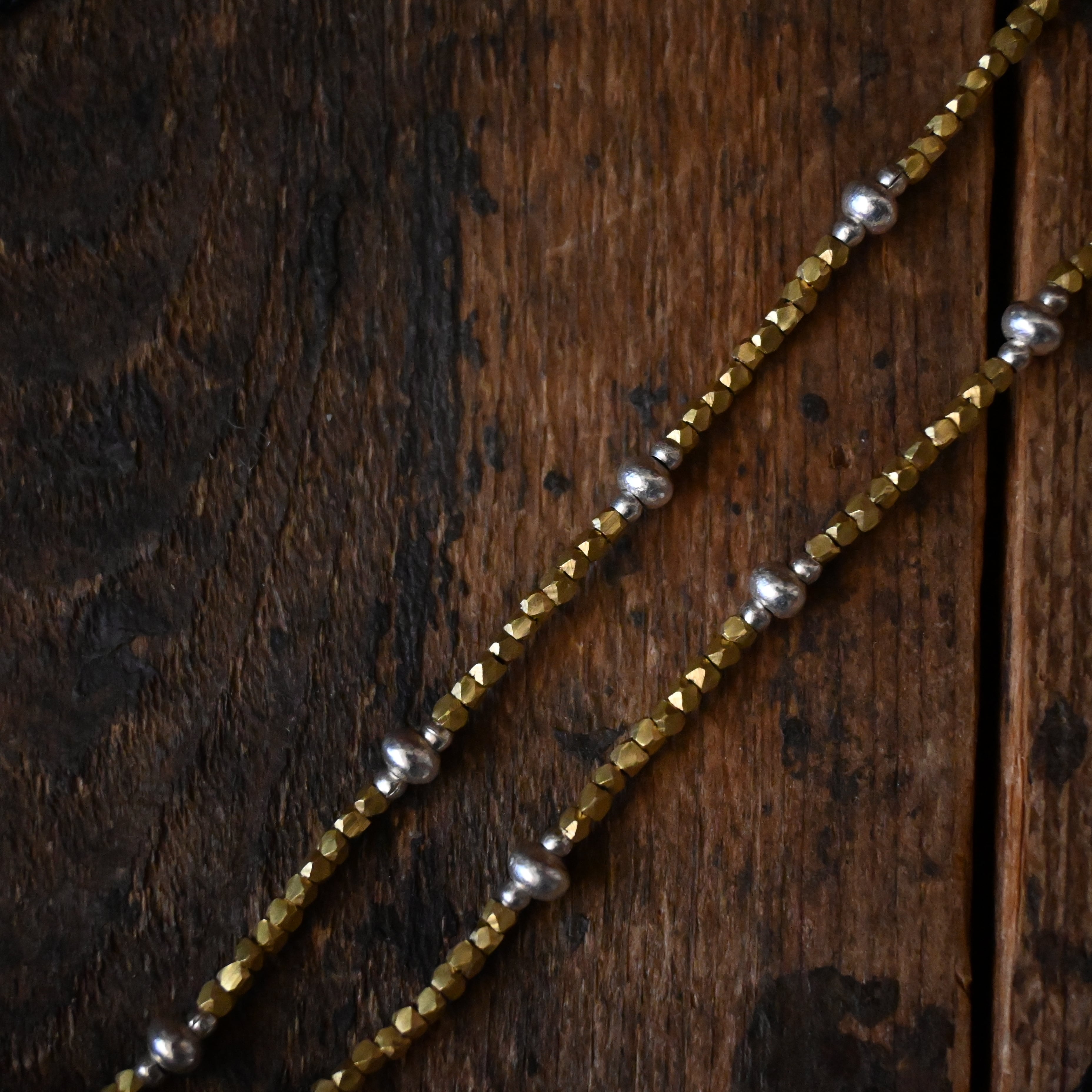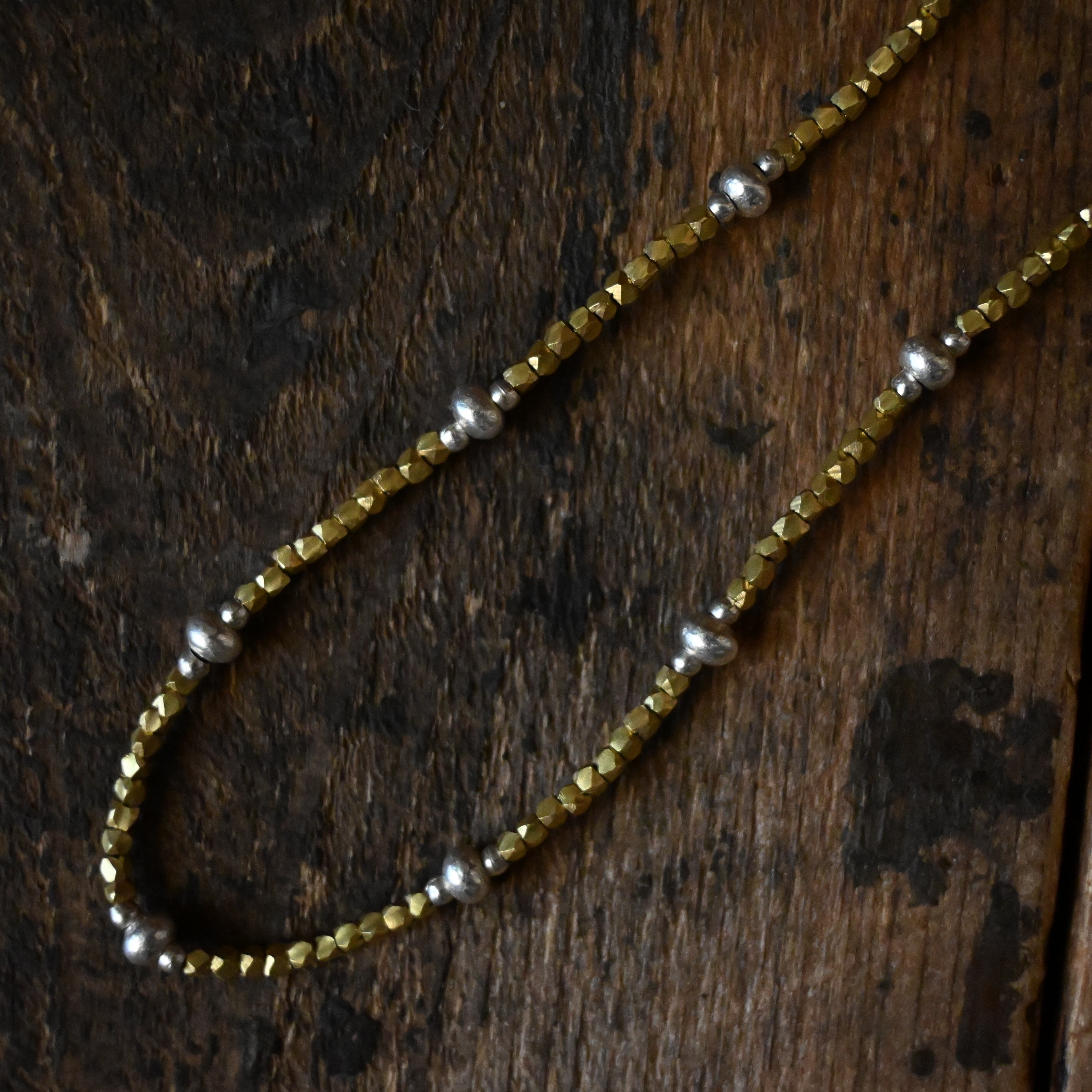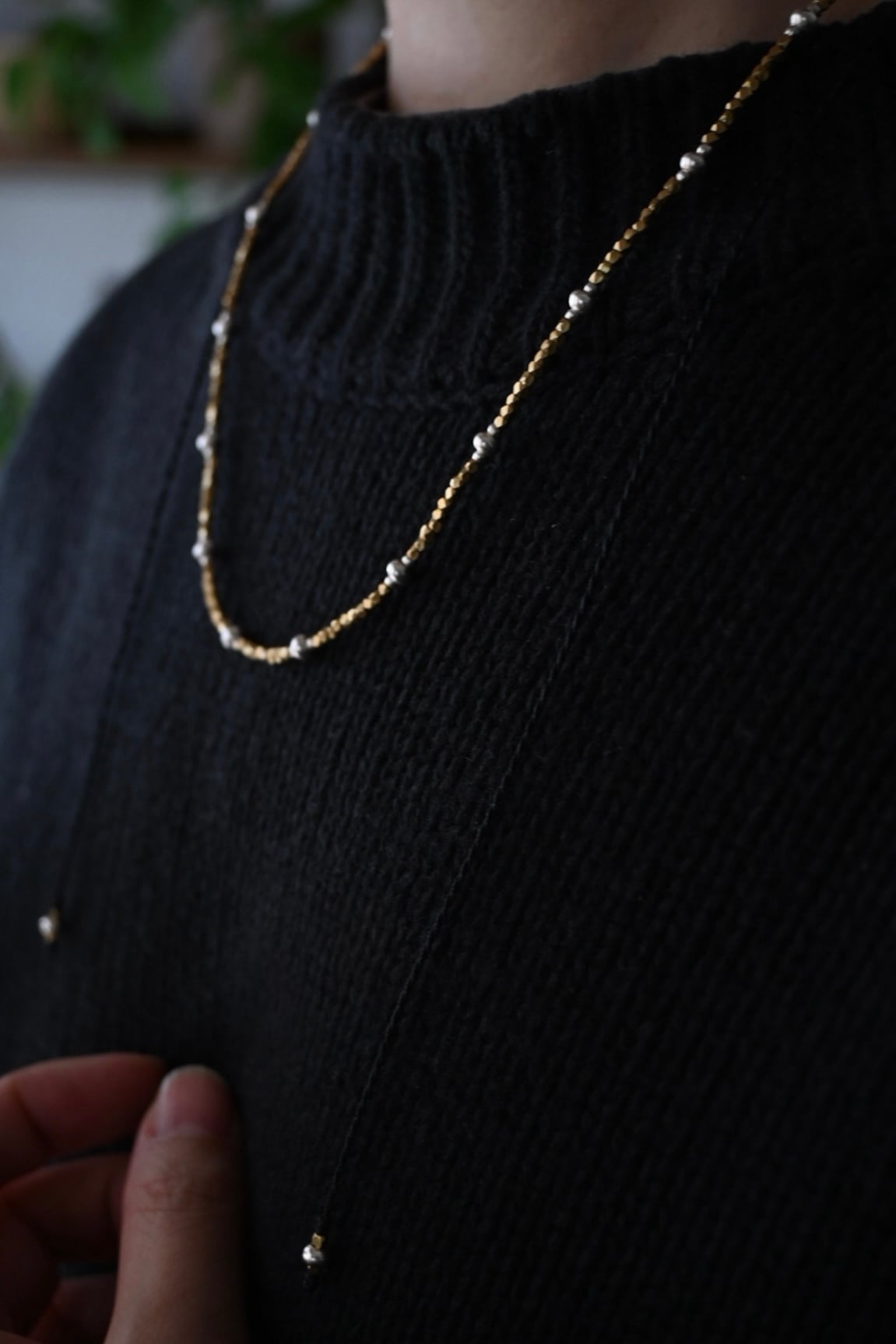 シルバーのぷっくりと丸いビーズが真鍮ビーズと組み合わせるとどこかパールのようにも見え、品よく煌めきを添えてくれます。シルバー好きさんにもおすすめの一品です。