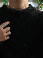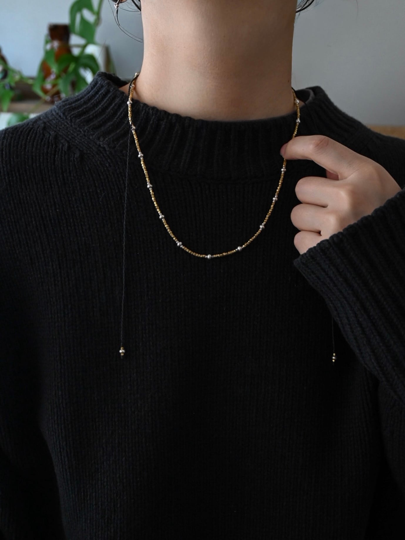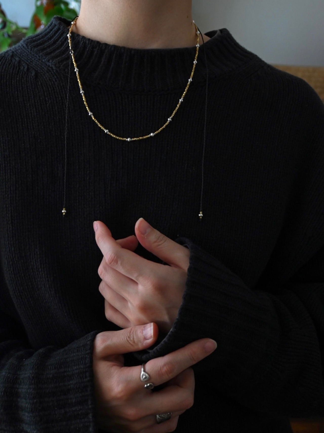 ネックレスの後ろ側についているワックスコードの結び目を指で軽く挟み、コードを片方ずつ”ゆっくり”とスライドさせて長さを調節ください。
