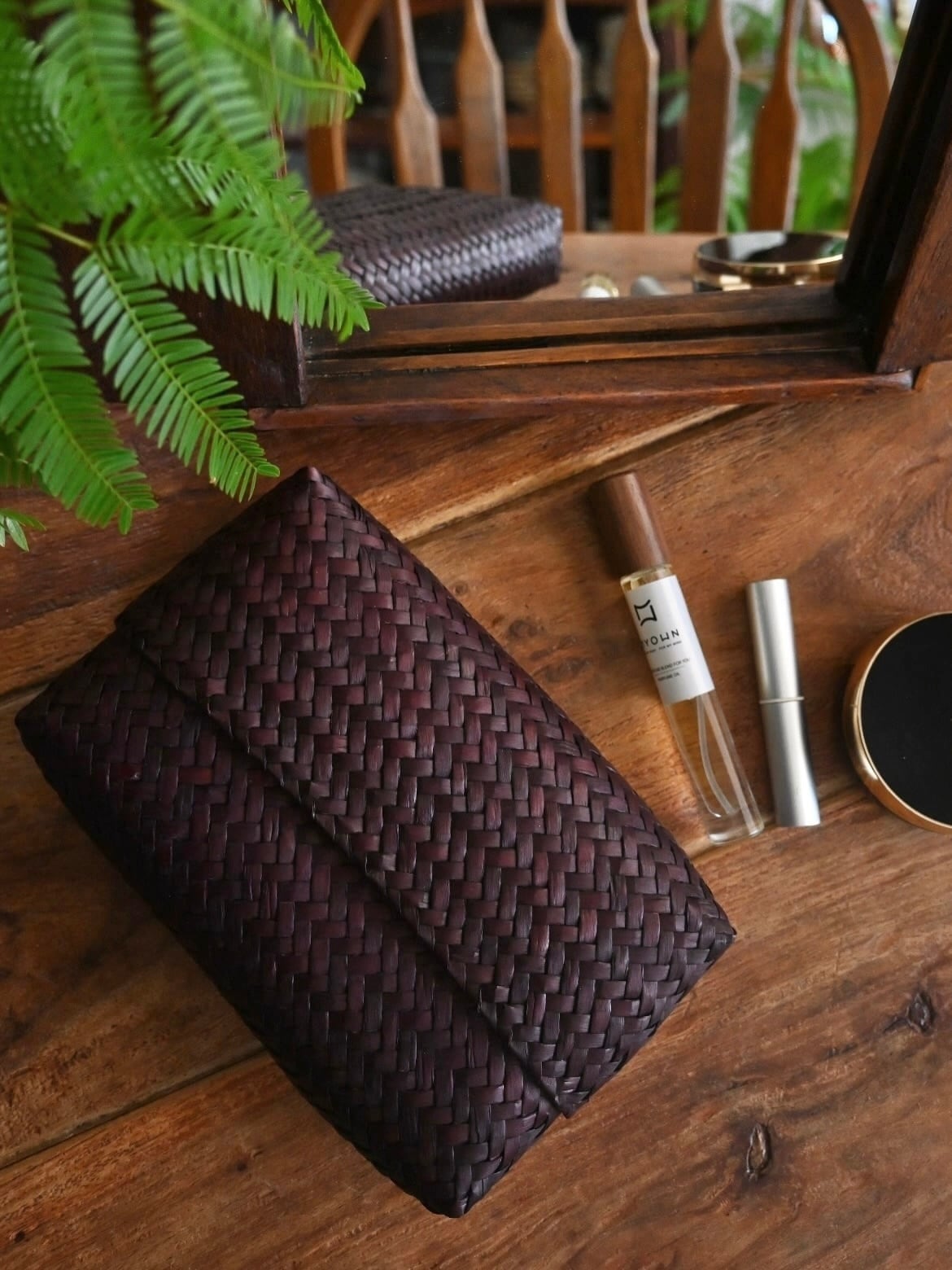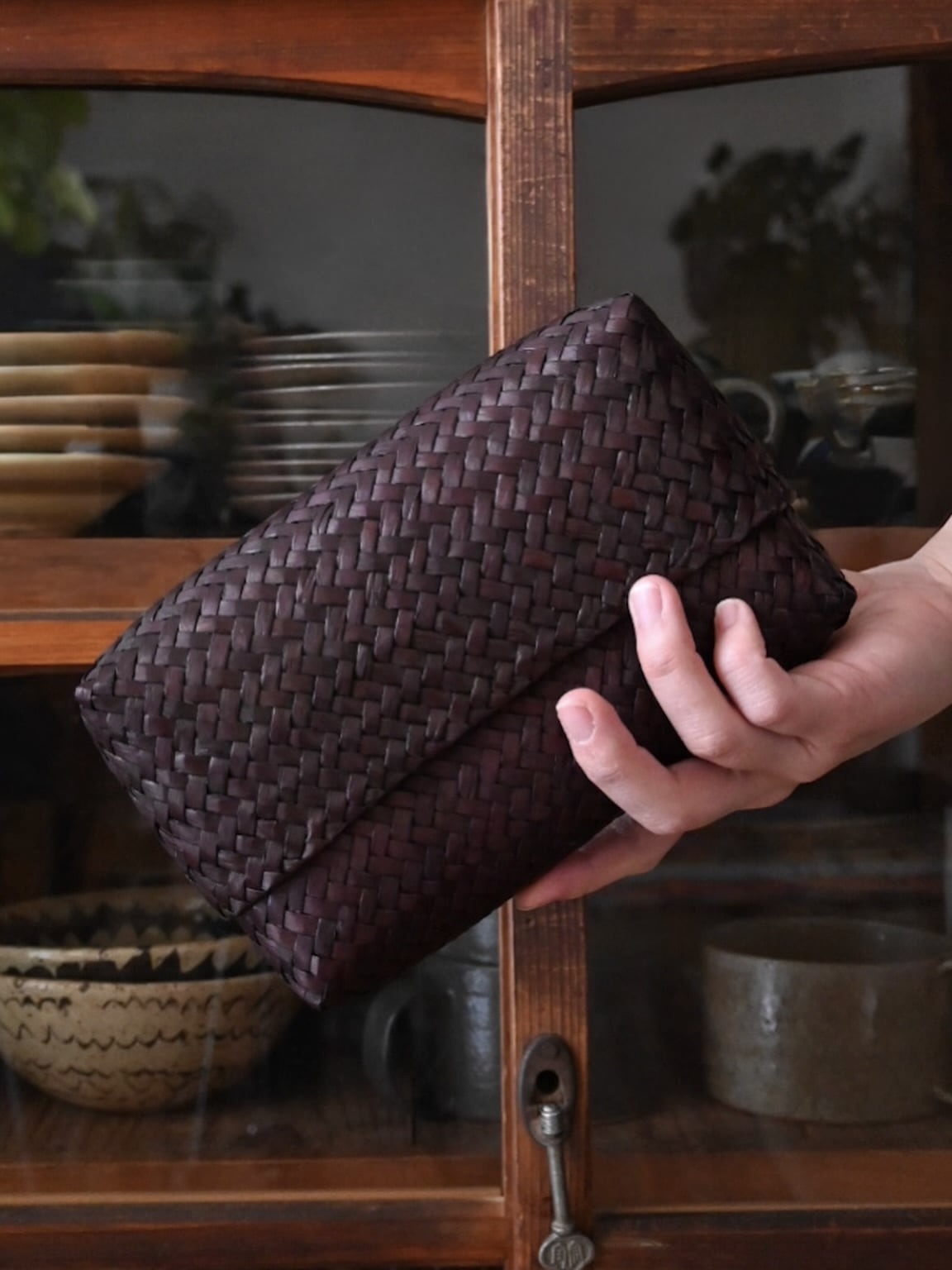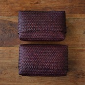 タイ南部で天然素材の水草を編んで作られたオリジナルの横長ポーチに新色バーガンディが仲間入りしました。