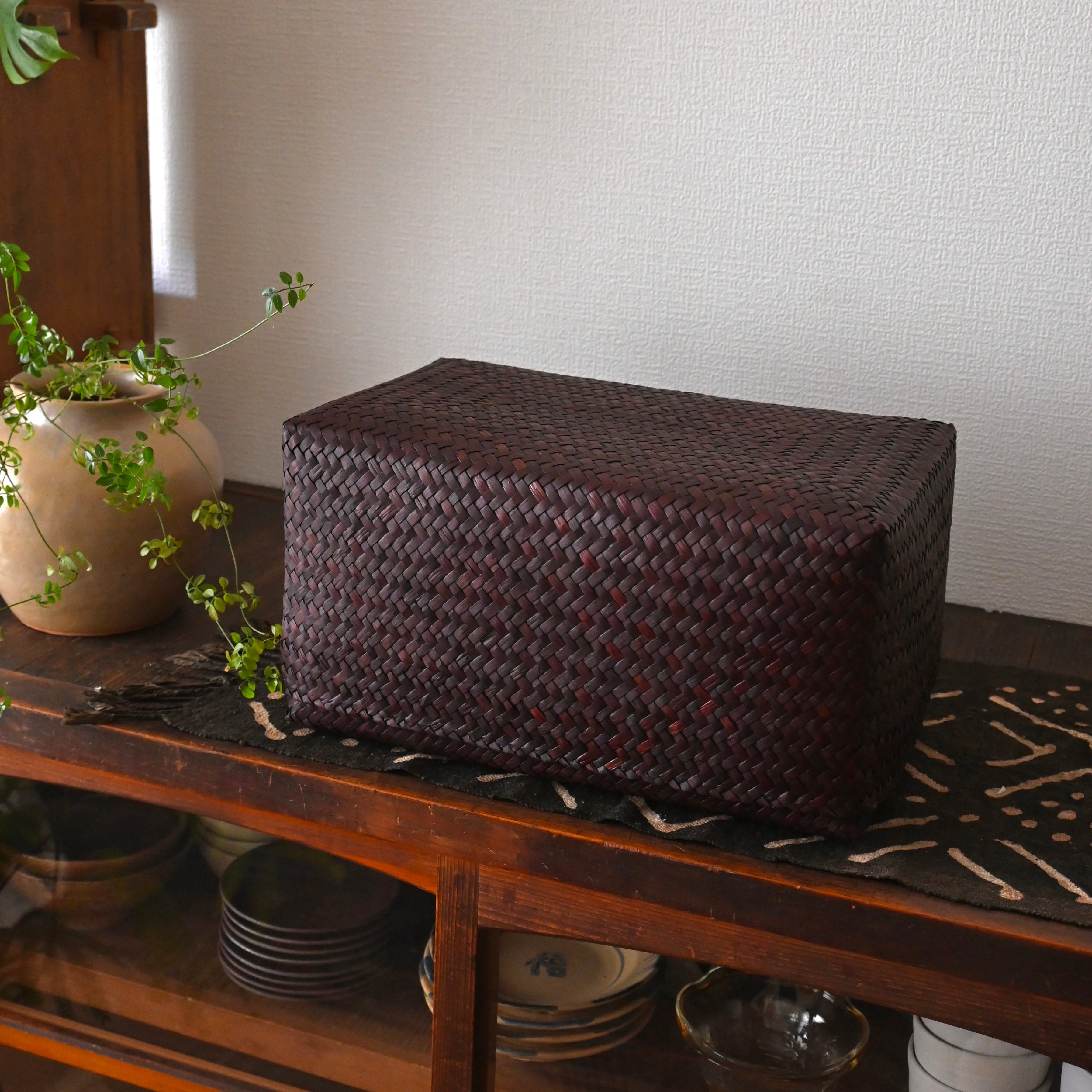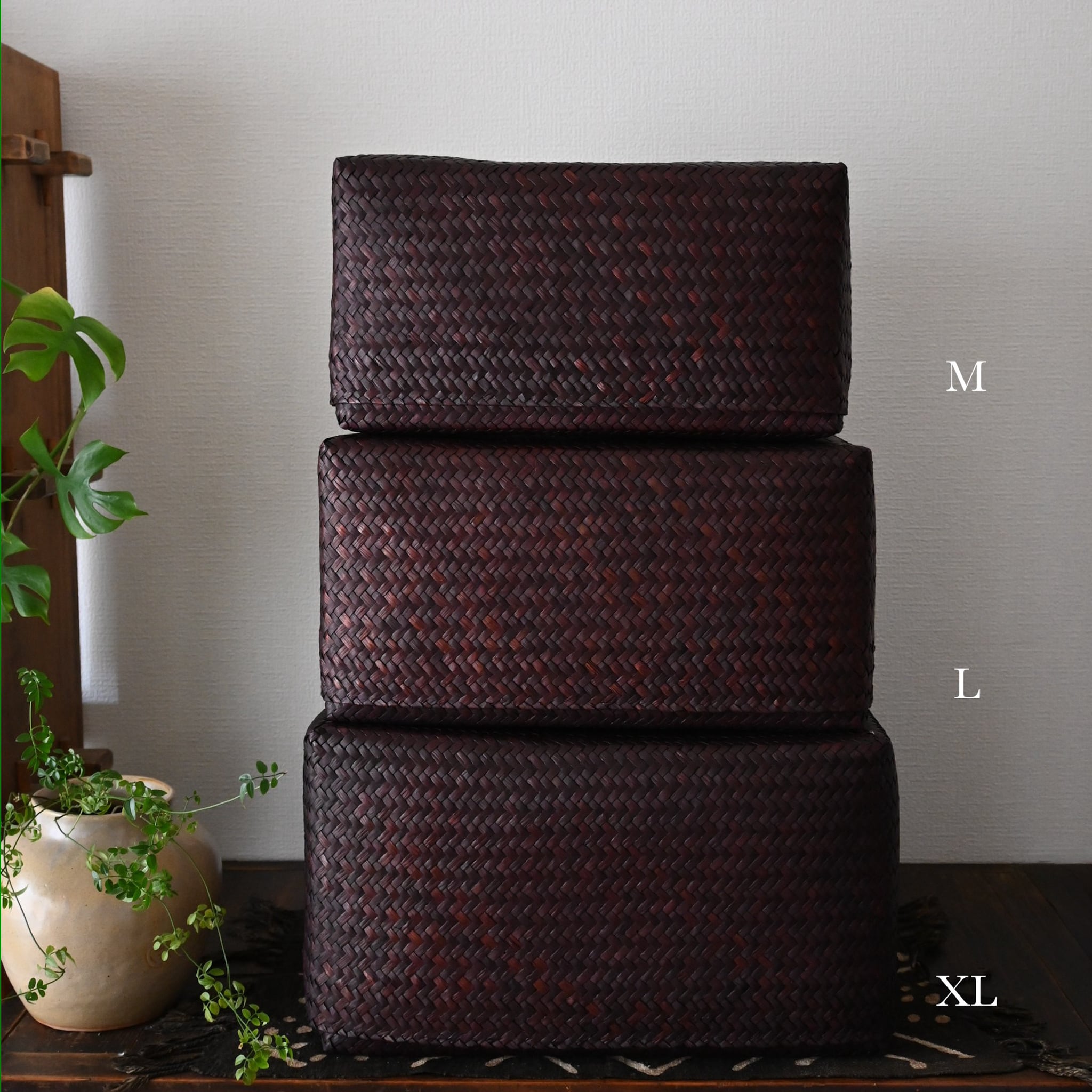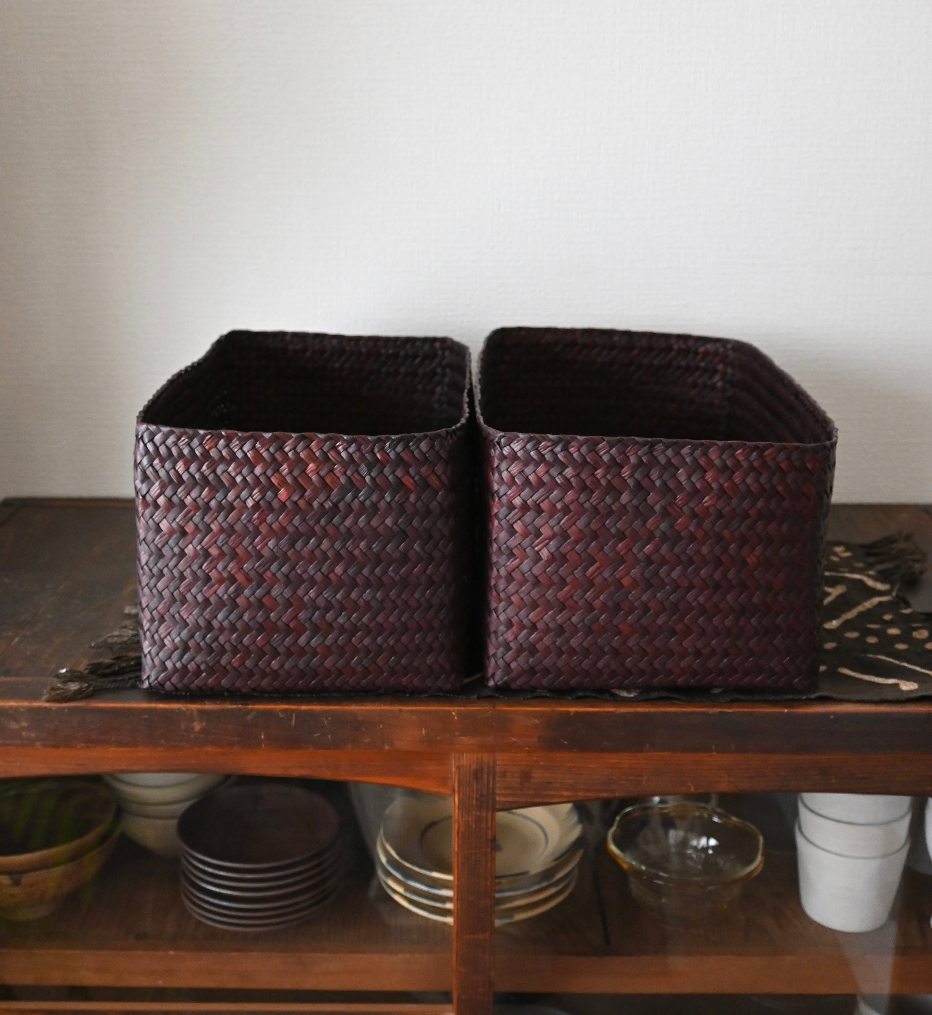 水草で作られるバスケットたちは、作られて間もないものは水分を多く含み、やや緑がかった色合い。そこから使っていくうちに水分が抜けると色が明るく黄味がかった色に変化し、しなやかさが増します。日々変化する風合いをお楽しみください。