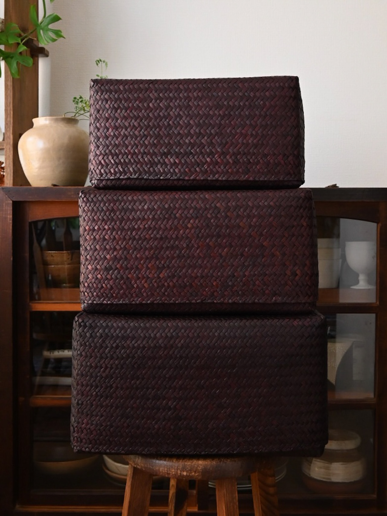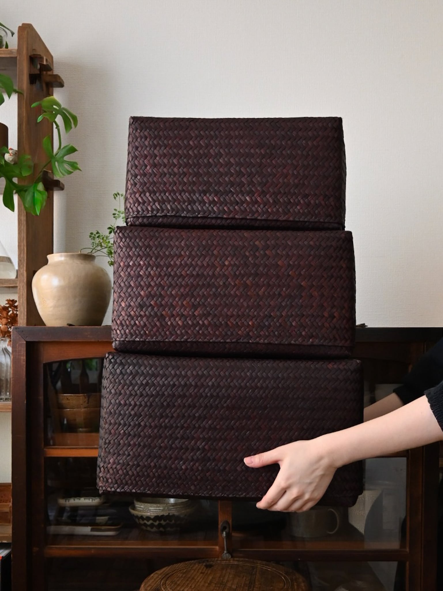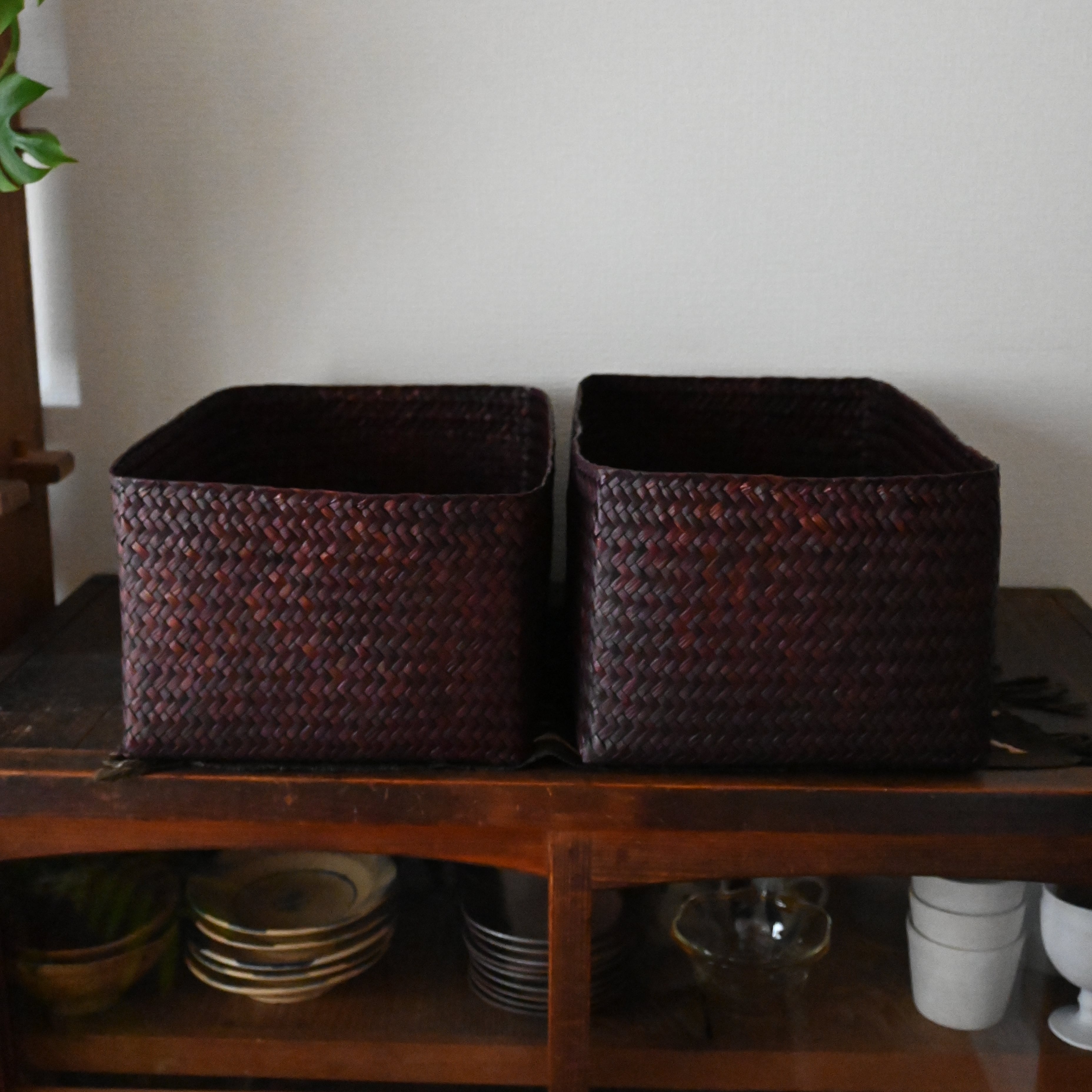 水草で作られるバスケットたちは、作られて間もないものは水分を多く含み、やや緑がかった色合い。そこから使っていくうちに水分が抜けると色が明るく黄味がかった色に変化し、しなやかさが増します。日々変化する風合いをお楽しみください。