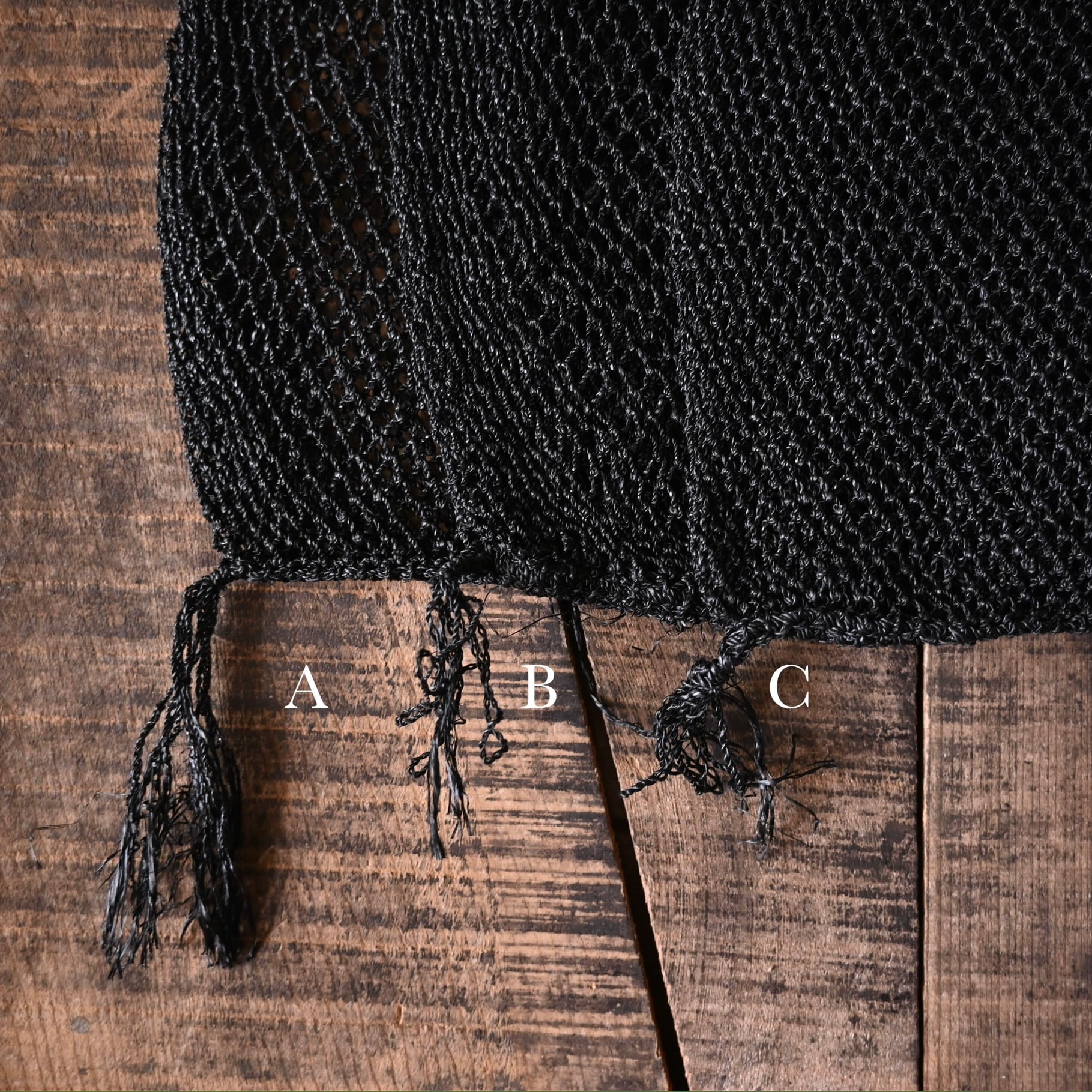 編み目は一目ずつ結ばれていますが、ほつれや切れが気になる場合は、天然繊維の糸で結び直してお使い下さい。