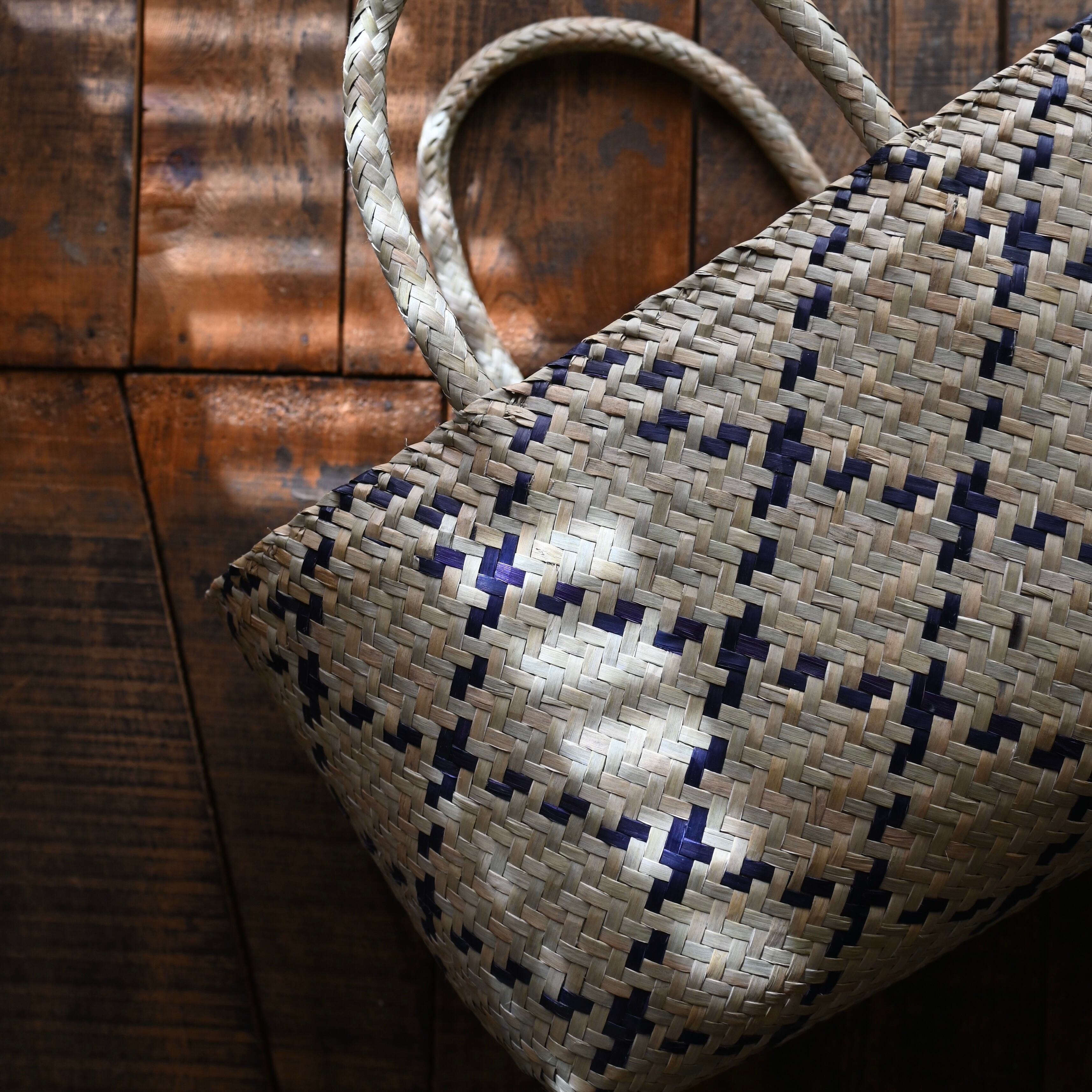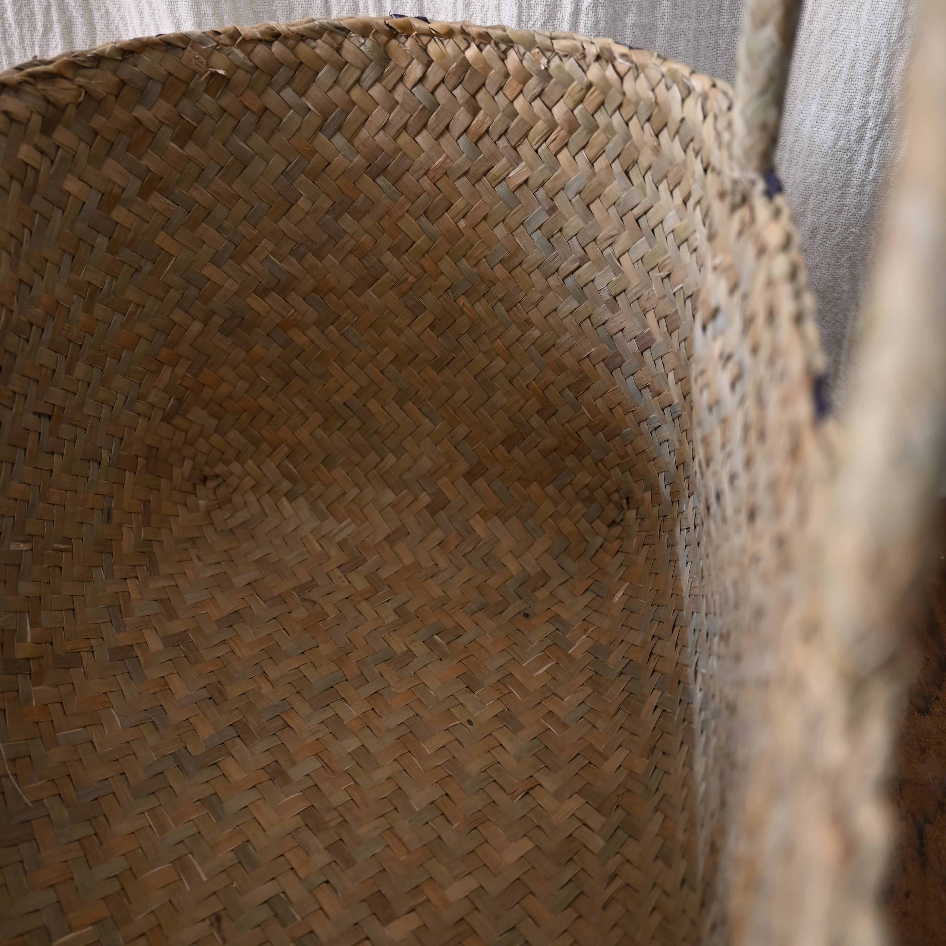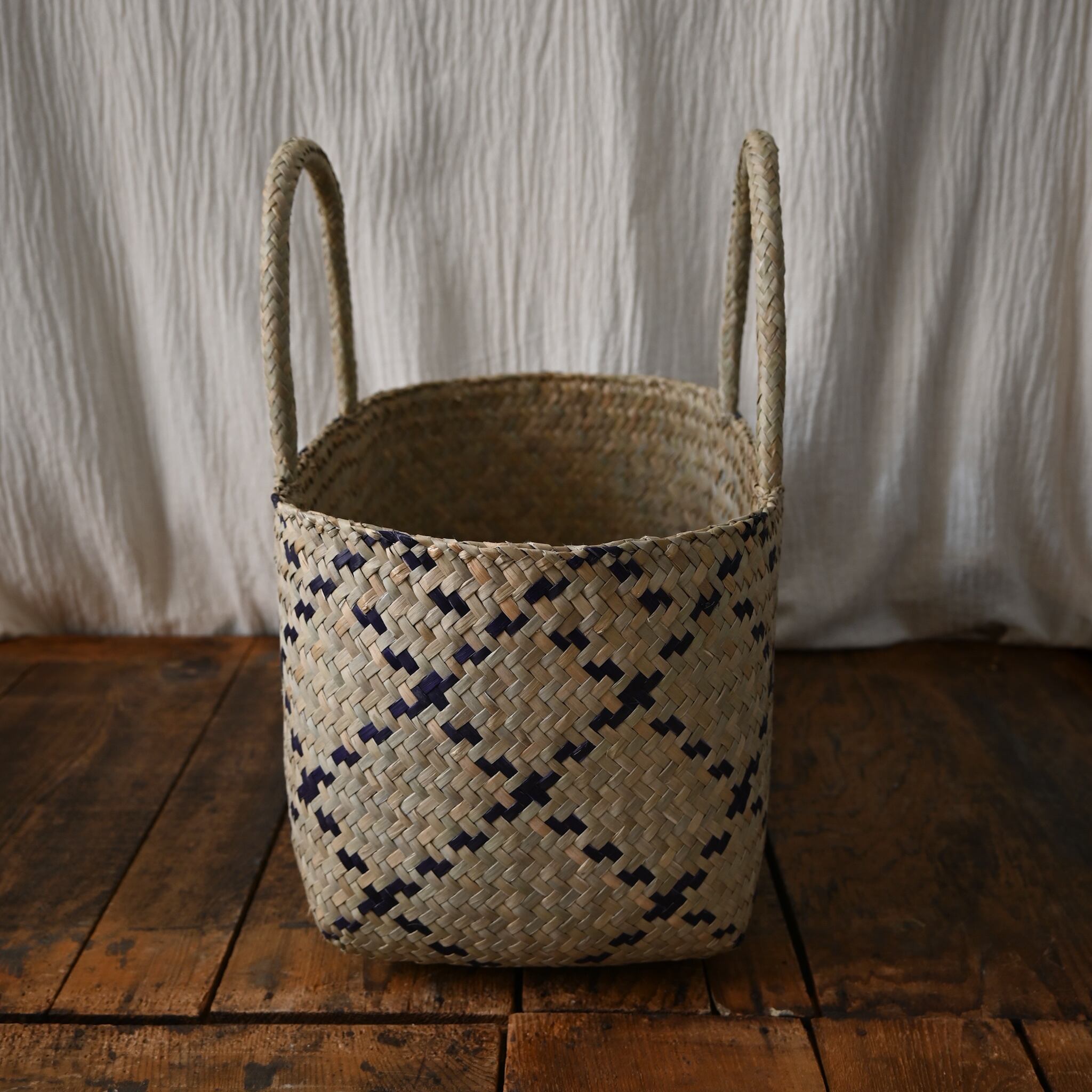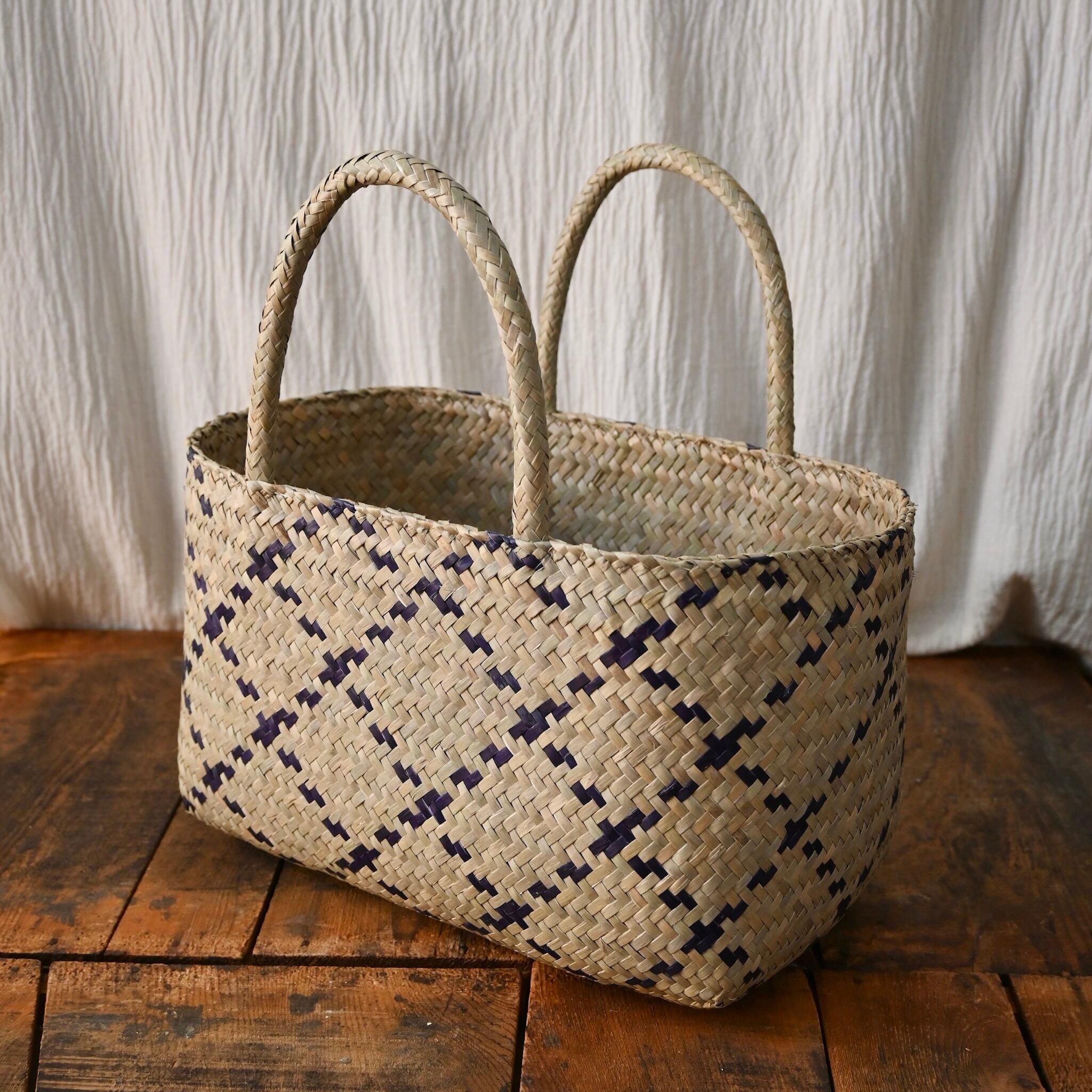 水草で作られるバスケットたちは、作られて間もないものは水分を多く含み、やや緑がかった色合い。そこから使っていくうちに水分が抜けると画像のように色が明るく黄味がかった色に変化し、しなやかさが増します。日々変化する風合いをお楽しみください。