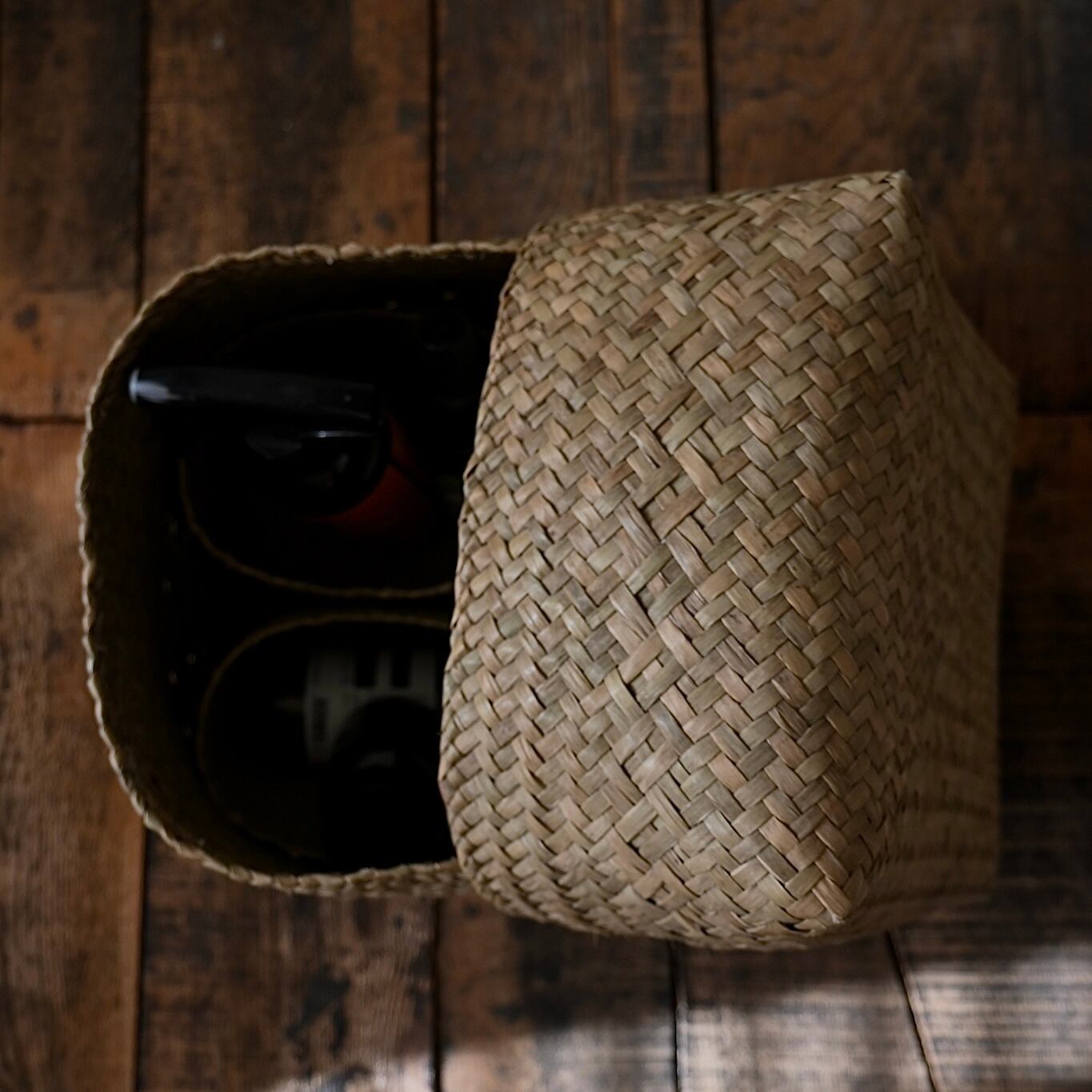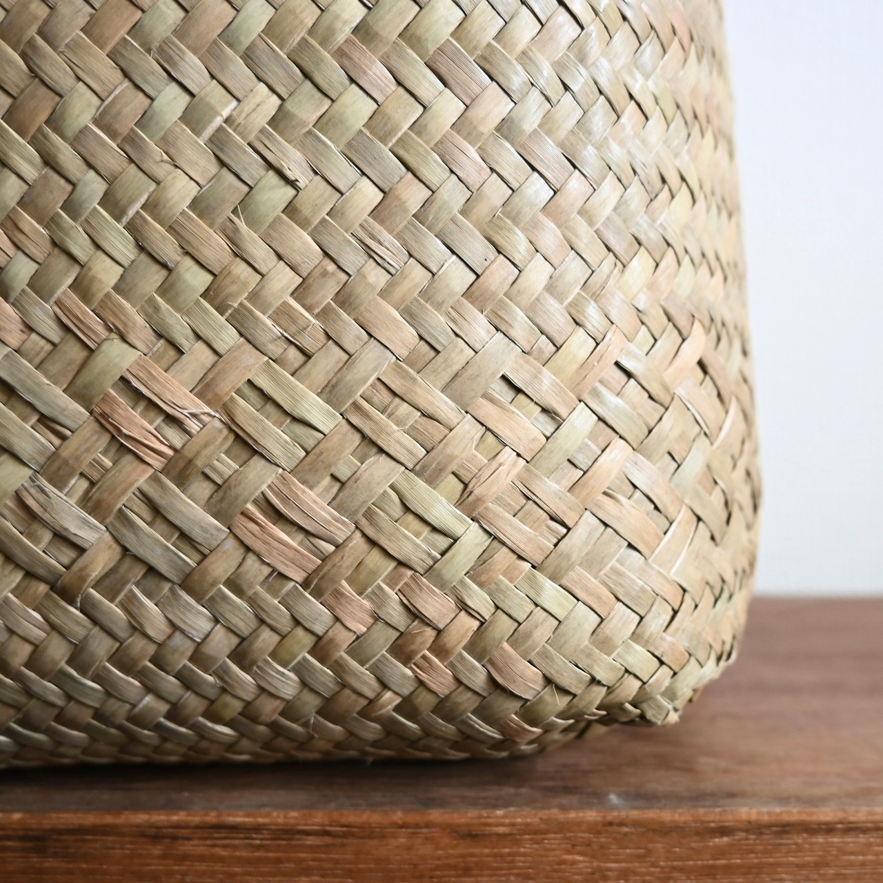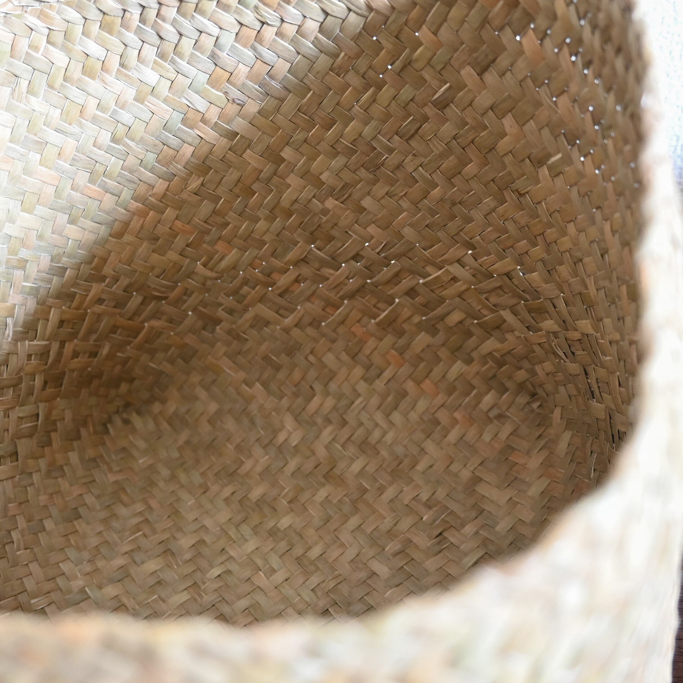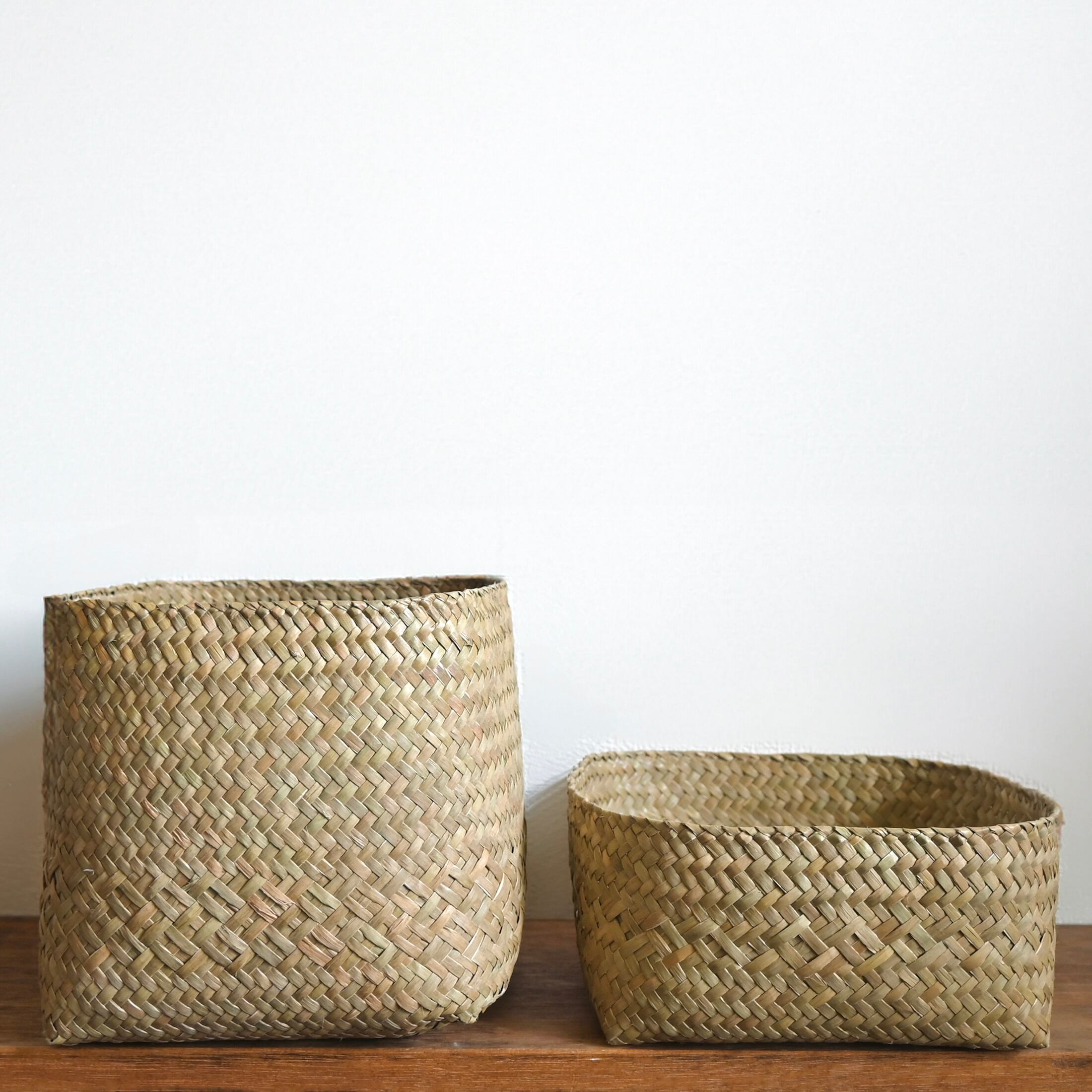 水草で作られるバスケットたちは、作られて間もないものは水分を多く含み、やや緑がかった色合い。そこから使っていくうちに水分が抜けると画像のように色が明るく黄味がかった色に変化し、しなやかさが増します。日々変化する風合いをお楽しみください。