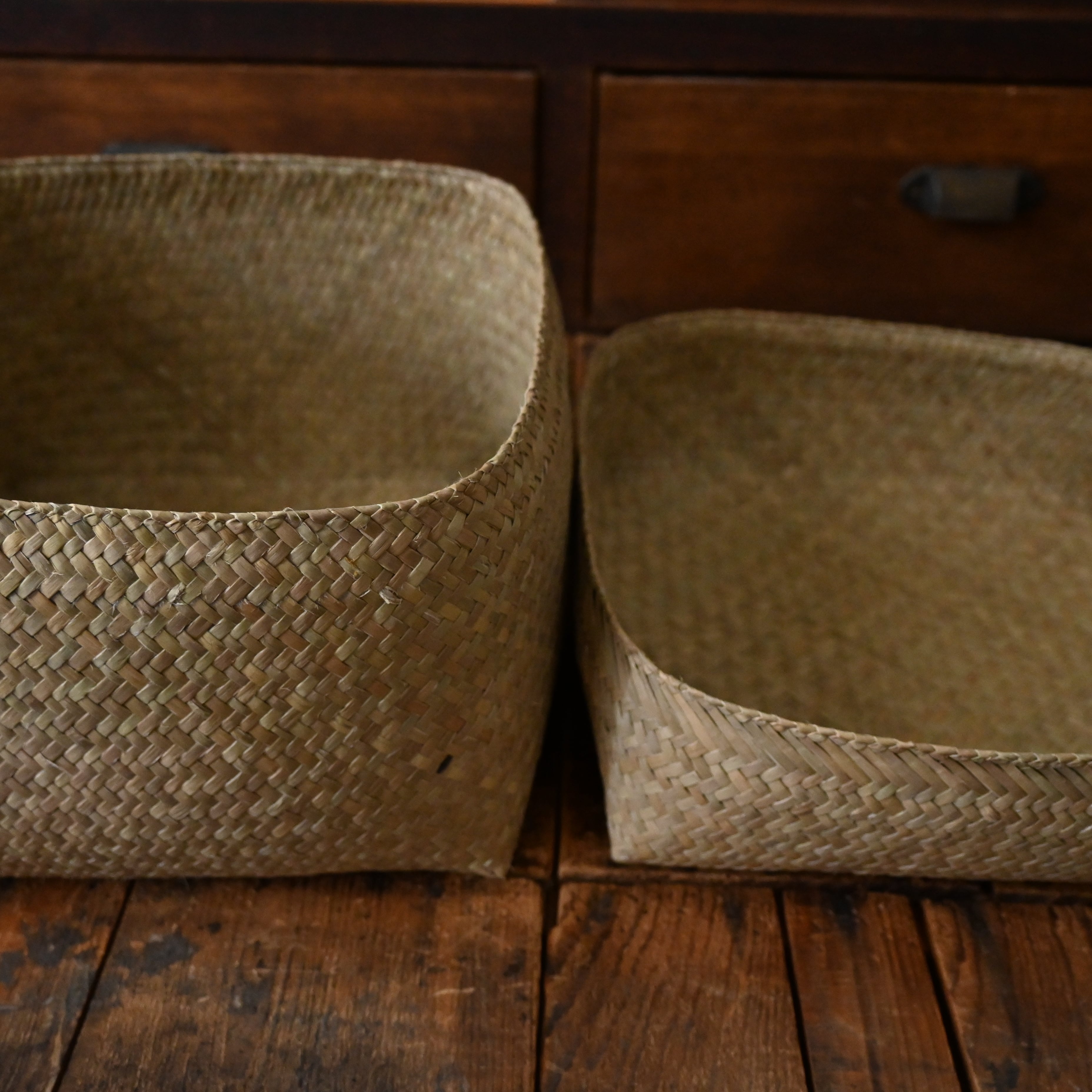 水草で作られるバスケットたちは、作られて間もないものは水分を多く含み、やや緑がかった色合い。そこから使っていくうちに水分が抜けると画像のように色が明るく黄味がかった色に変化し、しなやかさが増します。日々変化する風合いをお楽しみください。