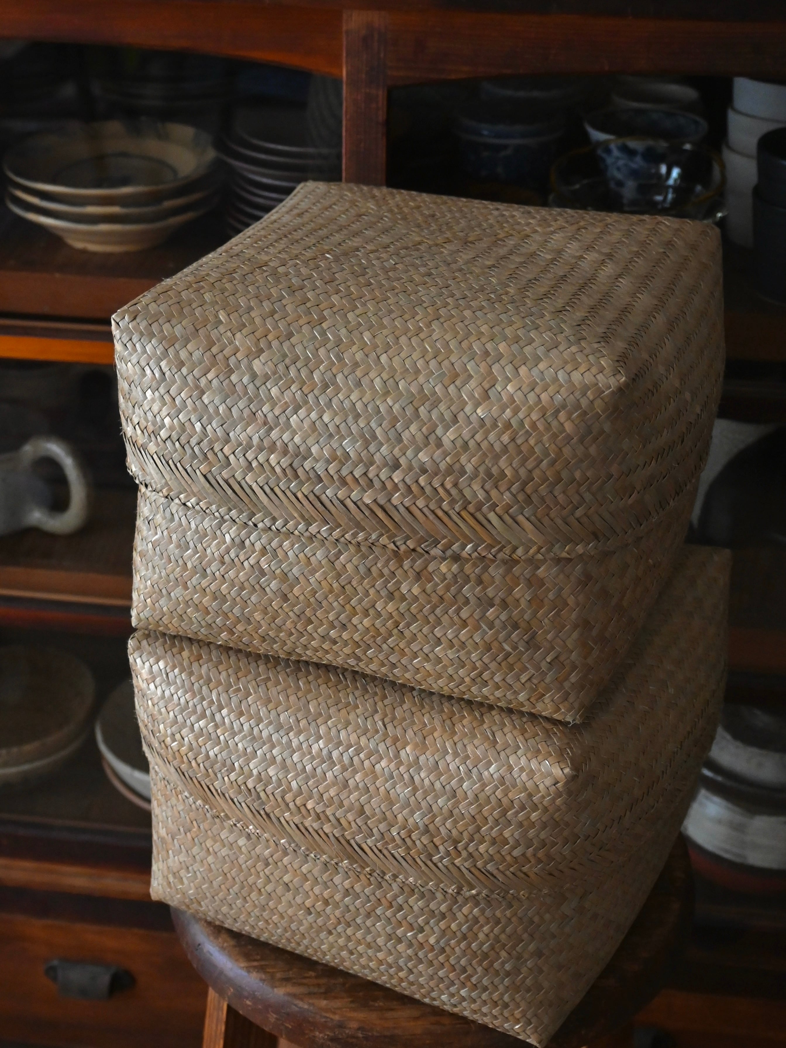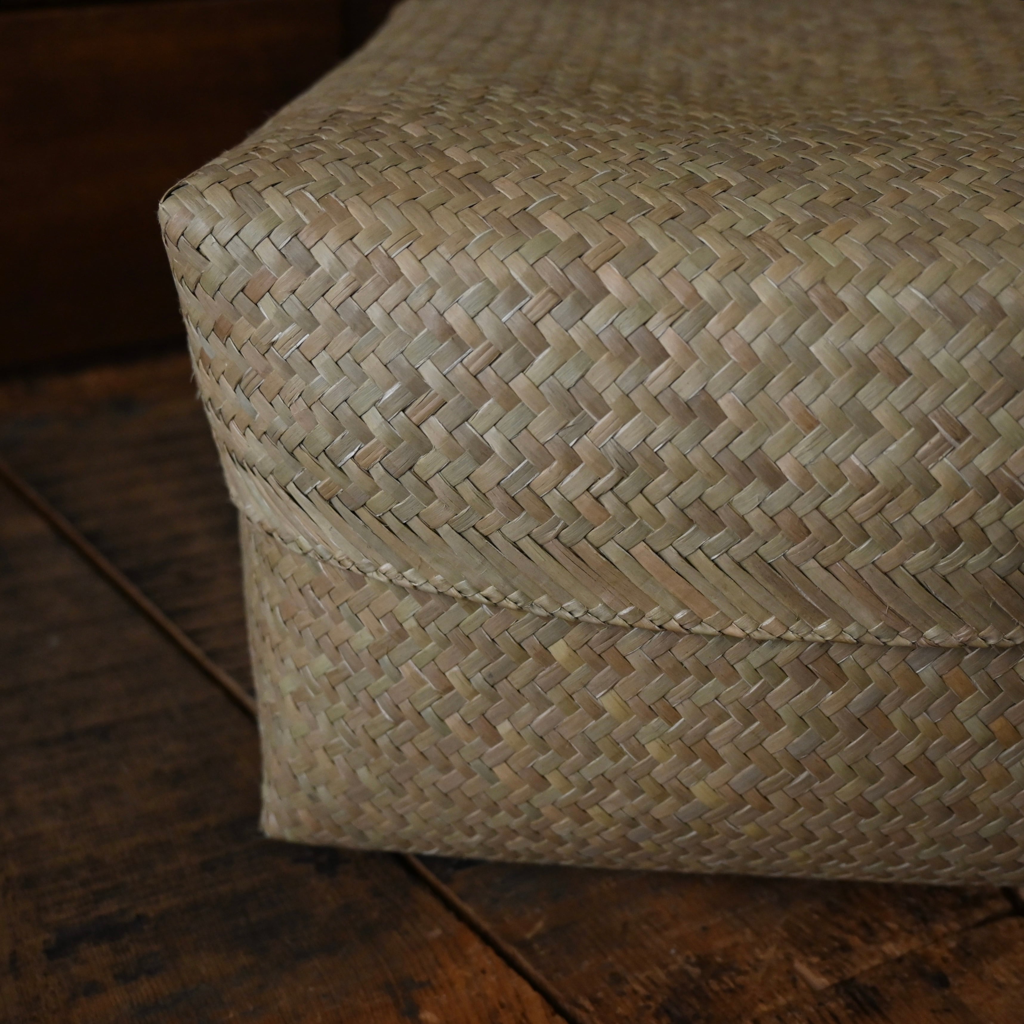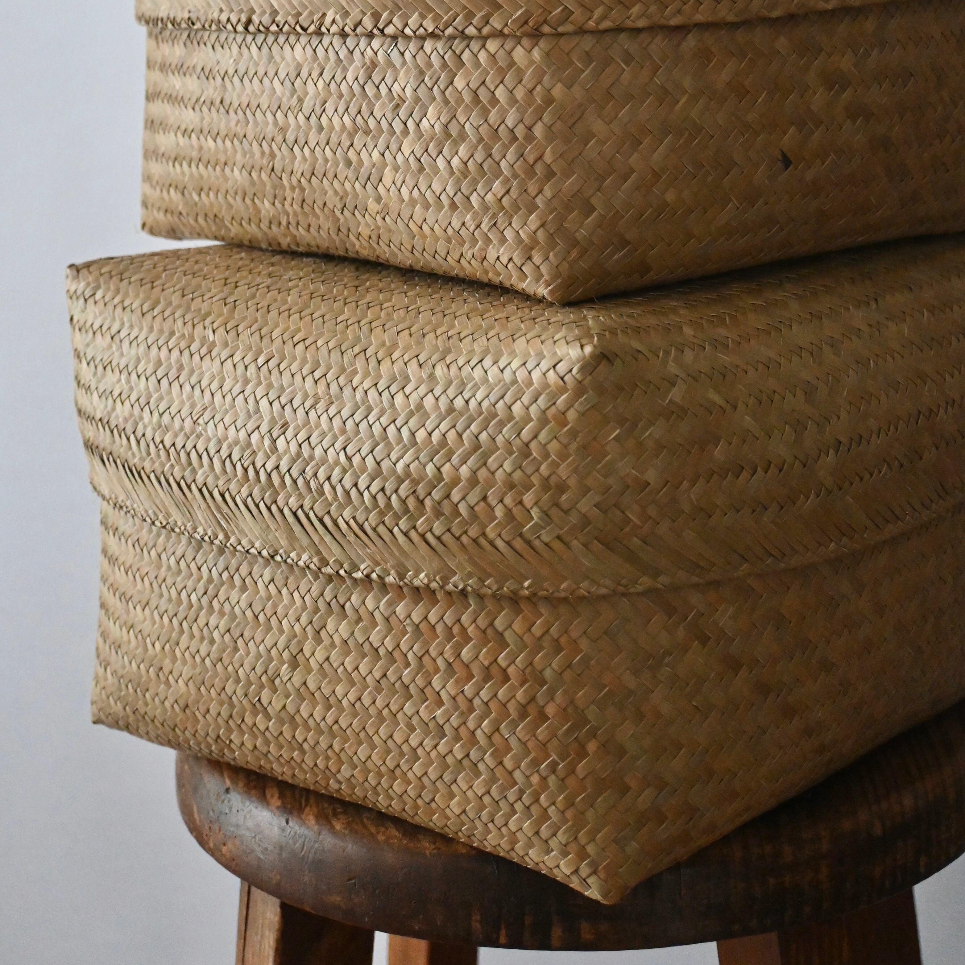 特に、こちらのカチュー(水草)のバスケットボックスは、タイで一般的に作られているものよりも水草を細く裂き、編み目をより緻密に仕上げています。そのため、しなやかさと柔らかさが際立ち、上質な仕上がりとなっています。